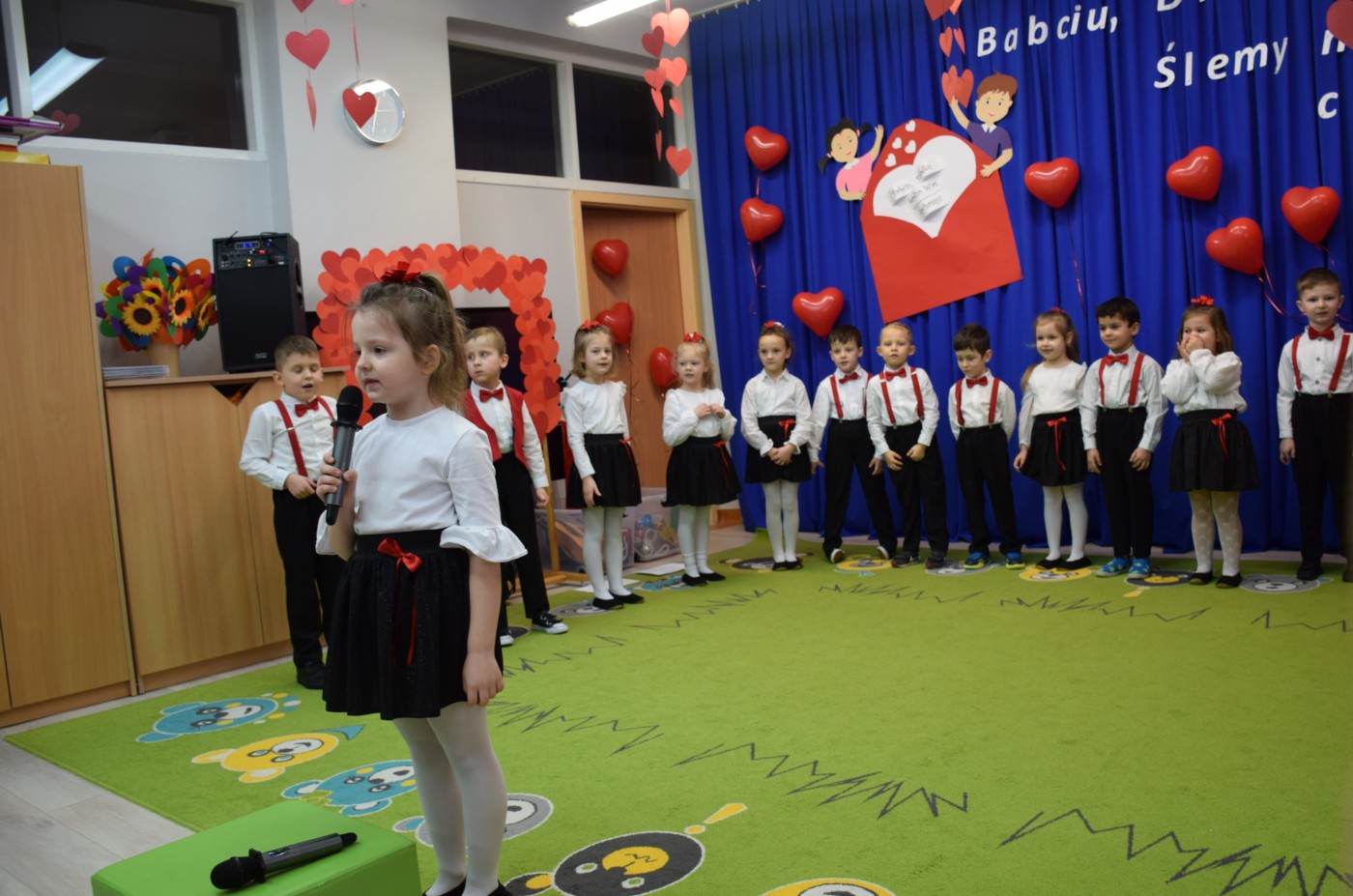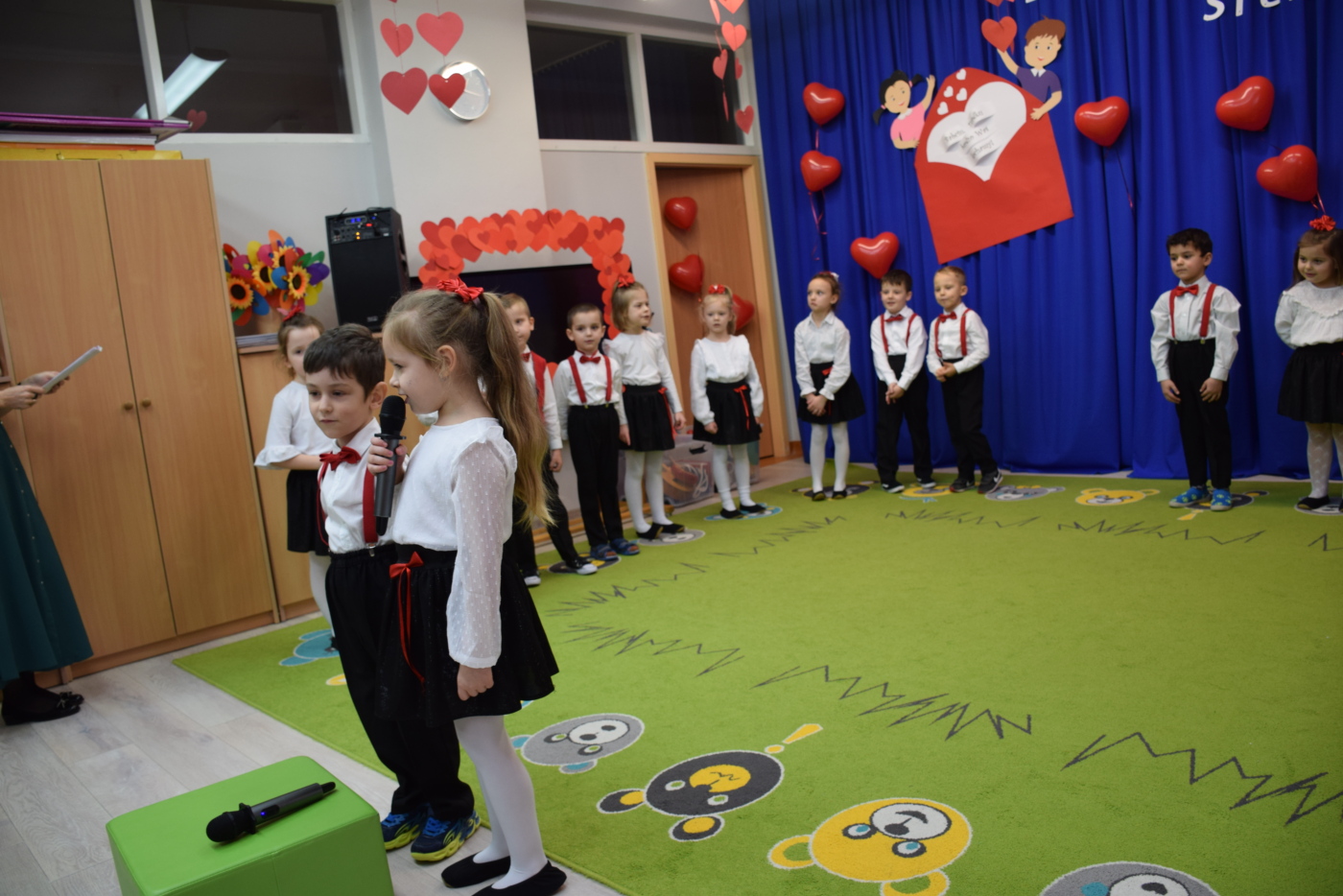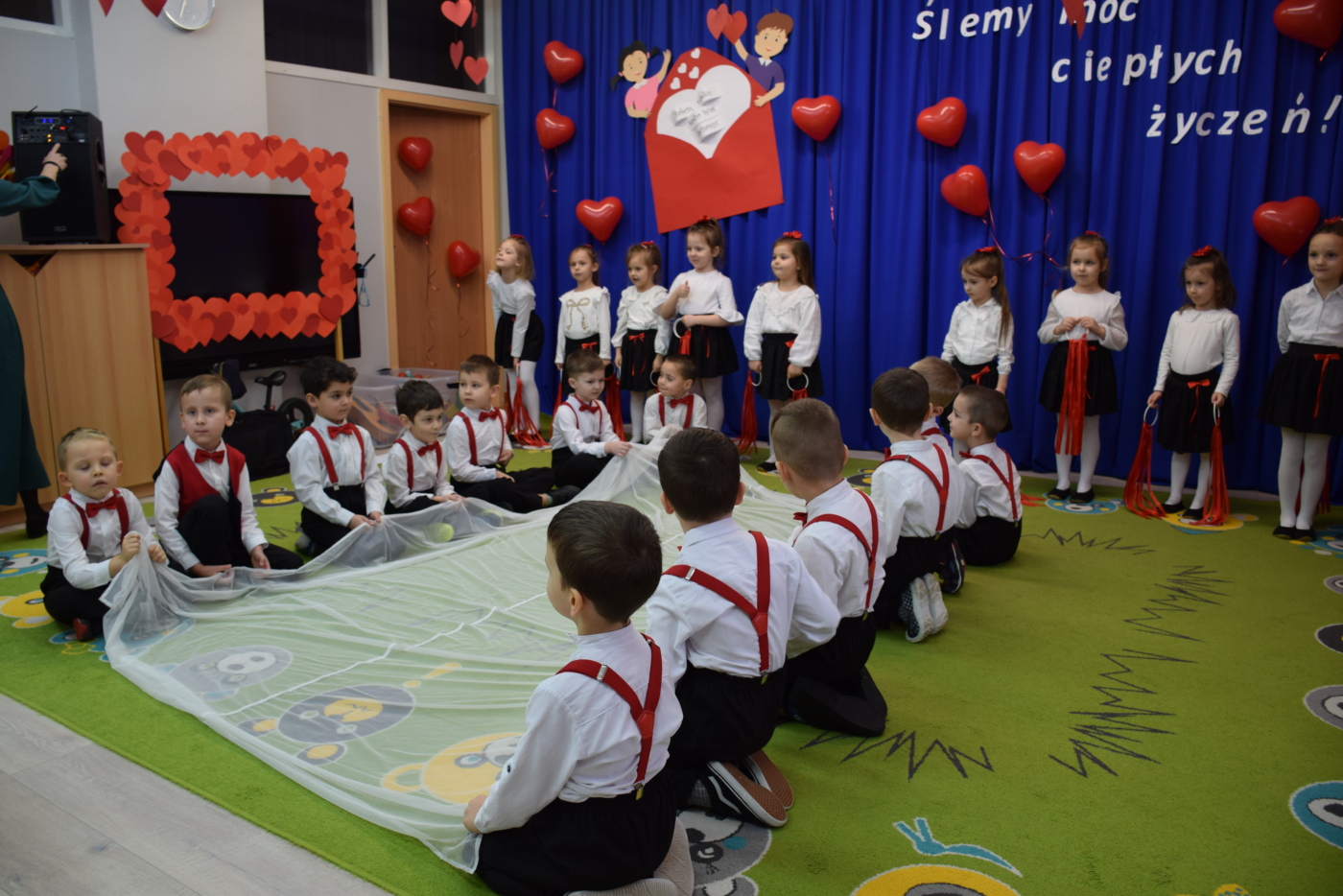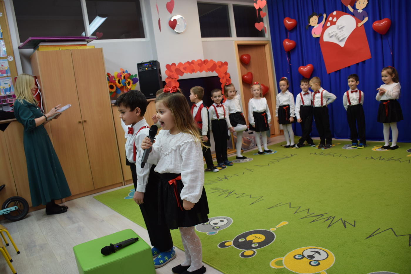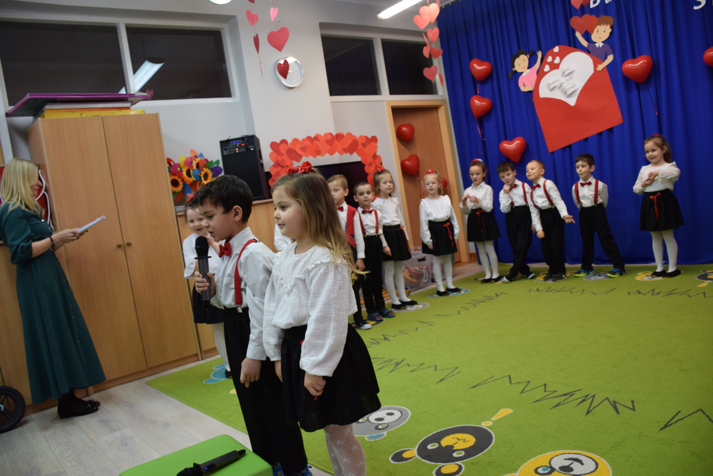 Goście zostali zaproszeni do pięknie udekorowanej sali pełnej serduszek, a mali artyści wystąpili w odświętnych strojach galowych z czerwonymi akcentami, które podkreślały wyjątkowy charakter wydarzenia. Program artystyczny był bardzo różnorodny – dzieci recytowały wiersze, prezentowały krótkie scenki teatralne, śpiewały piosenki oraz zachwycały układami tanecznymi z kolorowymi rekwizytami. Każdy występ został nagrodzony gromkimi brawami i uśmiechami pełnymi dumy.