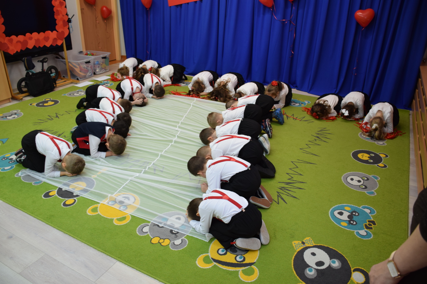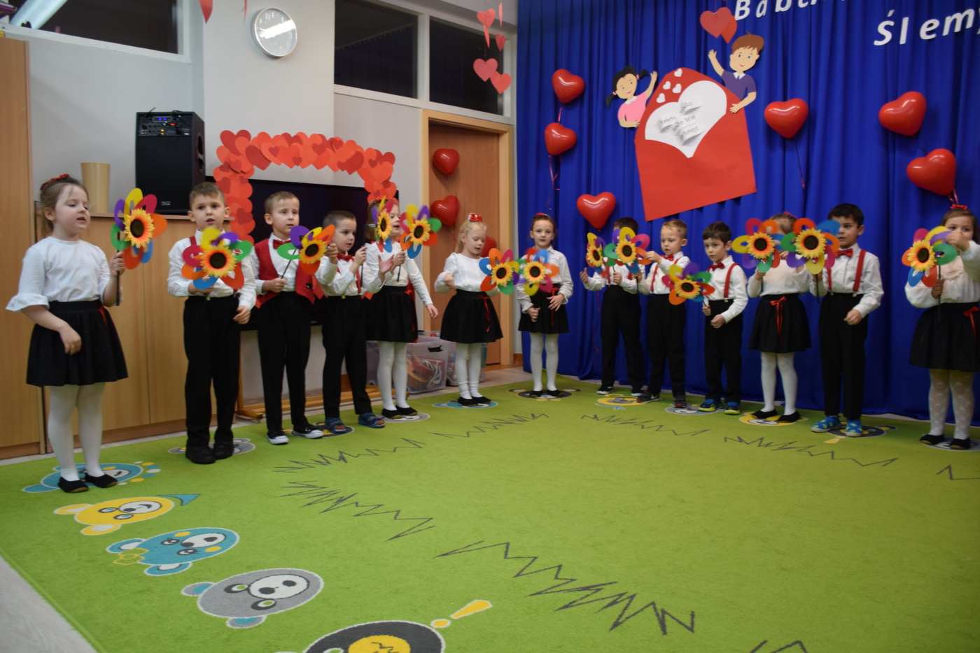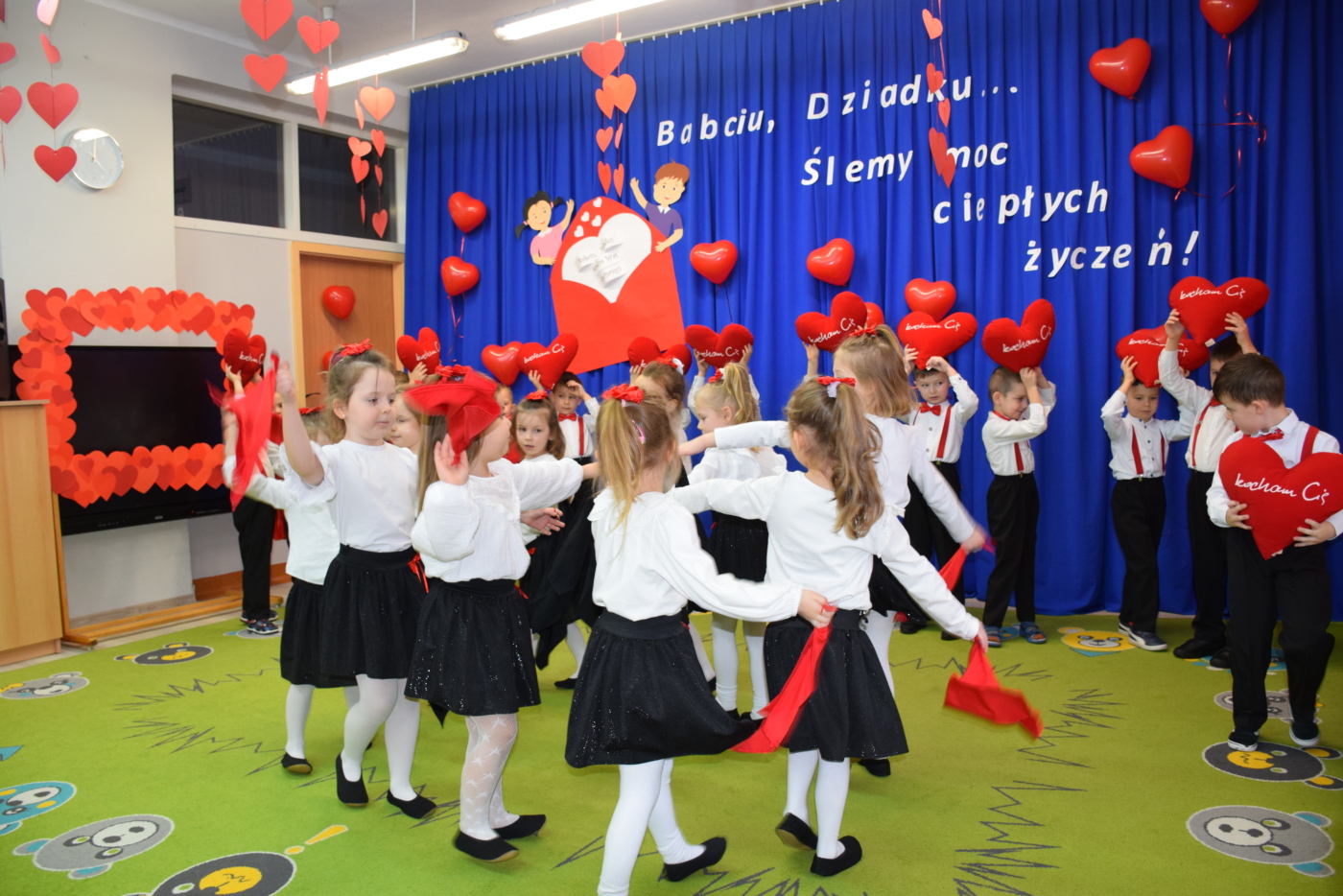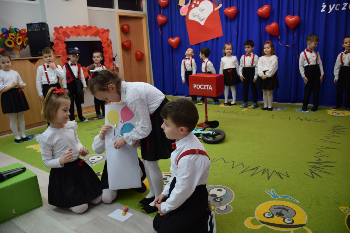 Goście zostali zaproszeni do pięknie udekorowanej sali pełnej serduszek, a mali artyści wystąpili w odświętnych strojach galowych z czerwonymi akcentami, które podkreślały wyjątkowy charakter wydarzenia. Program artystyczny był bardzo różnorodny – dzieci recytowały wiersze, prezentowały krótkie scenki teatralne, śpiewały piosenki oraz zachwycały układami tanecznymi z kolorowymi rekwizytami. Każdy występ został nagrodzony gromkimi brawami i uśmiechami pełnymi dumy.