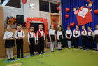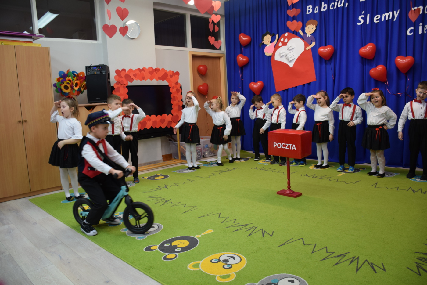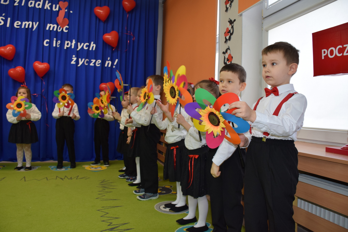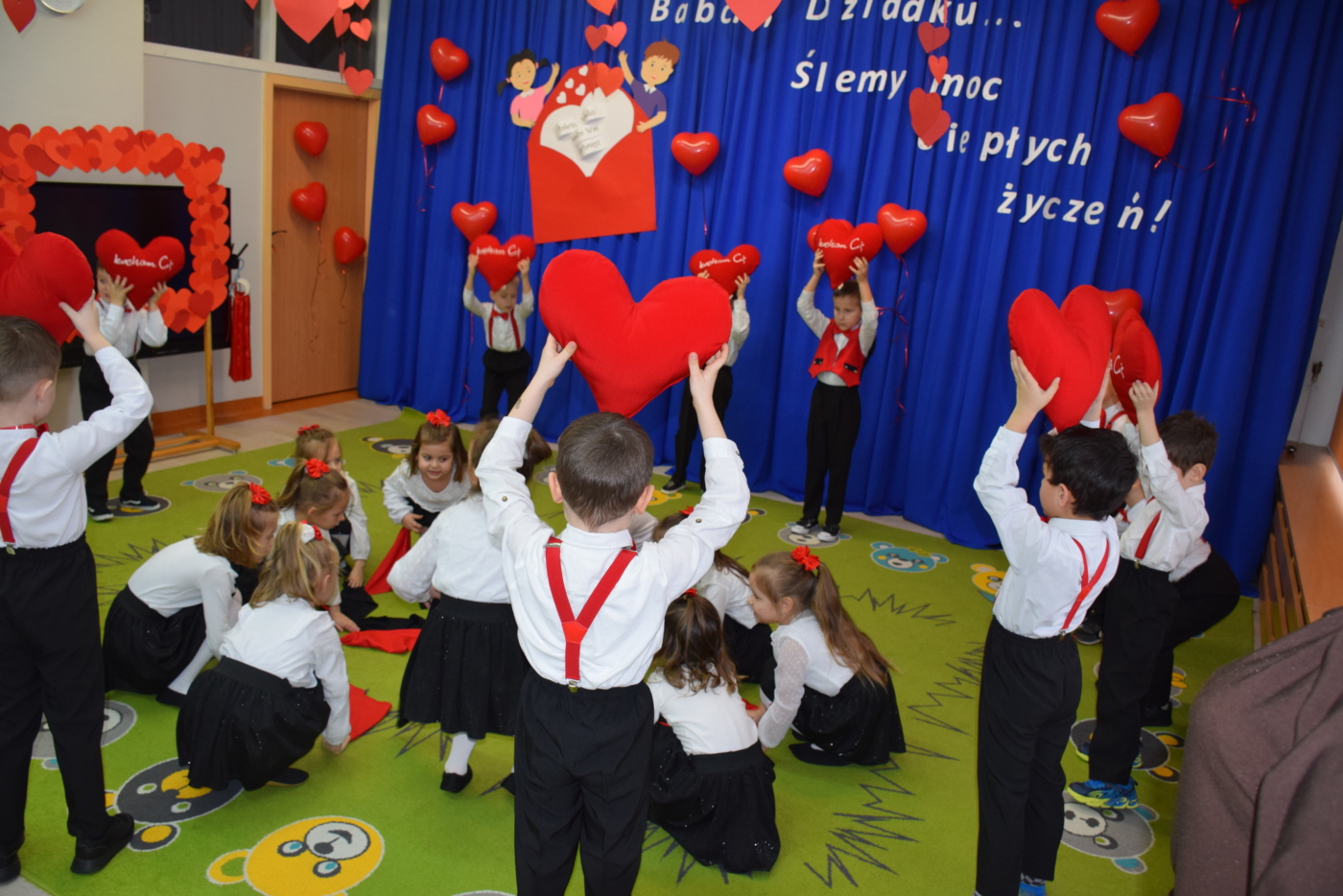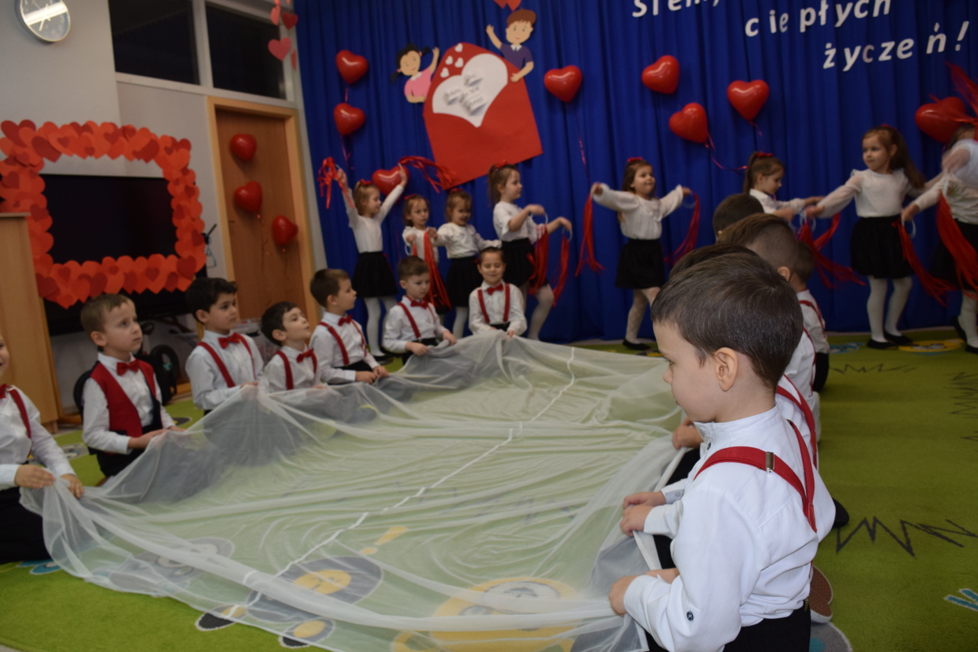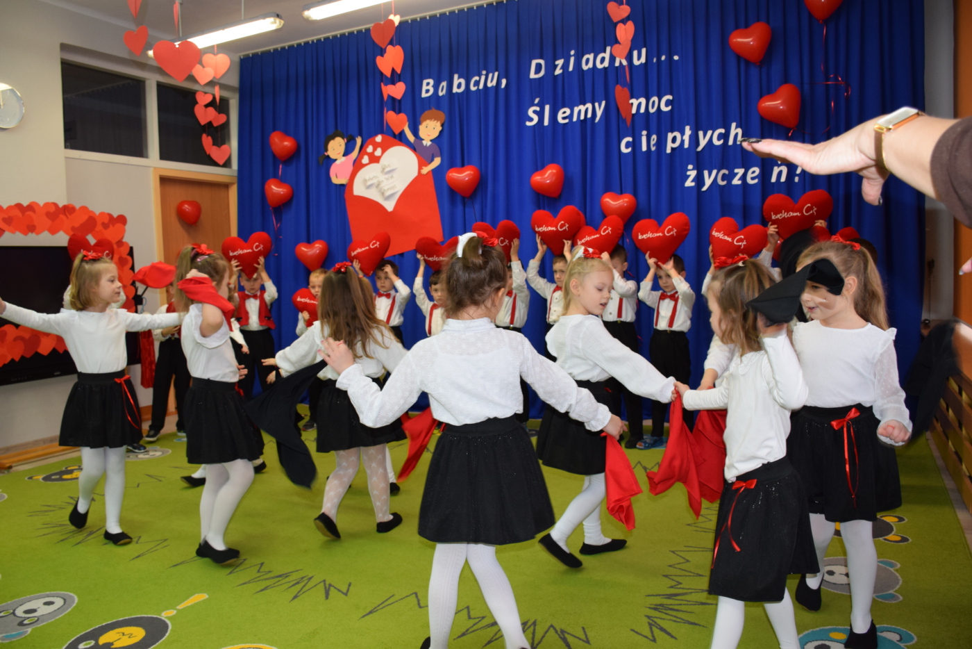 Goście zostali zaproszeni do pięknie udekorowanej sali pełnej serduszek, a mali artyści wystąpili w odświętnych strojach galowych z czerwonymi akcentami, które podkreślały wyjątkowy charakter wydarzenia. Program artystyczny był bardzo różnorodny – dzieci recytowały wiersze, prezentowały krótkie scenki teatralne, śpiewały piosenki oraz zachwycały układami tanecznymi z kolorowymi rekwizytami. Każdy występ został nagrodzony gromkimi brawami i uśmiechami pełnymi dumy.