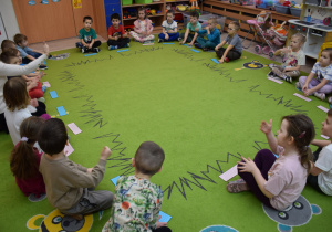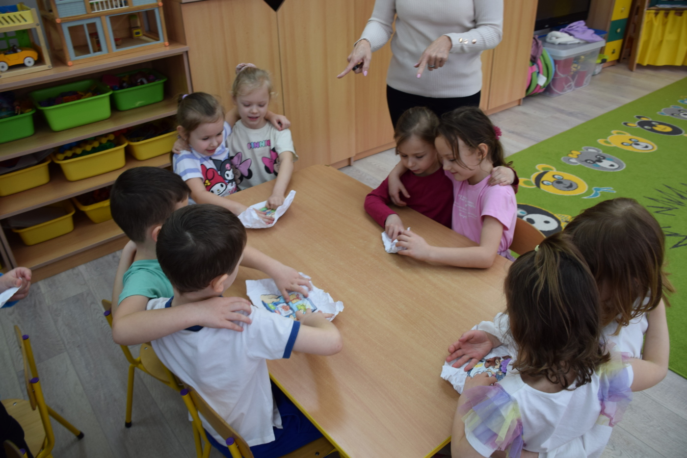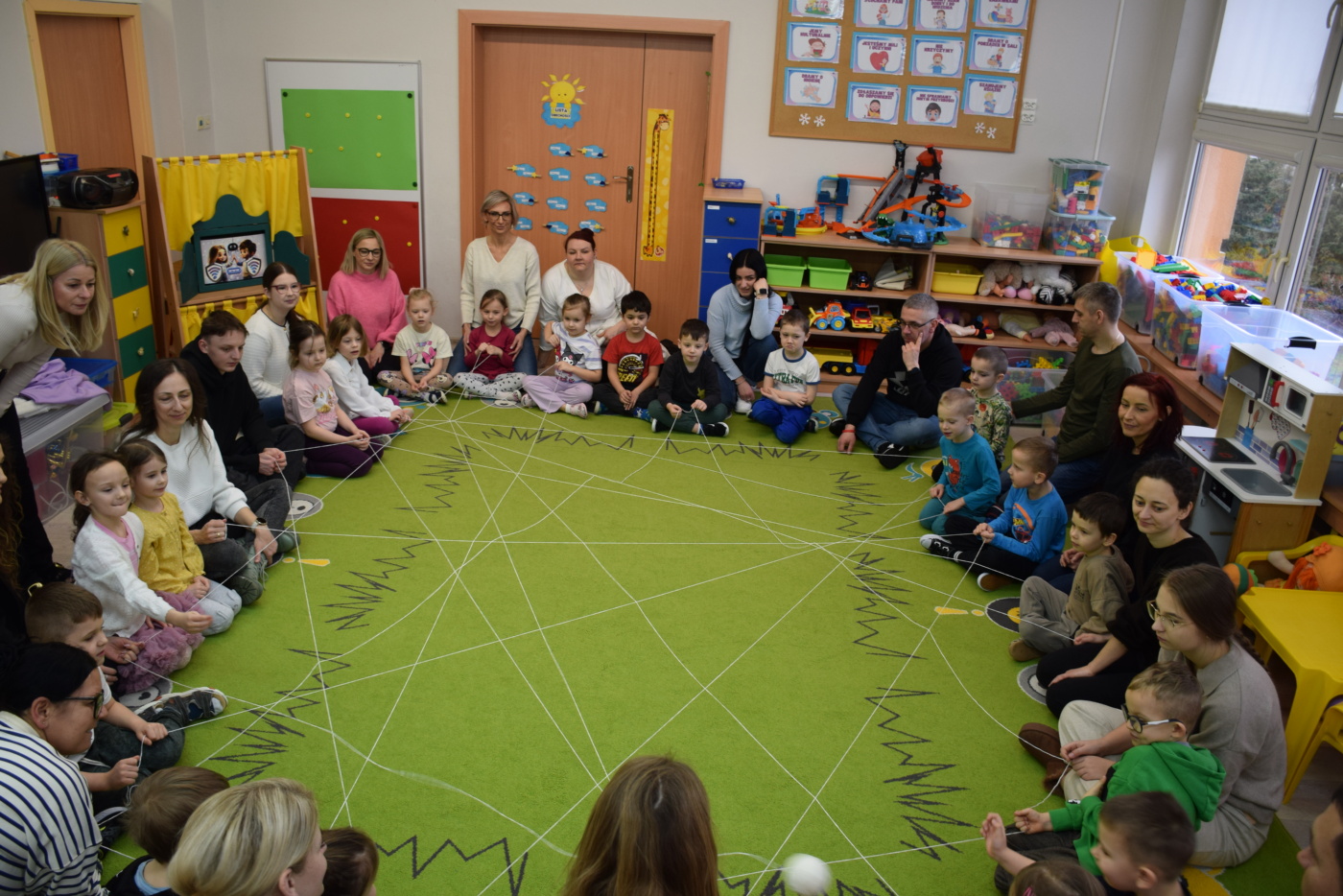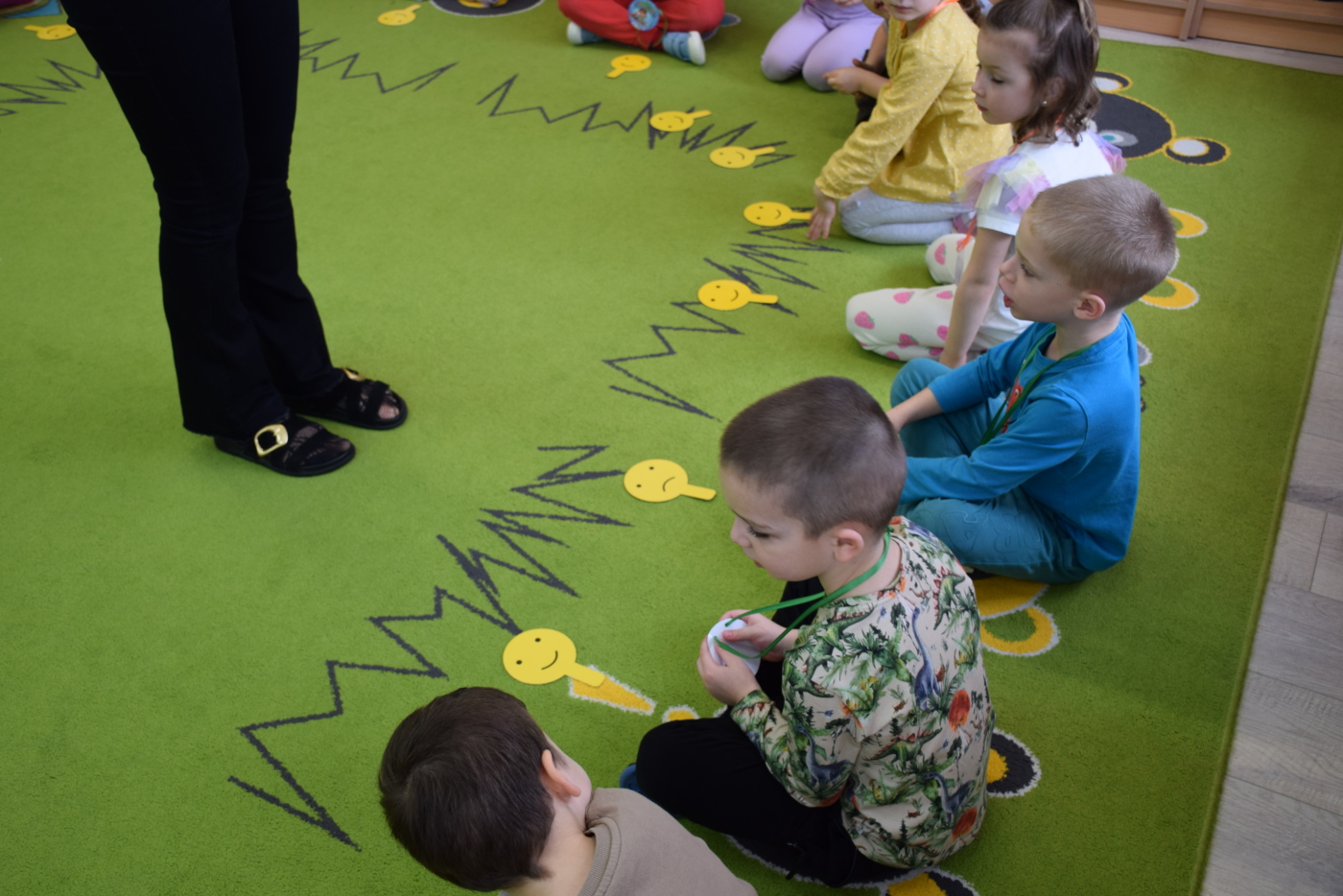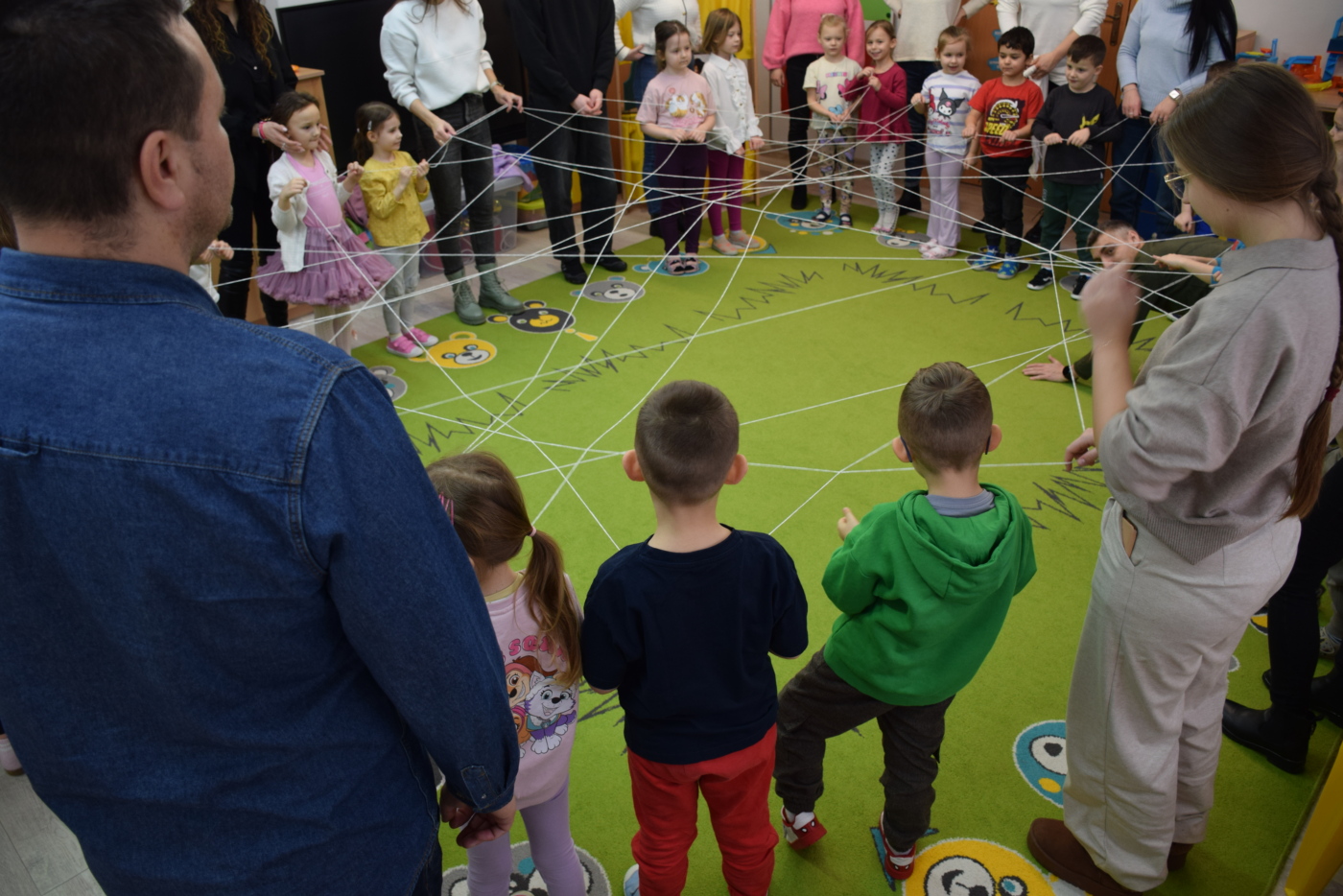 Nie zabrakło również zabaw ruchowych i integracyjnych. W trakcie zabawy paluszkowej do rymowanki „Pająki” dzieci rozwijały sprawność manualną, a podczas aktywizującej zabawy „Sieć internetowa” z wykorzystaniem włóczki wspólnie tworzyły symboliczną sieć, ucząc się współpracy. Dużo radości sprawiła zabawa ruchowa polegająca na ocenianiu sytuacji przedstawionych na ilustracjach – dzieci wybierały zieloną obręcz, gdy zachowanie było prawidłowe, oraz czerwoną, gdy było niewłaściwe.