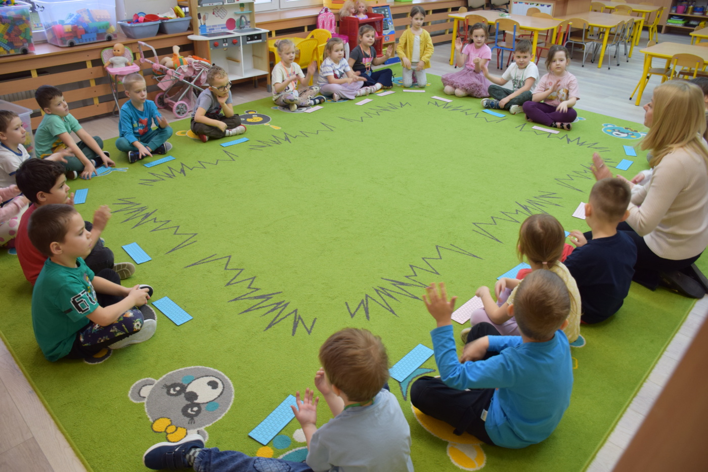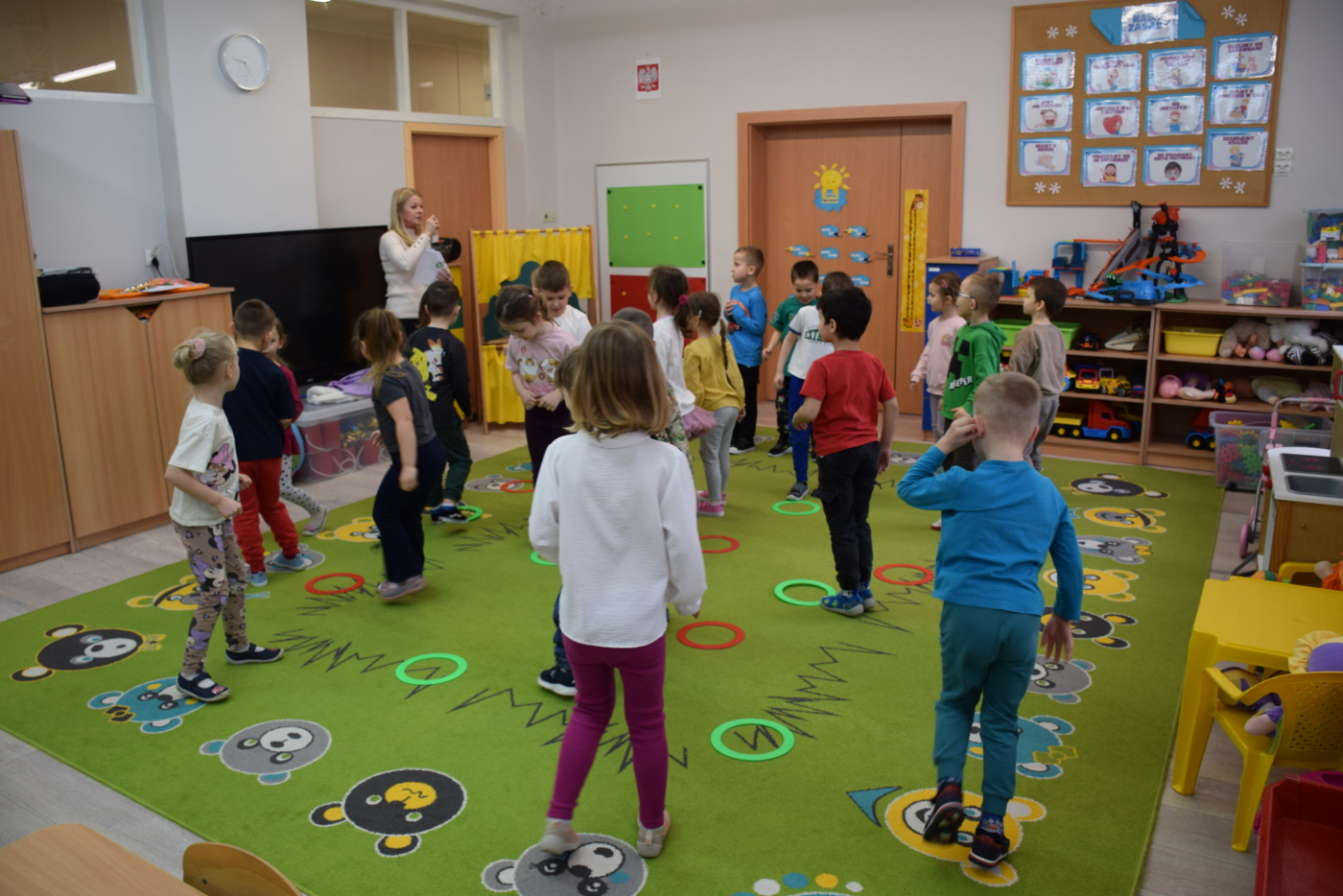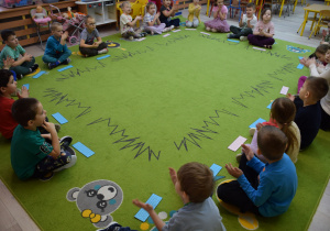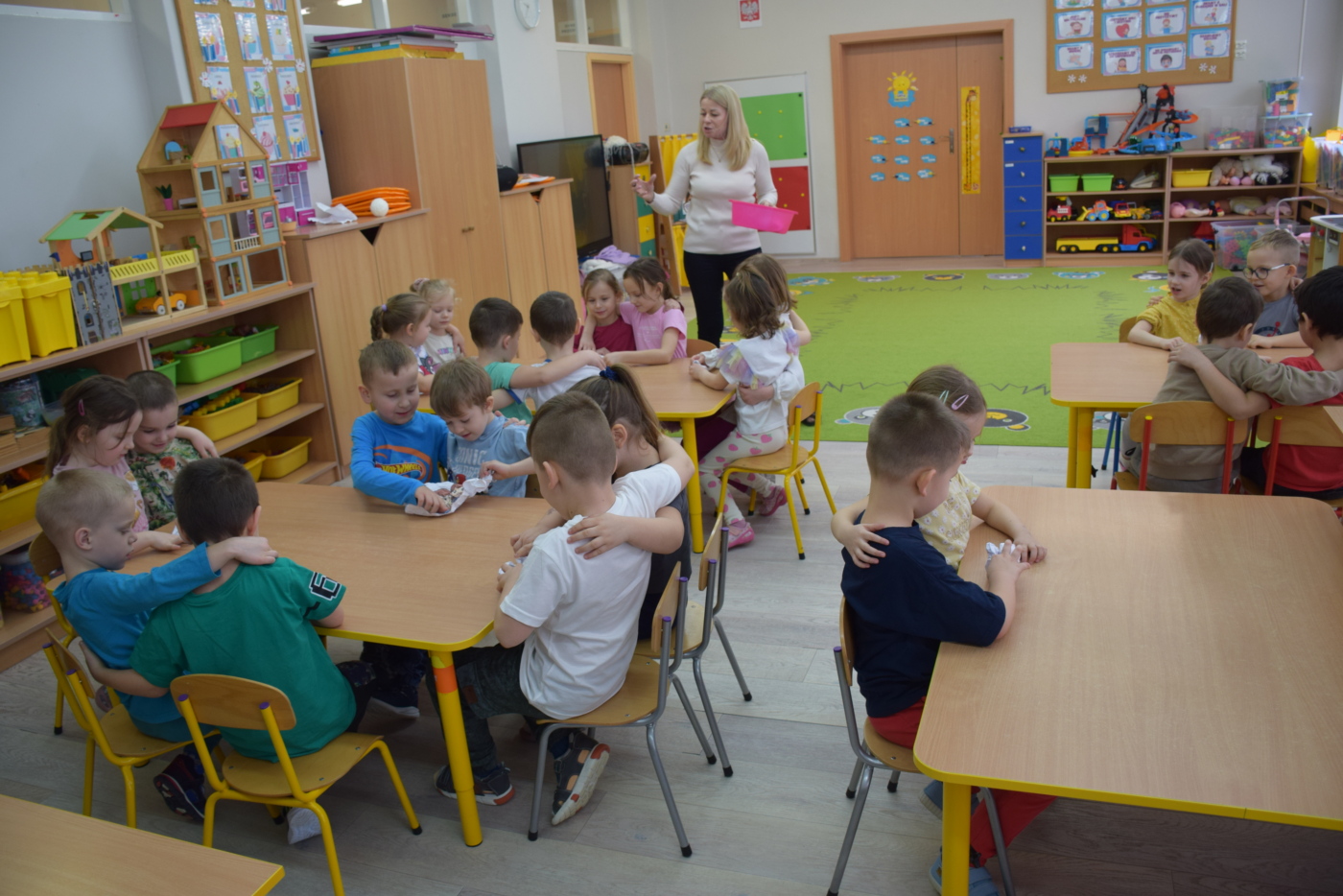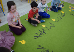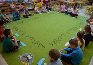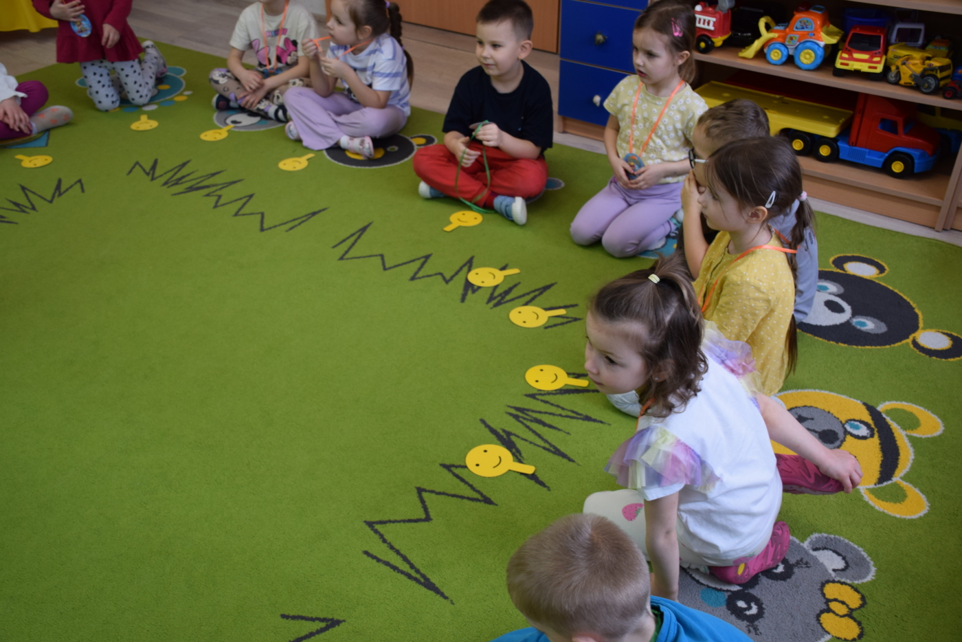 Nie zabrakło również zabaw ruchowych i integracyjnych. W trakcie zabawy paluszkowej do rymowanki „Pająki” dzieci rozwijały sprawność manualną, a podczas aktywizującej zabawy „Sieć internetowa” z wykorzystaniem włóczki wspólnie tworzyły symboliczną sieć, ucząc się współpracy. Dużo radości sprawiła zabawa ruchowa polegająca na ocenianiu sytuacji przedstawionych na ilustracjach – dzieci wybierały zieloną obręcz, gdy zachowanie było prawidłowe, oraz czerwoną, gdy było niewłaściwe.