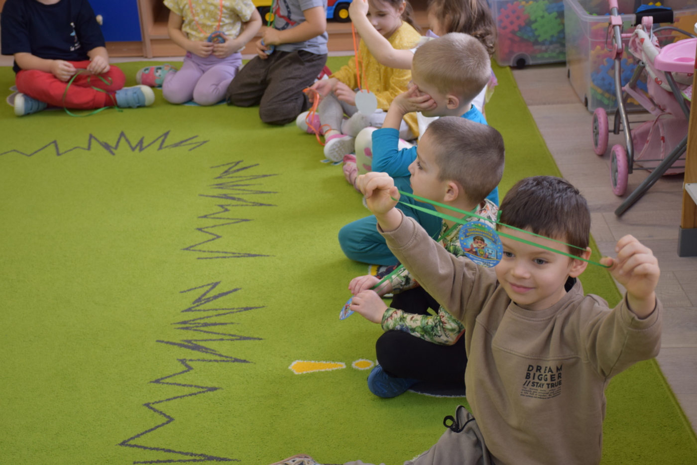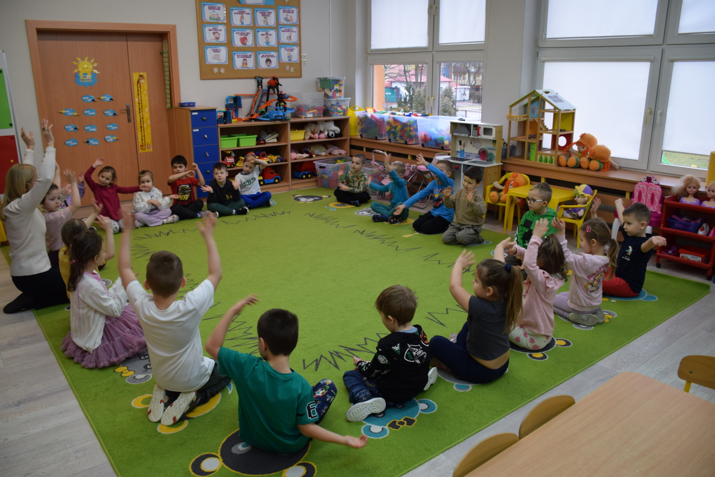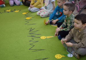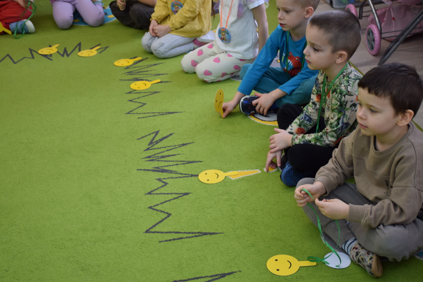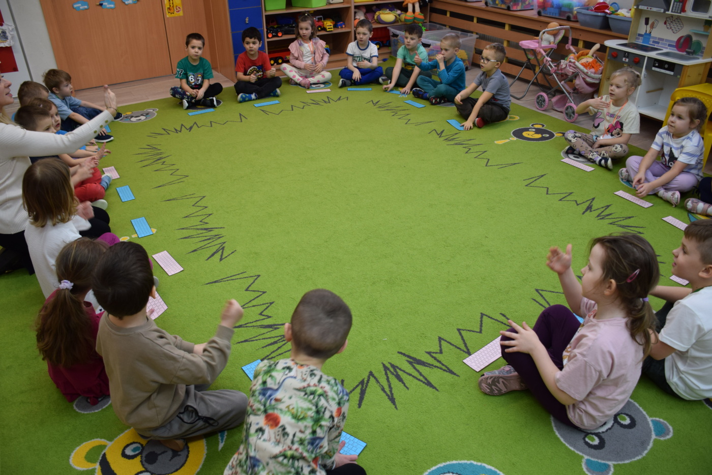 Nie zabrakło również zabaw ruchowych i integracyjnych. W trakcie zabawy paluszkowej do rymowanki „Pająki” dzieci rozwijały sprawność manualną, a podczas aktywizującej zabawy „Sieć internetowa” z wykorzystaniem włóczki wspólnie tworzyły symboliczną sieć, ucząc się współpracy. Dużo radości sprawiła zabawa ruchowa polegająca na ocenianiu sytuacji przedstawionych na ilustracjach – dzieci wybierały zieloną obręcz, gdy zachowanie było prawidłowe, oraz czerwoną, gdy było niewłaściwe.