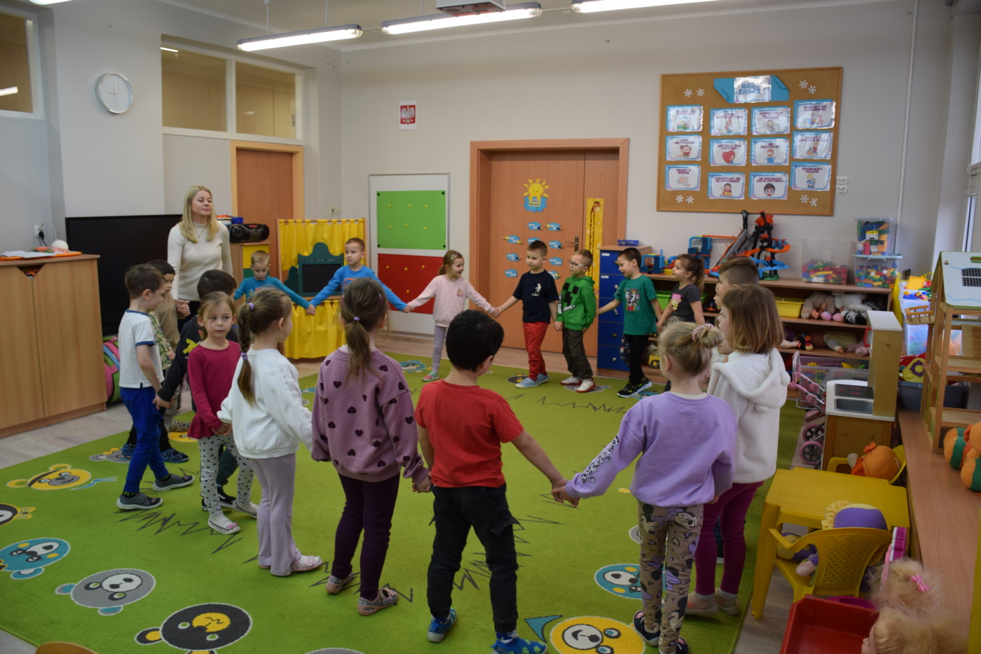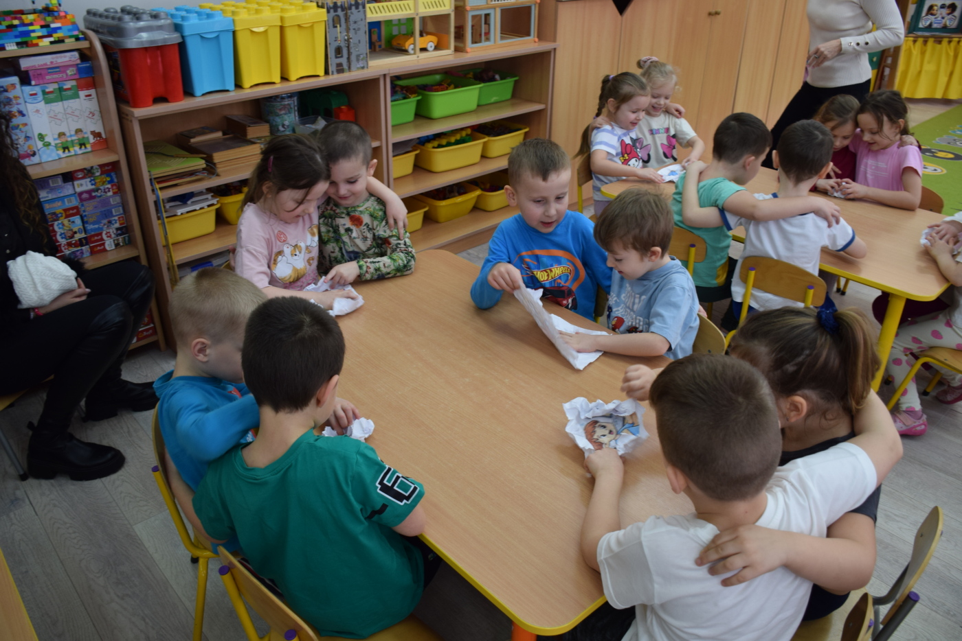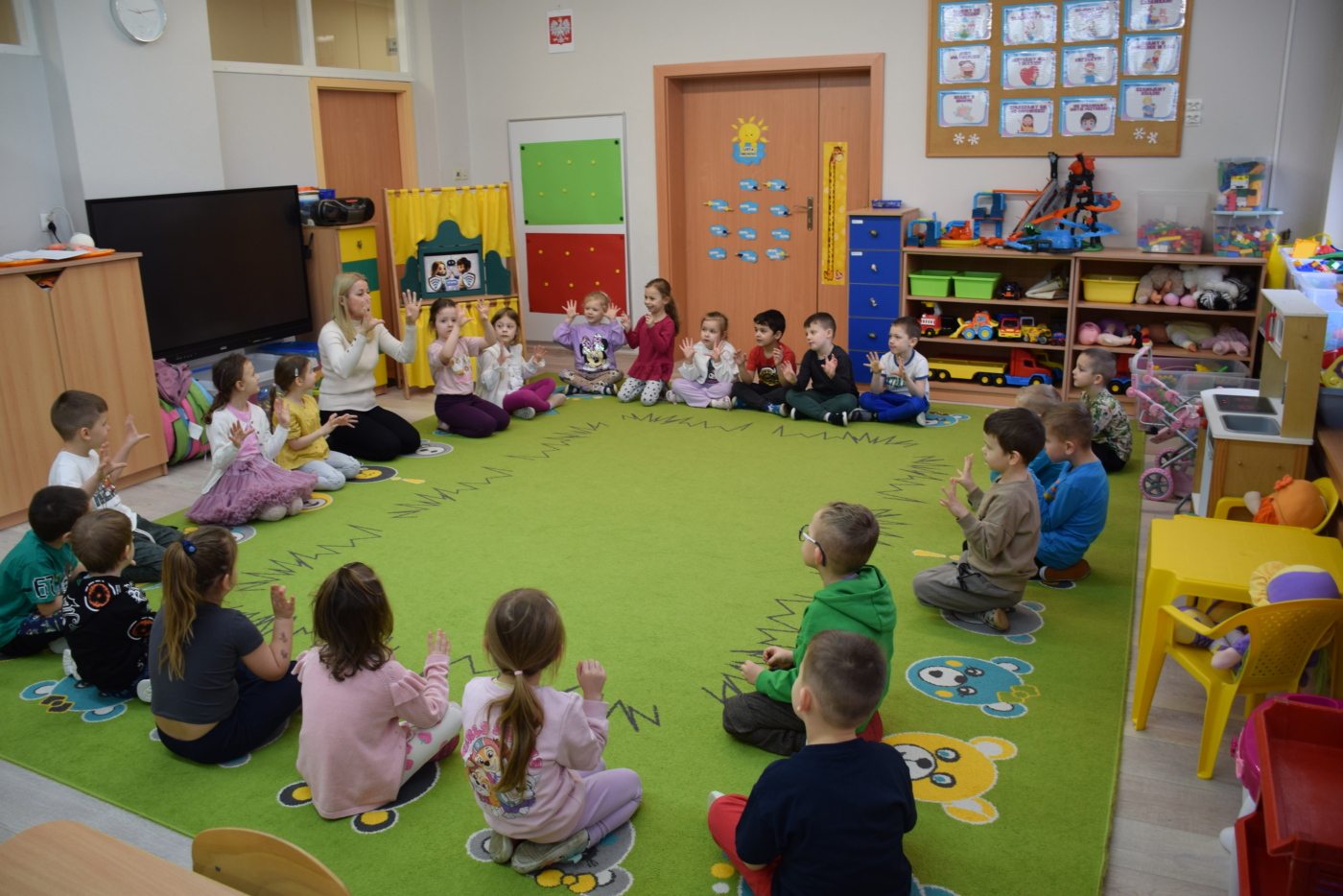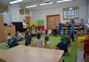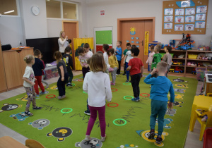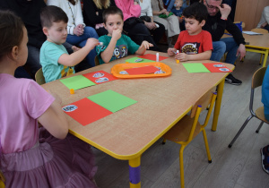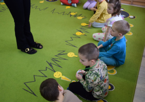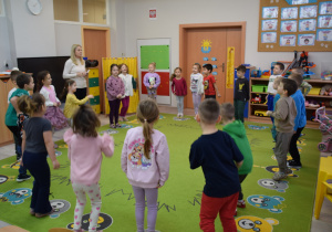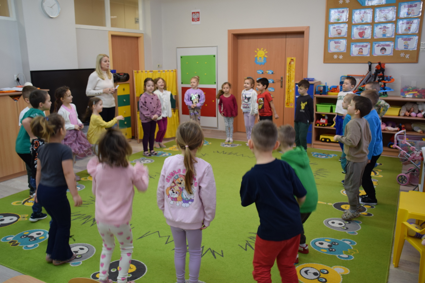 Nie zabrakło również zabaw ruchowych i integracyjnych. W trakcie zabawy paluszkowej do rymowanki „Pająki” dzieci rozwijały sprawność manualną, a podczas aktywizującej zabawy „Sieć internetowa” z wykorzystaniem włóczki wspólnie tworzyły symboliczną sieć, ucząc się współpracy. Dużo radości sprawiła zabawa ruchowa polegająca na ocenianiu sytuacji przedstawionych na ilustracjach – dzieci wybierały zieloną obręcz, gdy zachowanie było prawidłowe, oraz czerwoną, gdy było niewłaściwe.