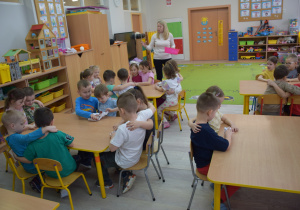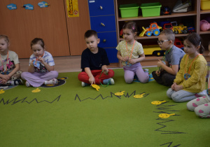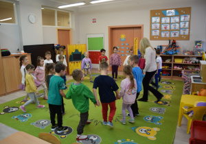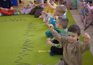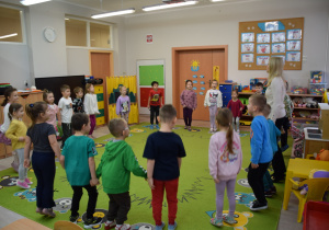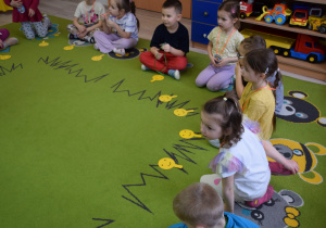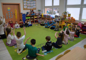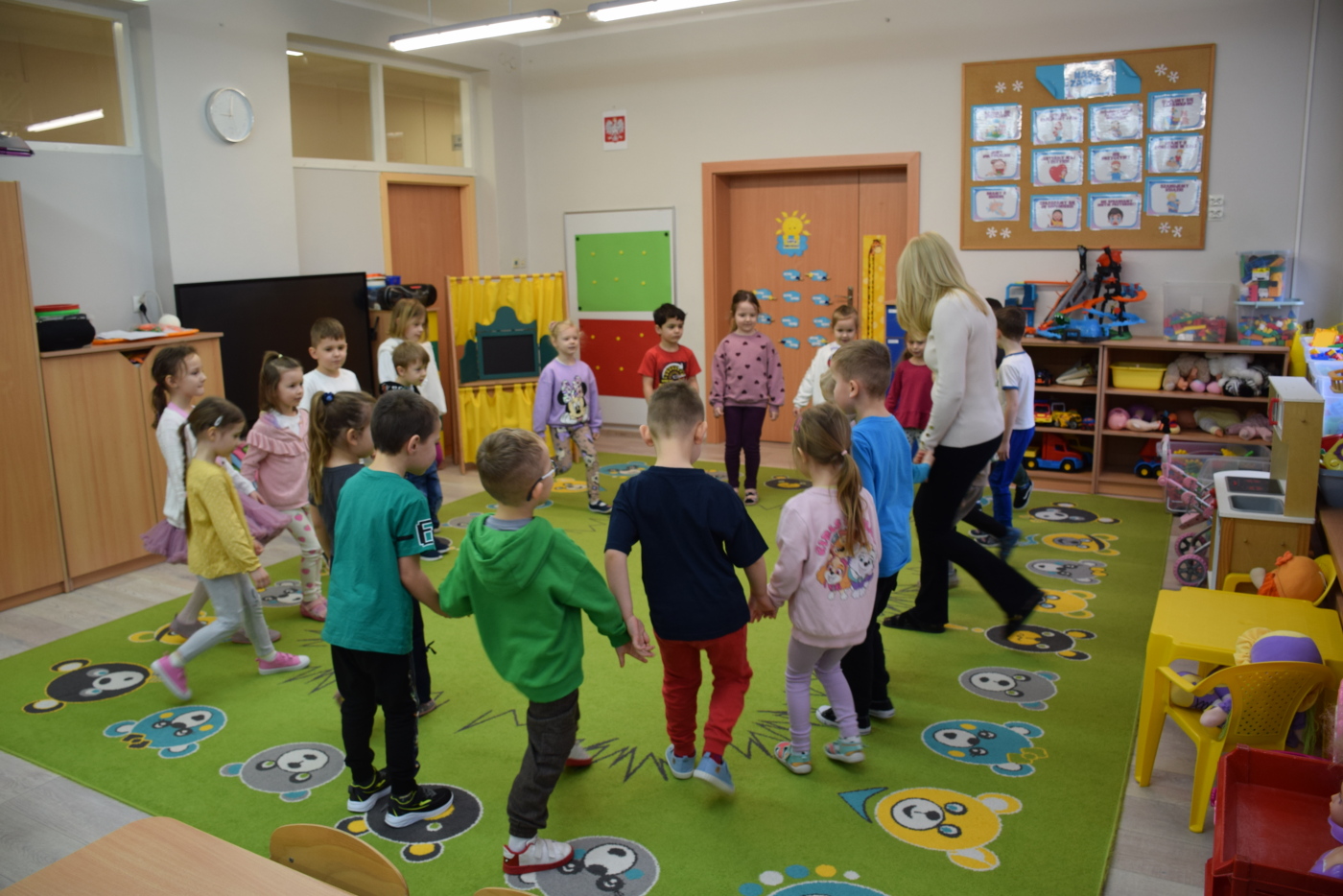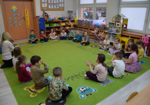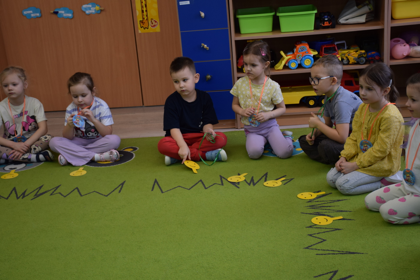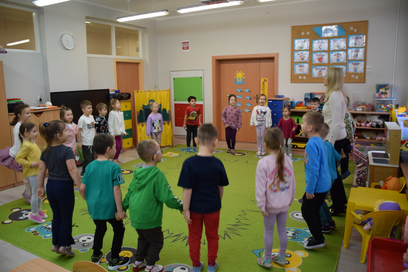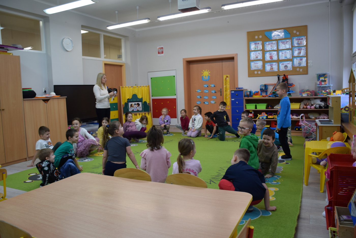Nie zabrakło również zabaw ruchowych i integracyjnych. W trakcie zabawy paluszkowej do rymowanki „Pająki” dzieci rozwijały sprawność manualną, a podczas aktywizującej zabawy „Sieć internetowa” z wykorzystaniem włóczki wspólnie tworzyły symboliczną sieć, ucząc się współpracy. Dużo radości sprawiła zabawa ruchowa polegająca na ocenianiu sytuacji przedstawionych na ilustracjach – dzieci wybierały zieloną obręcz, gdy zachowanie było prawidłowe, oraz czerwoną, gdy było niewłaściwe.