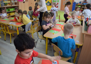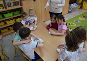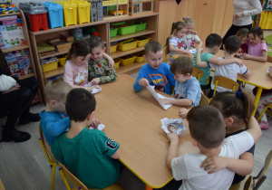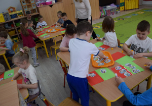 Przedszkolaki pracowały także w parach, wspólnie rozwiązując zadania i klasyfikując ilustracje przedstawiające różne sytuacje związane z korzystaniem z Internetu. Była to doskonała okazja do ćwiczenia współdziałania, komunikacji i wzajemnej pomocy. Zajęcia uatrakcyjniła również zabawa ruchowo-naśladowcza do piosenki „Internet” z wykorzystaniem papierowych klawiatur.
