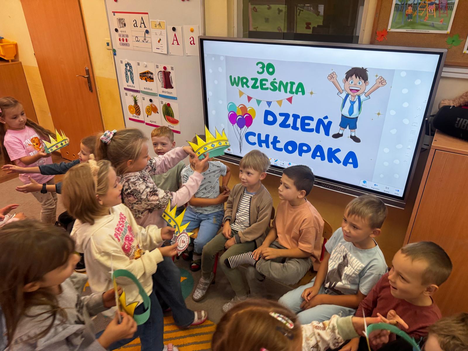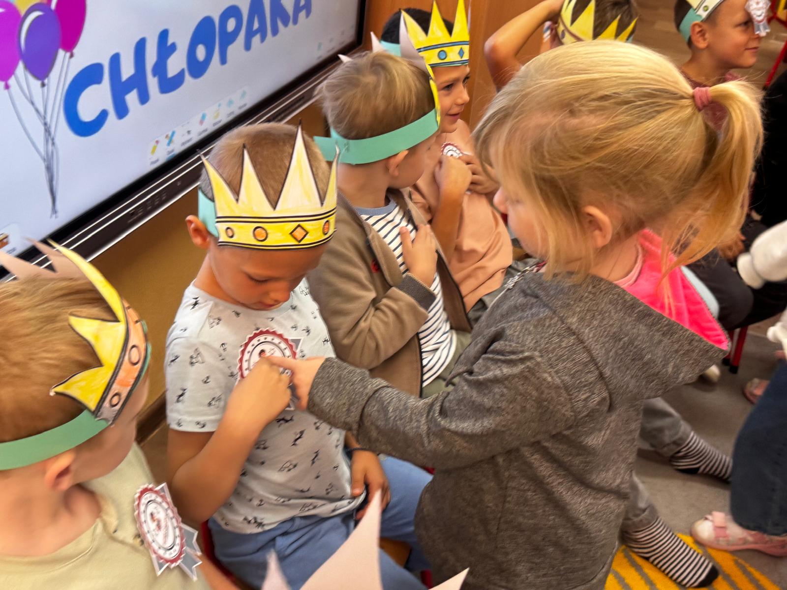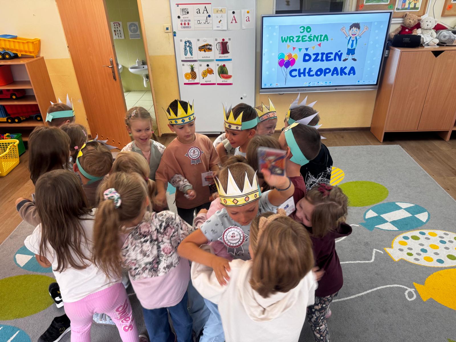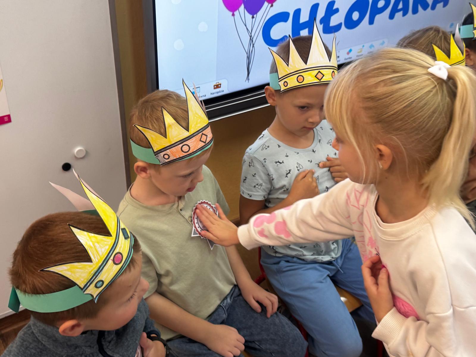 Z tej okazji dziewczynki wręczyły kolegom własnoręcznie wykonane korony i medaliony Super Chłopaka, a także drobne upominki. Nie zabrakło serdecznych życzeń, głośnego odśpiewania „Sto lat” oraz wielkiego, wspólnego przytulasa, który wywołał mnóstwo uśmiechów i radości. Był to wyjątkowy dzień pełen życzliwości i dobrej zabawy.