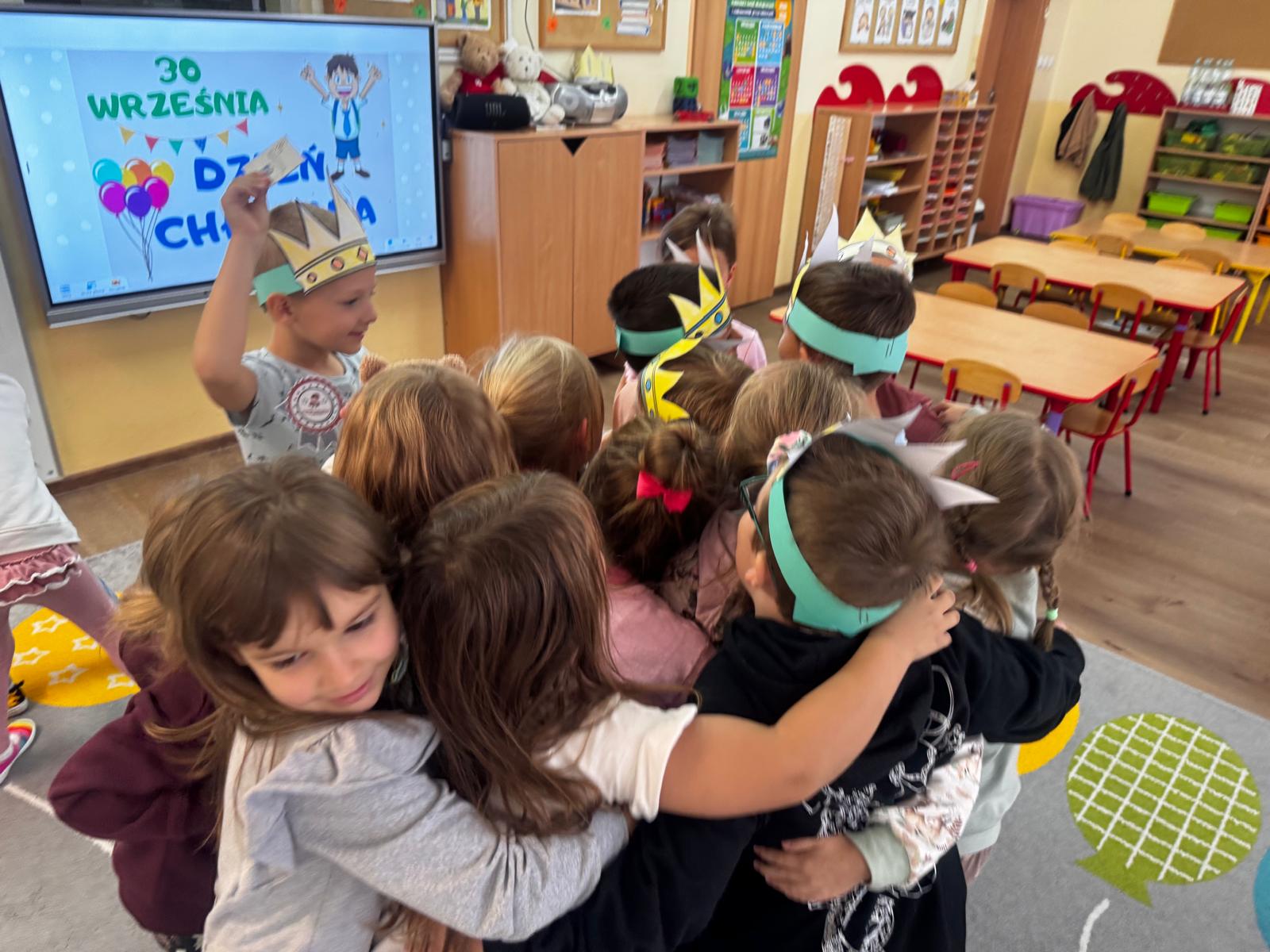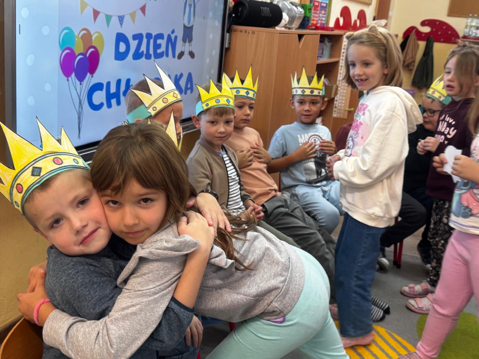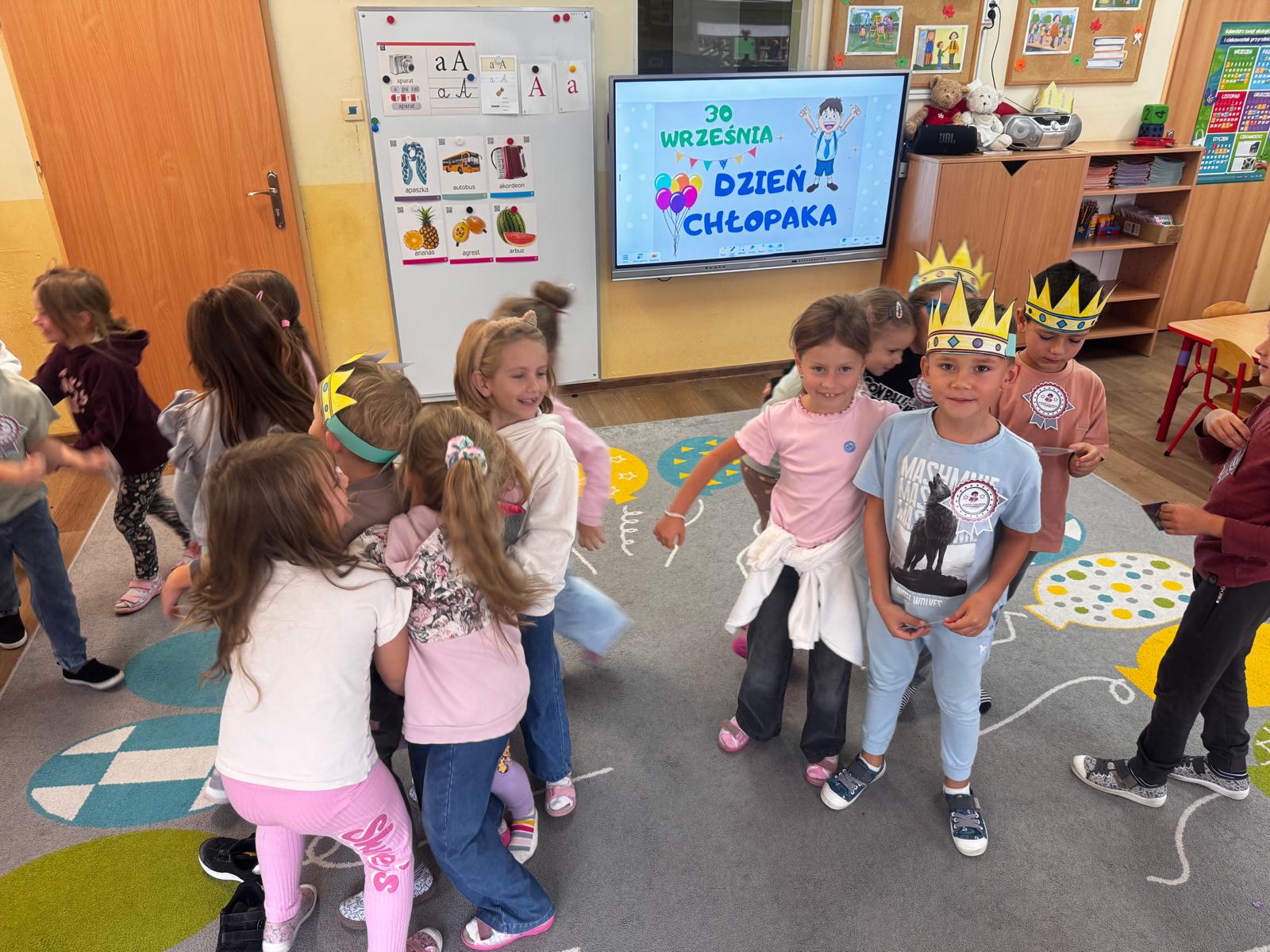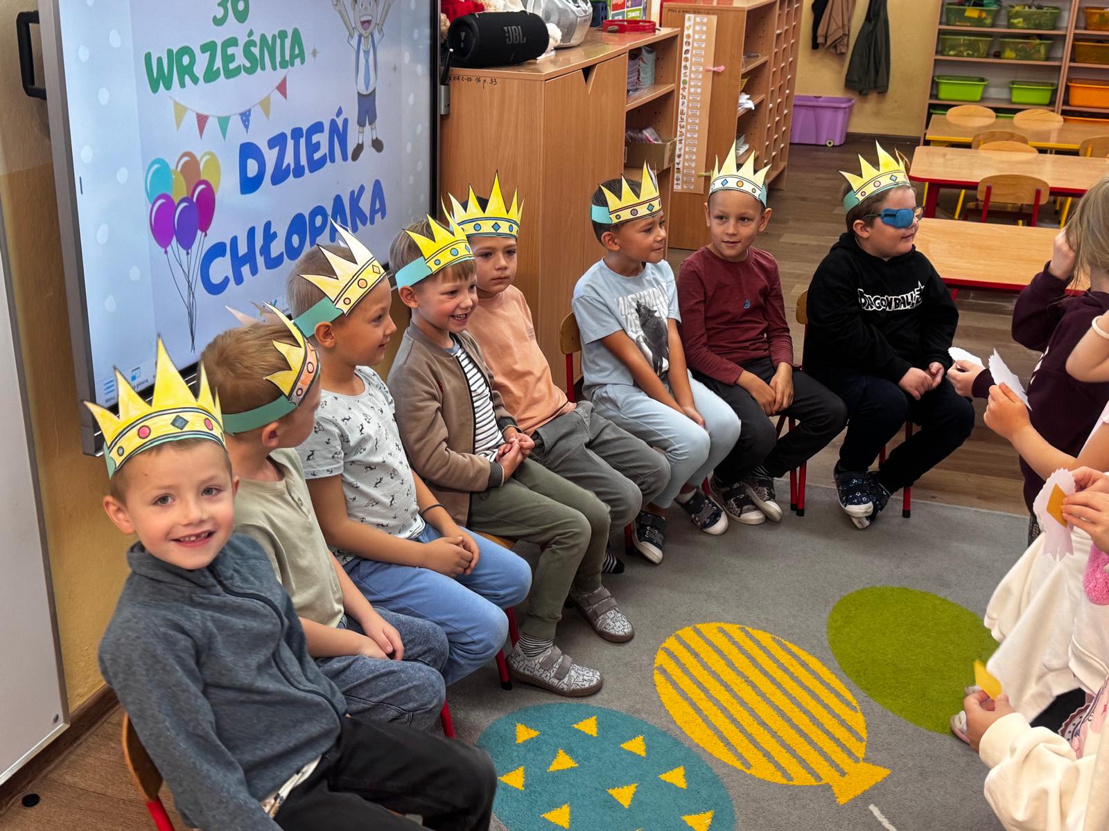 Z tej okazji dziewczynki wręczyły kolegom własnoręcznie wykonane korony i medaliony Super Chłopaka, a także drobne upominki. Nie zabrakło serdecznych życzeń, głośnego odśpiewania „Sto lat” oraz wielkiego, wspólnego przytulasa, który wywołał mnóstwo uśmiechów i radości. Był to wyjątkowy dzień pełen życzliwości i dobrej zabawy.