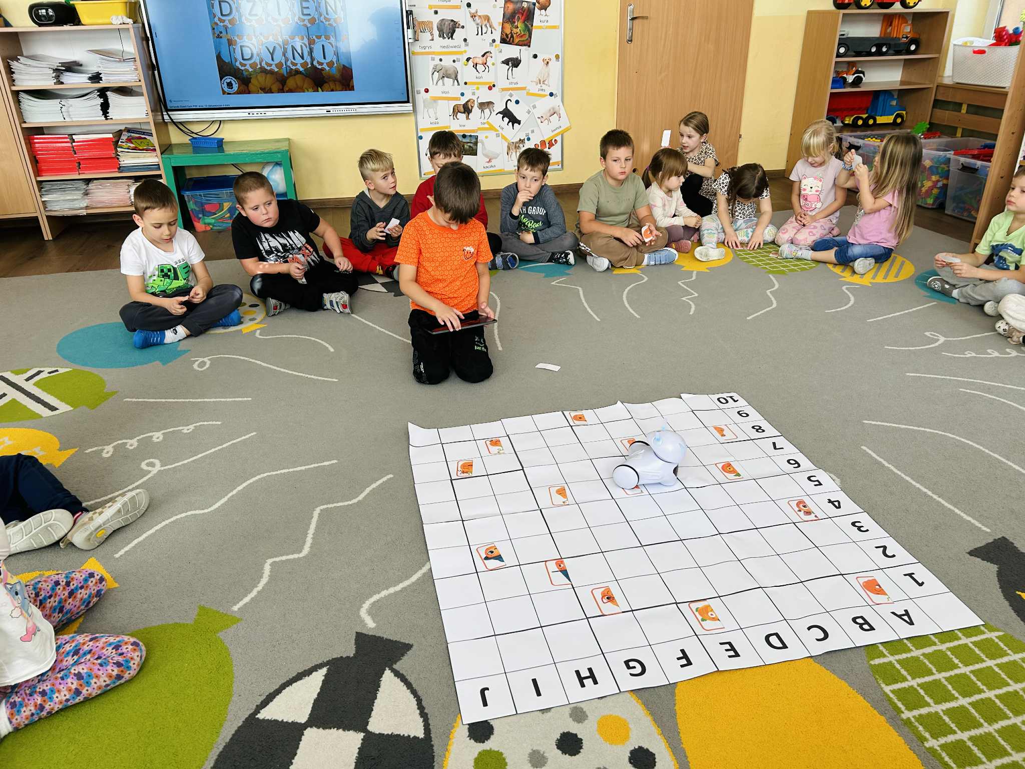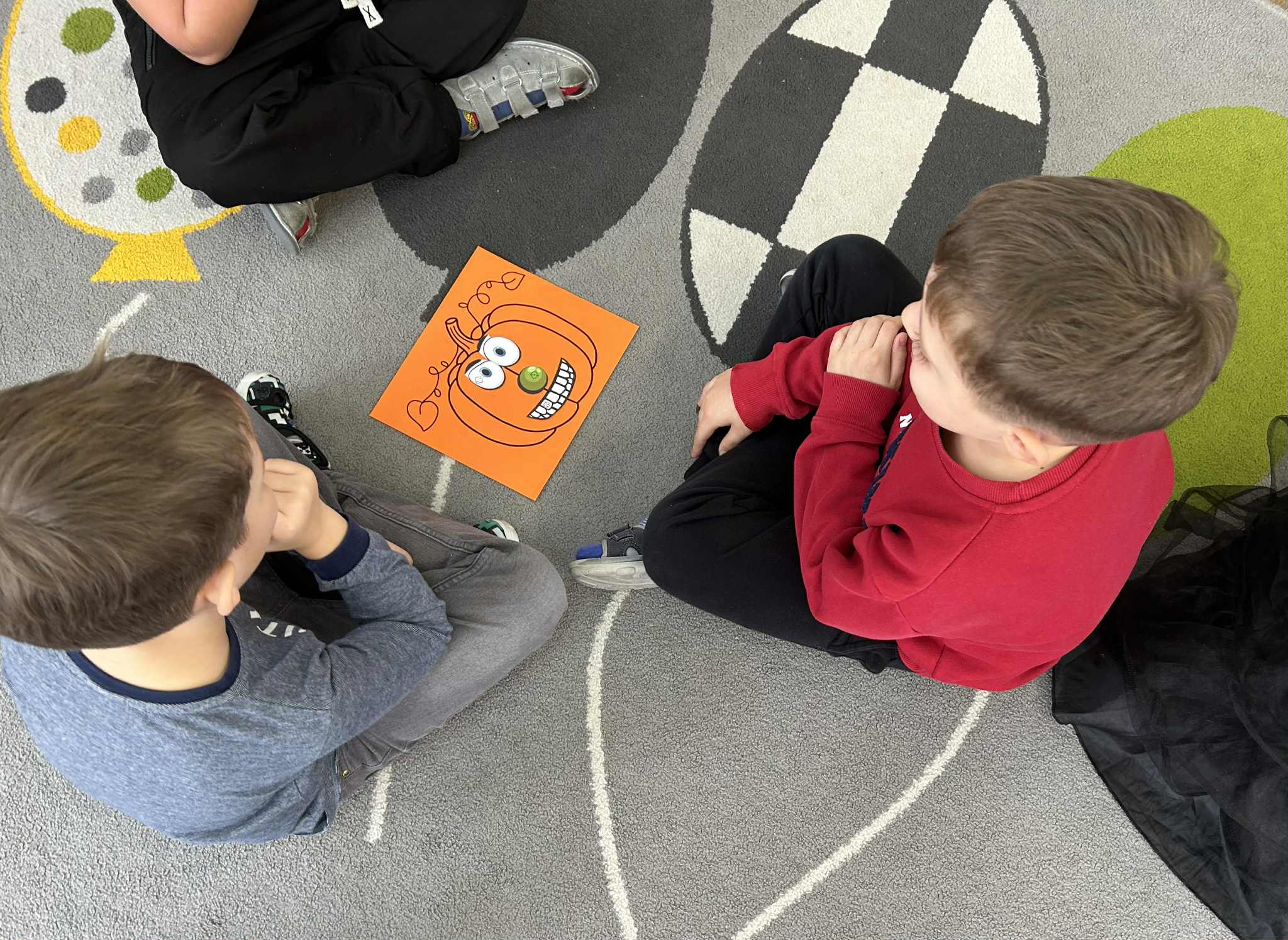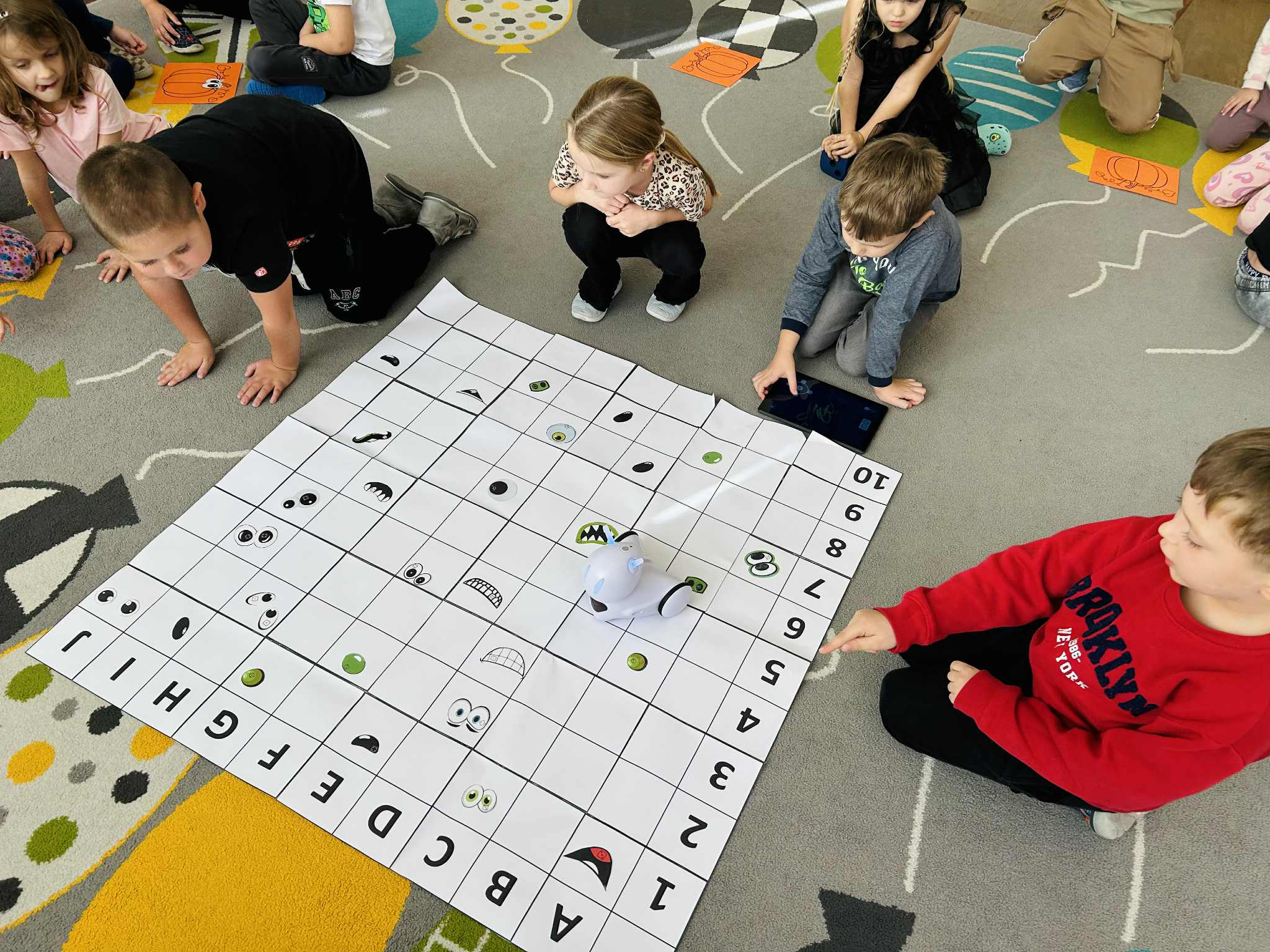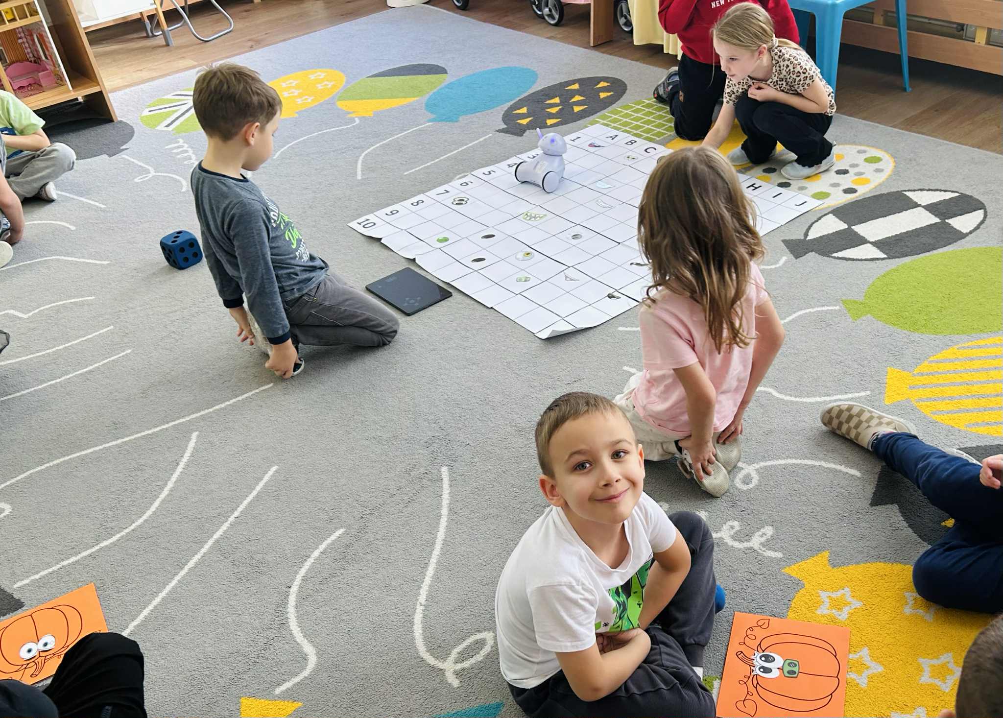 Było mnóstwo radości, nauki przez zabawę i kreatywnych wyzwań. Dzieci z ogromnym zaangażowaniem programowały trasę robota, pomagając mu dotrzeć do ukrytych dyniowych zadań. To był dzień pełen uśmiechów i nowych odkryć.