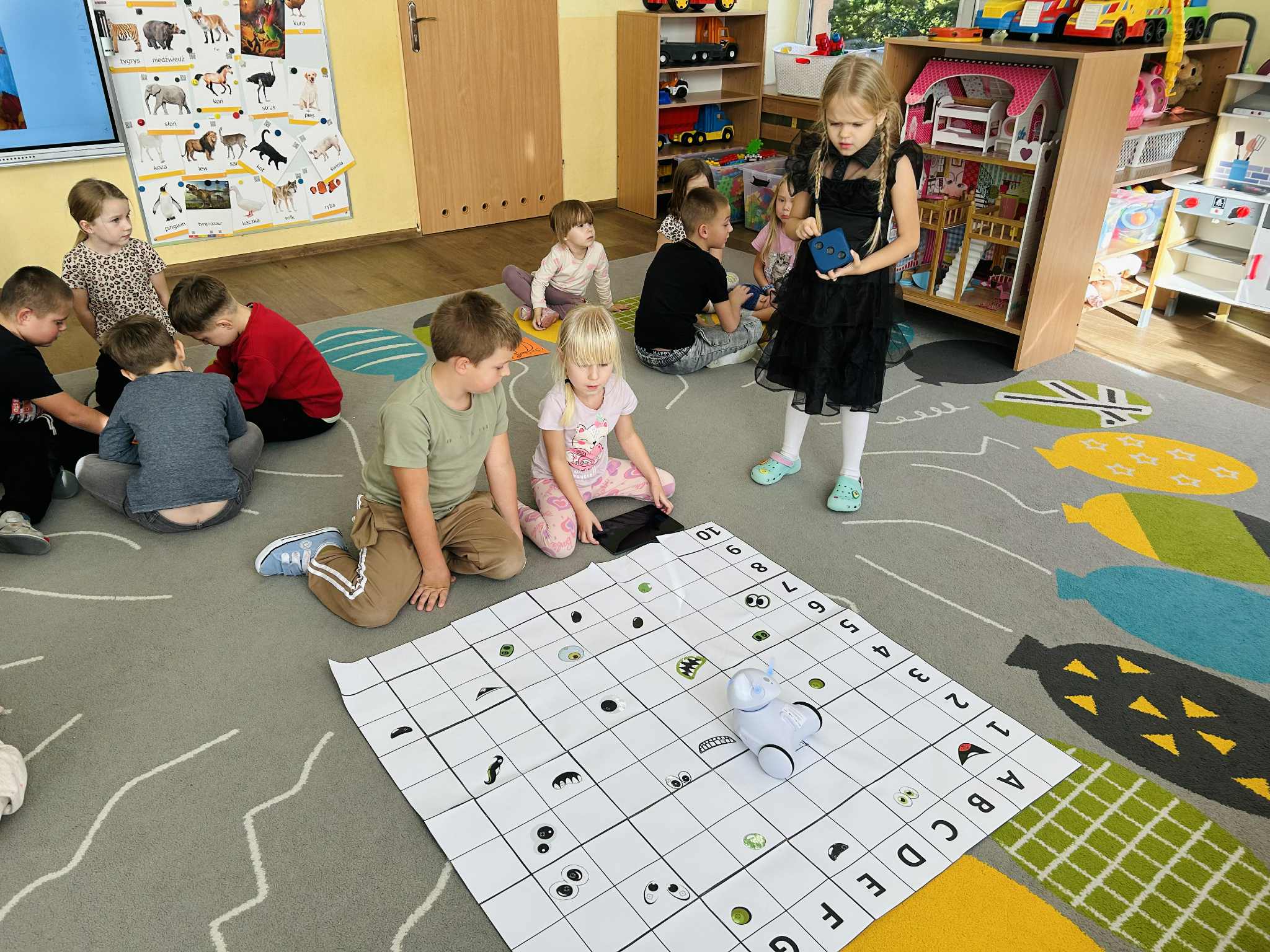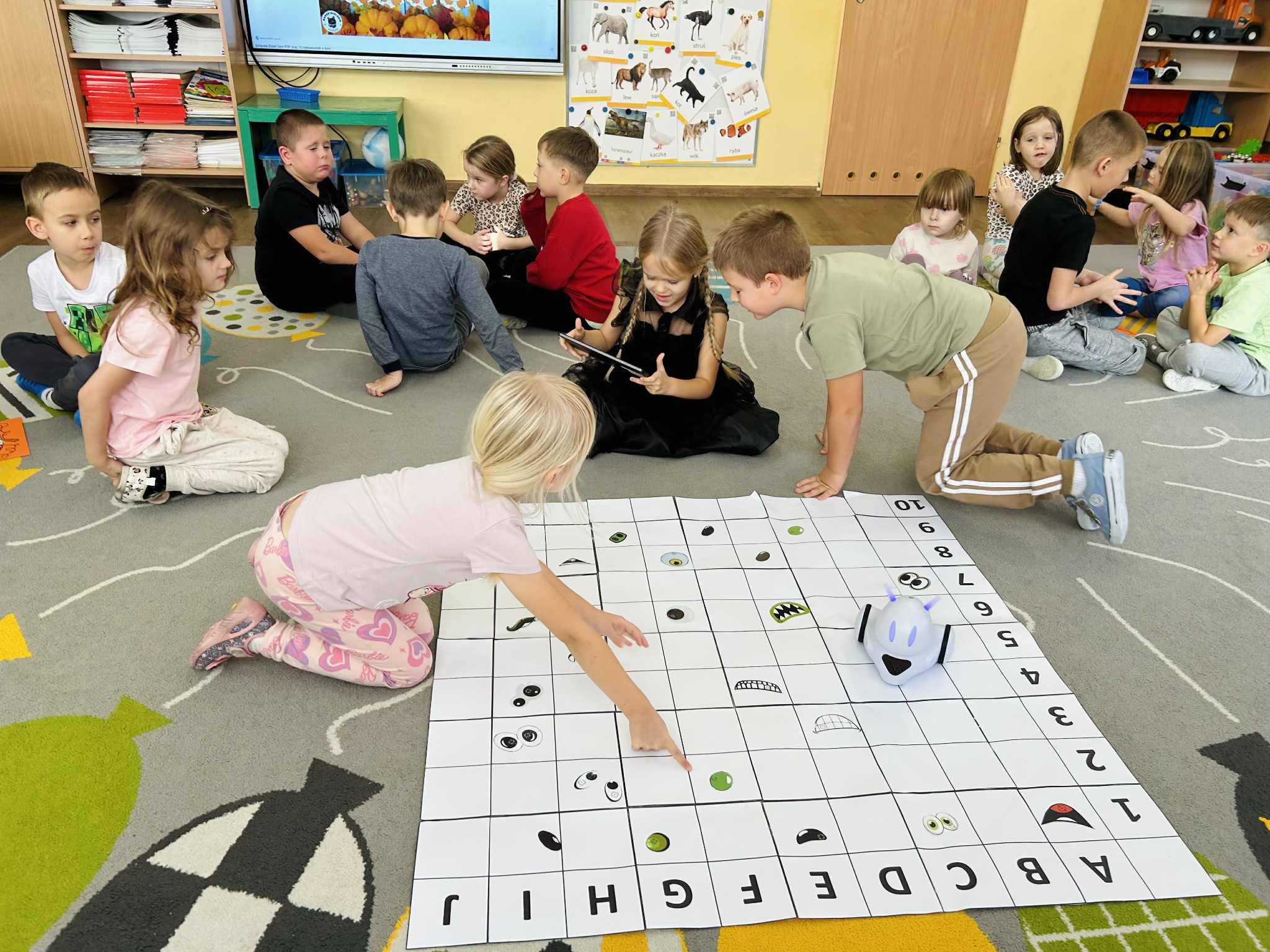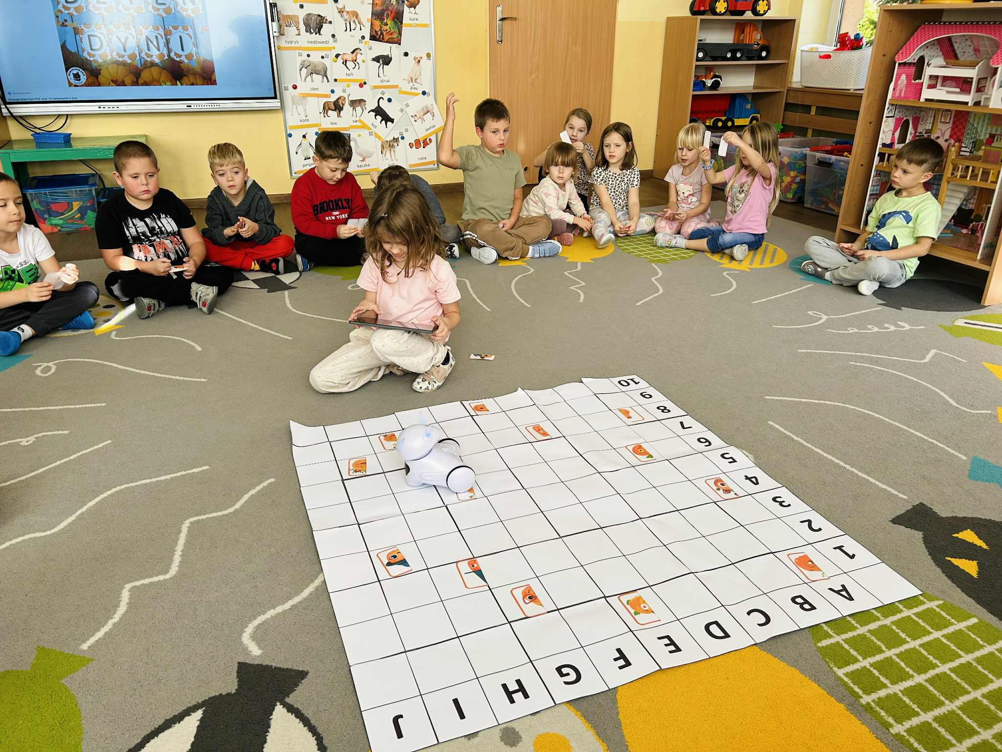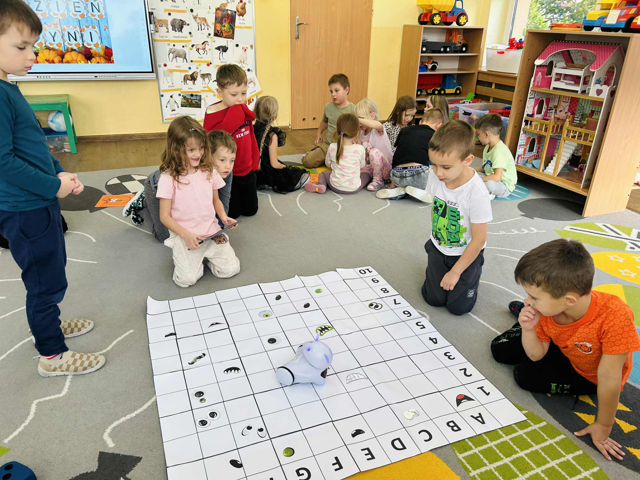 Było mnóstwo radości, nauki przez zabawę i kreatywnych wyzwań. Dzieci z ogromnym zaangażowaniem programowały trasę robota, pomagając mu dotrzeć do ukrytych dyniowych zadań. To był dzień pełen uśmiechów i nowych odkryć.