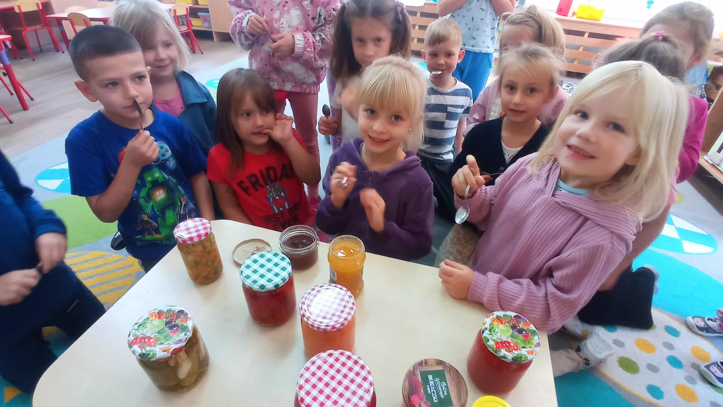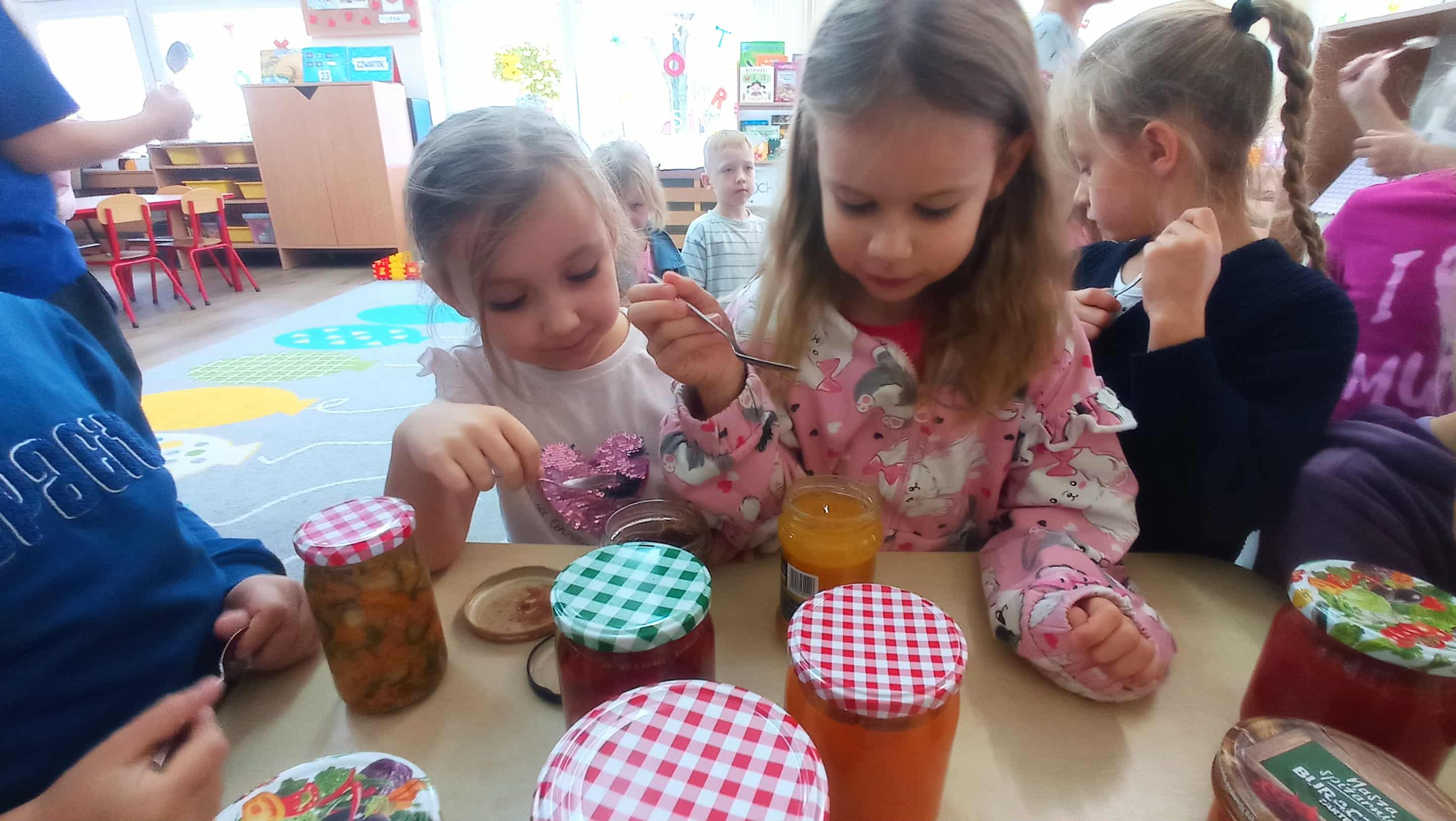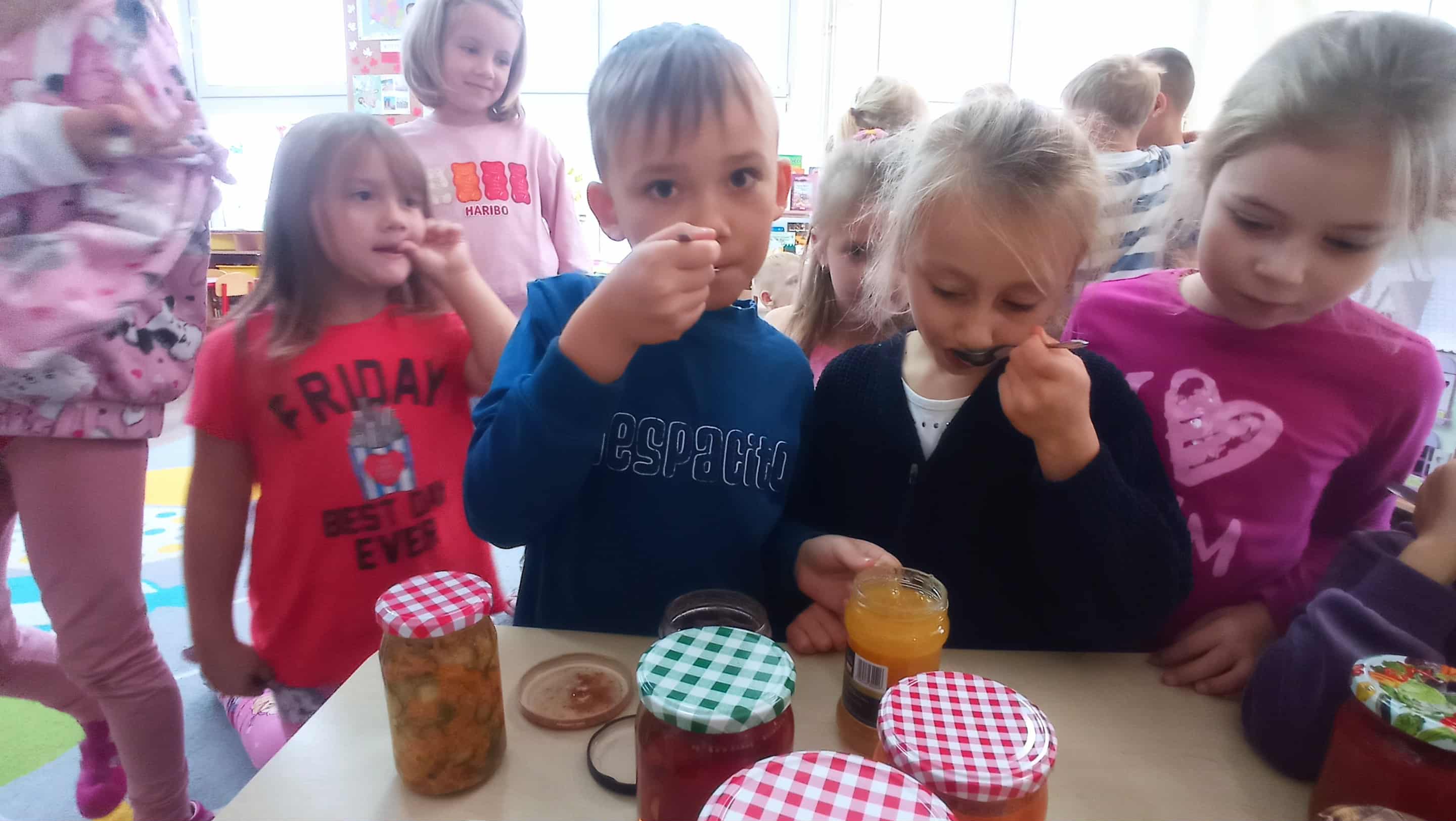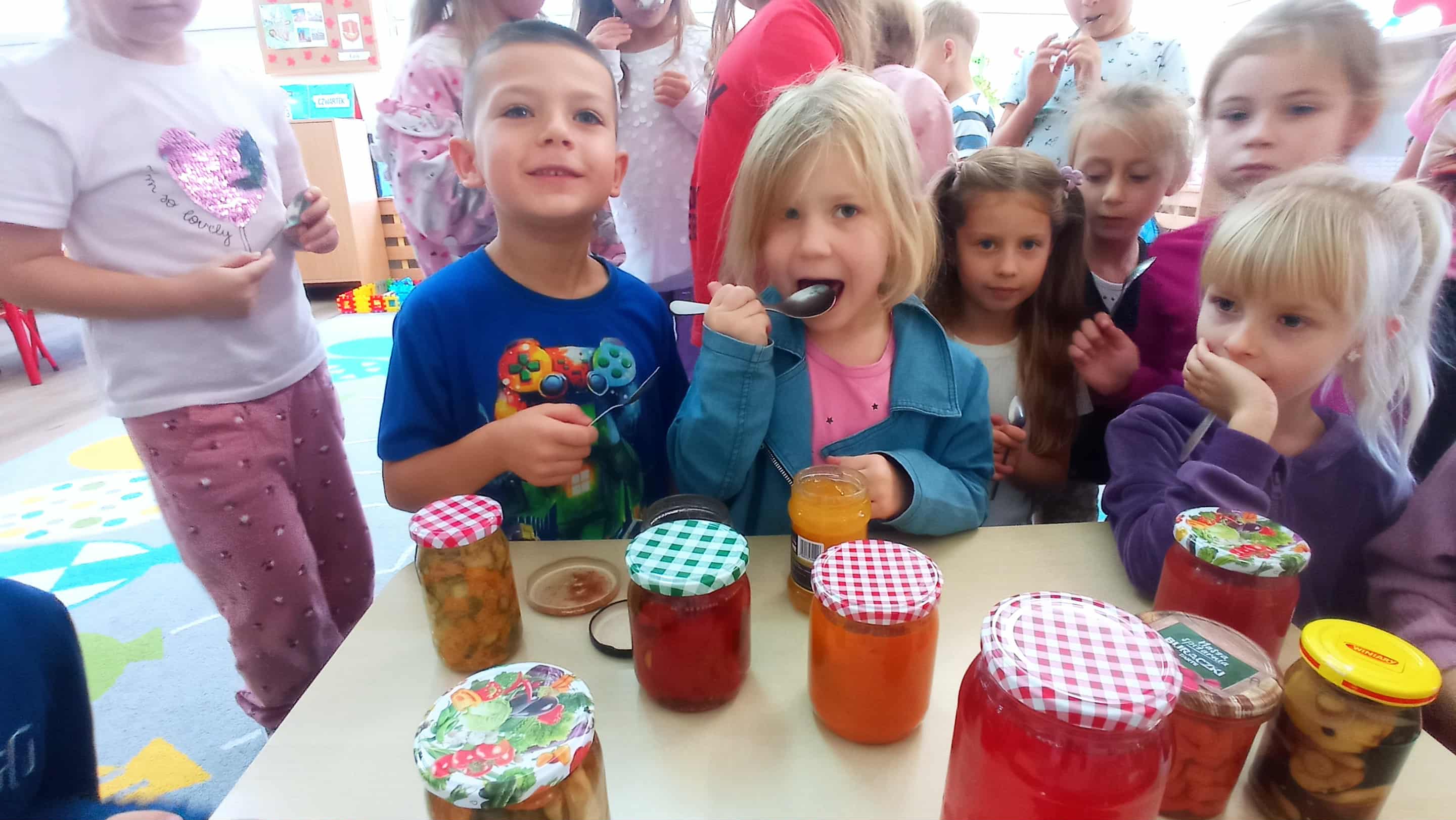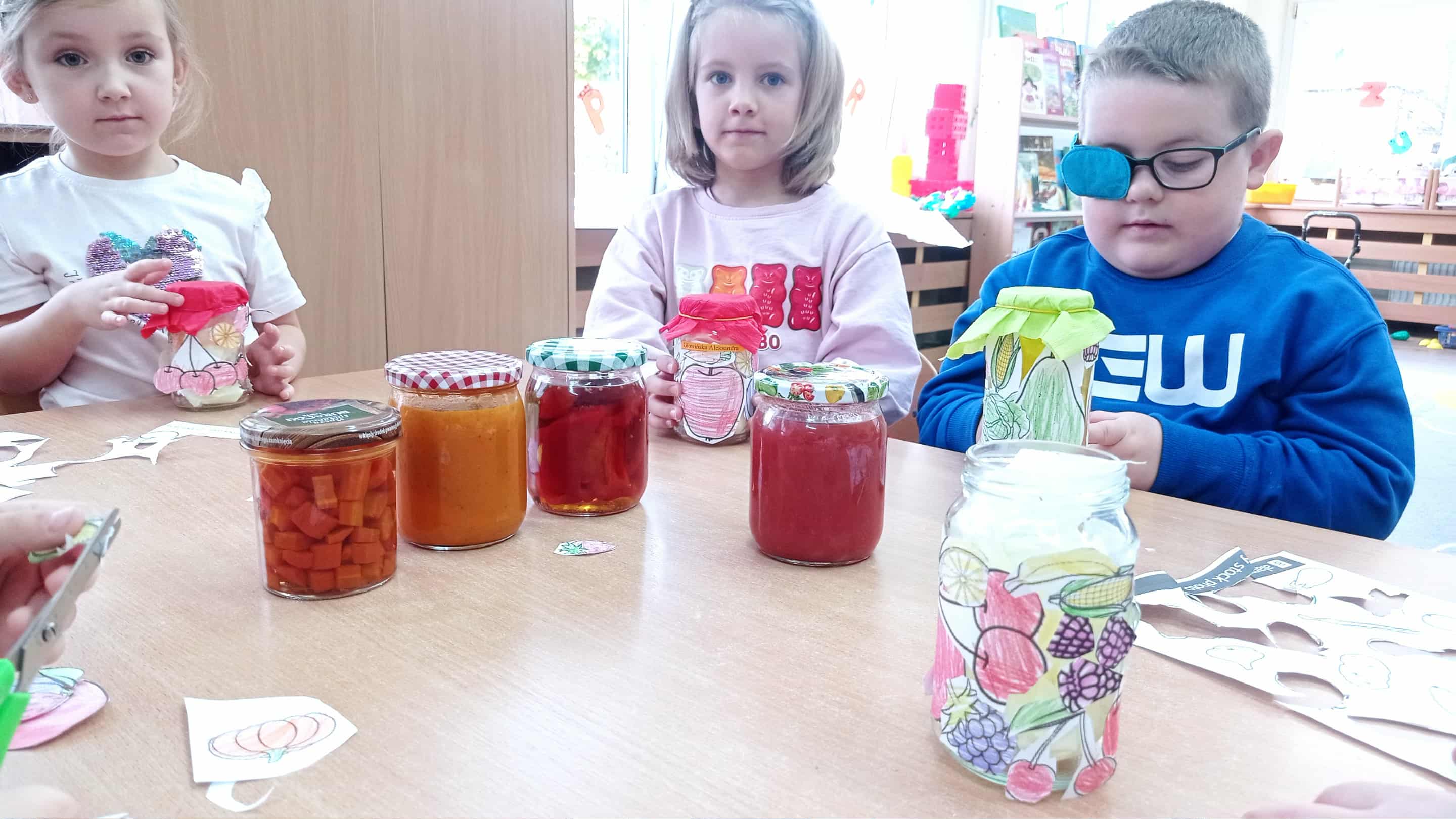 Dziś w naszym przedszkolu odbyły się wyjątkowe zajęcia. Przedszkolaki miały okazję posmakować pysznych przetworów przygotowanych z warzyw i owoców zebranych latem. Na stole pojawiły się kolorowe dżemy, kompoty, marynowane ogórki, sosy i sałatki warzywne. Dzieci z zainteresowaniem oglądały słoiczki, rozpoznawały składniki i z radością degustowały naturalne smaki lata zamknięte w słoikach. Podczas degustacji rozmawialiśmy o tym, jak powstają przetwory, dlaczego warto je robić i jakie mają wartości odżywcze. To była wspaniała lekcja o zdrowym odżywianiu, tradycjach i pracy, jaką trzeba włożyć, by zimą cieszyć się smakami lata. Dzieci wykonały własne, kolorowe słoiki z przetworami, wykorzystując słoiki, papier, bibułę, plastelinę oraz inne materiały plastyczne. W słoiczkach znalazły się soczyste owoce, warzywa i dżemy — wszystko stworzone z wyobraźni i kreatywności naszych małych artystów. To była ciekawa i twórcza zabawa, która połączyła naukę i wyobraźnię .