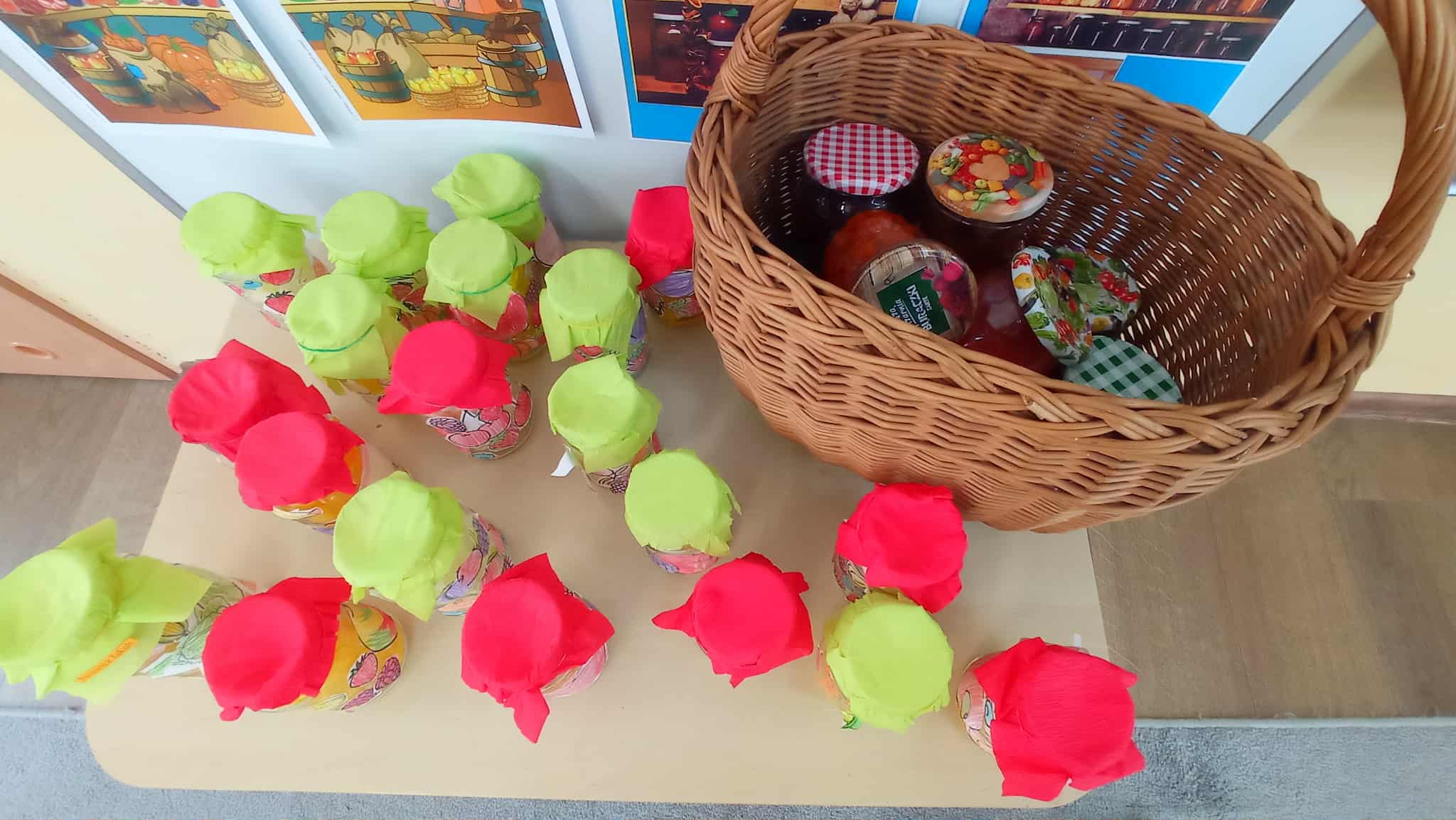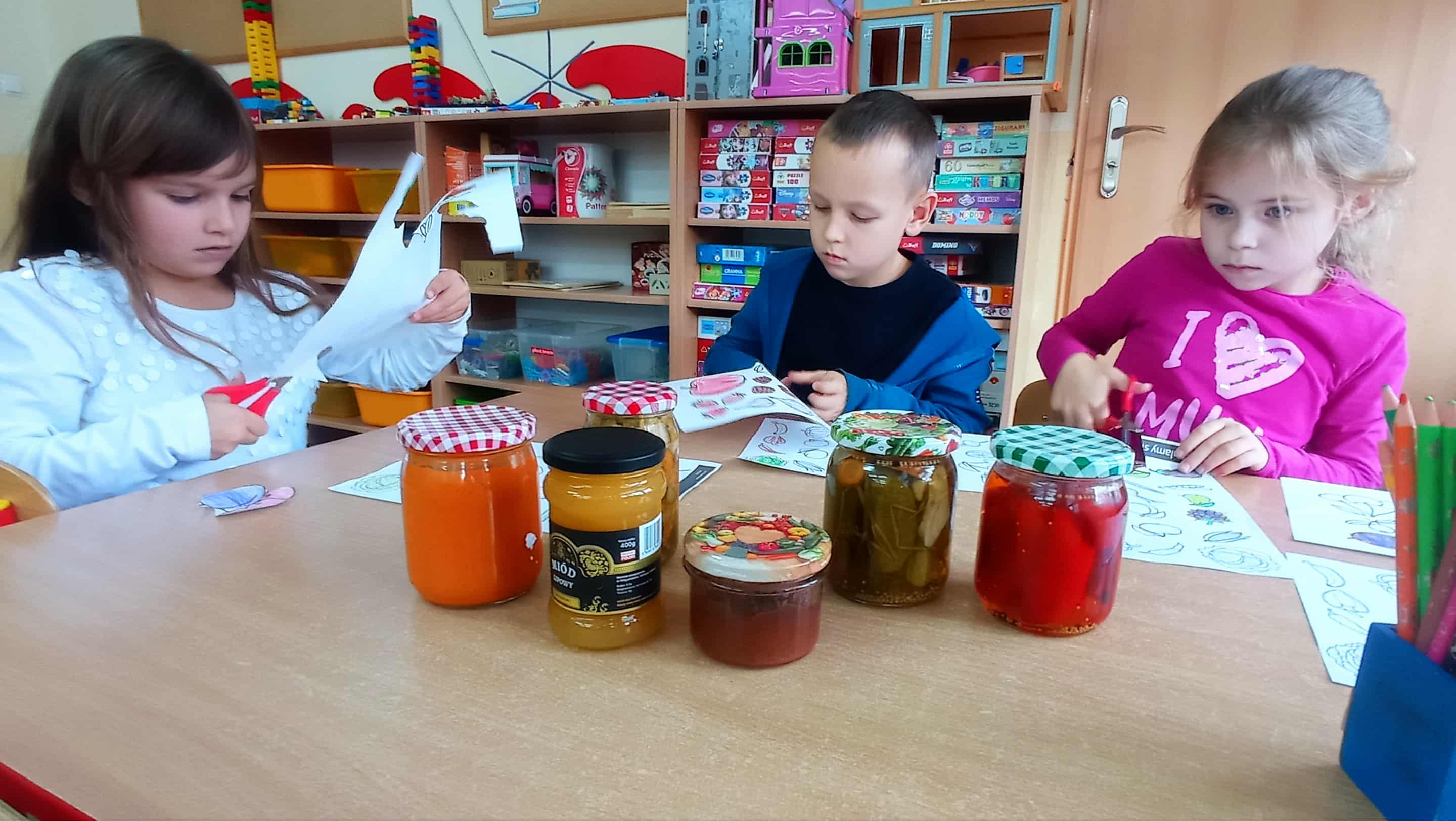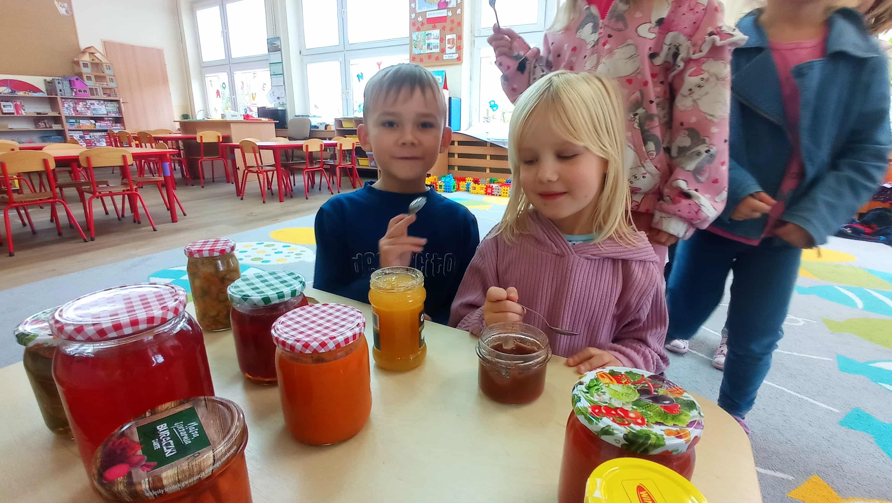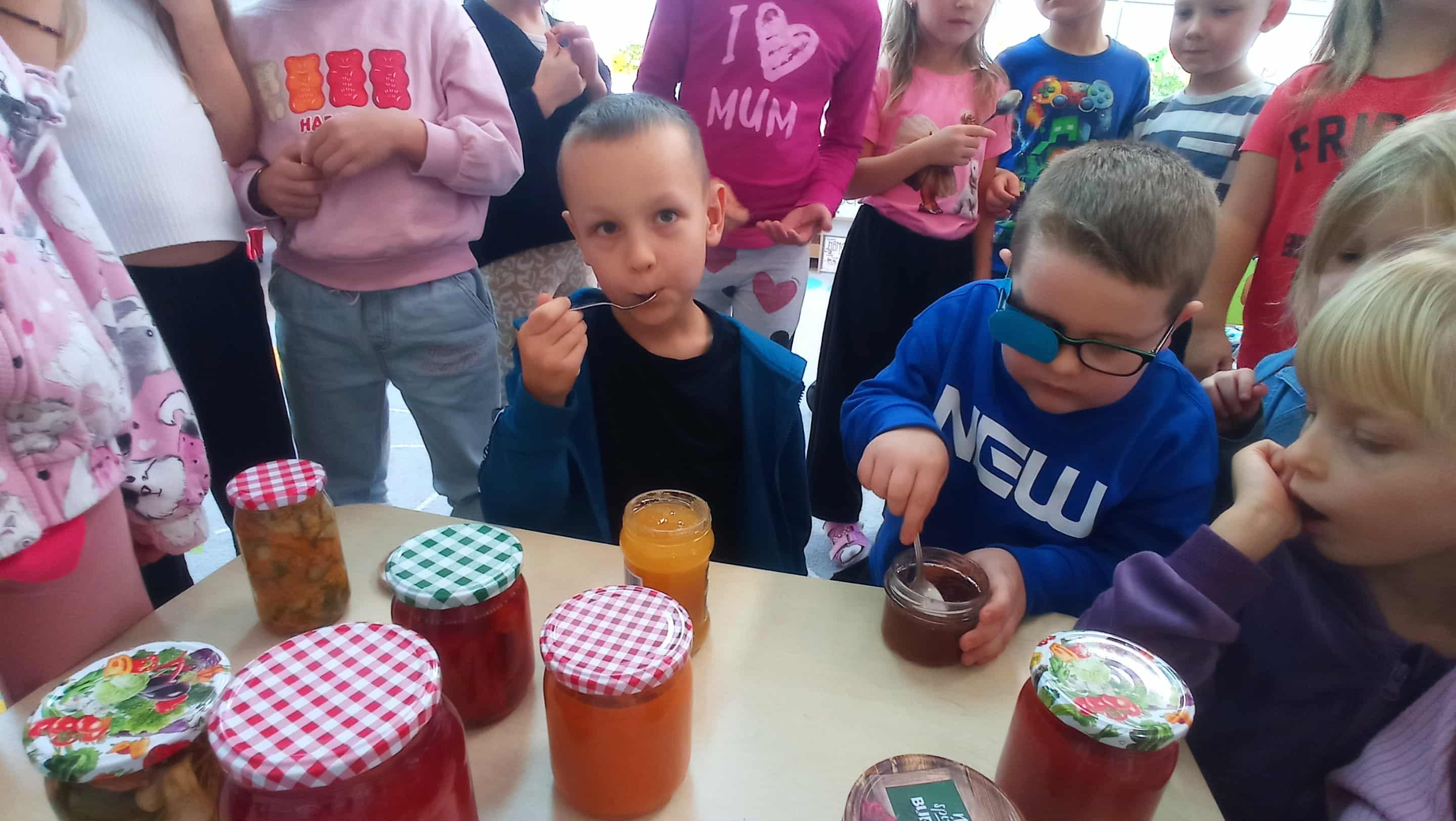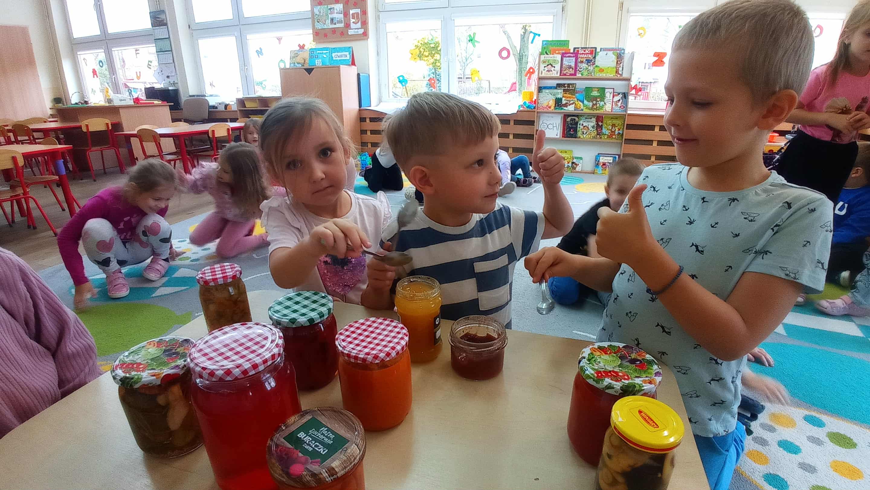 Dziś w naszym przedszkolu odbyły się wyjątkowe zajęcia. Przedszkolaki miały okazję posmakować pysznych przetworów przygotowanych z warzyw i owoców zebranych latem. Na stole pojawiły się kolorowe dżemy, kompoty, marynowane ogórki, sosy i sałatki warzywne. Dzieci z zainteresowaniem oglądały słoiczki, rozpoznawały składniki i z radością degustowały naturalne smaki lata zamknięte w słoikach. Podczas degustacji rozmawialiśmy o tym, jak powstają przetwory, dlaczego warto je robić i jakie mają wartości odżywcze. To była wspaniała lekcja o zdrowym odżywianiu, tradycjach i pracy, jaką trzeba włożyć, by zimą cieszyć się smakami lata. Dzieci wykonały własne, kolorowe słoiki z przetworami, wykorzystując słoiki, papier, bibułę, plastelinę oraz inne materiały plastyczne. W słoiczkach znalazły się soczyste owoce, warzywa i dżemy — wszystko stworzone z wyobraźni i kreatywności naszych małych artystów. To była ciekawa i twórcza zabawa, która połączyła naukę i wyobraźnię .