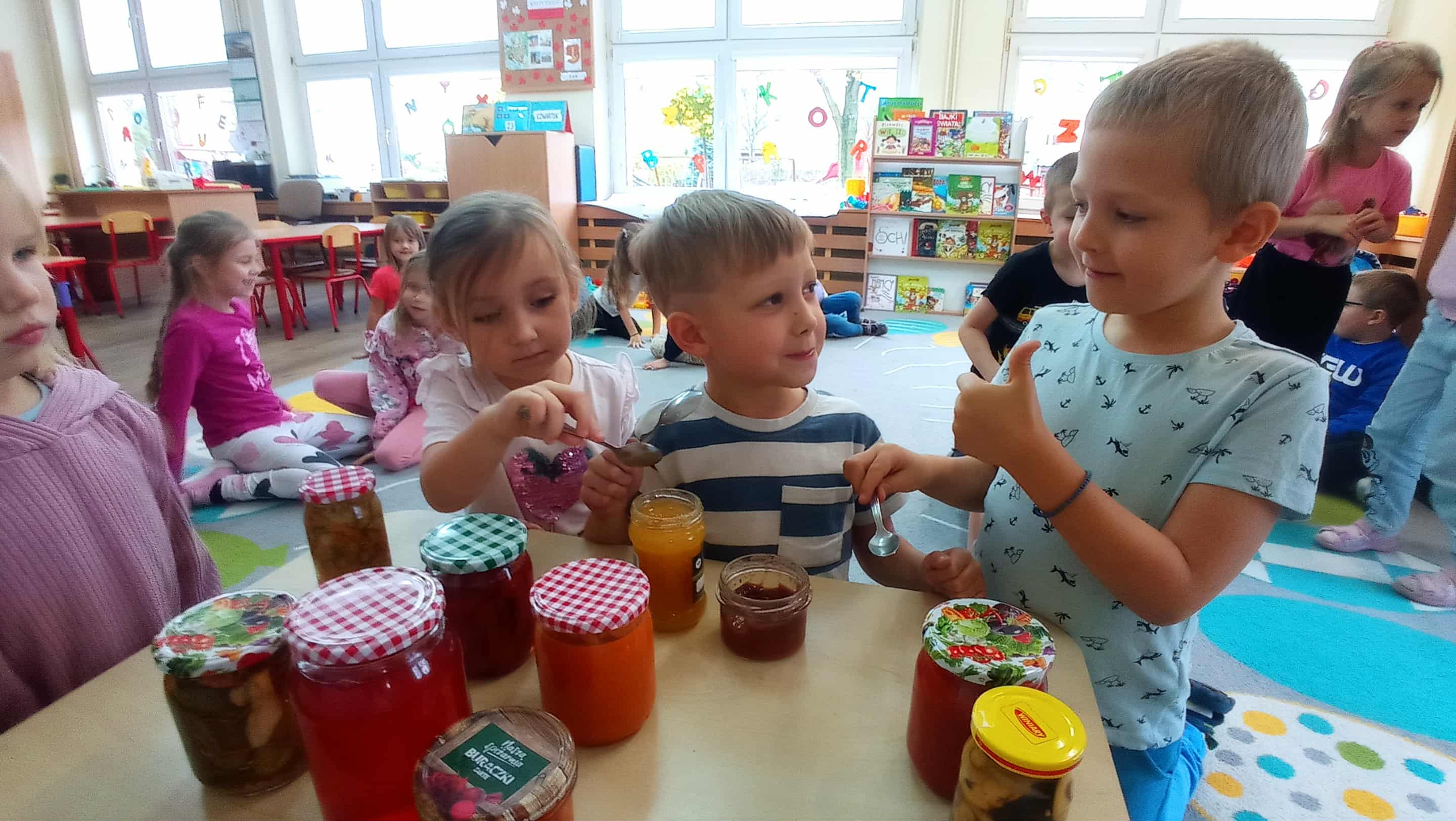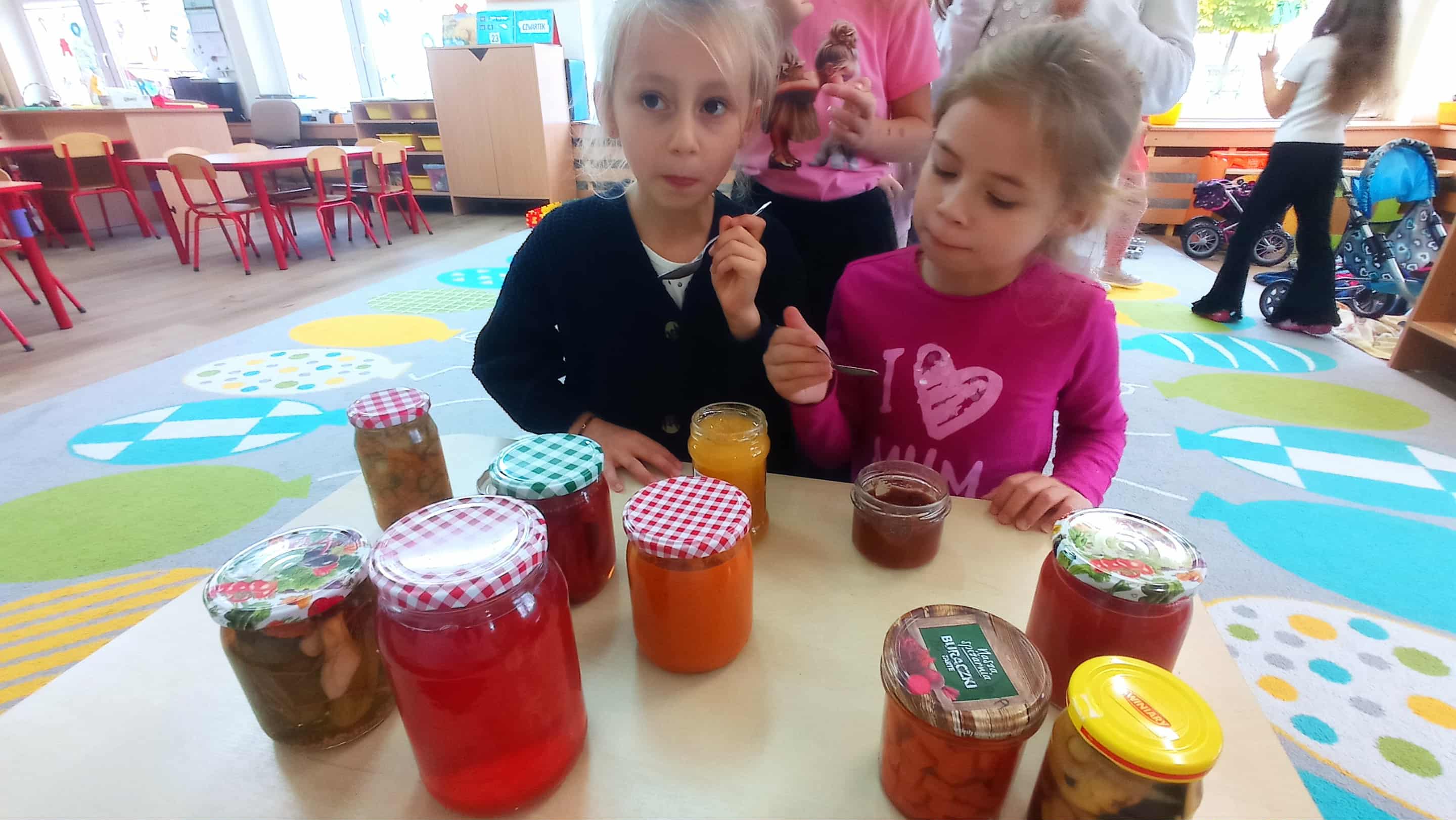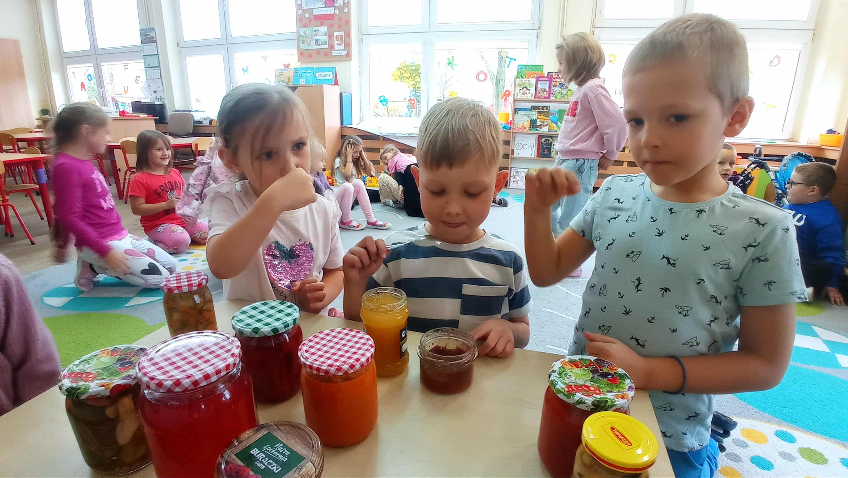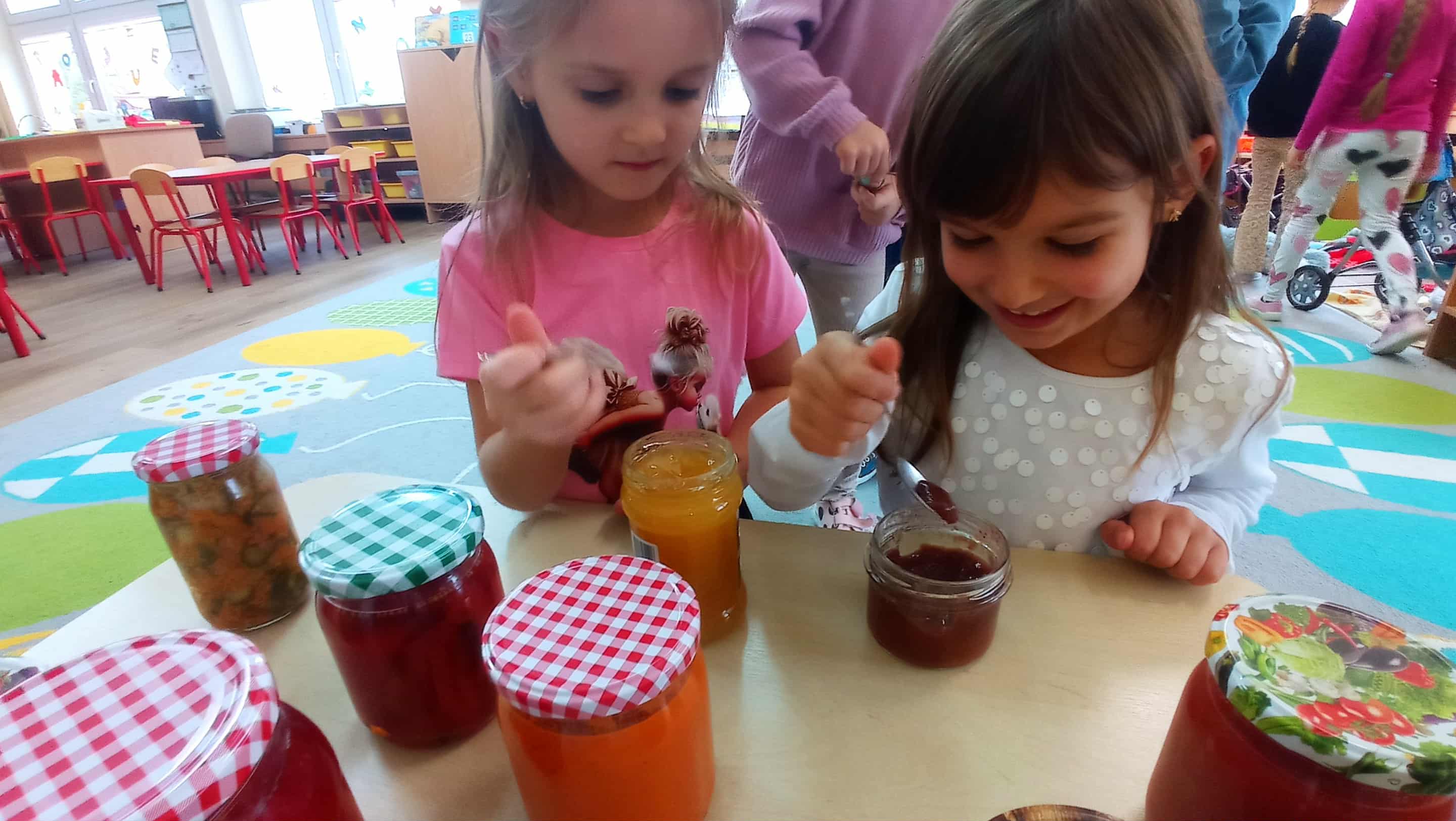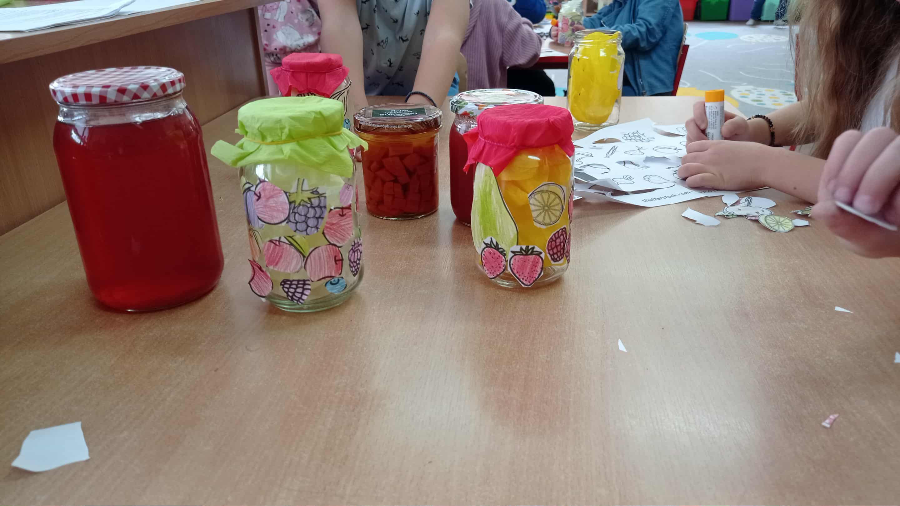 Dziś w naszym przedszkolu odbyły się wyjątkowe zajęcia. Przedszkolaki miały okazję posmakować pysznych przetworów przygotowanych z warzyw i owoców zebranych latem. Na stole pojawiły się kolorowe dżemy, kompoty, marynowane ogórki, sosy i sałatki warzywne. Dzieci z zainteresowaniem oglądały słoiczki, rozpoznawały składniki i z radością degustowały naturalne smaki lata zamknięte w słoikach. Podczas degustacji rozmawialiśmy o tym, jak powstają przetwory, dlaczego warto je robić i jakie mają wartości odżywcze. To była wspaniała lekcja o zdrowym odżywianiu, tradycjach i pracy, jaką trzeba włożyć, by zimą cieszyć się smakami lata. Dzieci wykonały własne, kolorowe słoiki z przetworami, wykorzystując słoiki, papier, bibułę, plastelinę oraz inne materiały plastyczne. W słoiczkach znalazły się soczyste owoce, warzywa i dżemy — wszystko stworzone z wyobraźni i kreatywności naszych małych artystów. To była ciekawa i twórcza zabawa, która połączyła naukę i wyobraźnię .