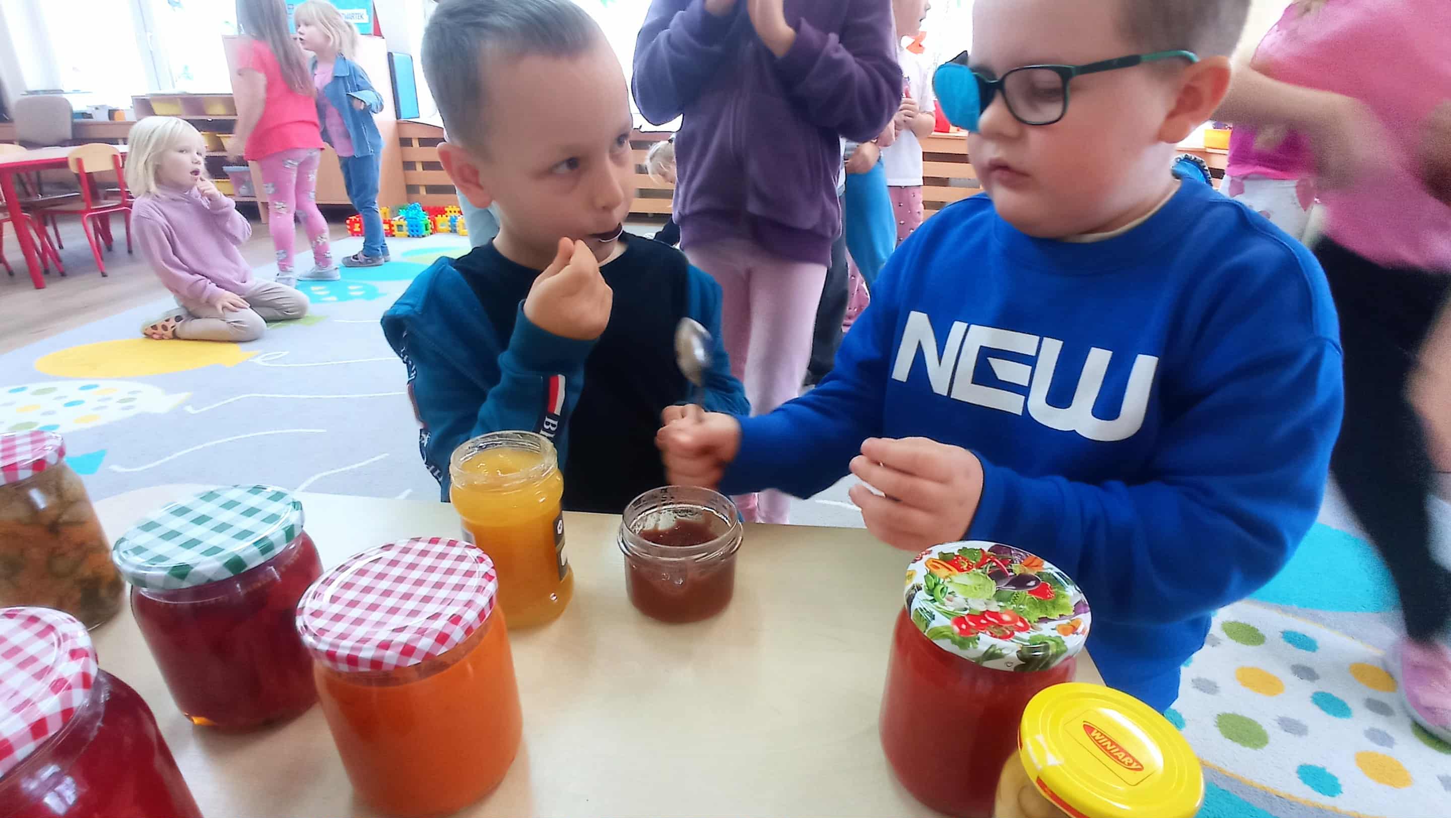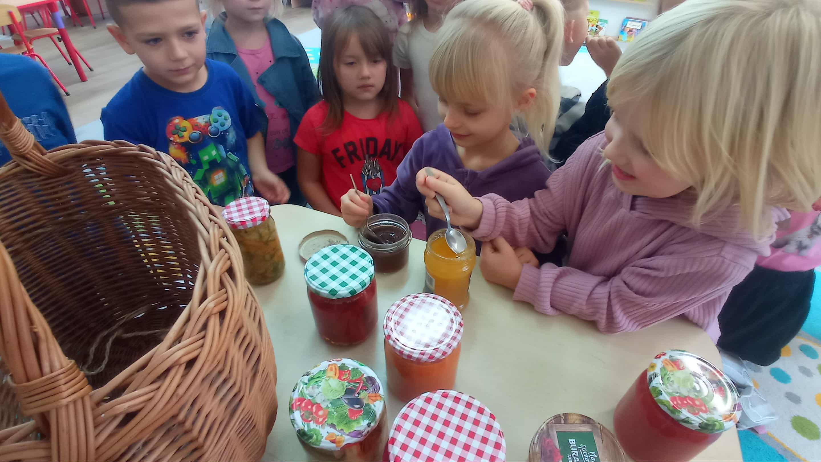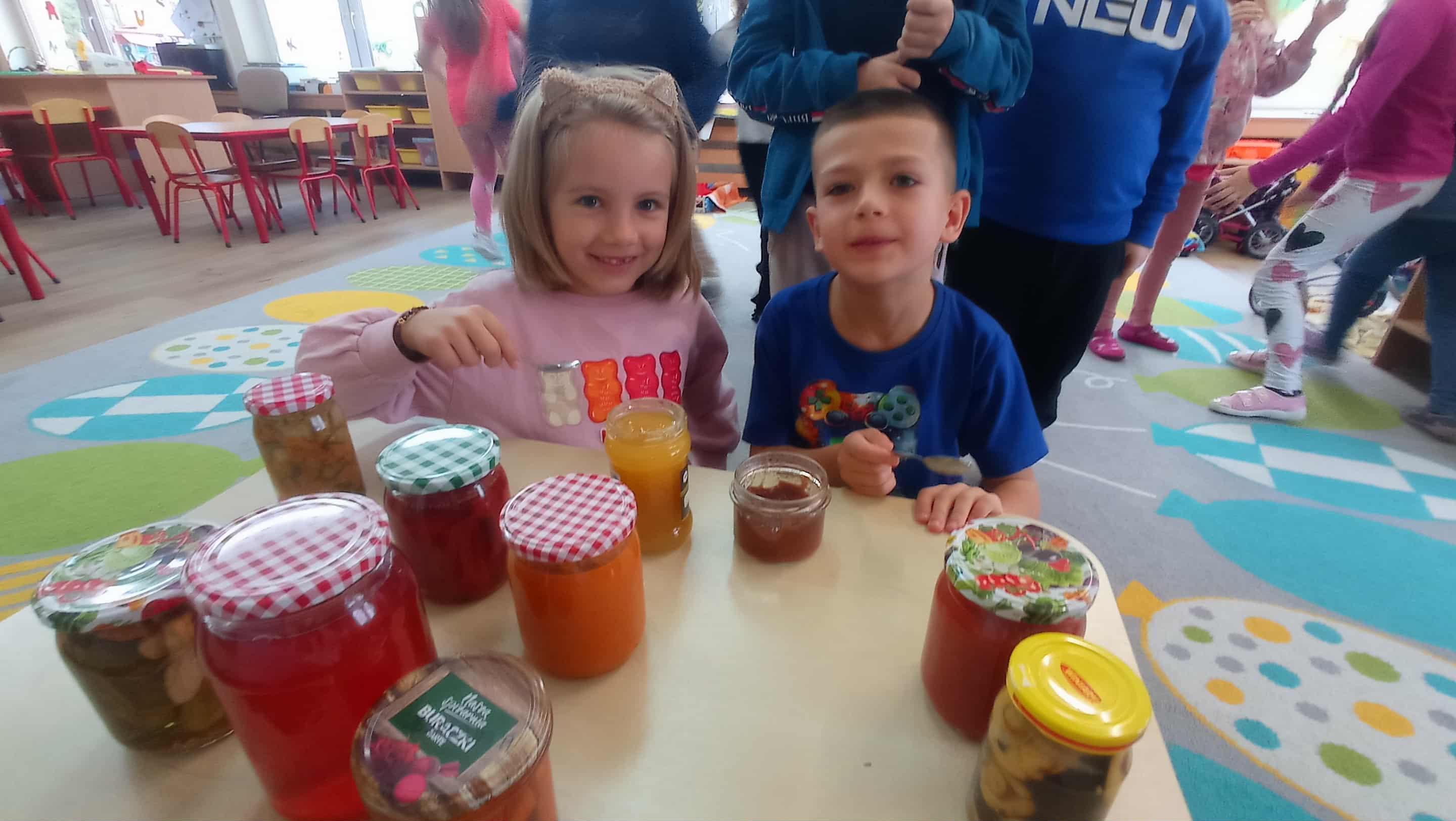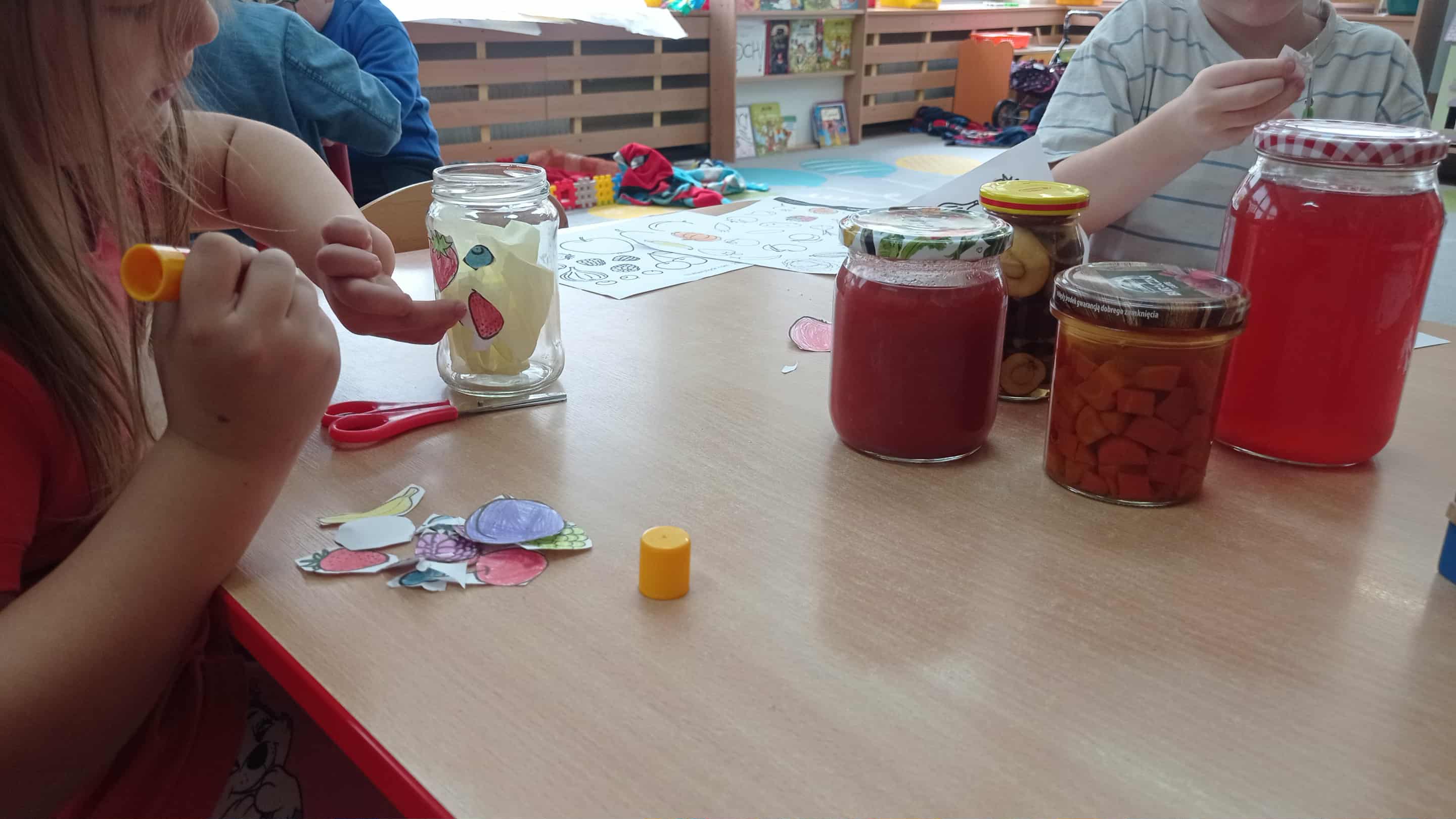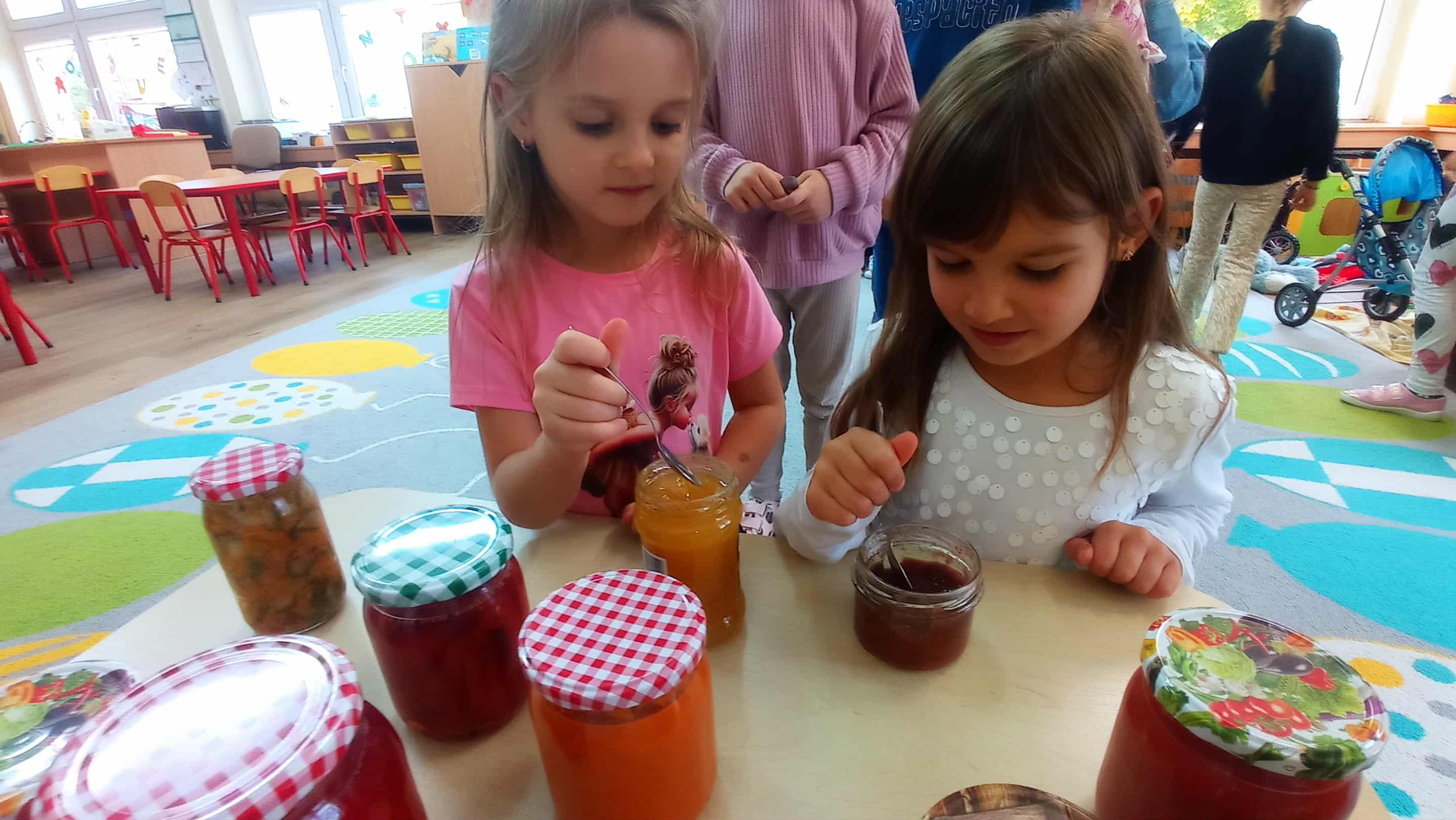 Dziś w naszym przedszkolu odbyły się wyjątkowe zajęcia. Przedszkolaki miały okazję posmakować pysznych przetworów przygotowanych z warzyw i owoców zebranych latem. Na stole pojawiły się kolorowe dżemy, kompoty, marynowane ogórki, sosy i sałatki warzywne. Dzieci z zainteresowaniem oglądały słoiczki, rozpoznawały składniki i z radością degustowały naturalne smaki lata zamknięte w słoikach. Podczas degustacji rozmawialiśmy o tym, jak powstają przetwory, dlaczego warto je robić i jakie mają wartości odżywcze. To była wspaniała lekcja o zdrowym odżywianiu, tradycjach i pracy, jaką trzeba włożyć, by zimą cieszyć się smakami lata. Dzieci wykonały własne, kolorowe słoiki z przetworami, wykorzystując słoiki, papier, bibułę, plastelinę oraz inne materiały plastyczne. W słoiczkach znalazły się soczyste owoce, warzywa i dżemy — wszystko stworzone z wyobraźni i kreatywności naszych małych artystów. To była ciekawa i twórcza zabawa, która połączyła naukę i wyobraźnię .