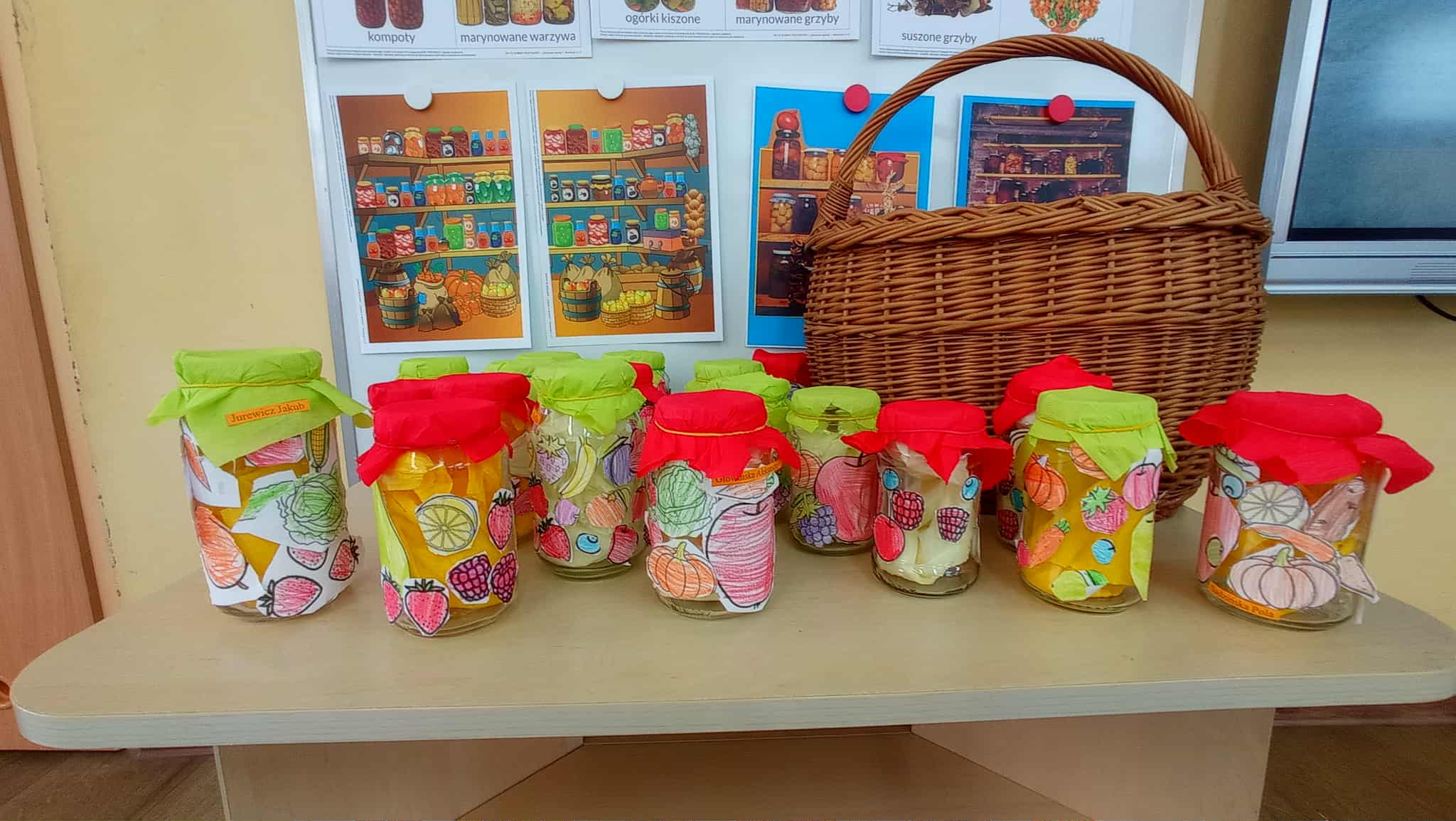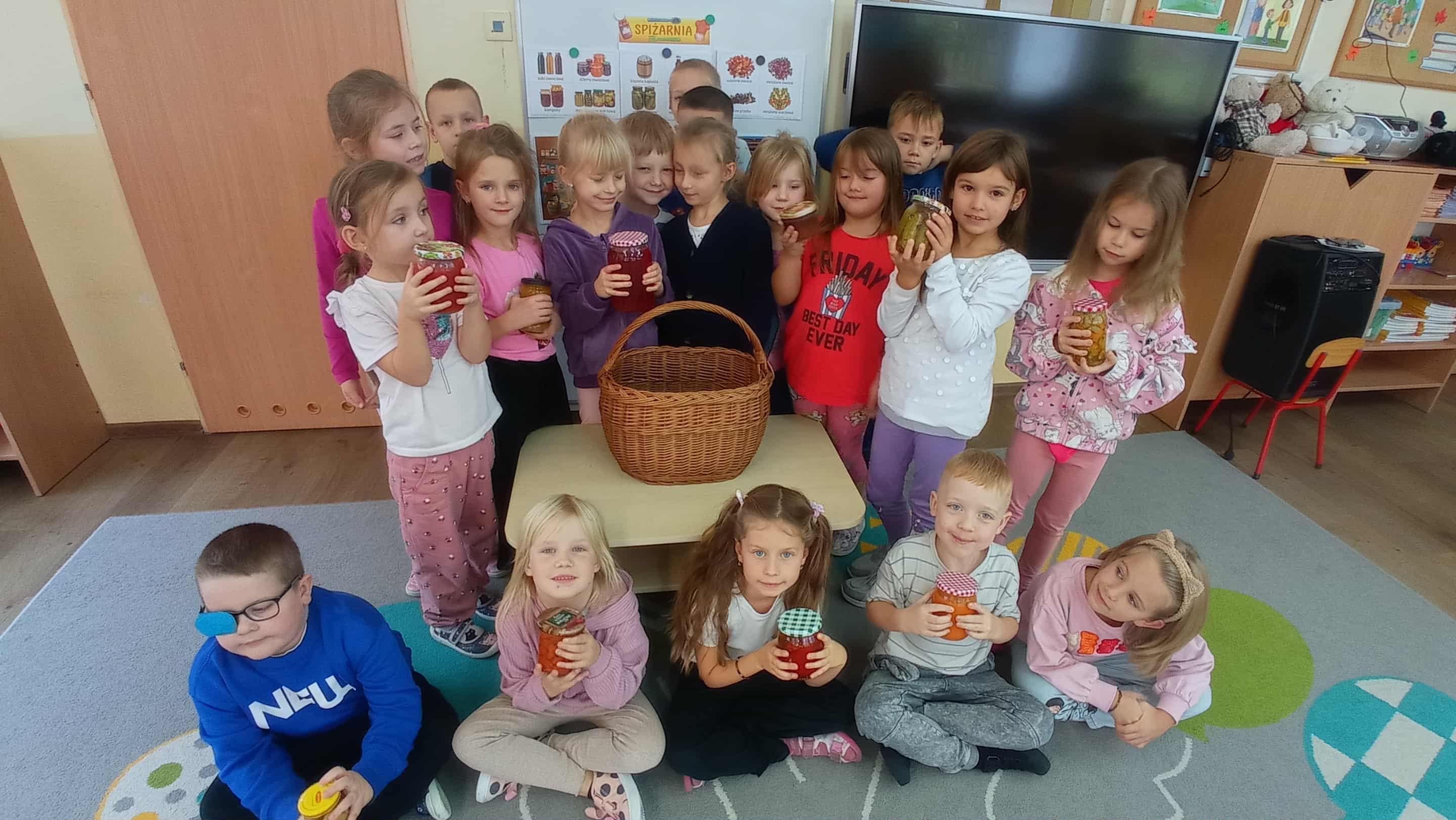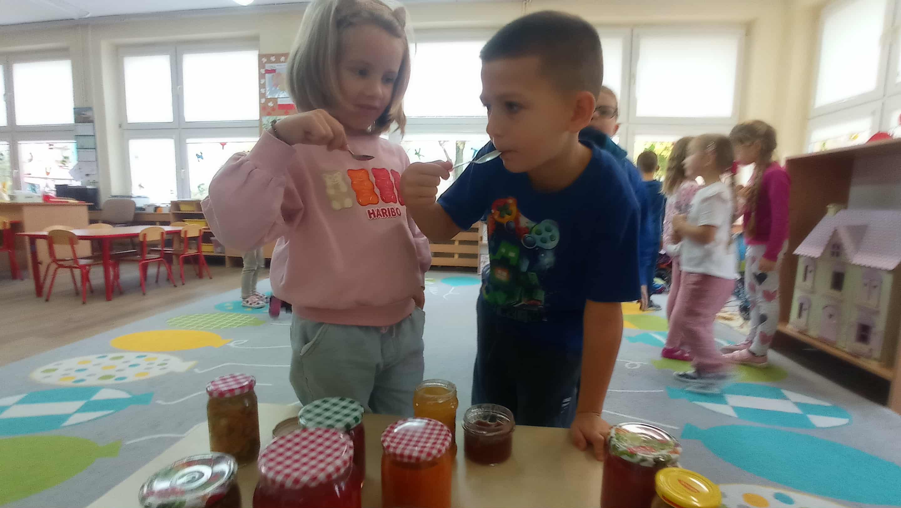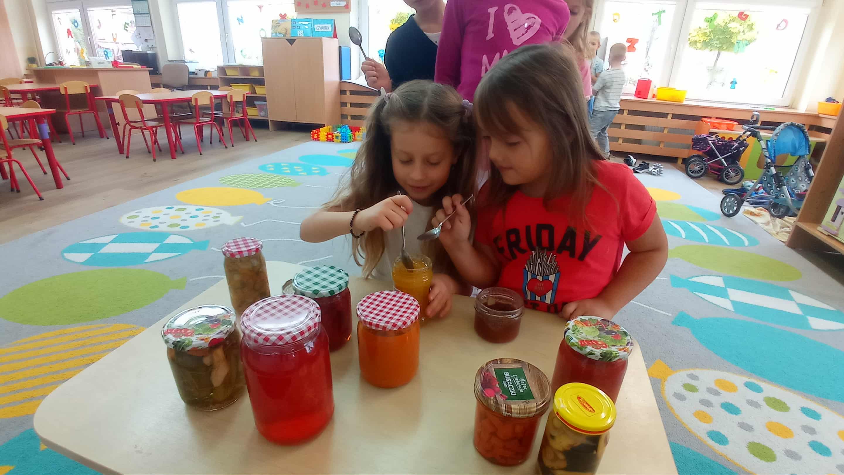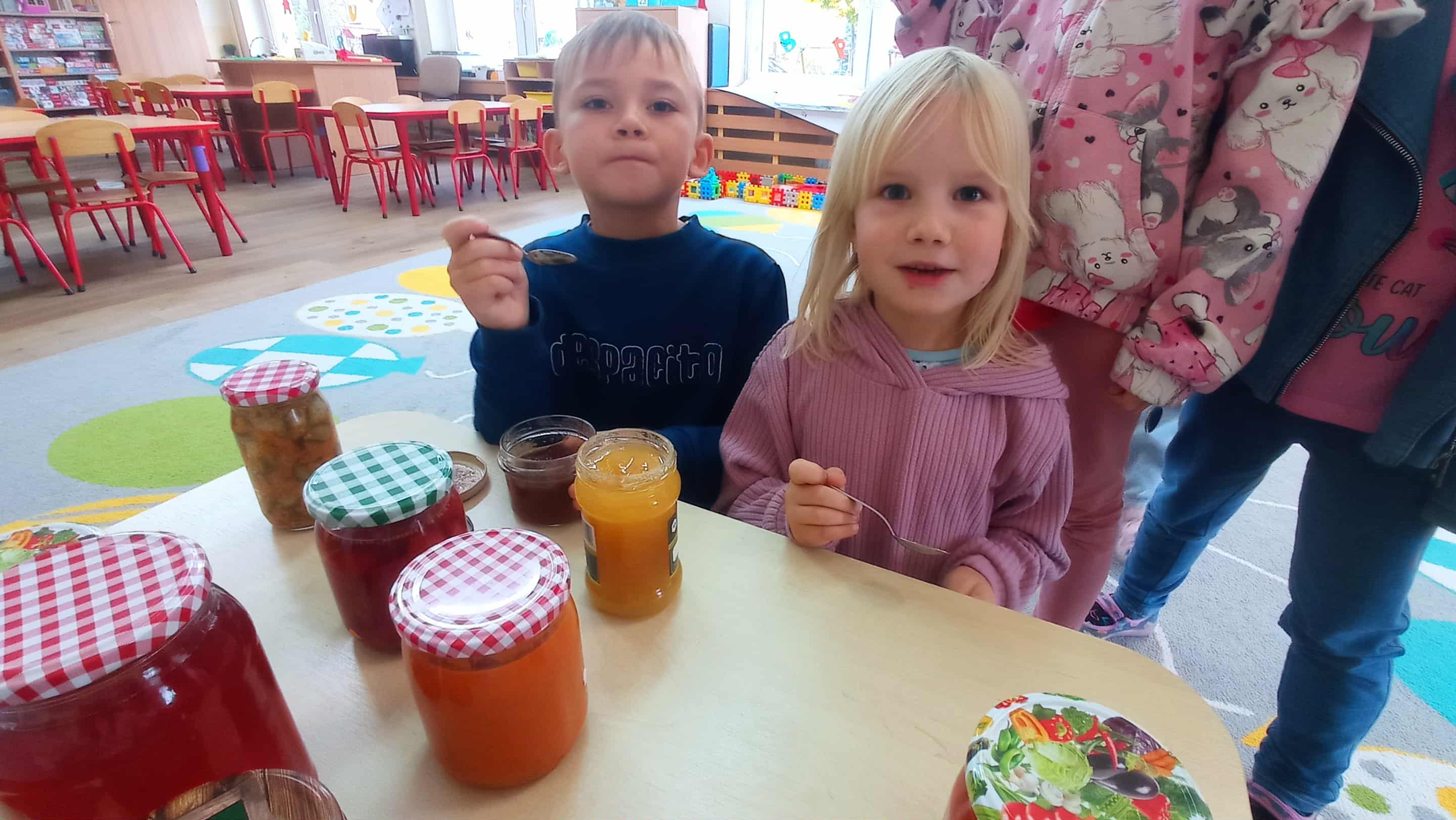 Dziś w naszym przedszkolu odbyły się wyjątkowe zajęcia. Przedszkolaki miały okazję posmakować pysznych przetworów przygotowanych z warzyw i owoców zebranych latem. Na stole pojawiły się kolorowe dżemy, kompoty, marynowane ogórki, sosy i sałatki warzywne. Dzieci z zainteresowaniem oglądały słoiczki, rozpoznawały składniki i z radością degustowały naturalne smaki lata zamknięte w słoikach. Podczas degustacji rozmawialiśmy o tym, jak powstają przetwory, dlaczego warto je robić i jakie mają wartości odżywcze. To była wspaniała lekcja o zdrowym odżywianiu, tradycjach i pracy, jaką trzeba włożyć, by zimą cieszyć się smakami lata. Dzieci wykonały własne, kolorowe słoiki z przetworami, wykorzystując słoiki, papier, bibułę, plastelinę oraz inne materiały plastyczne. W słoiczkach znalazły się soczyste owoce, warzywa i dżemy — wszystko stworzone z wyobraźni i kreatywności naszych małych artystów. To była ciekawa i twórcza zabawa, która połączyła naukę i wyobraźnię .