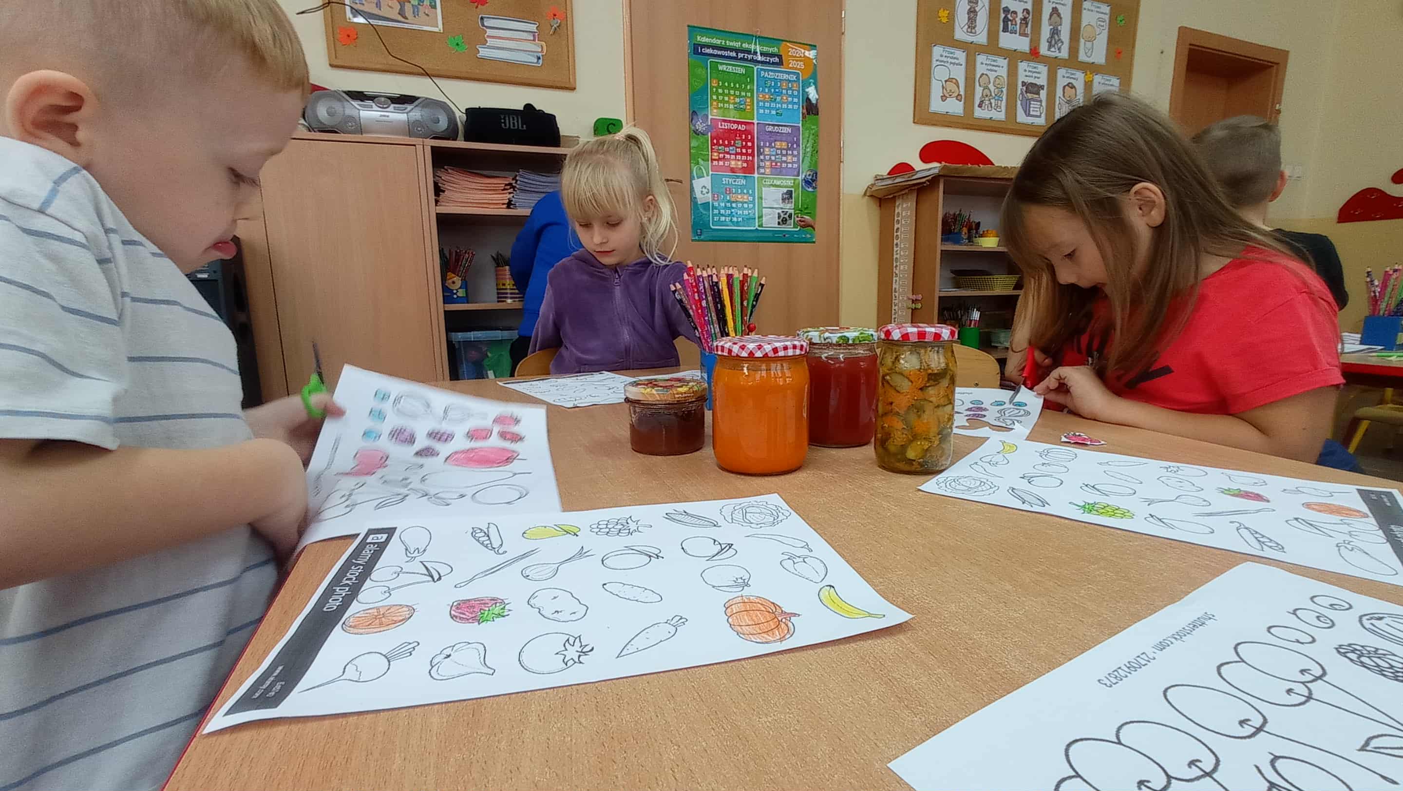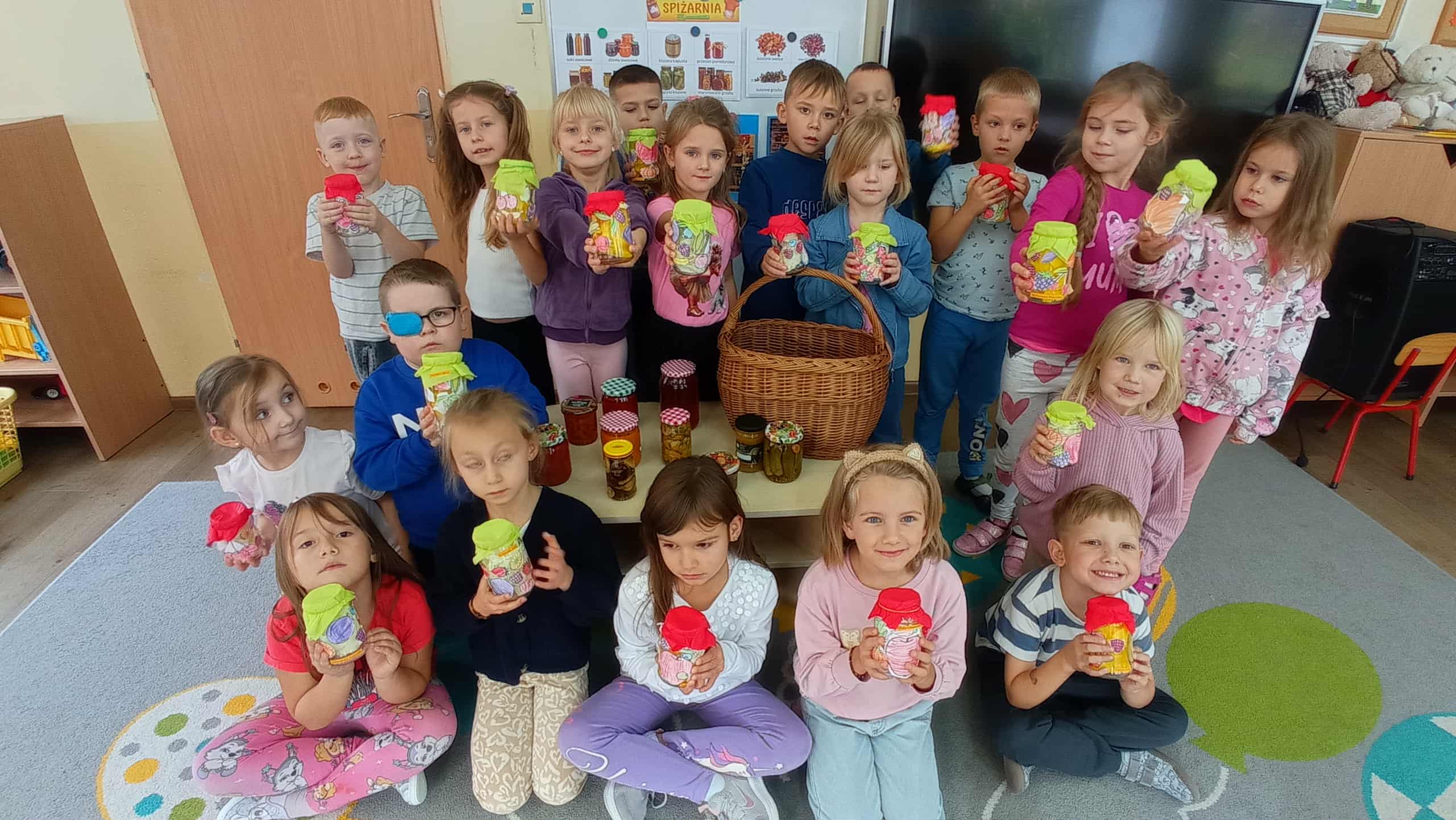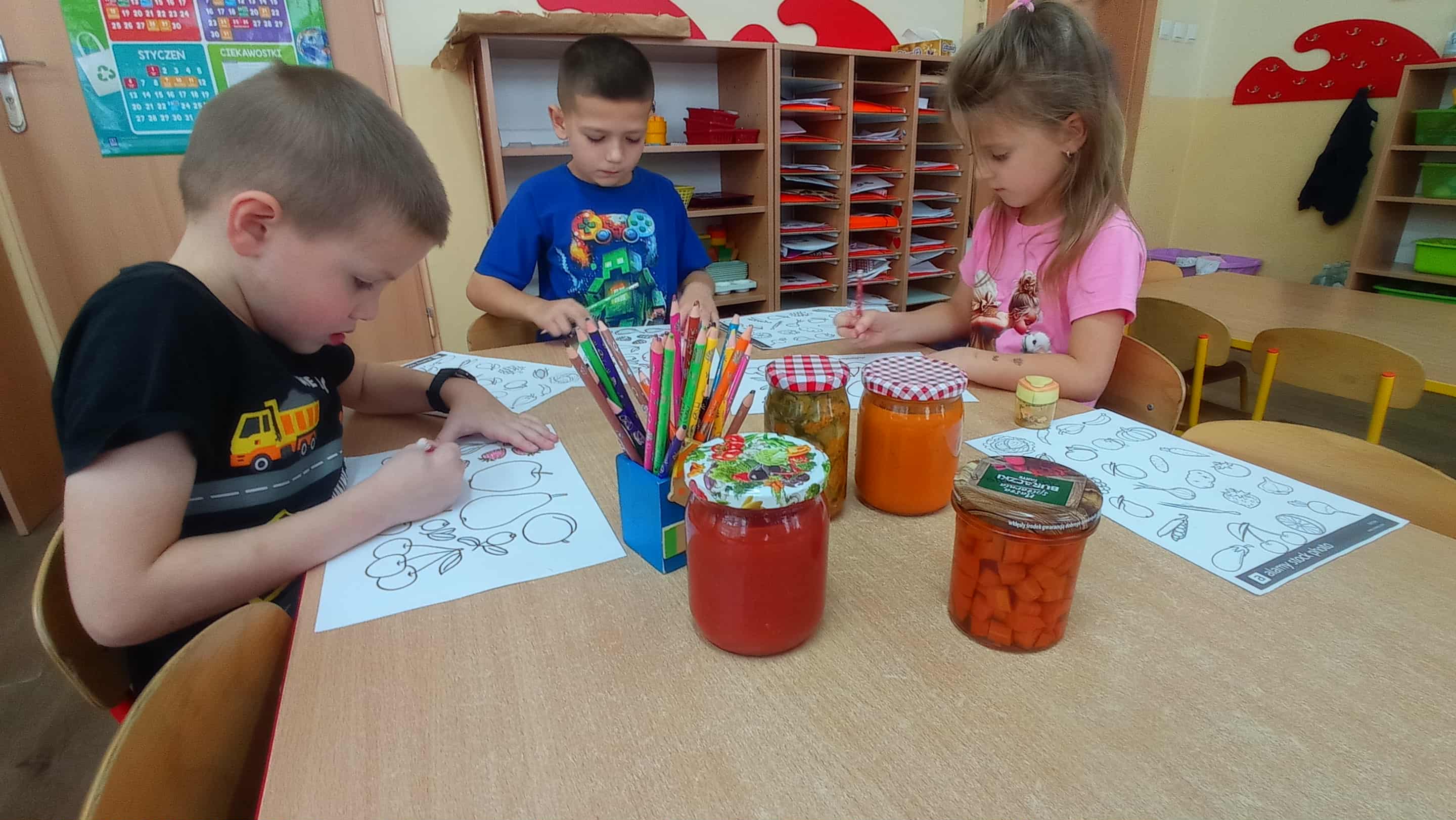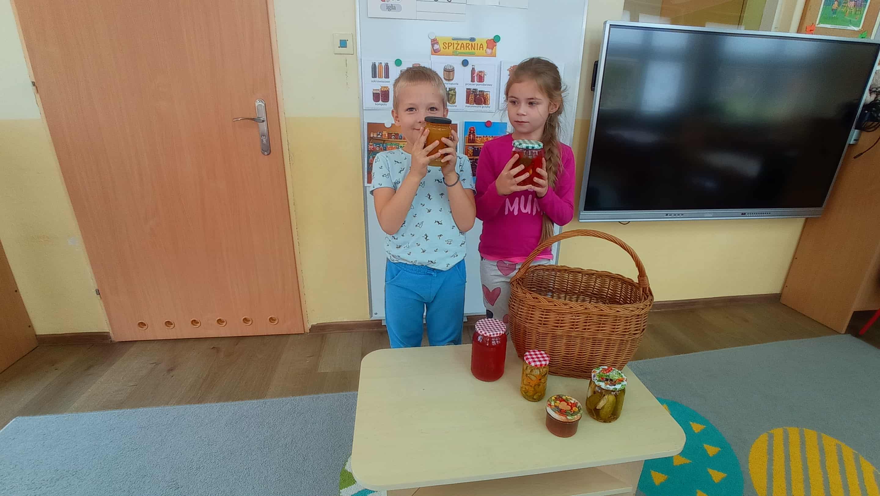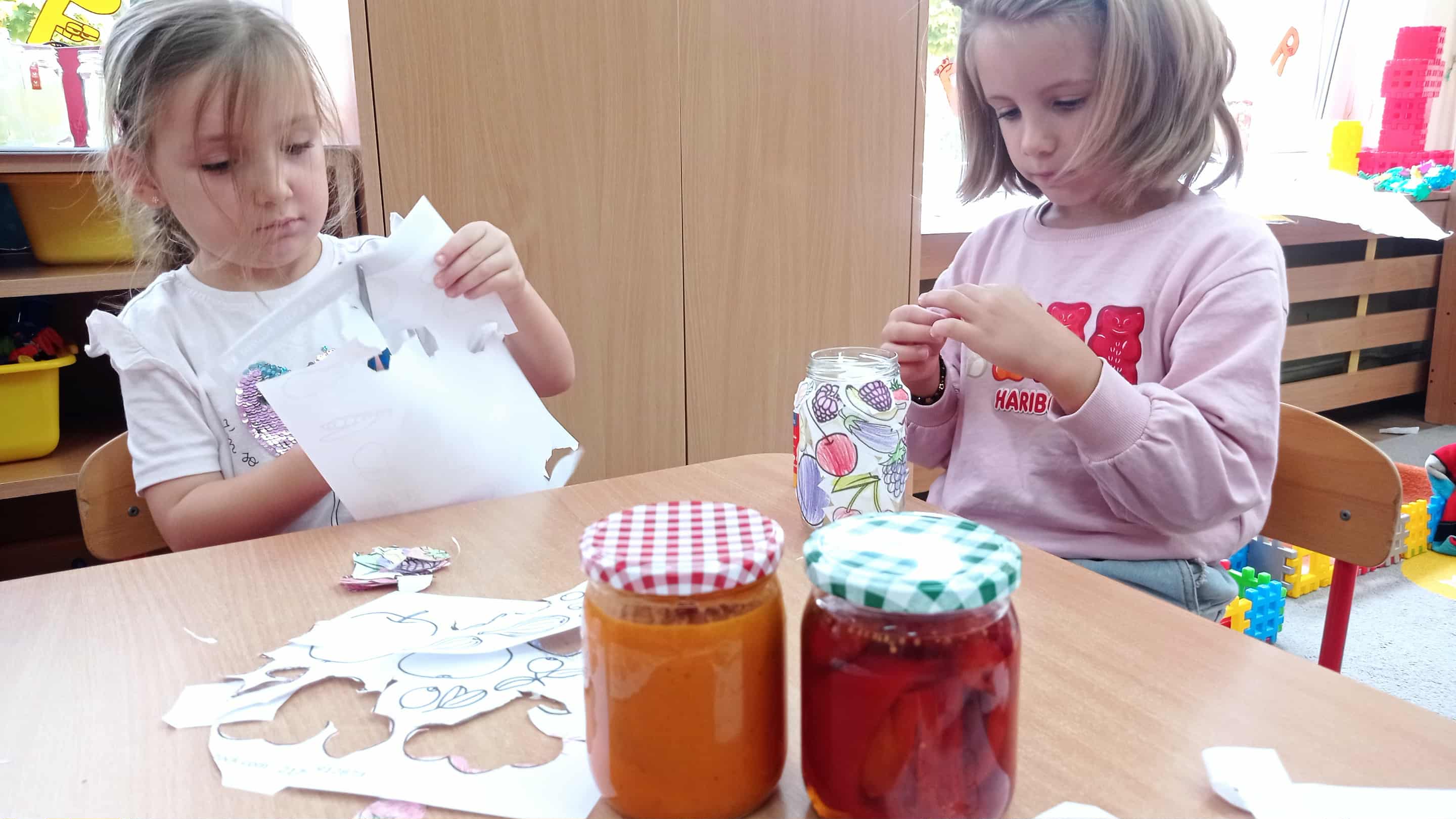 Dziś w naszym przedszkolu odbyły się wyjątkowe zajęcia. Przedszkolaki miały okazję posmakować pysznych przetworów przygotowanych z warzyw i owoców zebranych latem. Na stole pojawiły się kolorowe dżemy, kompoty, marynowane ogórki, sosy i sałatki warzywne. Dzieci z zainteresowaniem oglądały słoiczki, rozpoznawały składniki i z radością degustowały naturalne smaki lata zamknięte w słoikach. Podczas degustacji rozmawialiśmy o tym, jak powstają przetwory, dlaczego warto je robić i jakie mają wartości odżywcze. To była wspaniała lekcja o zdrowym odżywianiu, tradycjach i pracy, jaką trzeba włożyć, by zimą cieszyć się smakami lata. Dzieci wykonały własne, kolorowe słoiki z przetworami, wykorzystując słoiki, papier, bibułę, plastelinę oraz inne materiały plastyczne. W słoiczkach znalazły się soczyste owoce, warzywa i dżemy — wszystko stworzone z wyobraźni i kreatywności naszych małych artystów. To była ciekawa i twórcza zabawa, która połączyła naukę i wyobraźnię .