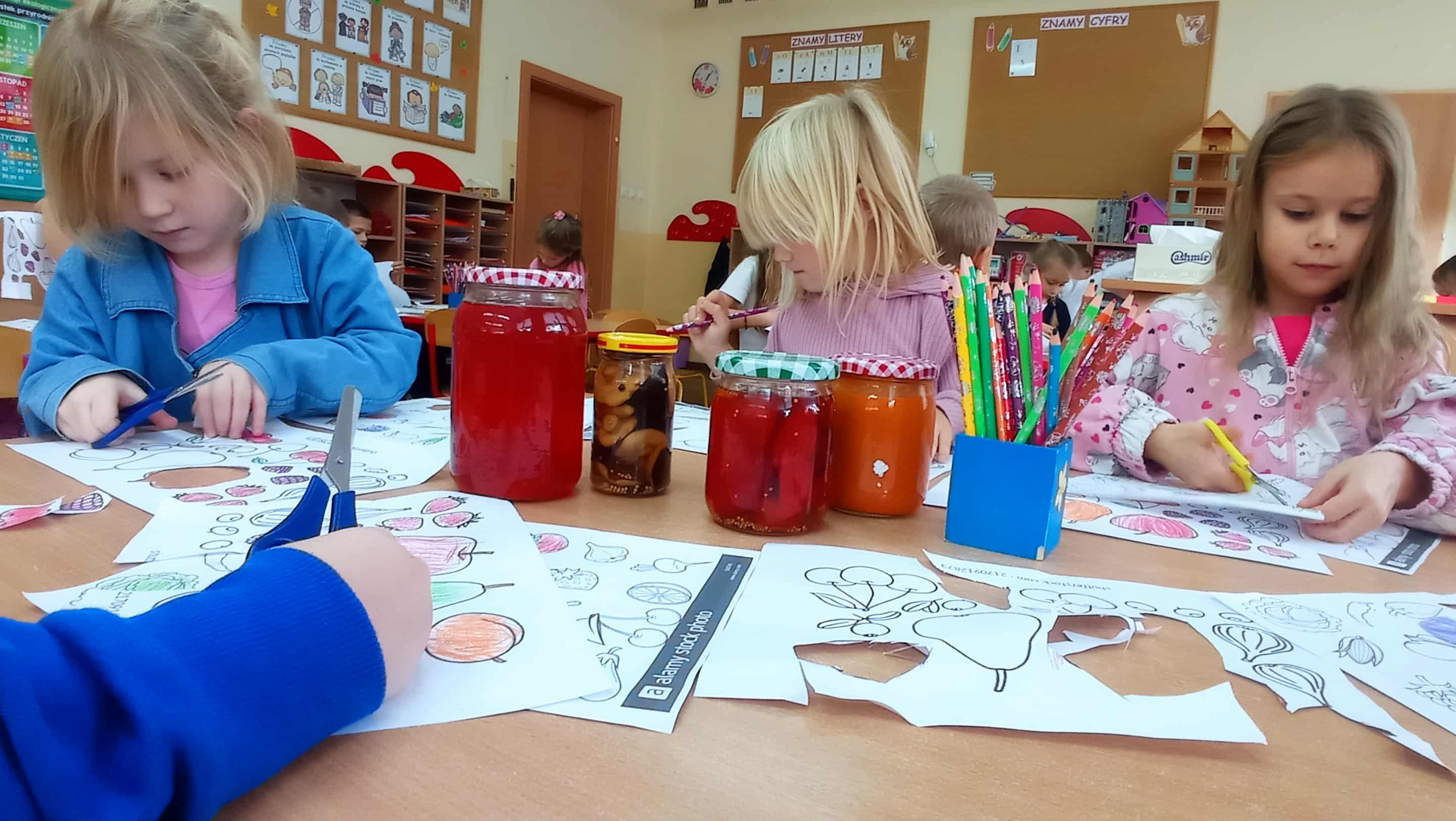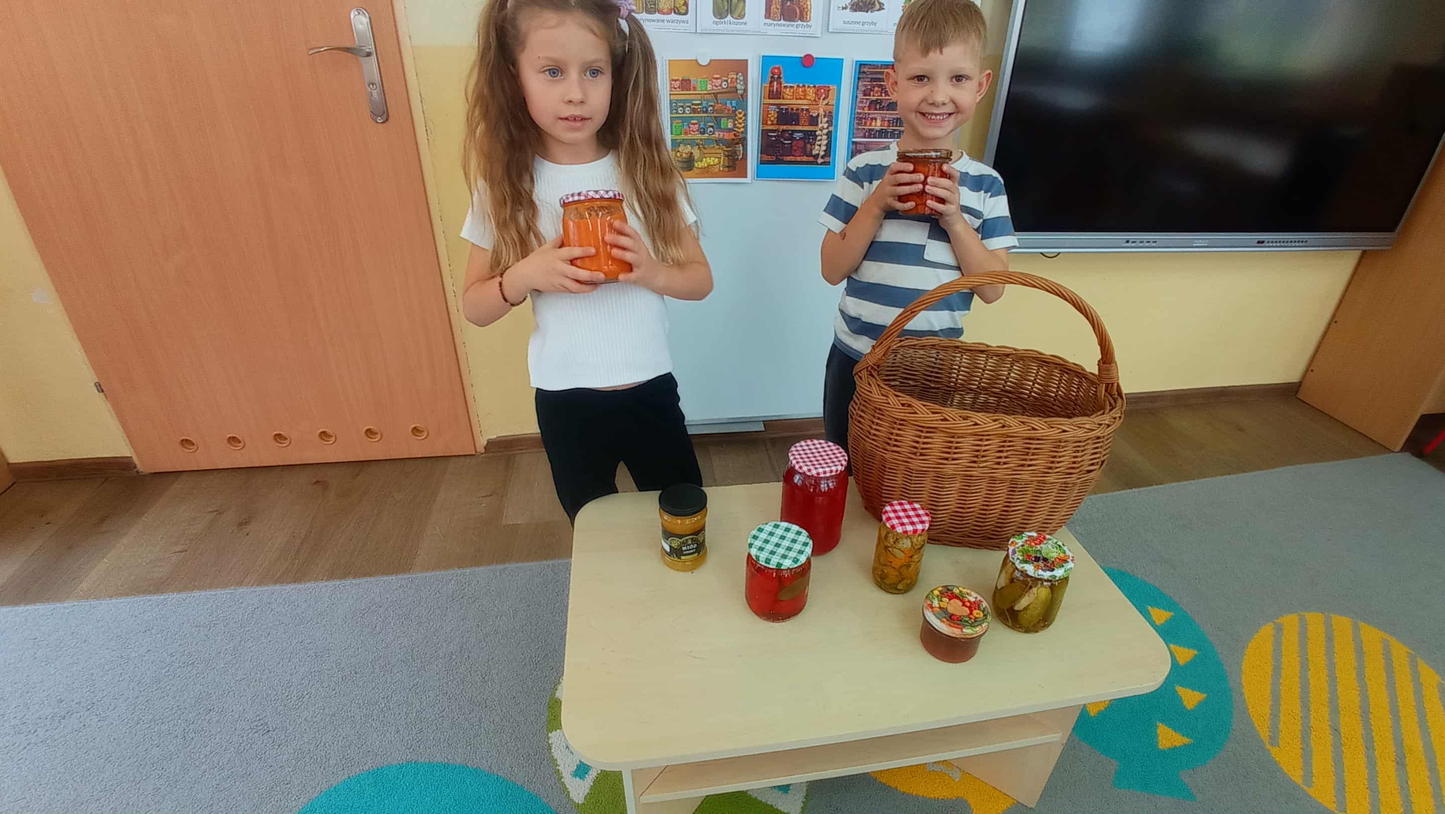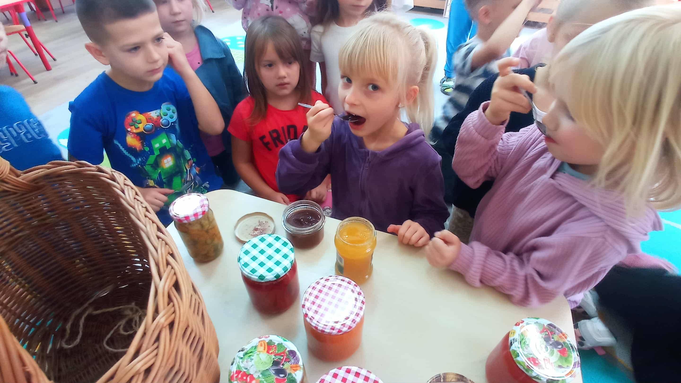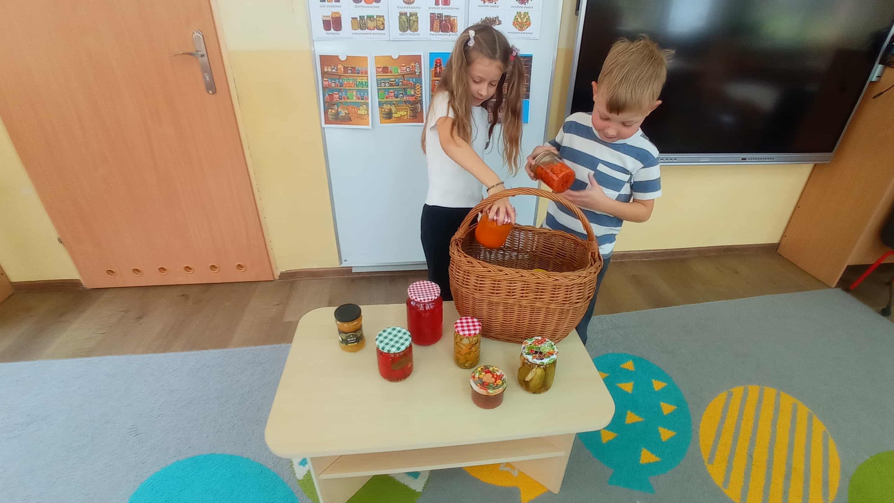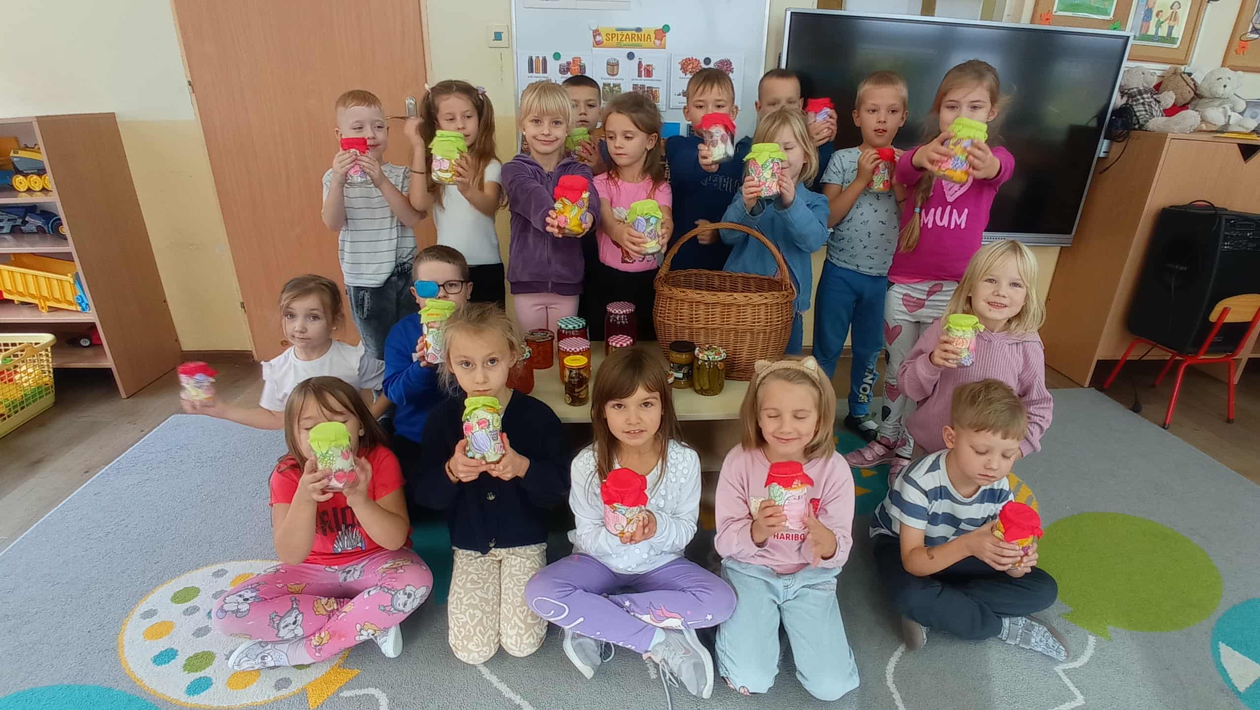 Dziś w naszym przedszkolu odbyły się wyjątkowe zajęcia. Przedszkolaki miały okazję posmakować pysznych przetworów przygotowanych z warzyw i owoców zebranych latem. Na stole pojawiły się kolorowe dżemy, kompoty, marynowane ogórki, sosy i sałatki warzywne. Dzieci z zainteresowaniem oglądały słoiczki, rozpoznawały składniki i z radością degustowały naturalne smaki lata zamknięte w słoikach. Podczas degustacji rozmawialiśmy o tym, jak powstają przetwory, dlaczego warto je robić i jakie mają wartości odżywcze. To była wspaniała lekcja o zdrowym odżywianiu, tradycjach i pracy, jaką trzeba włożyć, by zimą cieszyć się smakami lata. Dzieci wykonały własne, kolorowe słoiki z przetworami, wykorzystując słoiki, papier, bibułę, plastelinę oraz inne materiały plastyczne. W słoiczkach znalazły się soczyste owoce, warzywa i dżemy — wszystko stworzone z wyobraźni i kreatywności naszych małych artystów. To była ciekawa i twórcza zabawa, która połączyła naukę i wyobraźnię .