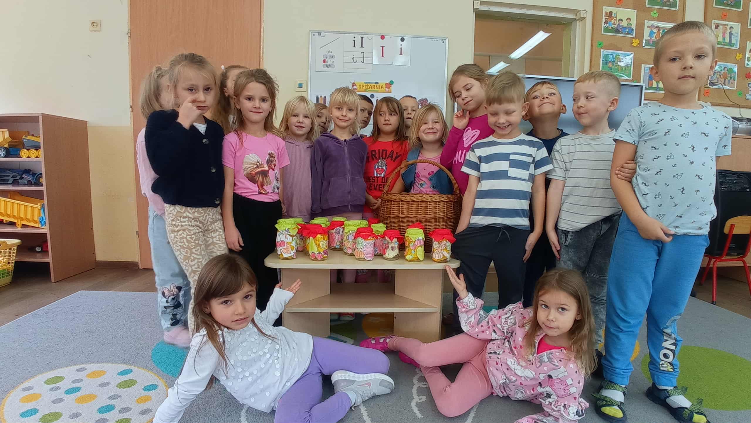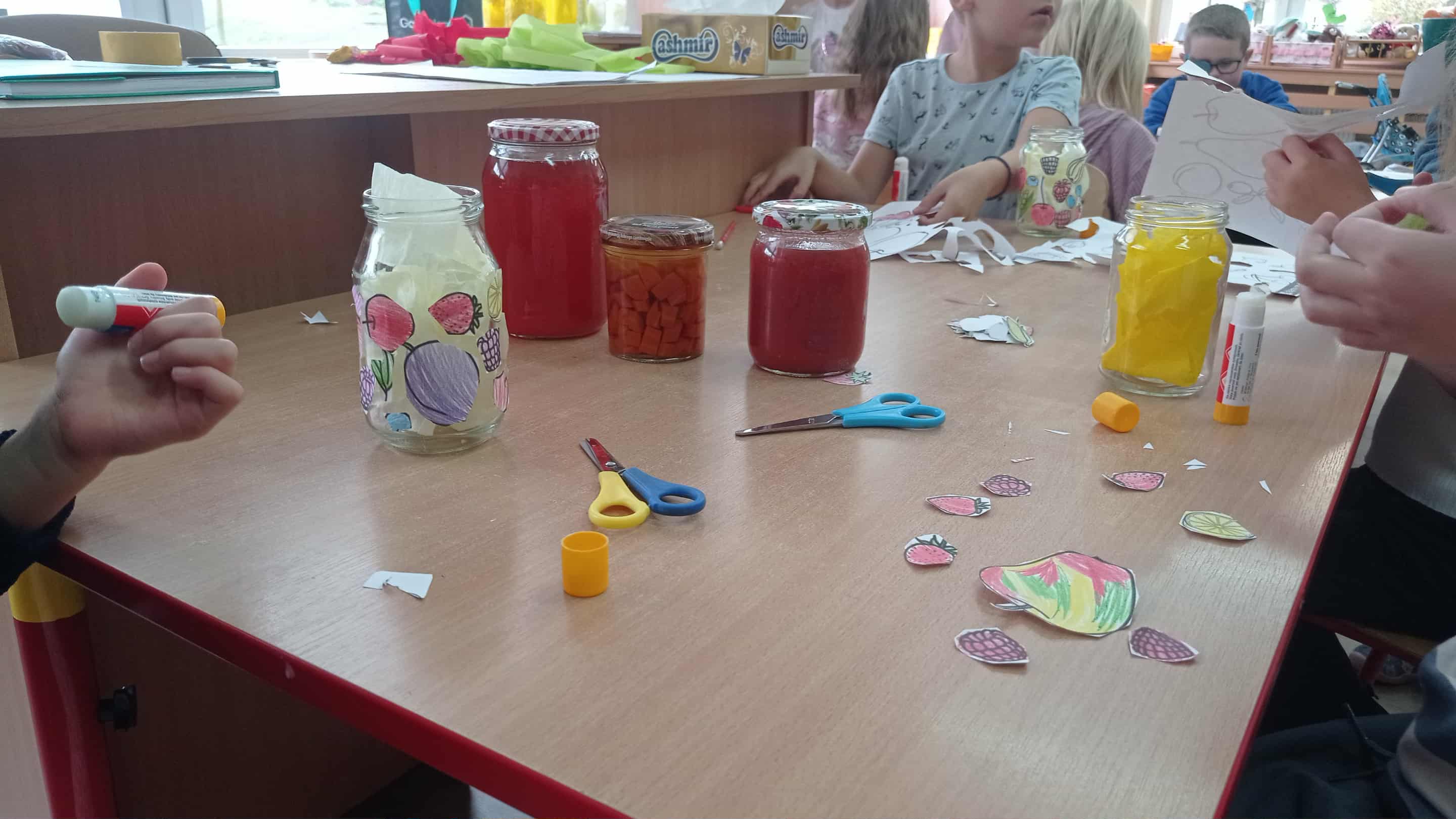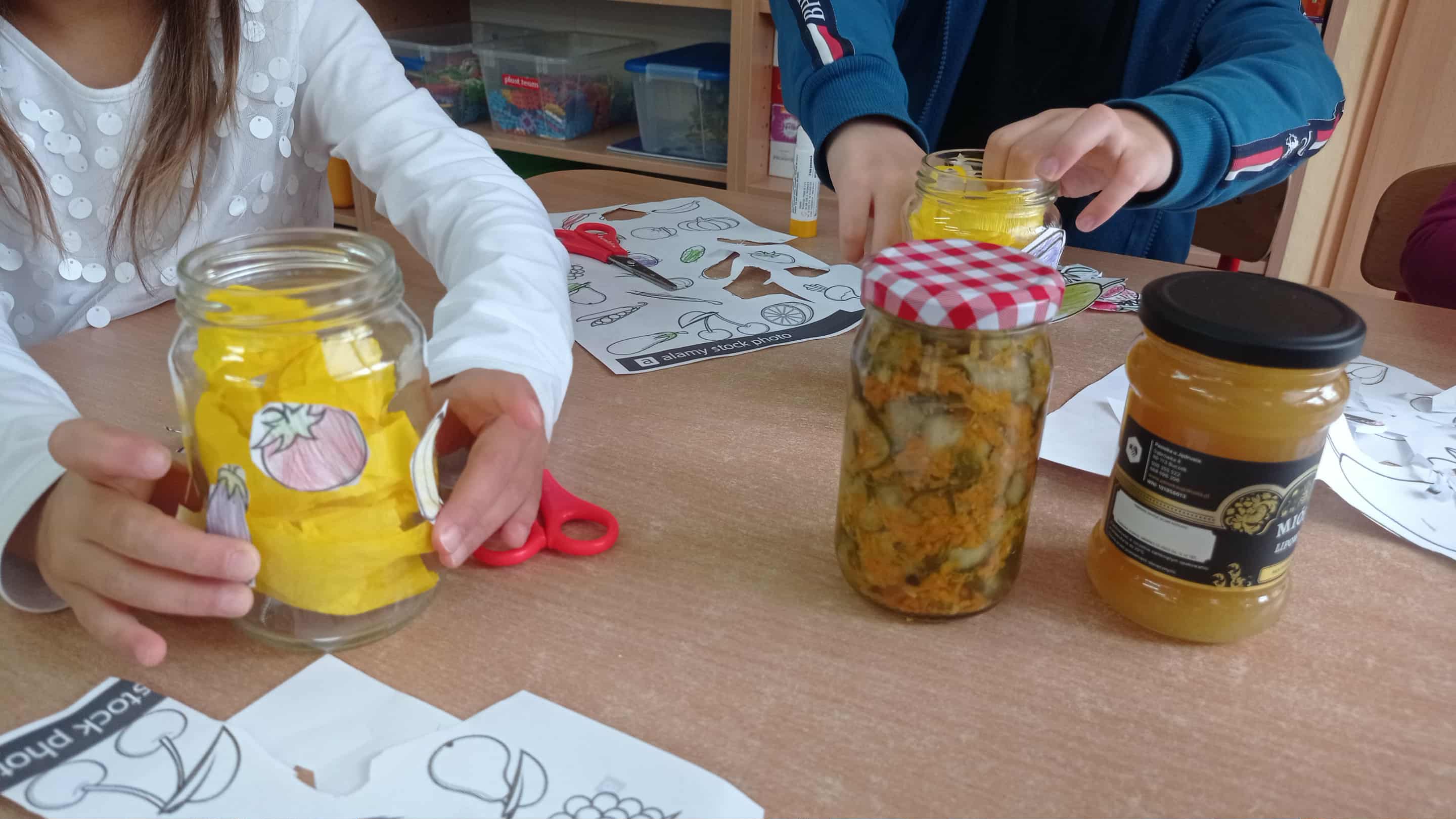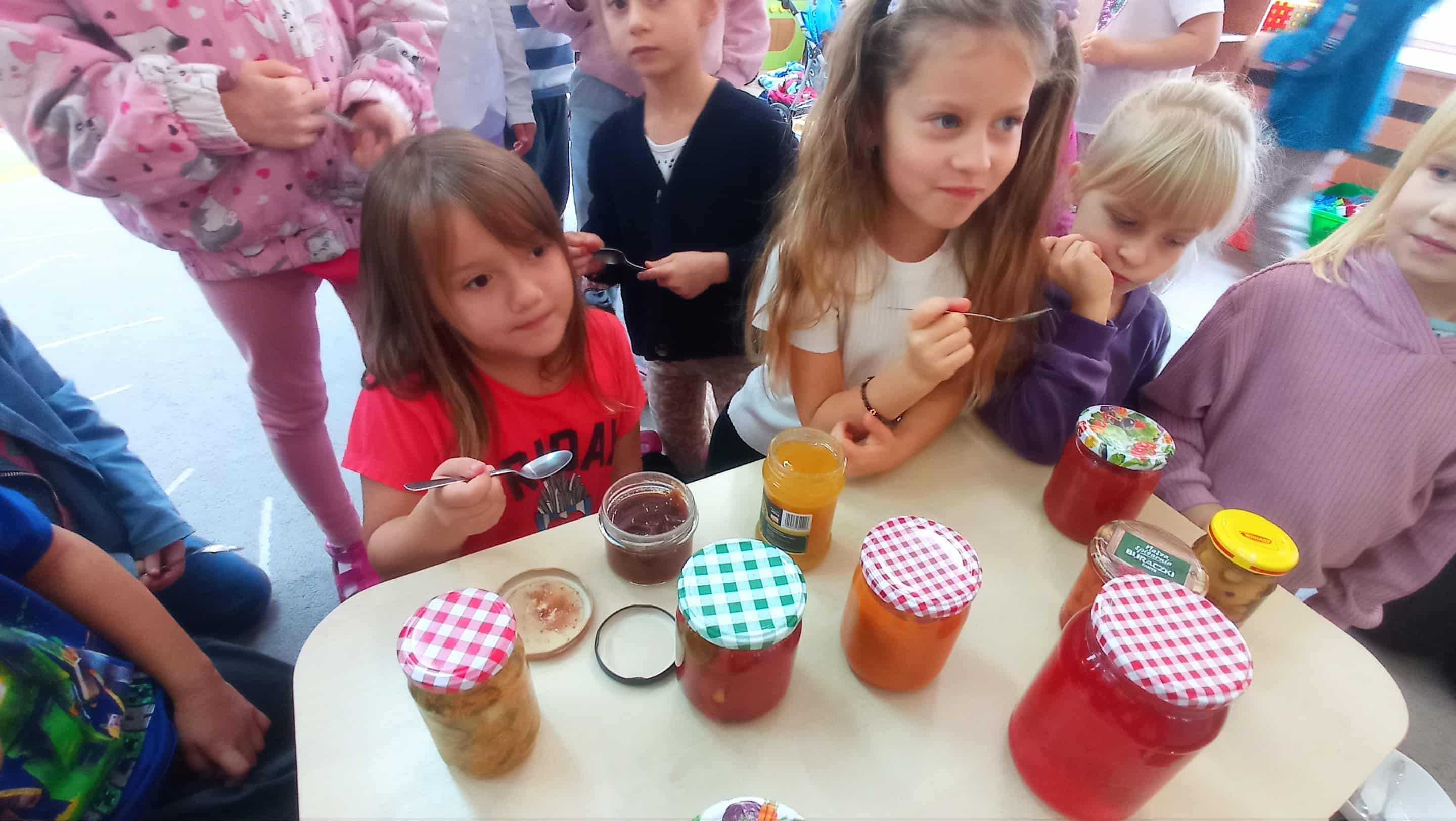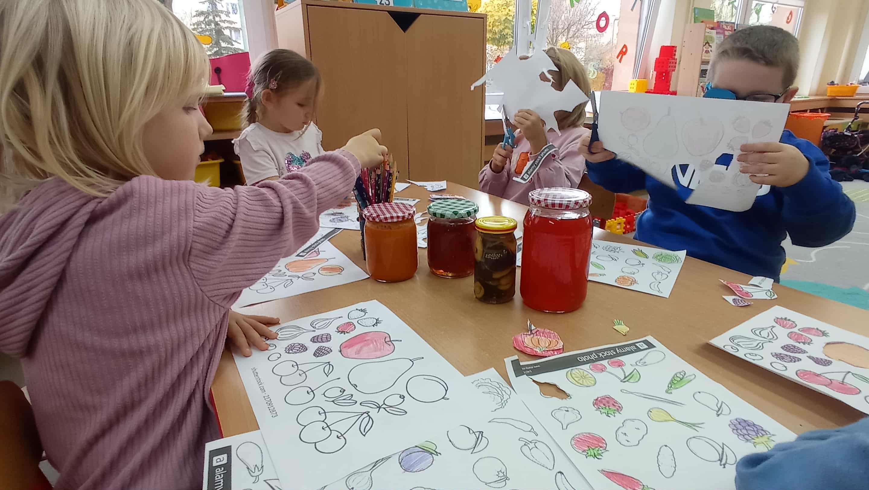 Dziś w naszym przedszkolu odbyły się wyjątkowe zajęcia. Przedszkolaki miały okazję posmakować pysznych przetworów przygotowanych z warzyw i owoców zebranych latem. Na stole pojawiły się kolorowe dżemy, kompoty, marynowane ogórki, sosy i sałatki warzywne. Dzieci z zainteresowaniem oglądały słoiczki, rozpoznawały składniki i z radością degustowały naturalne smaki lata zamknięte w słoikach. Podczas degustacji rozmawialiśmy o tym, jak powstają przetwory, dlaczego warto je robić i jakie mają wartości odżywcze. To była wspaniała lekcja o zdrowym odżywianiu, tradycjach i pracy, jaką trzeba włożyć, by zimą cieszyć się smakami lata. Dzieci wykonały własne, kolorowe słoiki z przetworami, wykorzystując słoiki, papier, bibułę, plastelinę oraz inne materiały plastyczne. W słoiczkach znalazły się soczyste owoce, warzywa i dżemy — wszystko stworzone z wyobraźni i kreatywności naszych małych artystów. To była ciekawa i twórcza zabawa, która połączyła naukę i wyobraźnię .