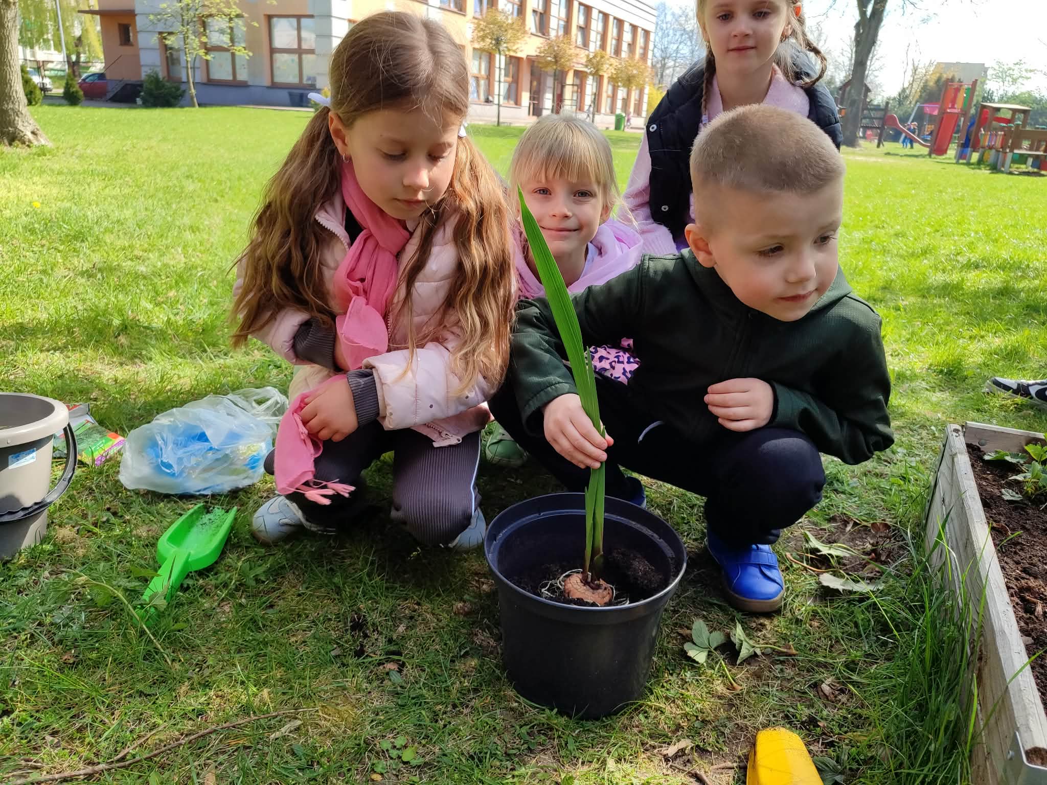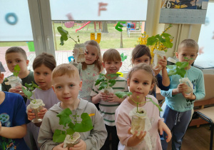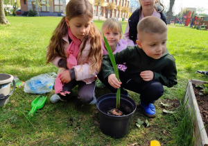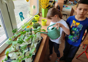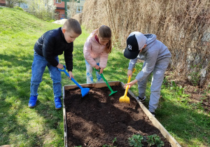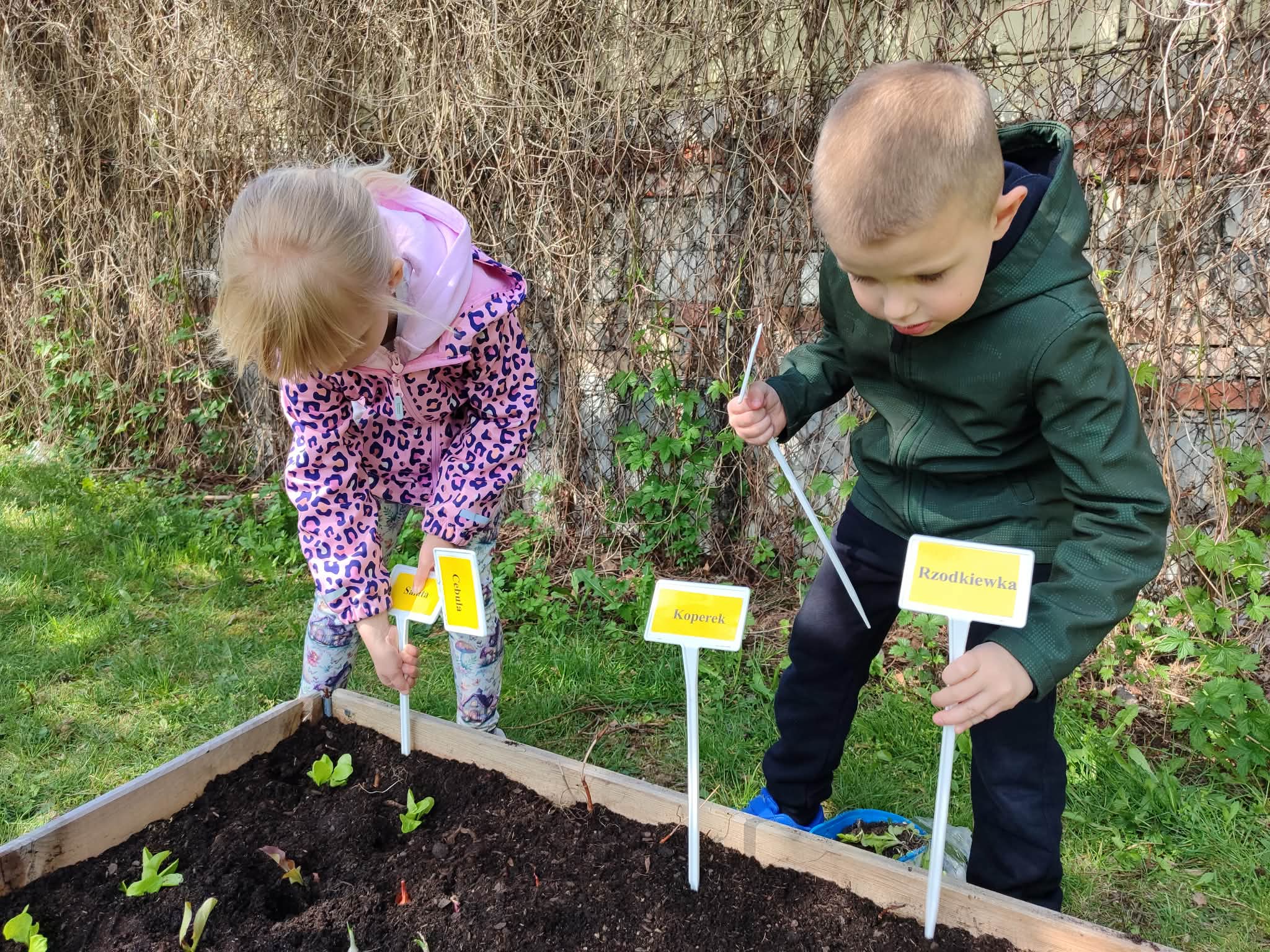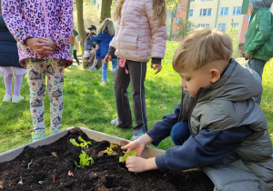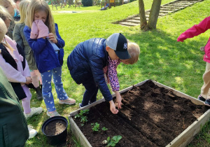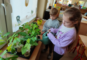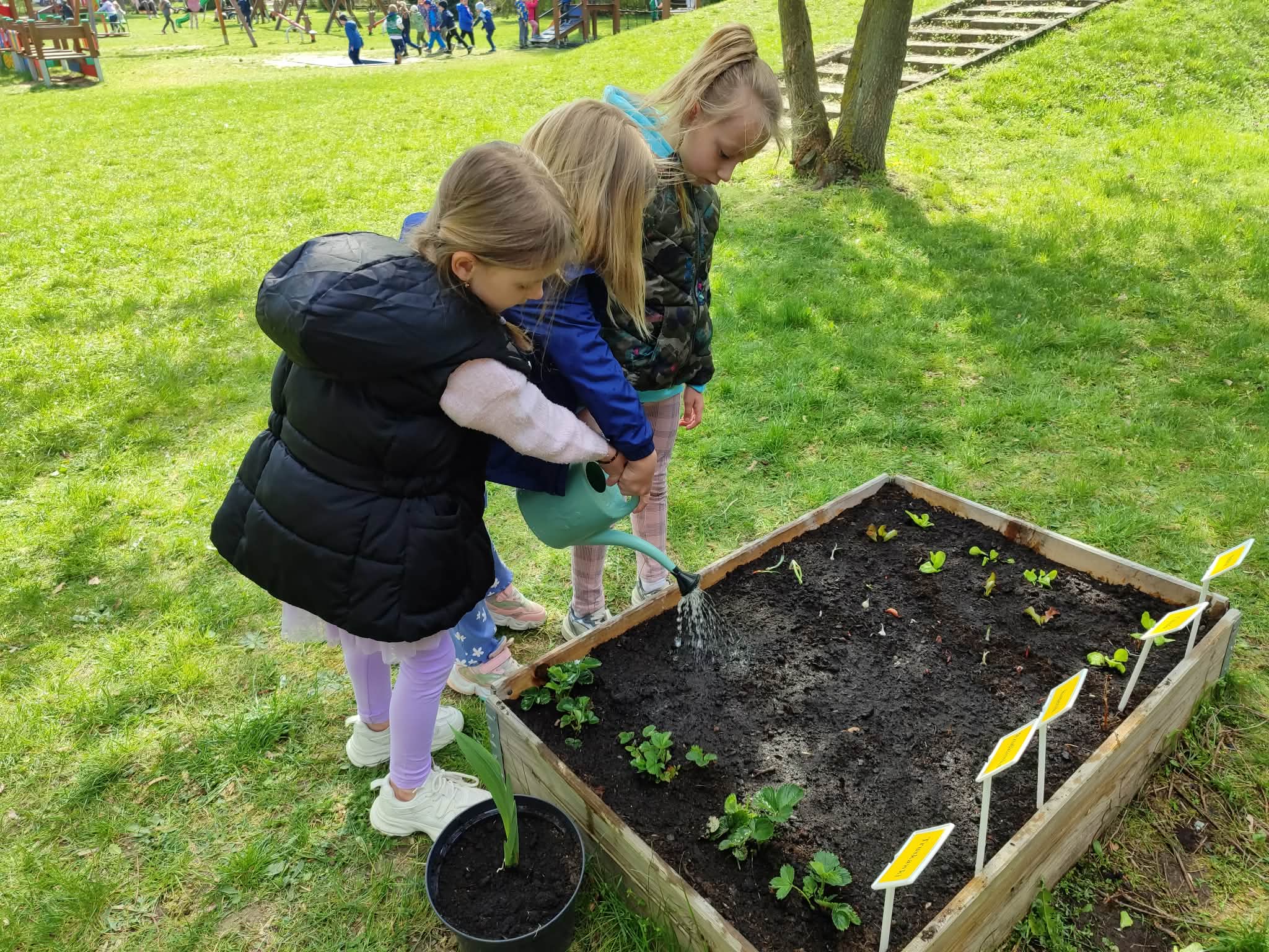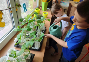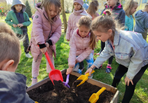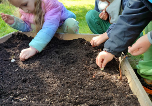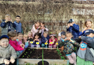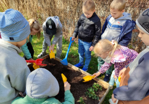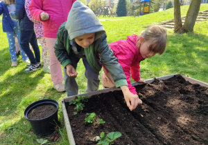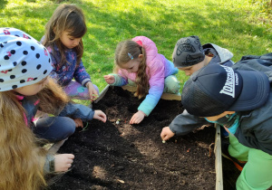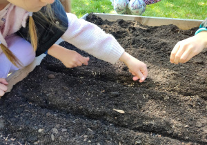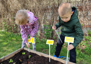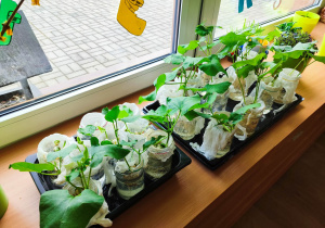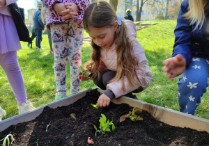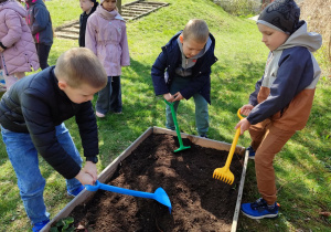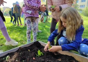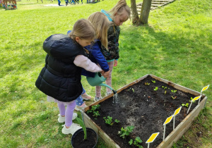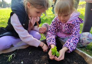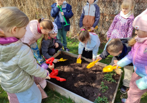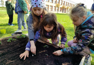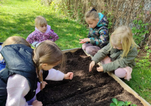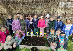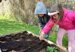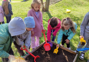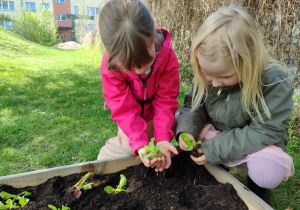 Z dumą podziwiają i troskliwie dbają o zieloną fasolkę, która pięknie im wyrosła. Przygotowały również grządkę- przekopały ziemię, a następnie posadziły w niej cebulę i sałatę oraz wysiały rzodkiewkę i koperek. Oczywiście nie zapomniały o pielęgnowaniu truskawek, które posadziły w poprzednim roku. W tym roku w ogródku znalazło się także miejsce na mieczyka, który będzie kolejną ozdobą ich wspólnej pracy.