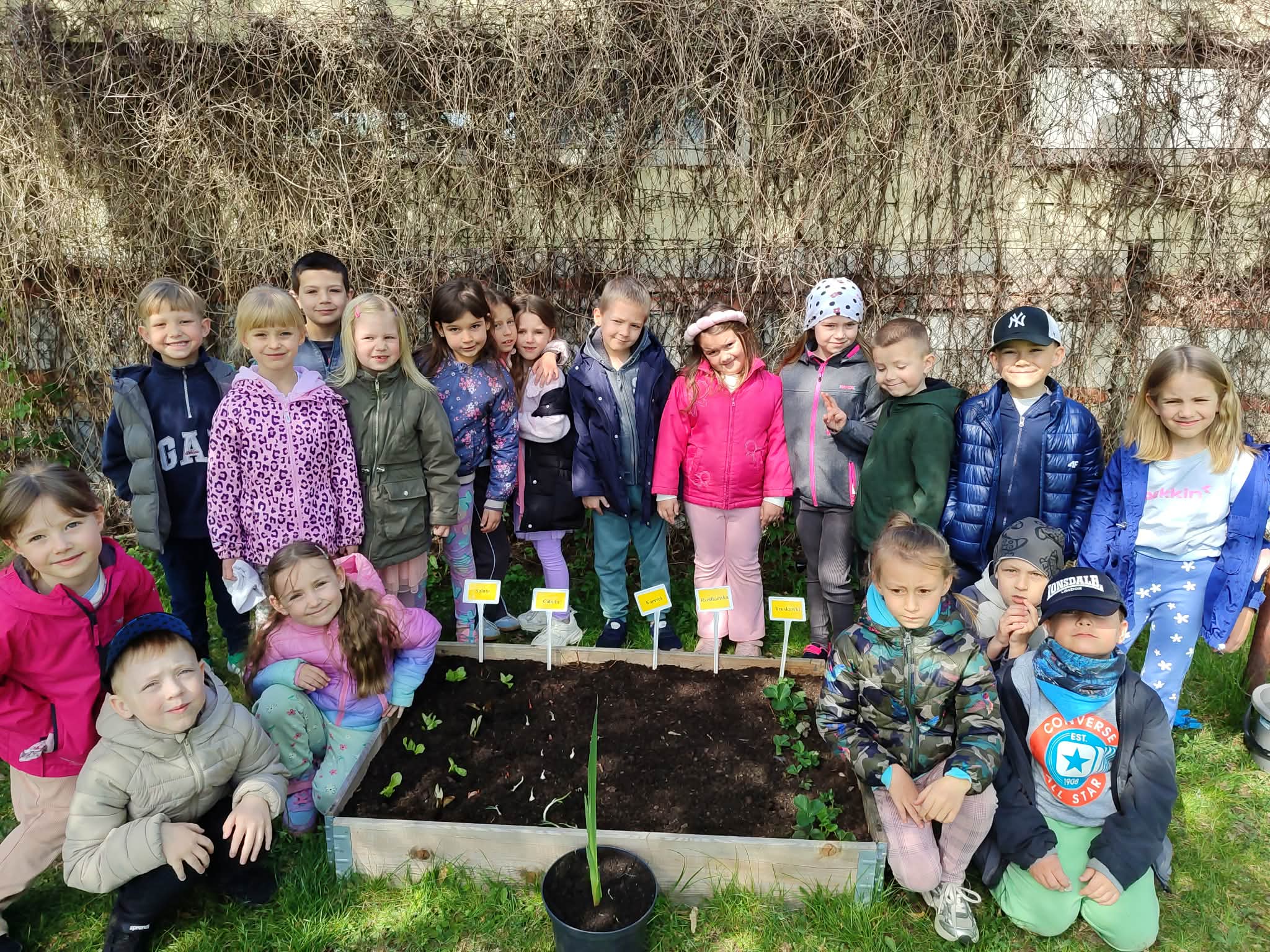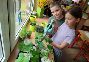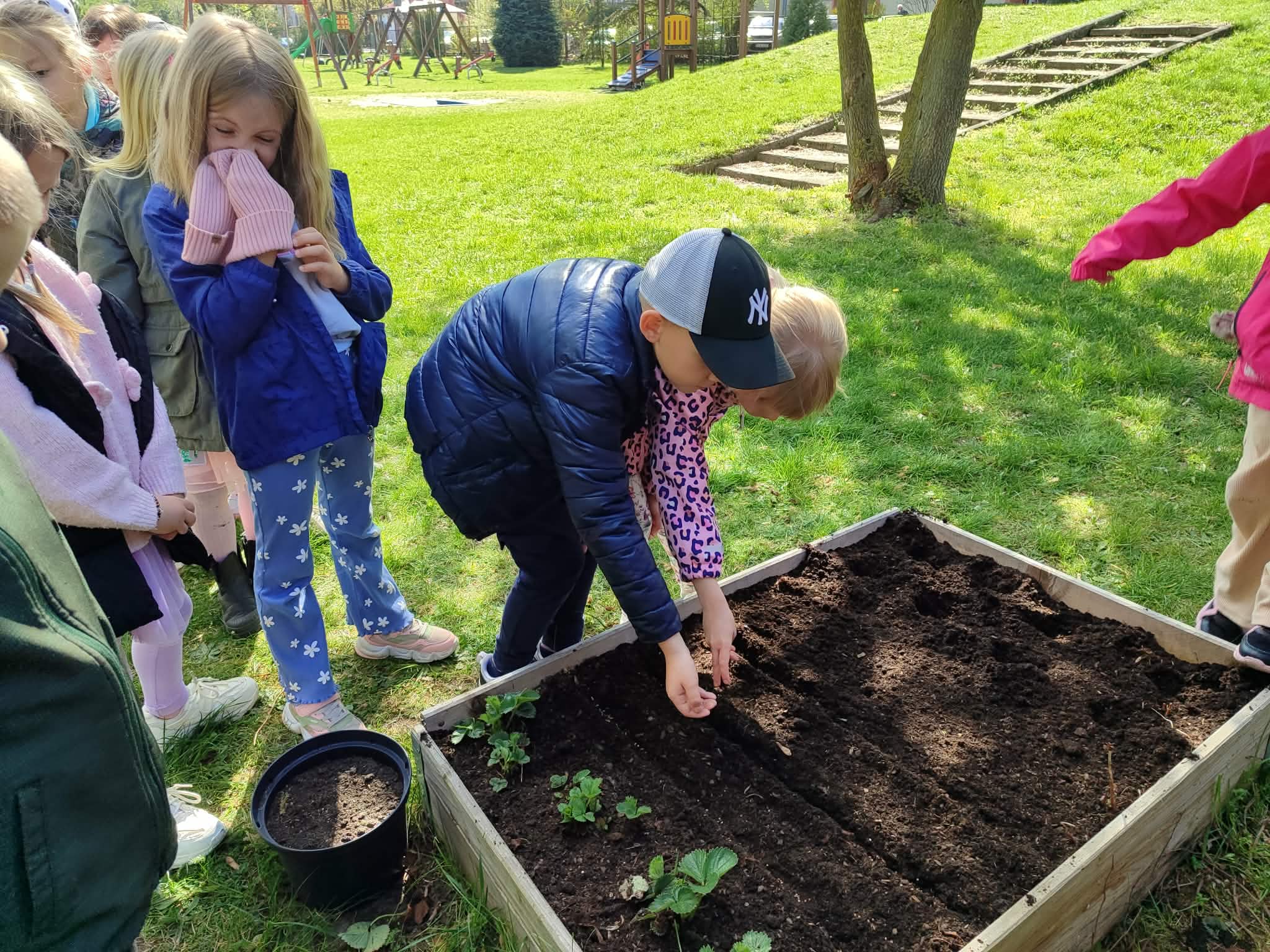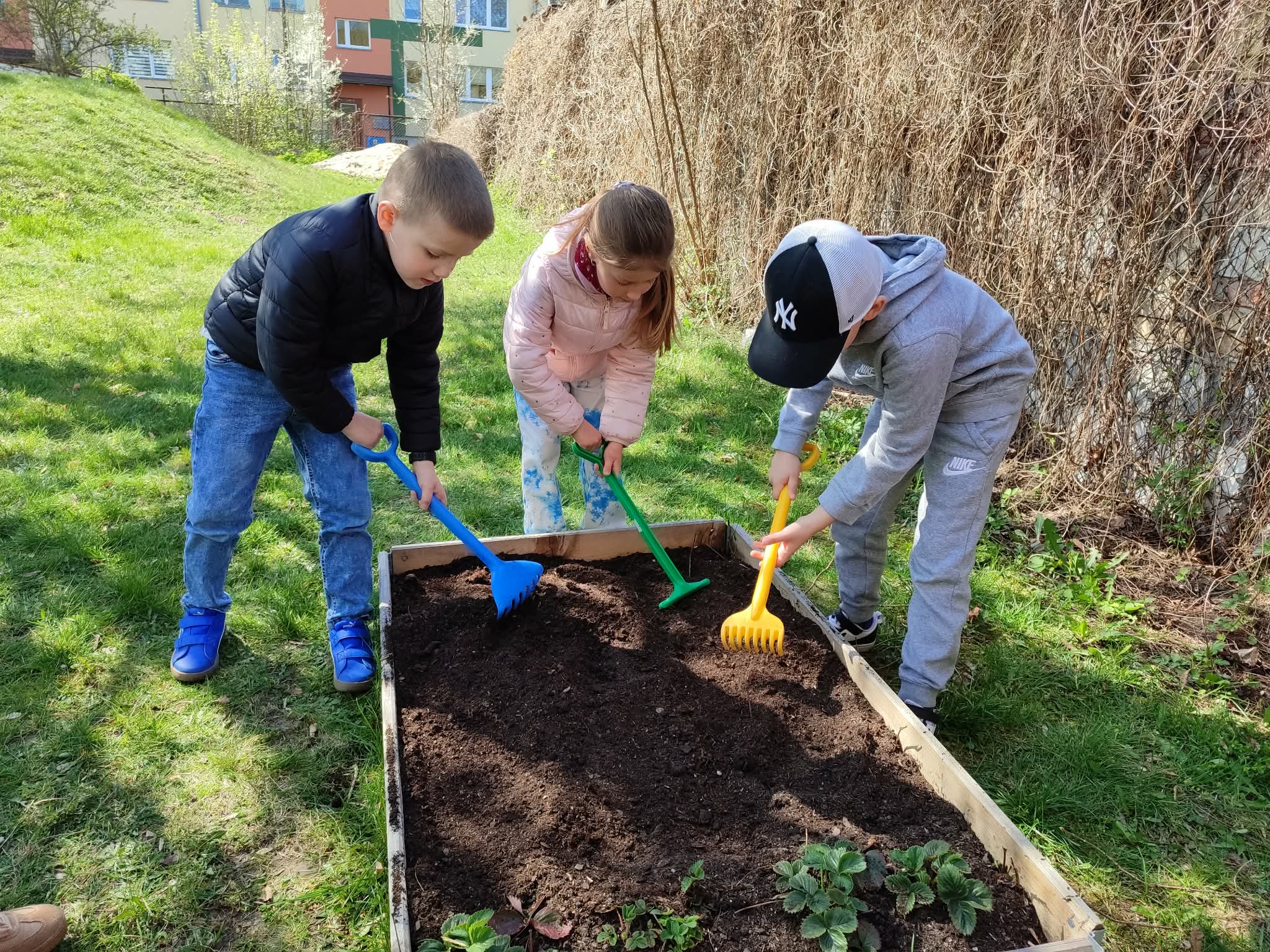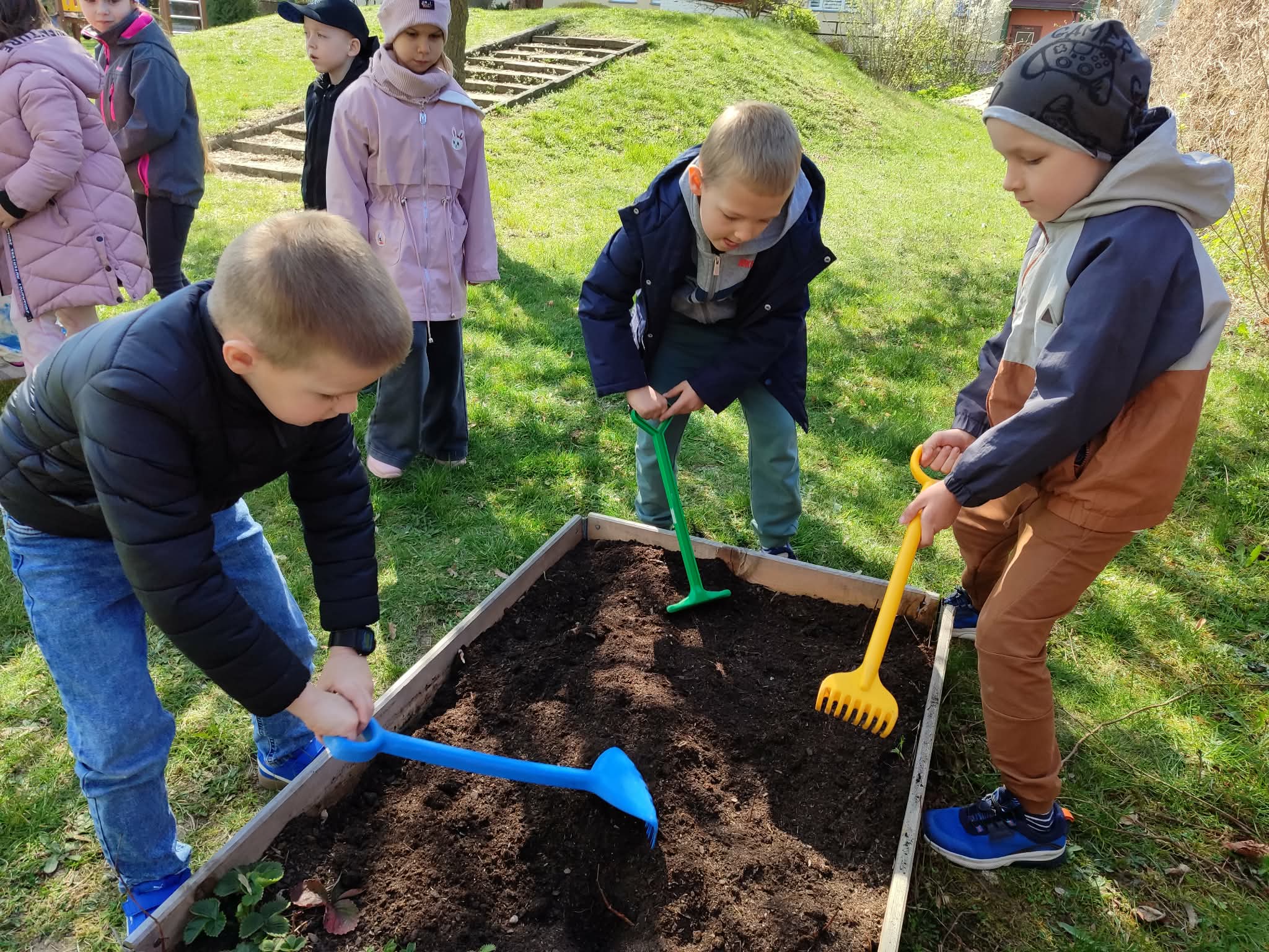 Z dumą podziwiają i troskliwie dbają o zieloną fasolkę, która pięknie im wyrosła. Przygotowały również grządkę- przekopały ziemię, a następnie posadziły w niej cebulę i sałatę oraz wysiały rzodkiewkę i koperek. Oczywiście nie zapomniały o pielęgnowaniu truskawek, które posadziły w poprzednim roku. W tym roku w ogródku znalazło się także miejsce na mieczyka, który będzie kolejną ozdobą ich wspólnej pracy.
