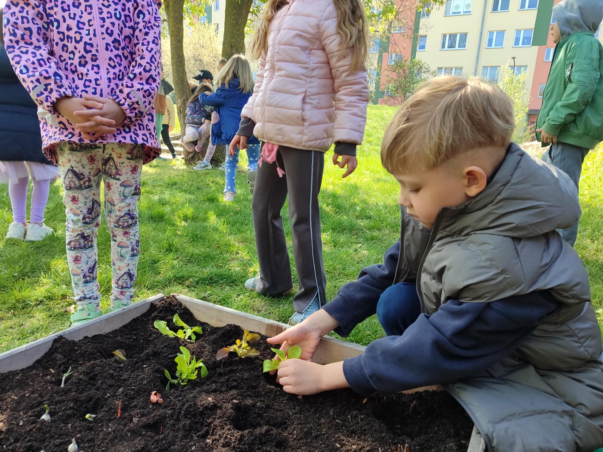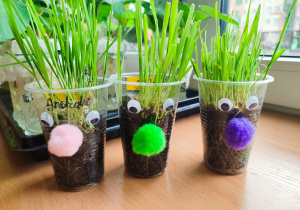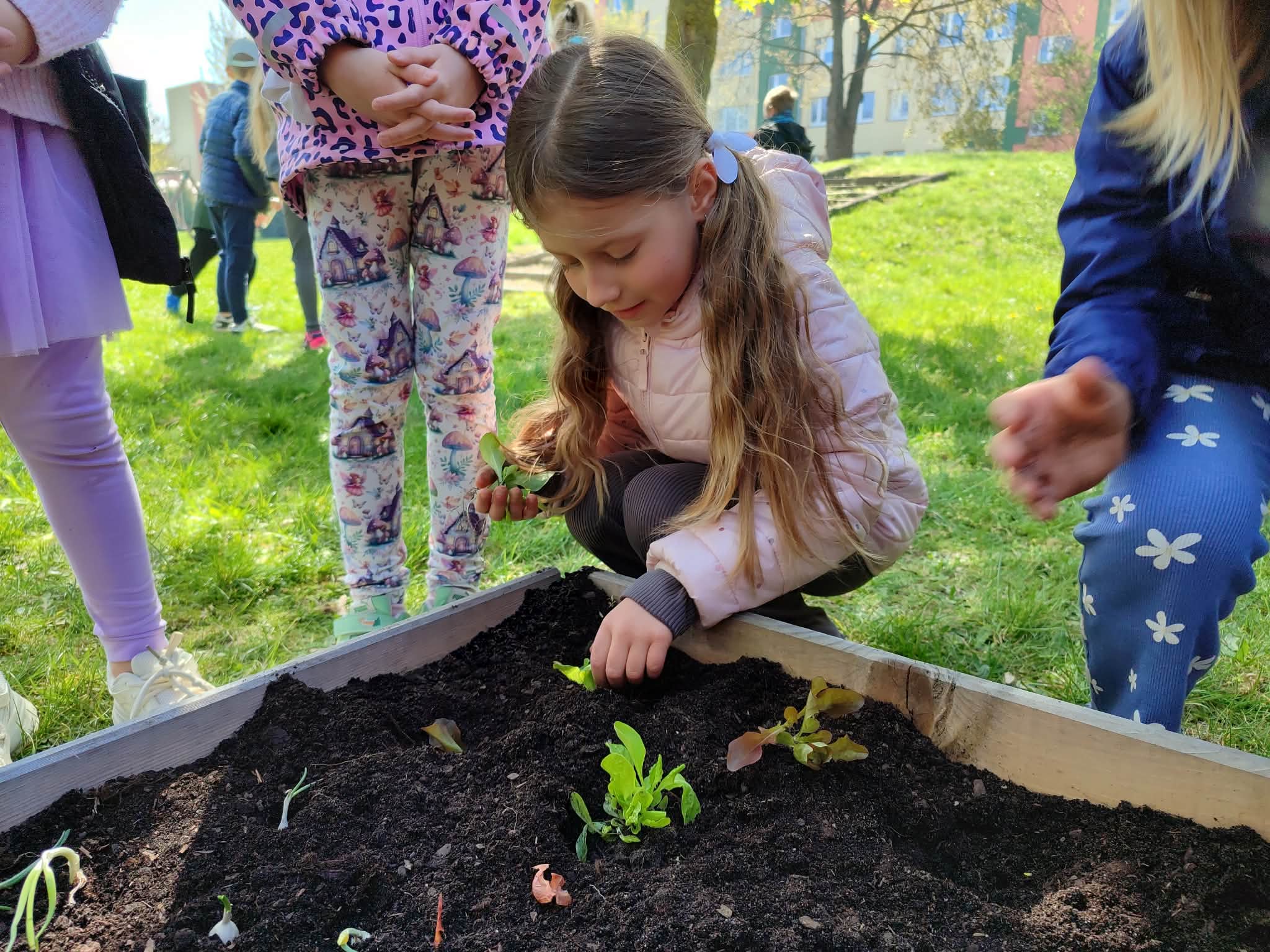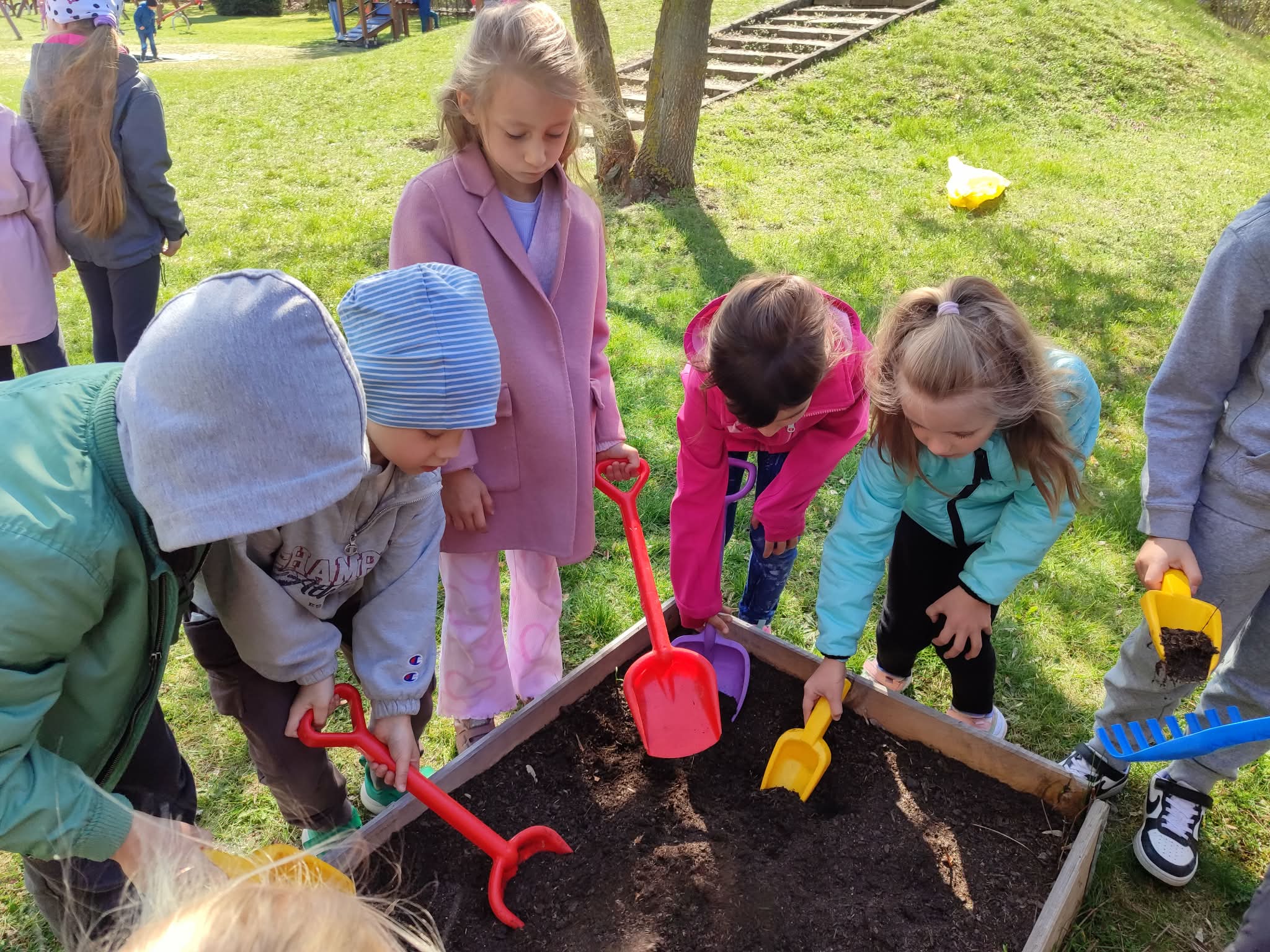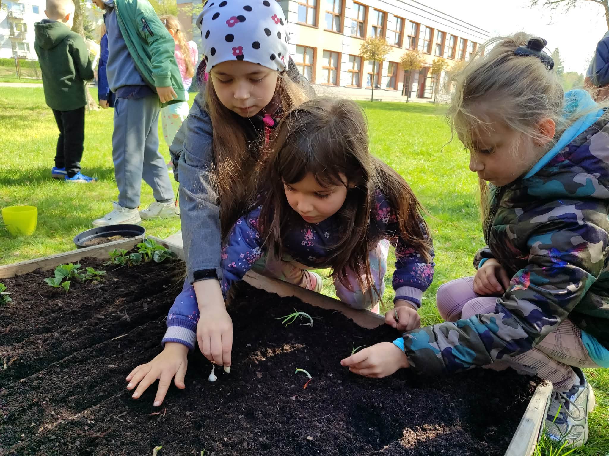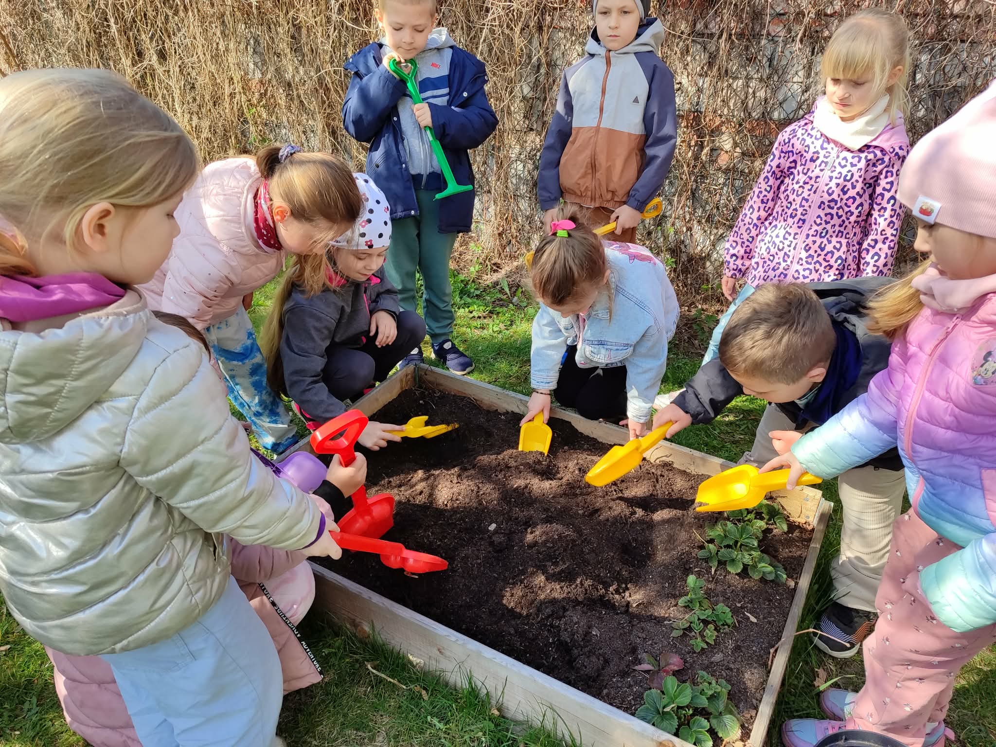 Z dumą podziwiają i troskliwie dbają o zieloną fasolkę, która pięknie im wyrosła. Przygotowały również grządkę- przekopały ziemię, a następnie posadziły w niej cebulę i sałatę oraz wysiały rzodkiewkę i koperek. Oczywiście nie zapomniały o pielęgnowaniu truskawek, które posadziły w poprzednim roku. W tym roku w ogródku znalazło się także miejsce na mieczyka, który będzie kolejną ozdobą ich wspólnej pracy.