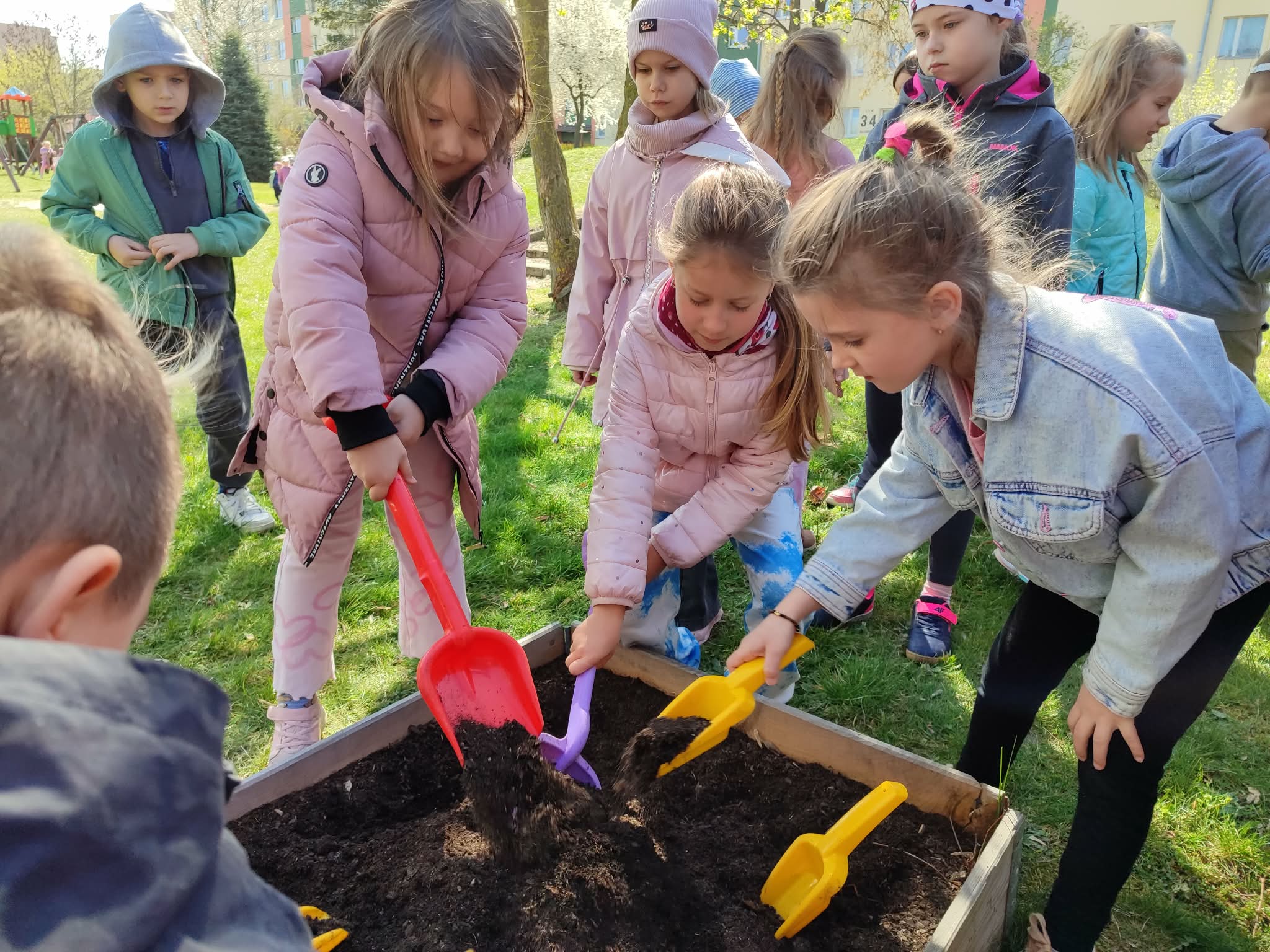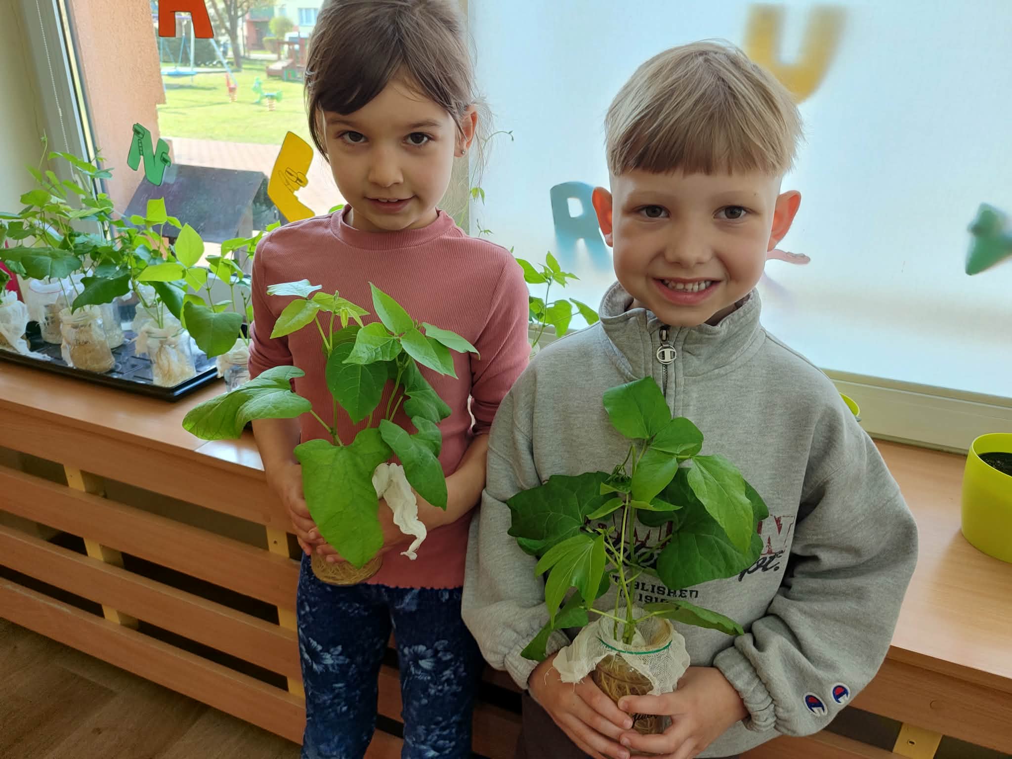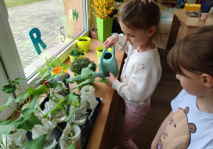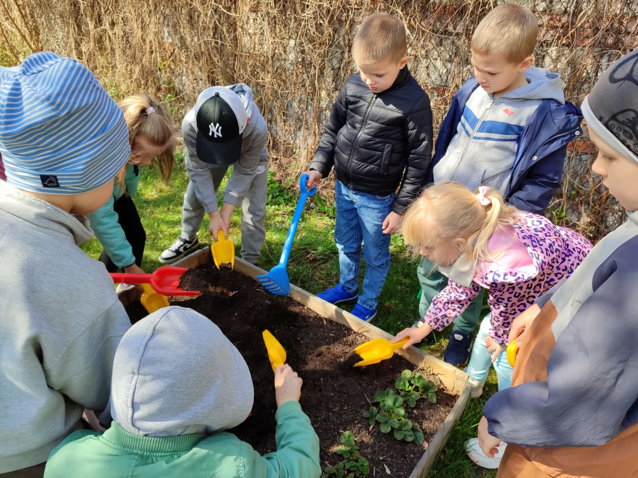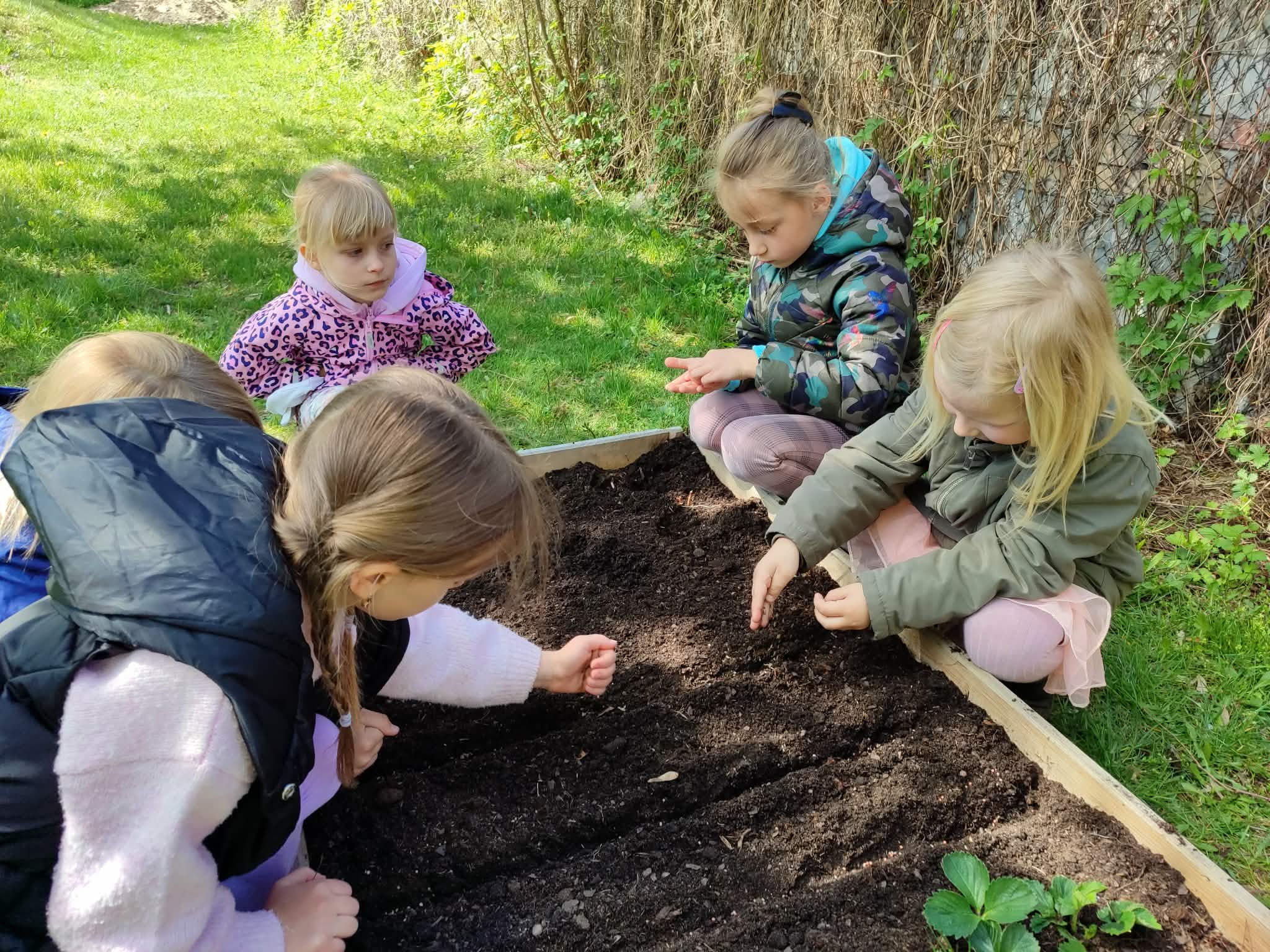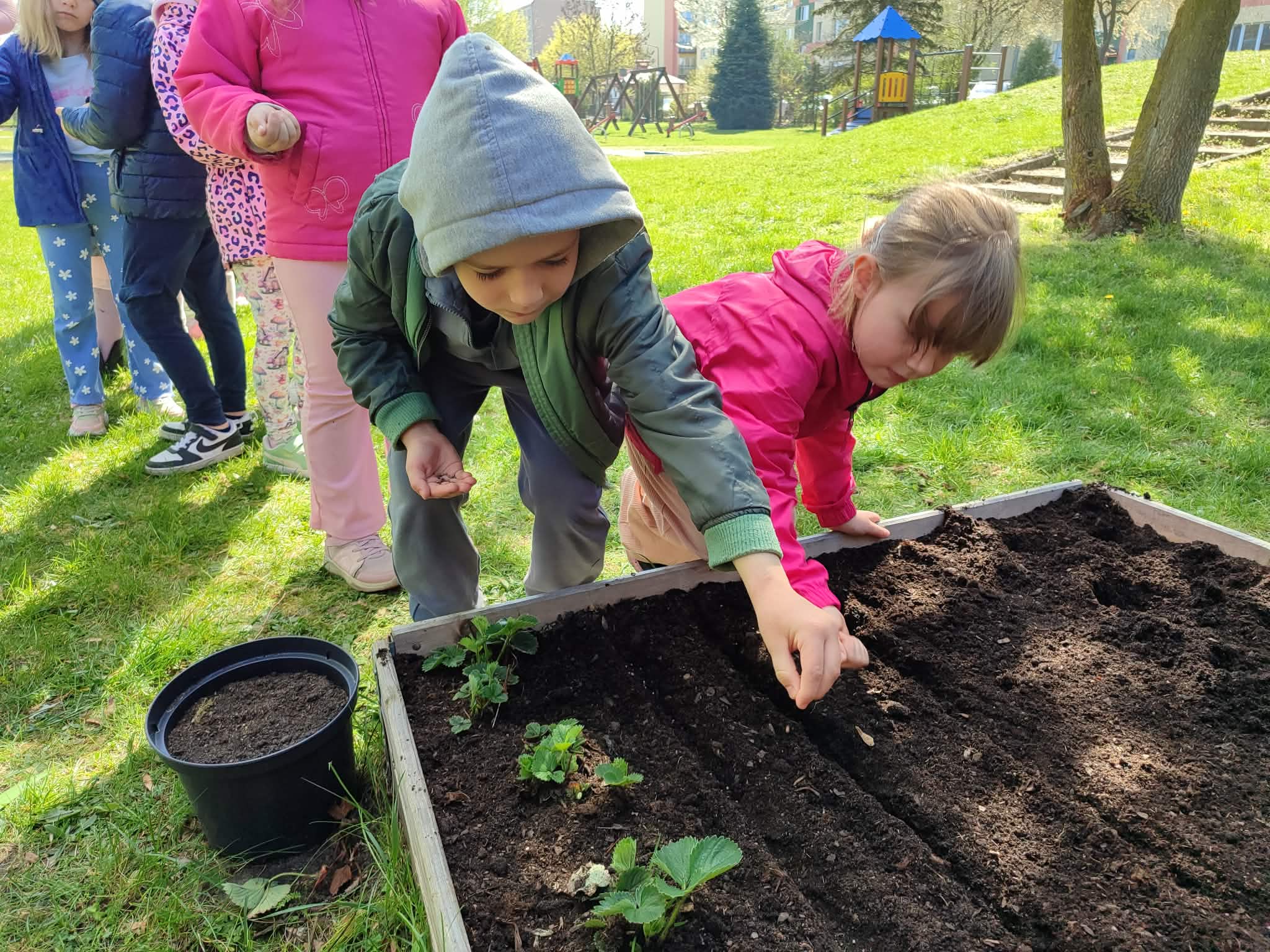 Z dumą podziwiają i troskliwie dbają o zieloną fasolkę, która pięknie im wyrosła. Przygotowały również grządkę- przekopały ziemię, a następnie posadziły w niej cebulę i sałatę oraz wysiały rzodkiewkę i koperek. Oczywiście nie zapomniały o pielęgnowaniu truskawek, które posadziły w poprzednim roku. W tym roku w ogródku znalazło się także miejsce na mieczyka, który będzie kolejną ozdobą ich wspólnej pracy.