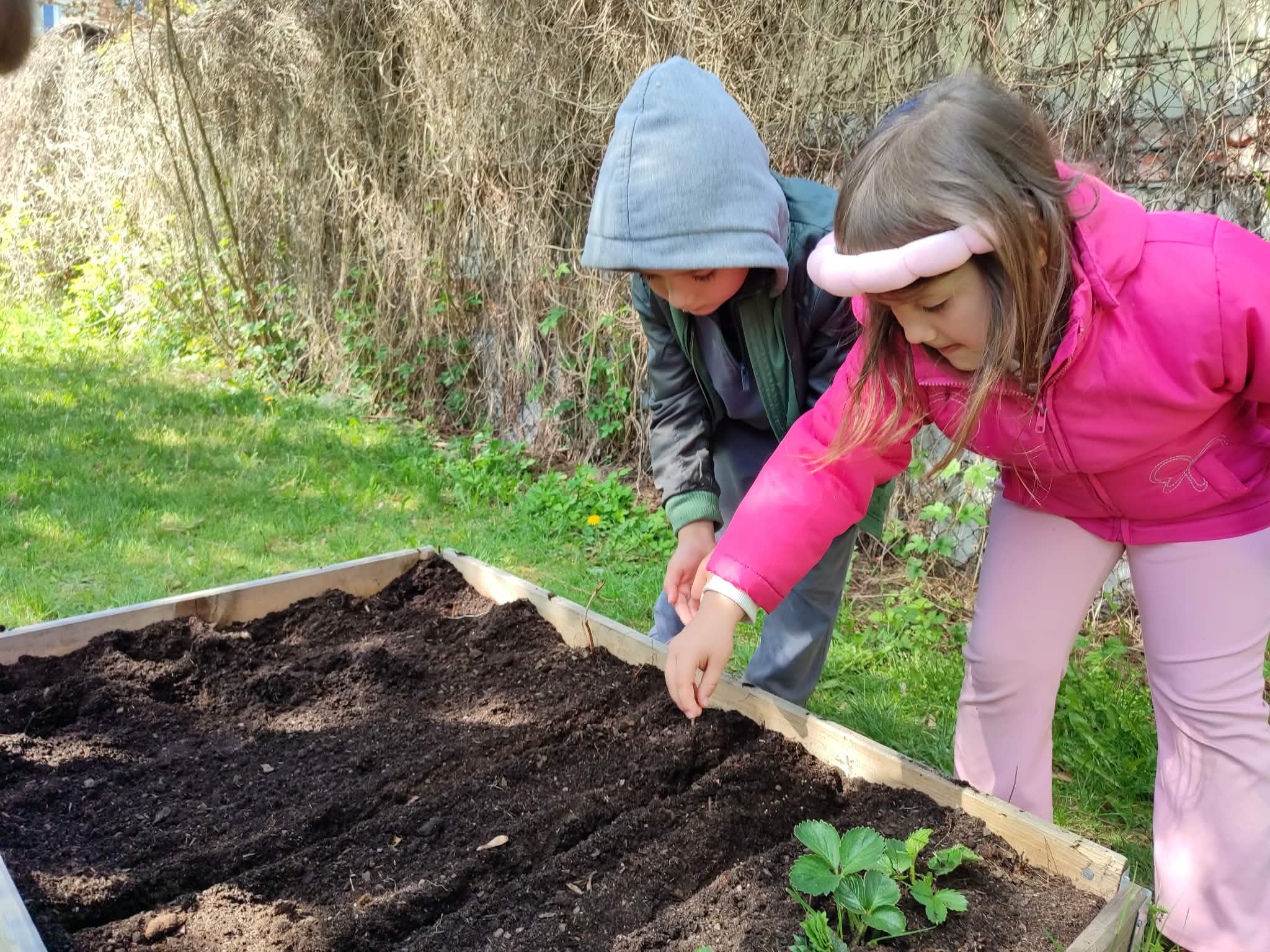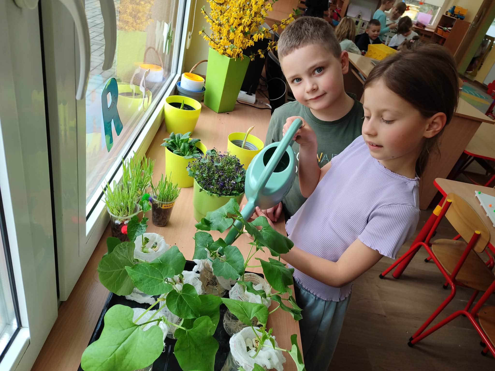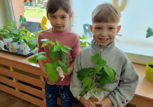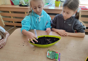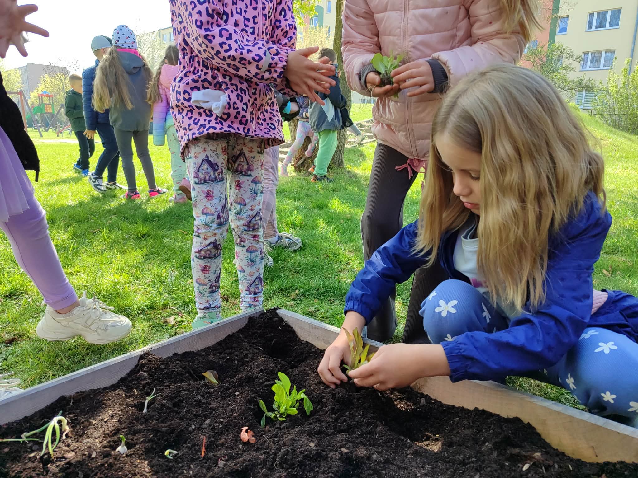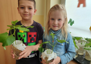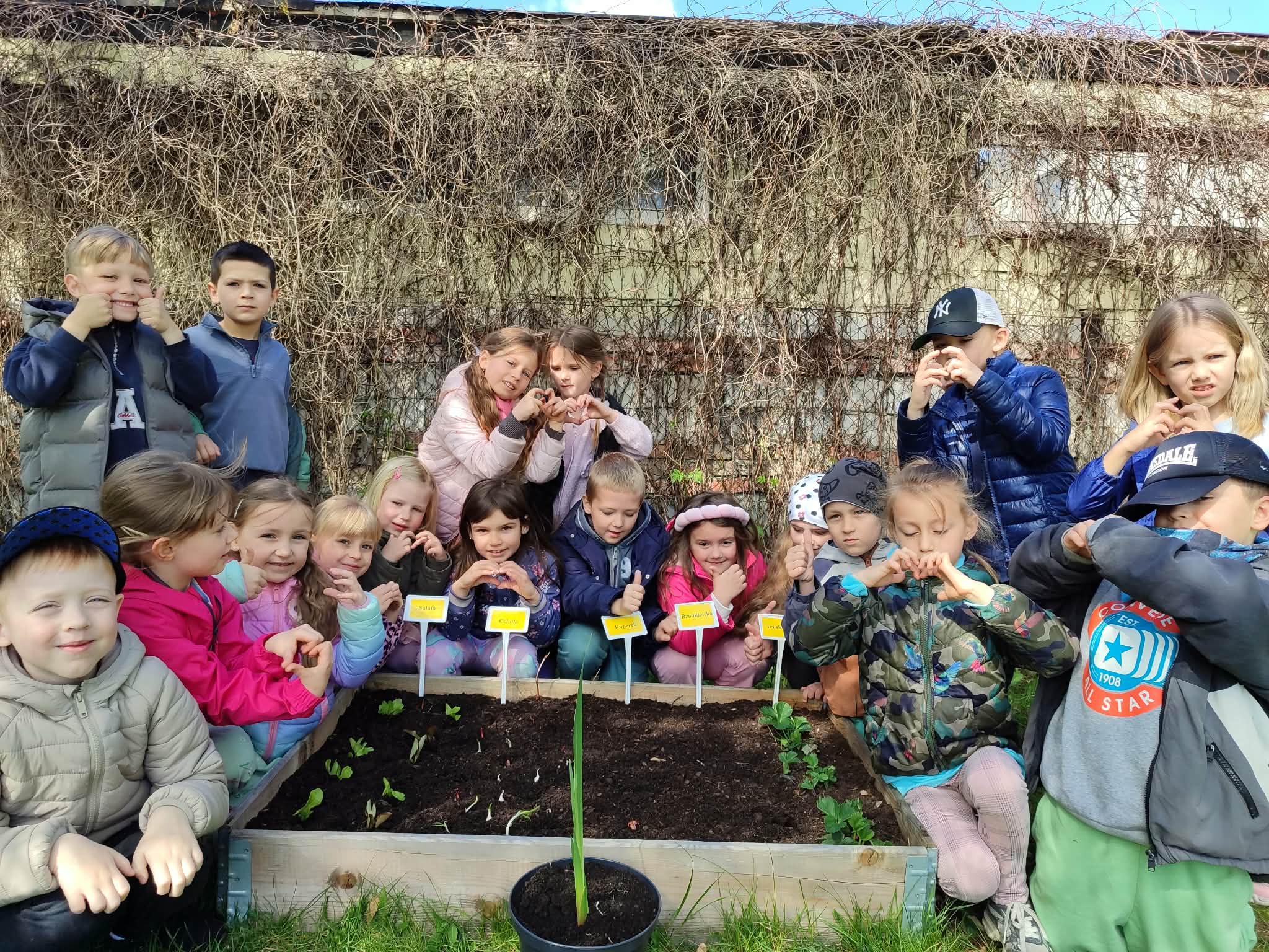 Z dumą podziwiają i troskliwie dbają o zieloną fasolkę, która pięknie im wyrosła. Przygotowały również grządkę- przekopały ziemię, a następnie posadziły w niej cebulę i sałatę oraz wysiały rzodkiewkę i koperek. Oczywiście nie zapomniały o pielęgnowaniu truskawek, które posadziły w poprzednim roku. W tym roku w ogródku znalazło się także miejsce na mieczyka, który będzie kolejną ozdobą ich wspólnej pracy.