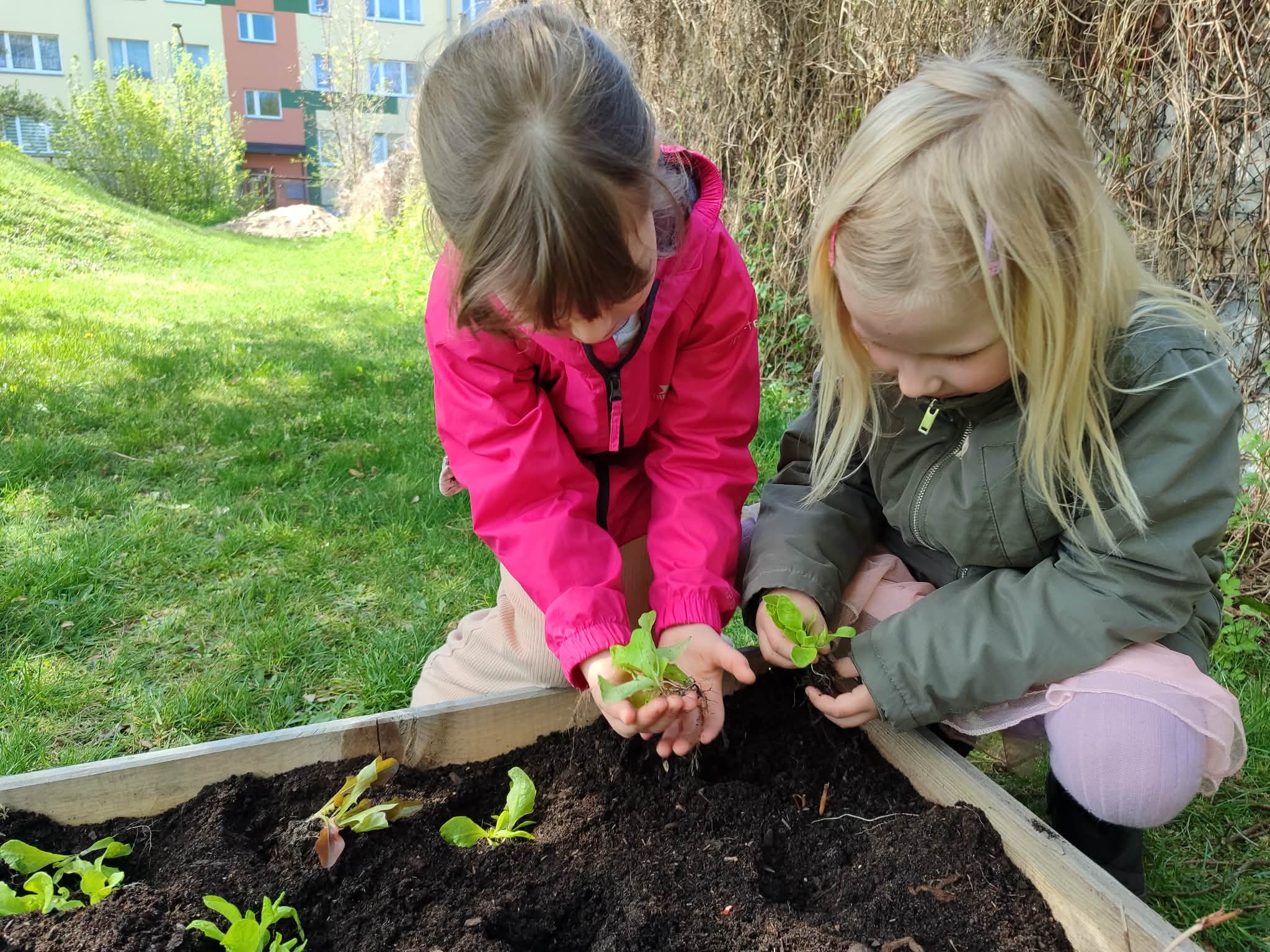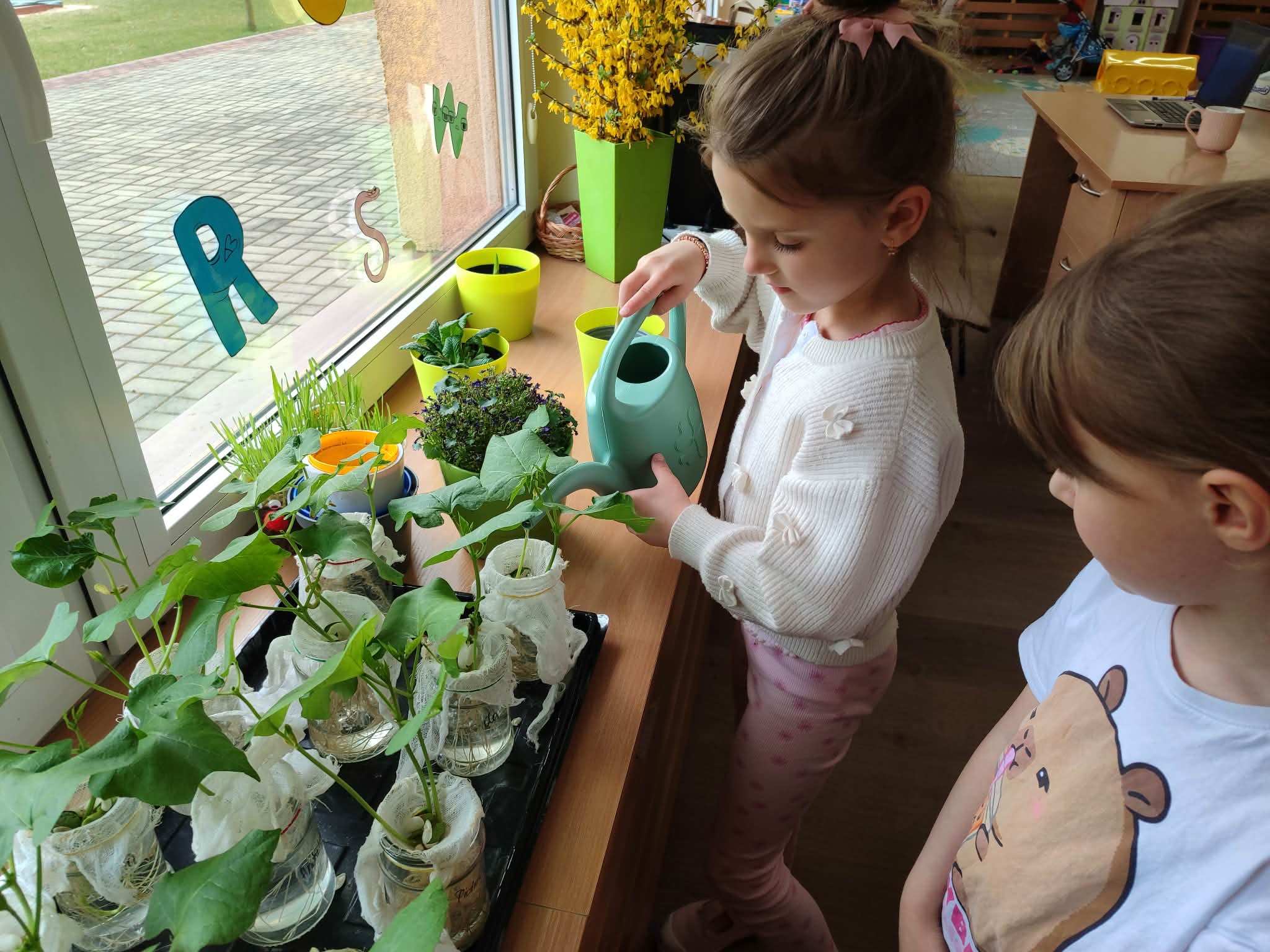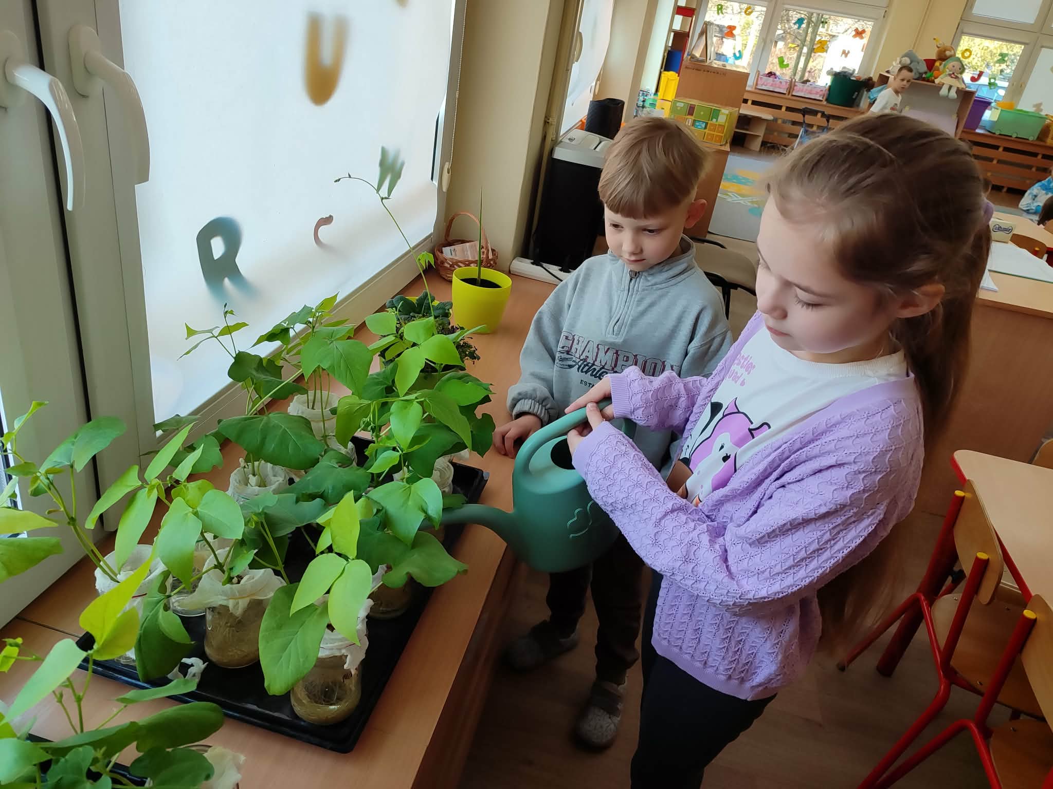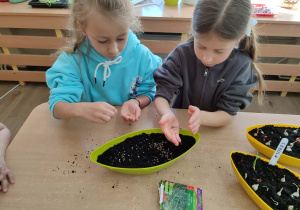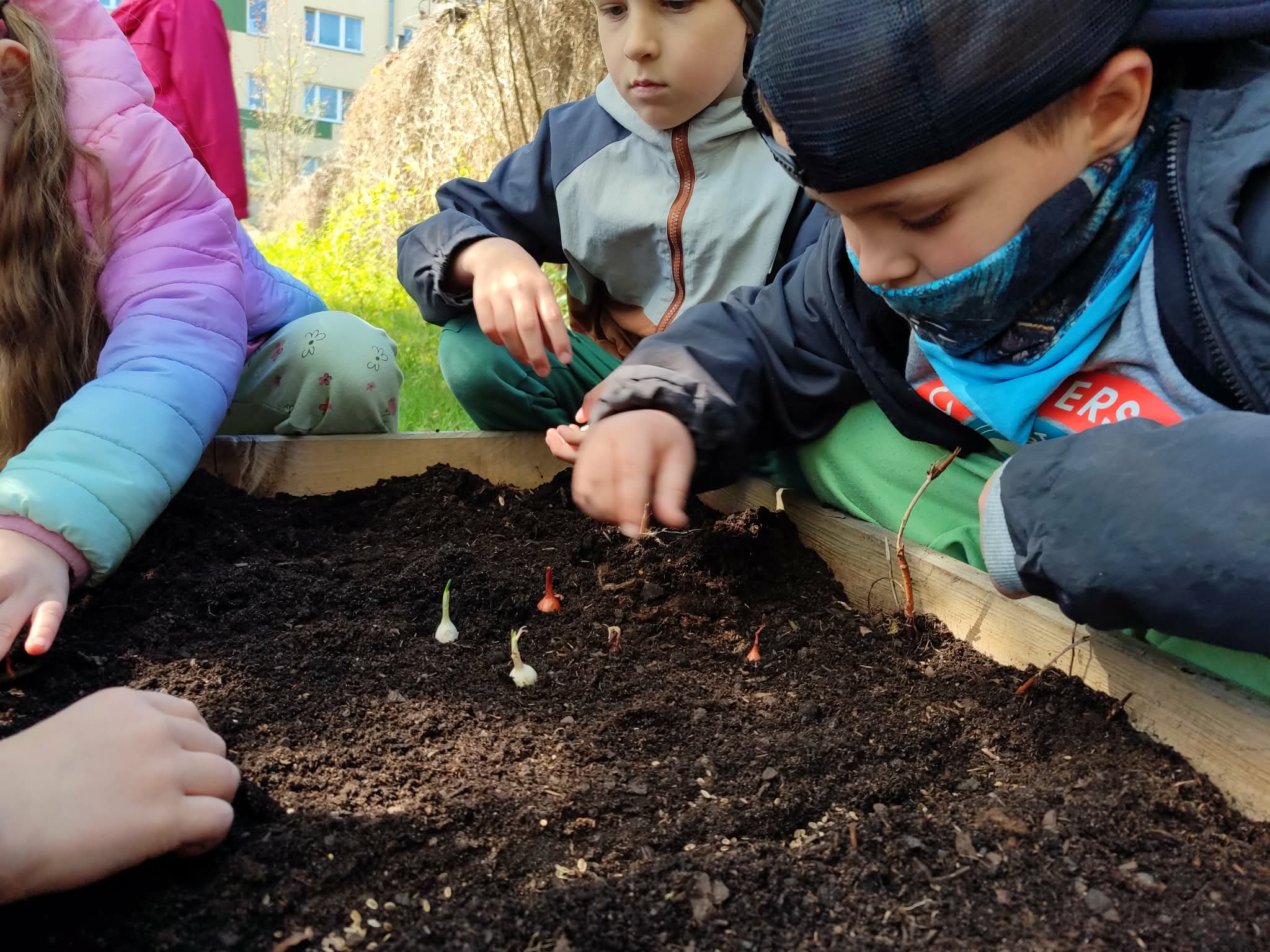 Z dumą podziwiają i troskliwie dbają o zieloną fasolkę, która pięknie im wyrosła. Przygotowały również grządkę- przekopały ziemię, a następnie posadziły w niej cebulę i sałatę oraz wysiały rzodkiewkę i koperek. Oczywiście nie zapomniały o pielęgnowaniu truskawek, które posadziły w poprzednim roku. W tym roku w ogródku znalazło się także miejsce na mieczyka, który będzie kolejną ozdobą ich wspólnej pracy.
