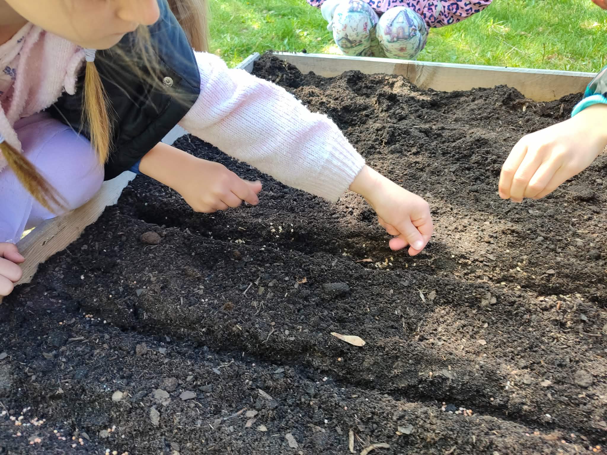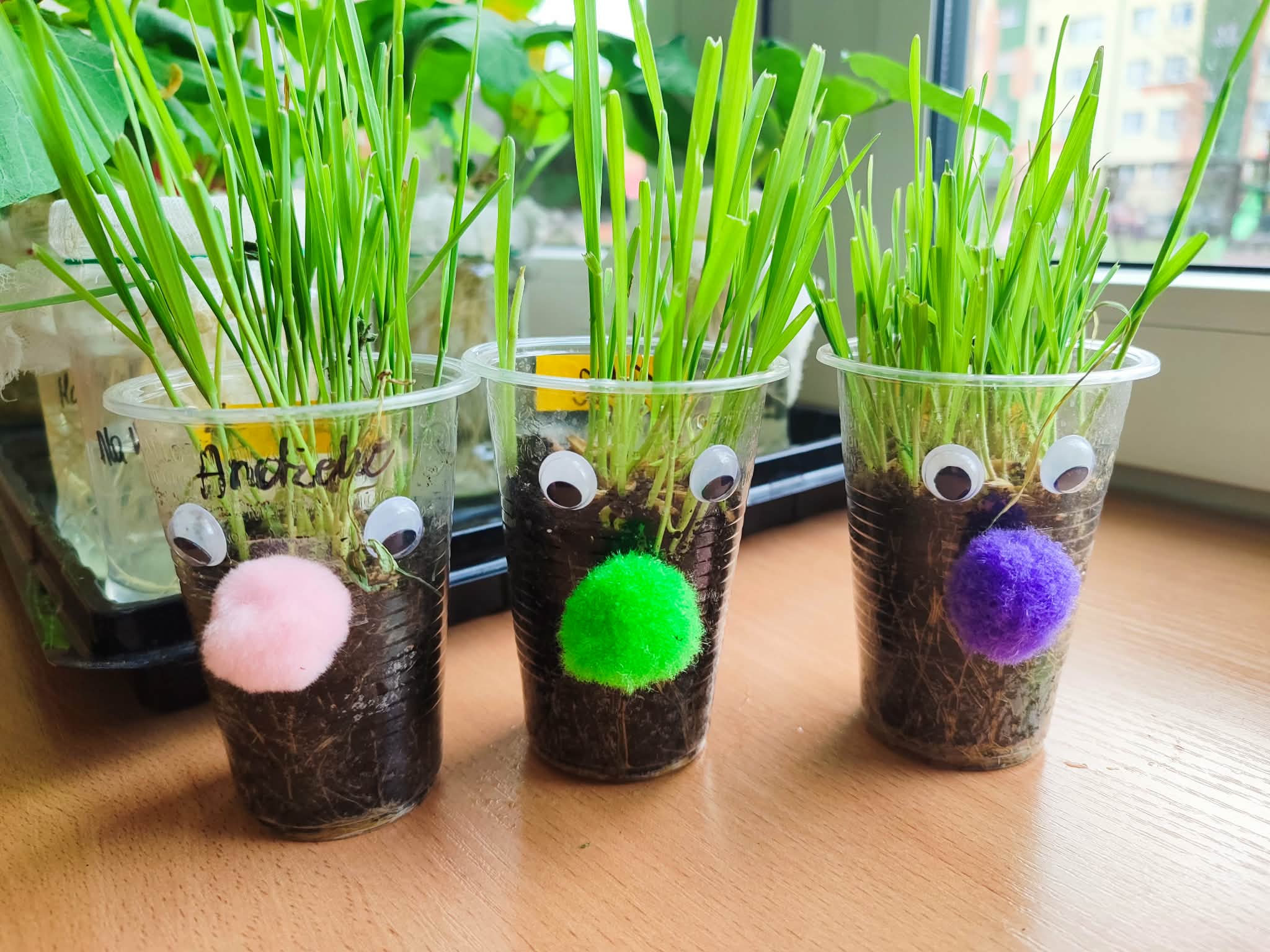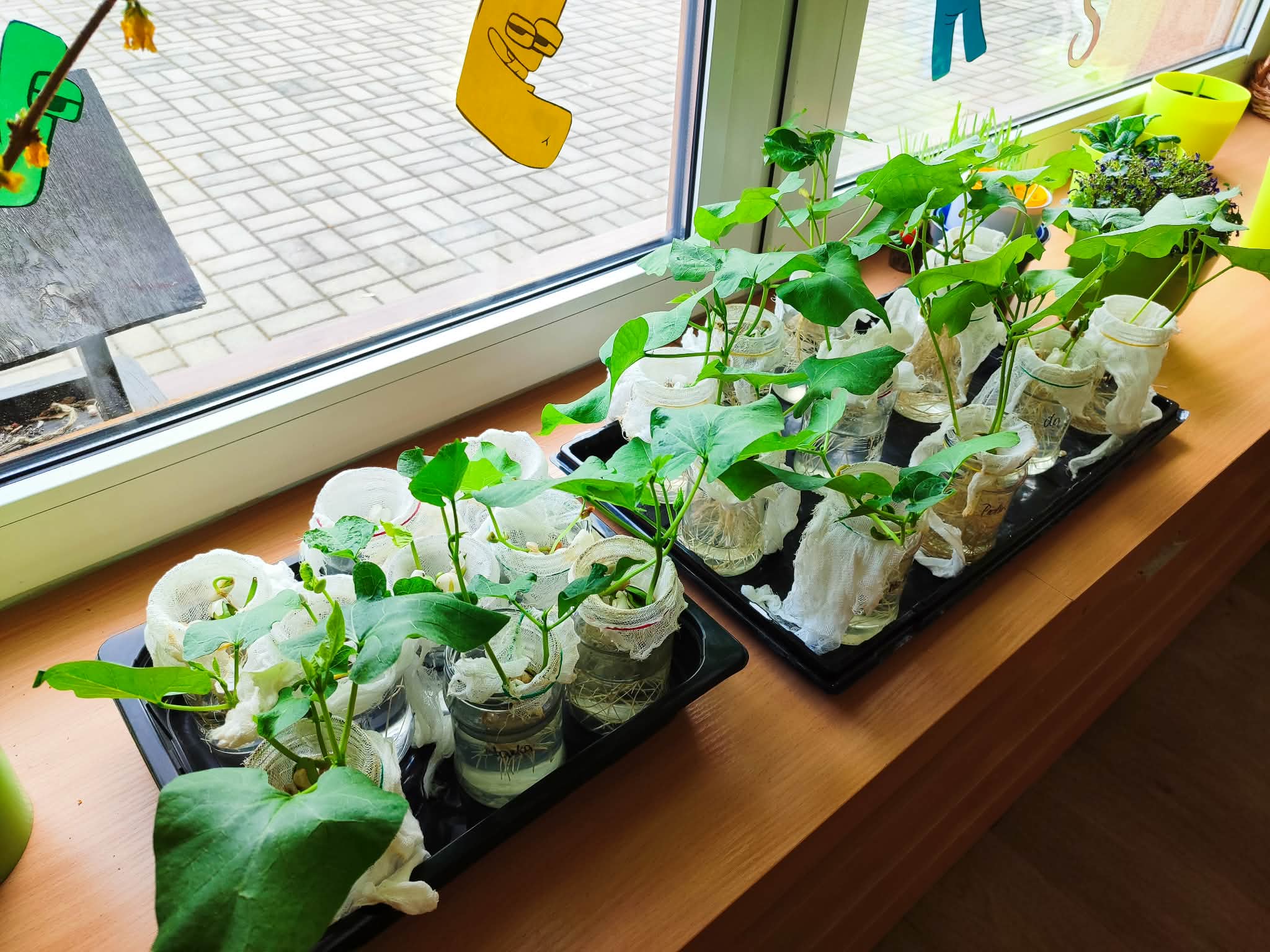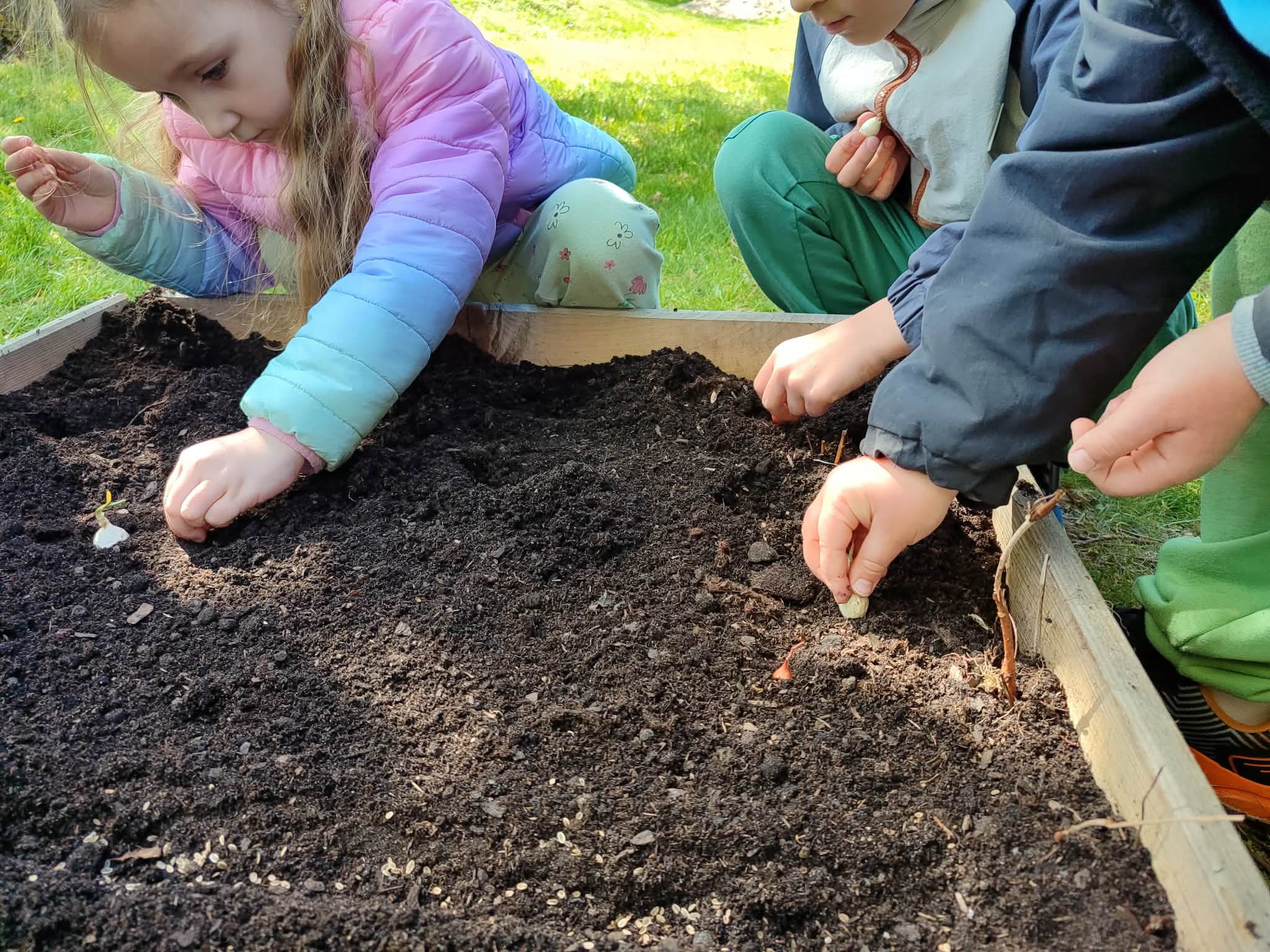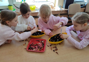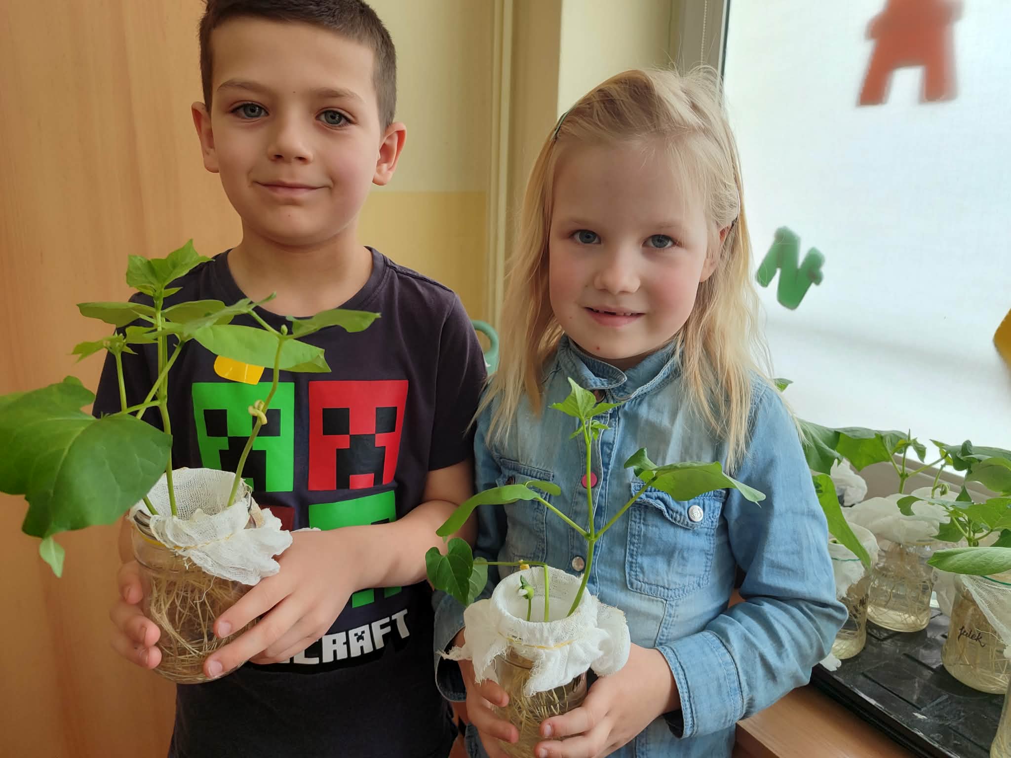 Z dumą podziwiają i troskliwie dbają o zieloną fasolkę, która pięknie im wyrosła. Przygotowały również grządkę- przekopały ziemię, a następnie posadziły w niej cebulę i sałatę oraz wysiały rzodkiewkę i koperek. Oczywiście nie zapomniały o pielęgnowaniu truskawek, które posadziły w poprzednim roku. W tym roku w ogródku znalazło się także miejsce na mieczyka, który będzie kolejną ozdobą ich wspólnej pracy.