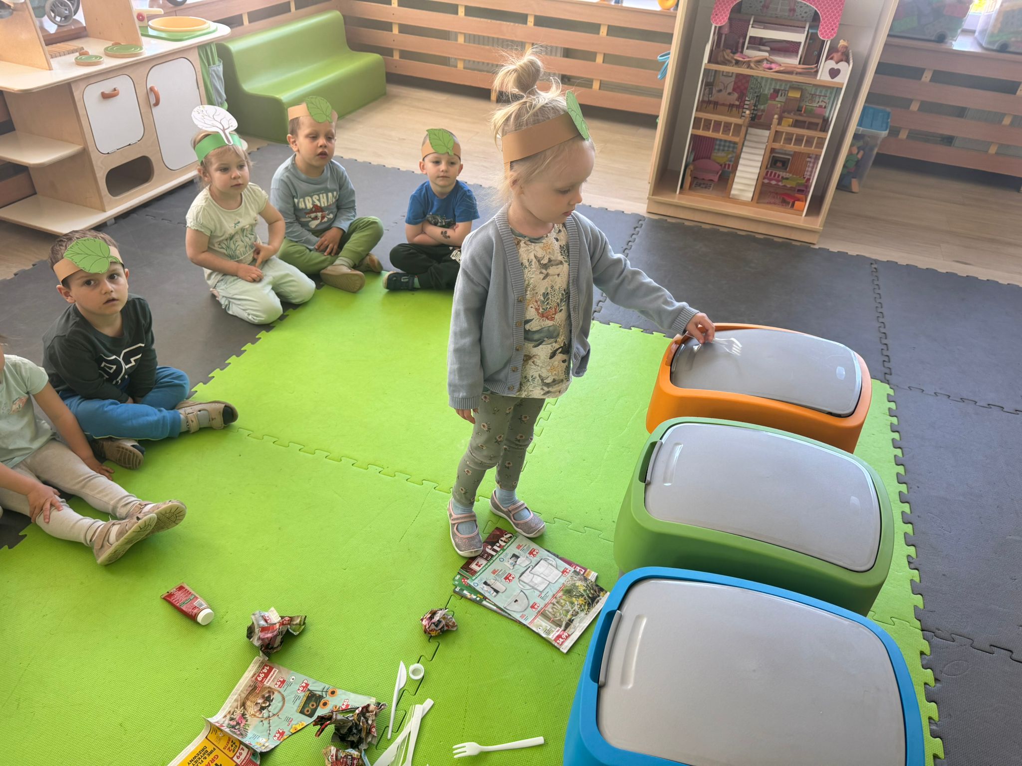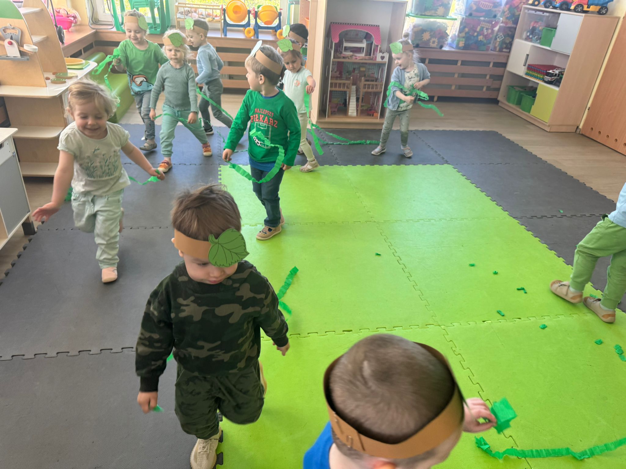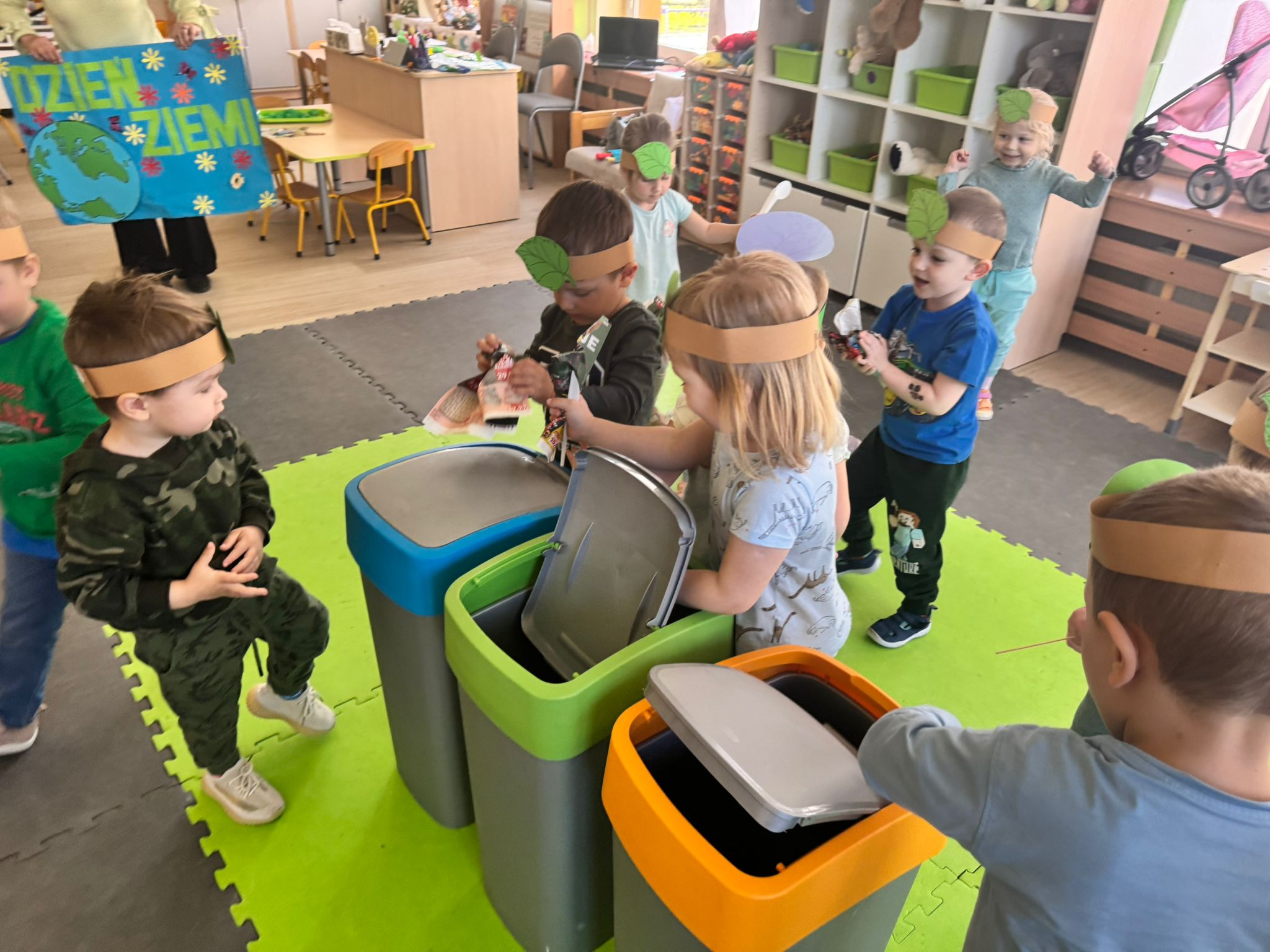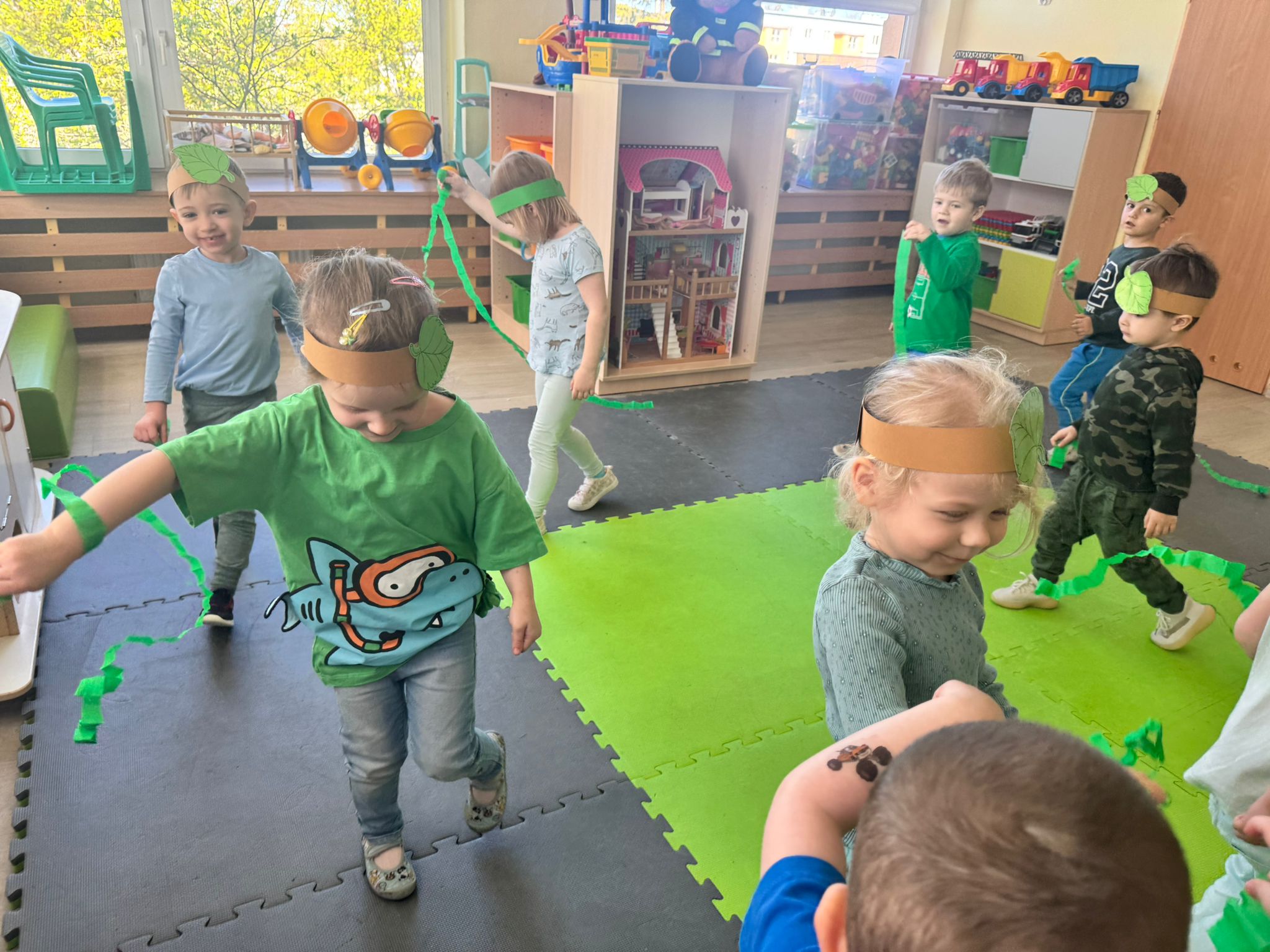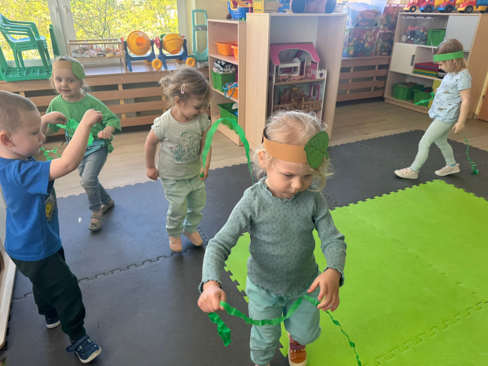 Maluszki świętowały Dzień Ziemi w radosnej i edukacyjnej atmosferze. Dzieci poznały podstawowe zasady dbania o naszą planetę oraz dowiedziały się, jak ważna jest ochrona środowiska. Uczyły się również segregować śmieci, rozpoznając odpowiednie kolory pojemników. Na zakończenie wspólnie zatańczyły „zielony taniec”, który był ich symboliczną obietnicą troski o przyrodę i dbania o Ziemię każdego dnia.