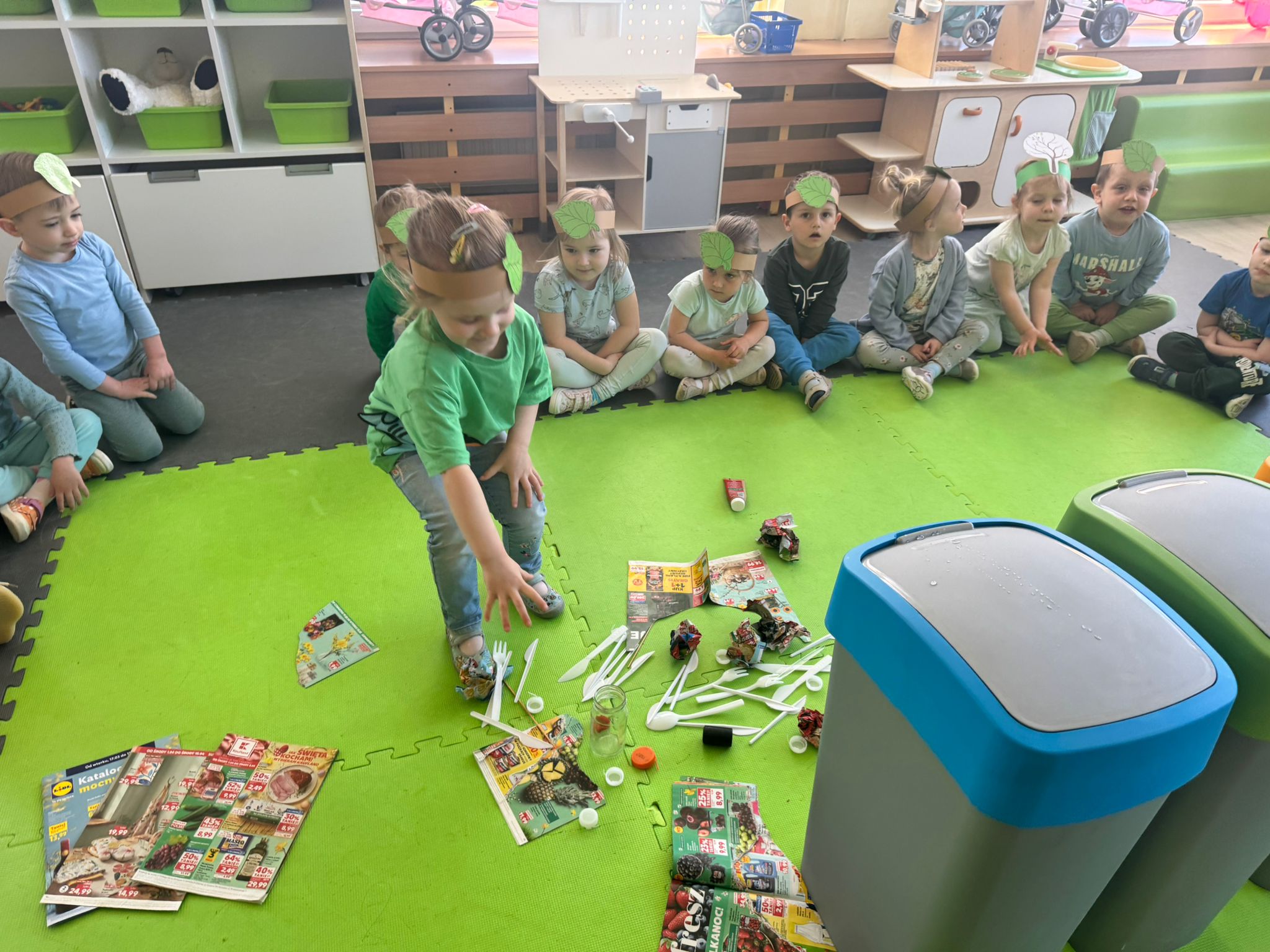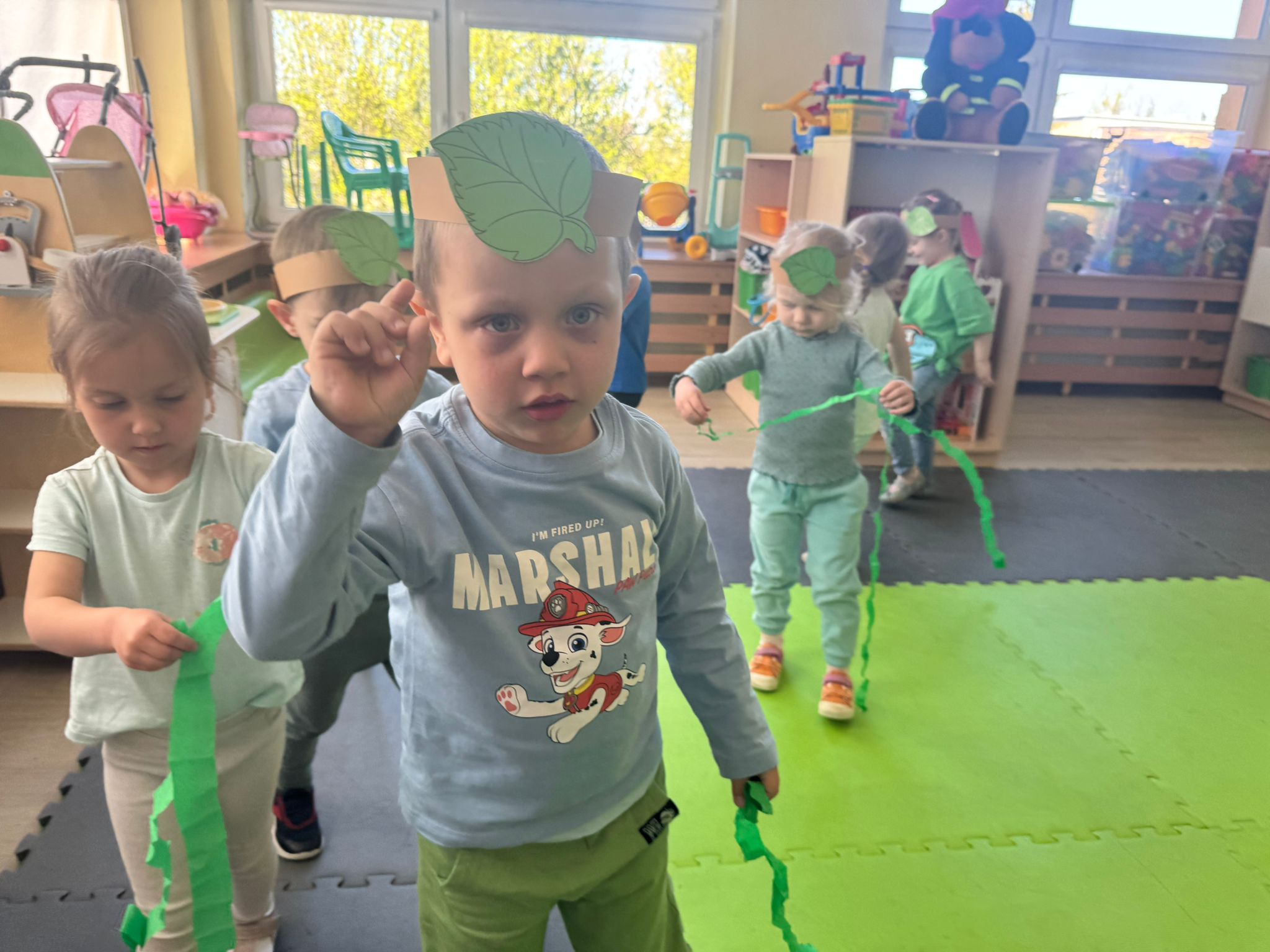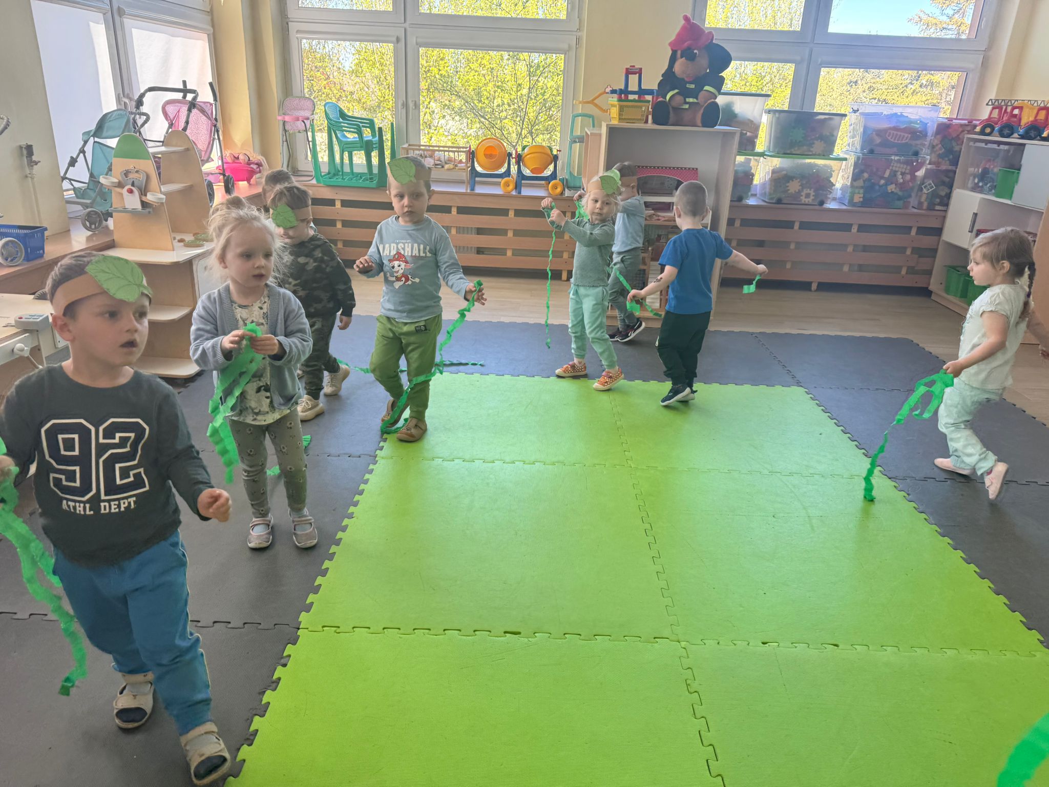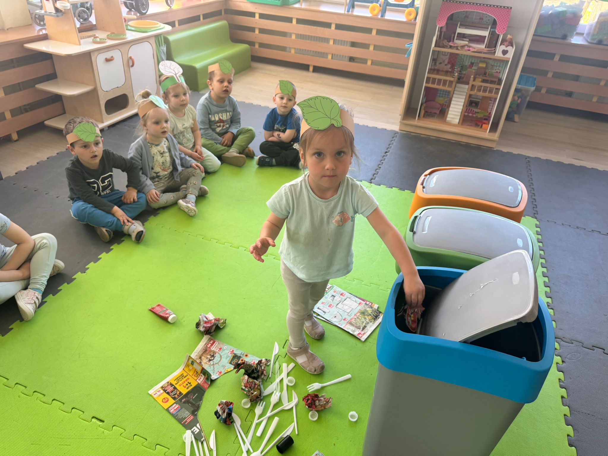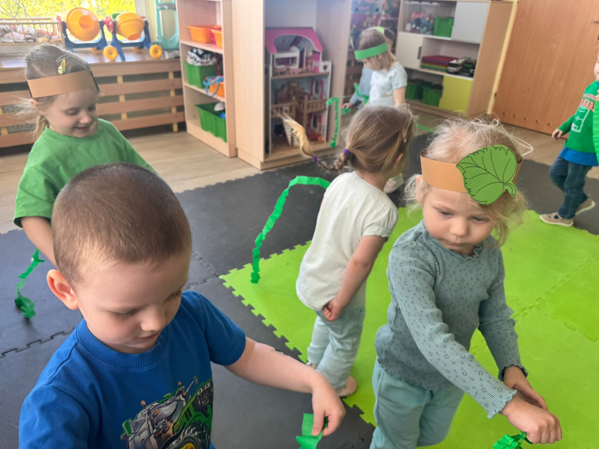Maluszki świętowały Dzień Ziemi w radosnej i edukacyjnej atmosferze. Dzieci poznały podstawowe zasady dbania o naszą planetę oraz dowiedziały się, jak ważna jest ochrona środowiska. Uczyły się również segregować śmieci, rozpoznając odpowiednie kolory pojemników. Na zakończenie wspólnie zatańczyły „zielony taniec”, który był ich symboliczną obietnicą troski o przyrodę i dbania o Ziemię każdego dnia.
