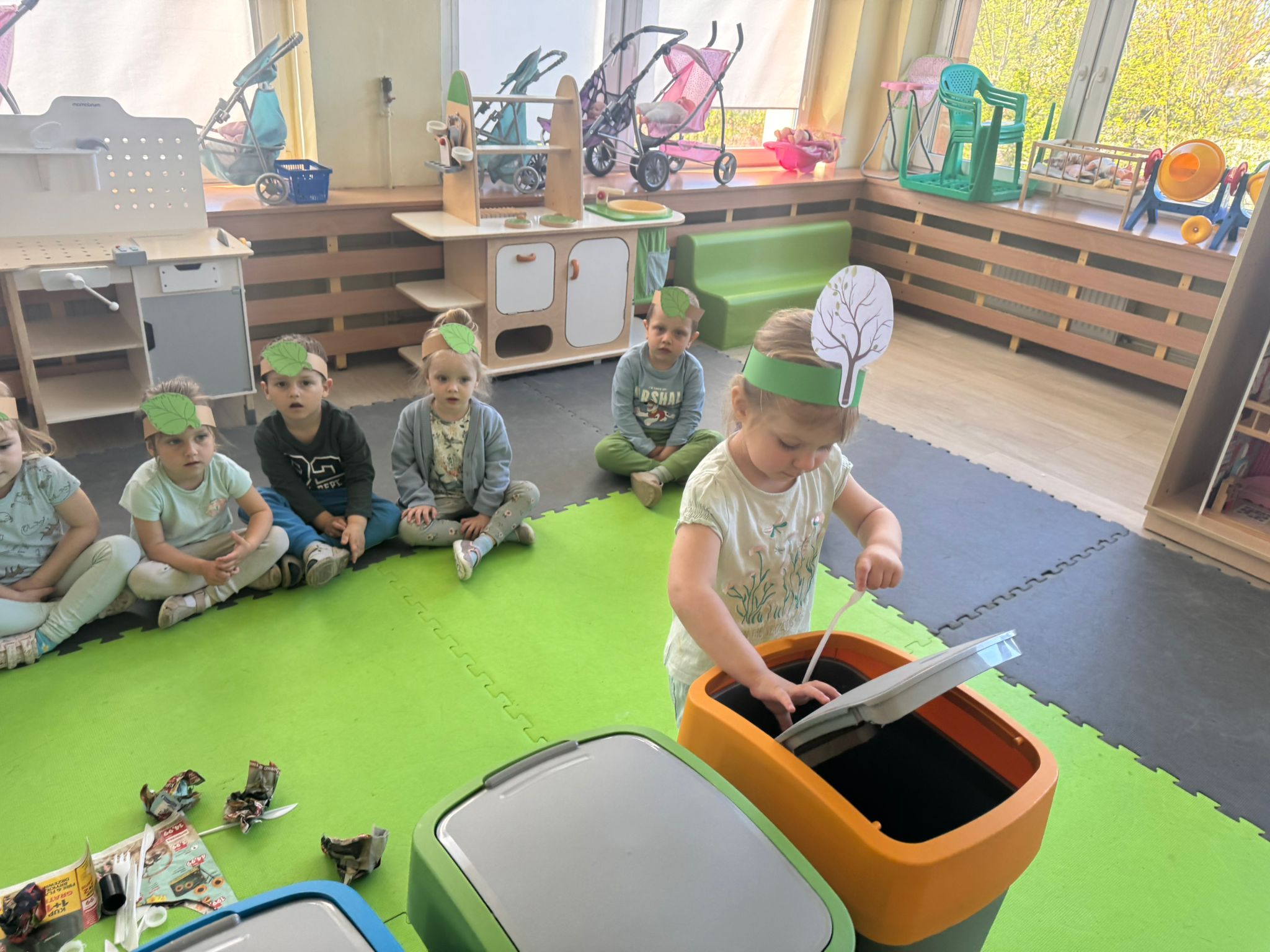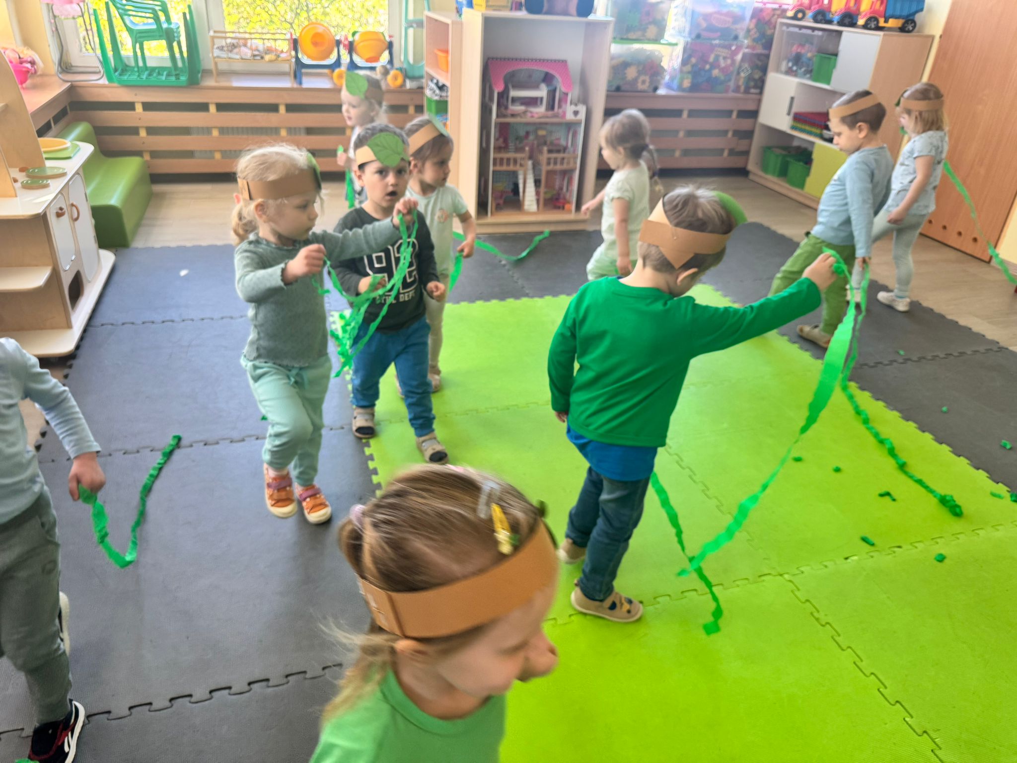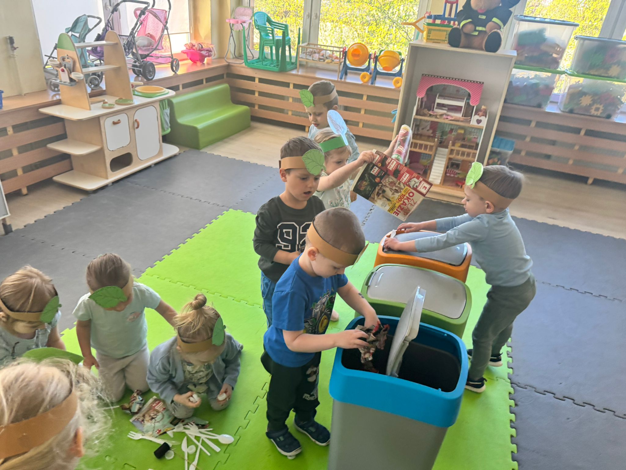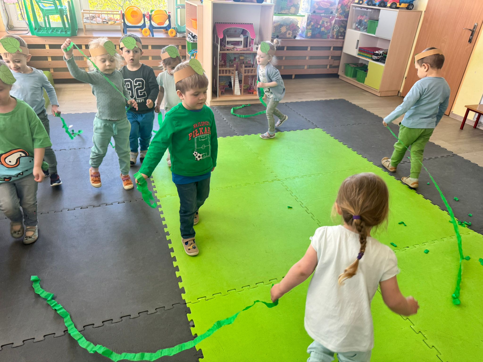 Maluszki świętowały Dzień Ziemi w radosnej i edukacyjnej atmosferze. Dzieci poznały podstawowe zasady dbania o naszą planetę oraz dowiedziały się, jak ważna jest ochrona środowiska. Uczyły się również segregować śmieci, rozpoznając odpowiednie kolory pojemników. Na zakończenie wspólnie zatańczyły „zielony taniec”, który był ich symboliczną obietnicą troski o przyrodę i dbania o Ziemię każdego dnia.