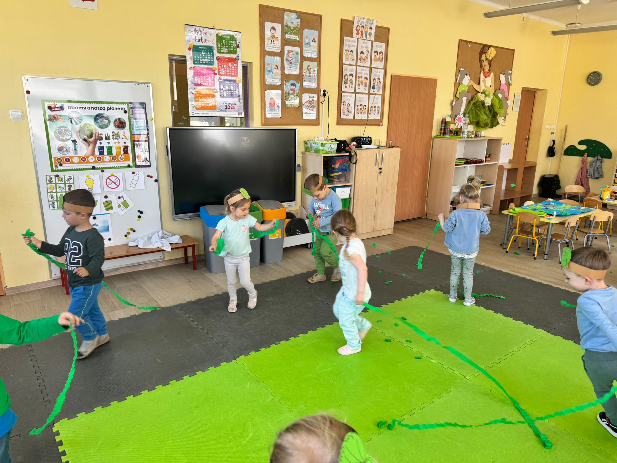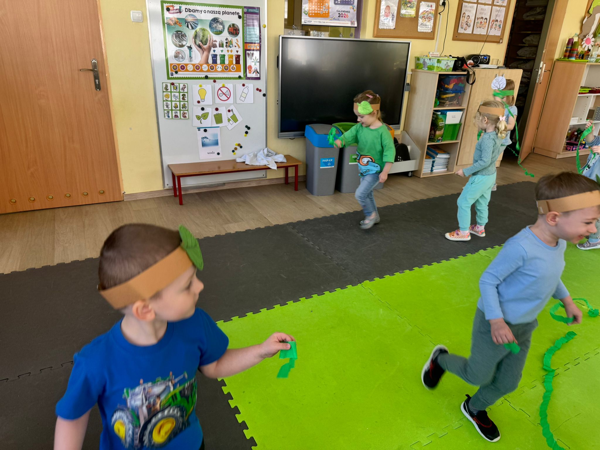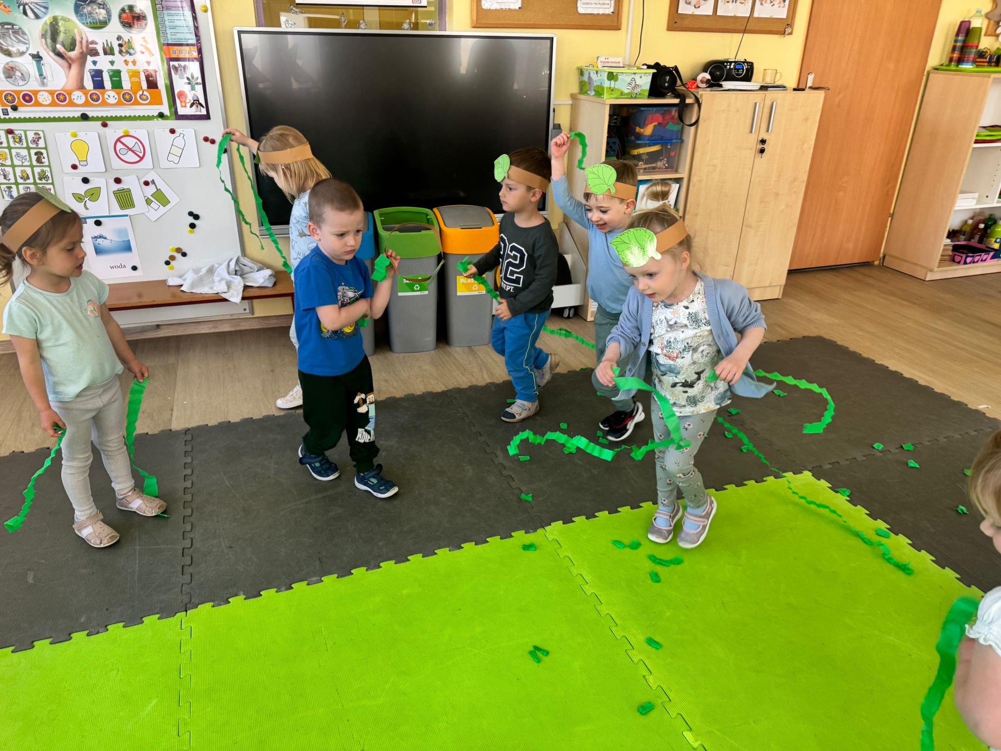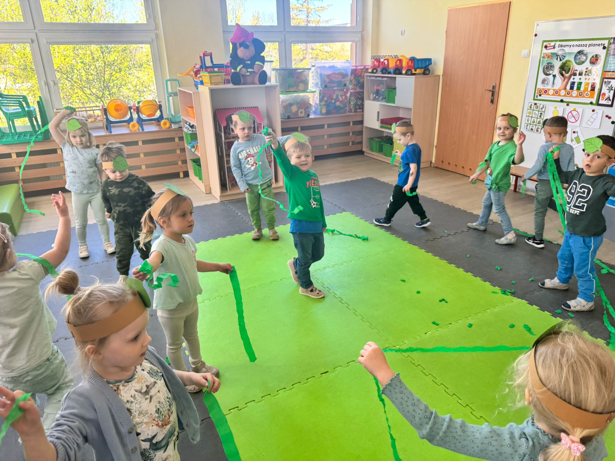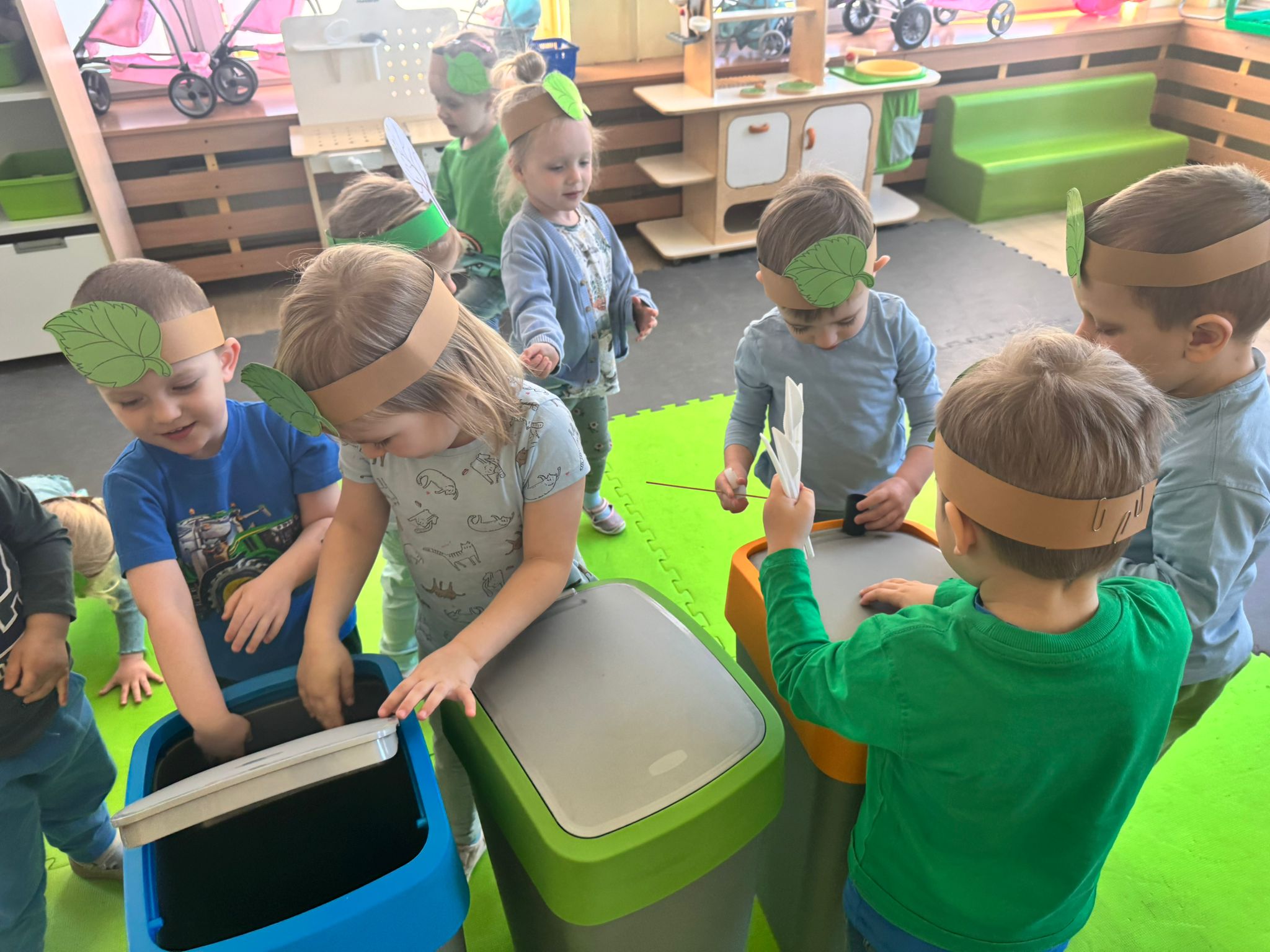 Maluszki świętowały Dzień Ziemi w radosnej i edukacyjnej atmosferze. Dzieci poznały podstawowe zasady dbania o naszą planetę oraz dowiedziały się, jak ważna jest ochrona środowiska. Uczyły się również segregować śmieci, rozpoznając odpowiednie kolory pojemników. Na zakończenie wspólnie zatańczyły „zielony taniec”, który był ich symboliczną obietnicą troski o przyrodę i dbania o Ziemię każdego dnia.