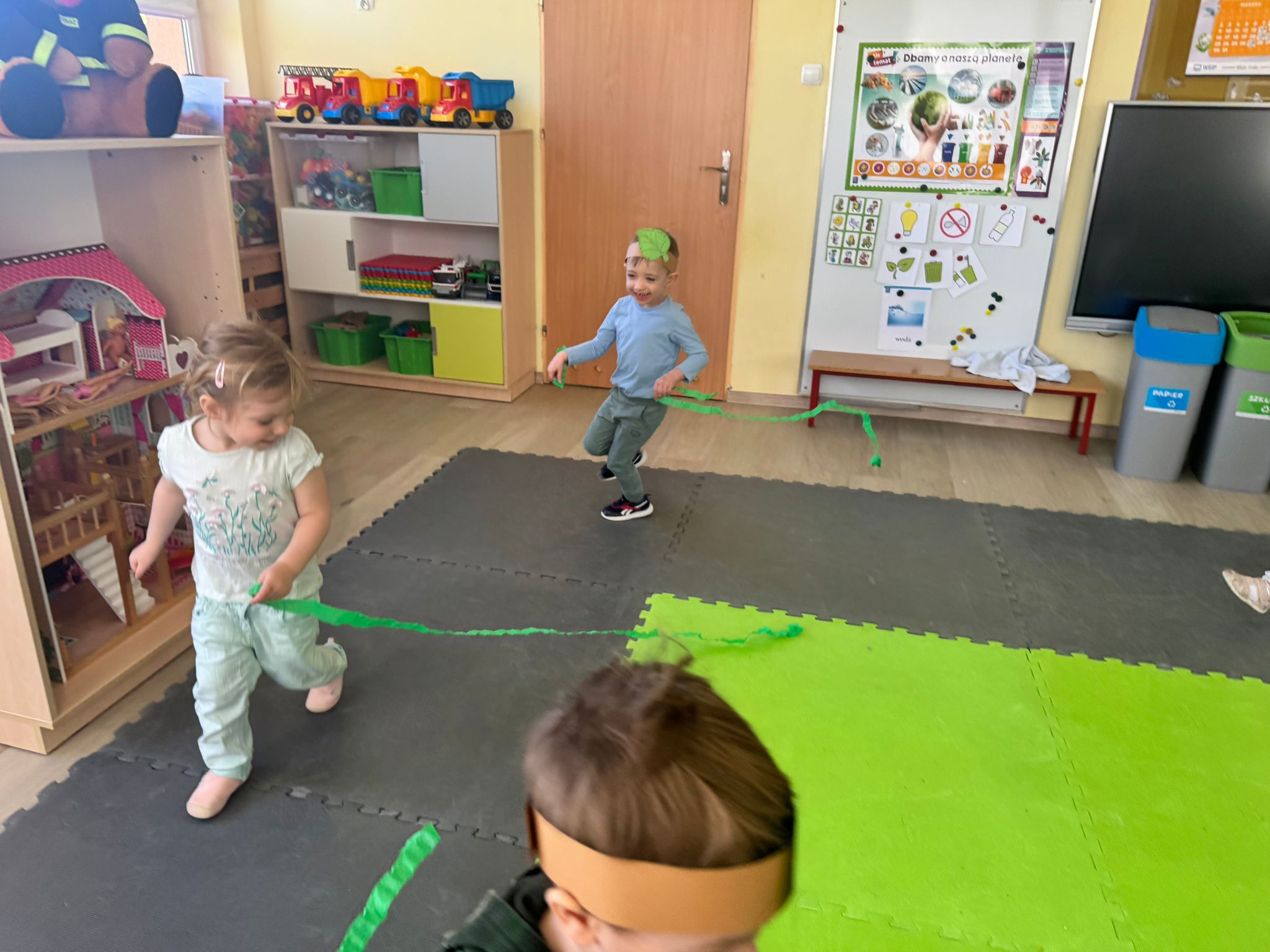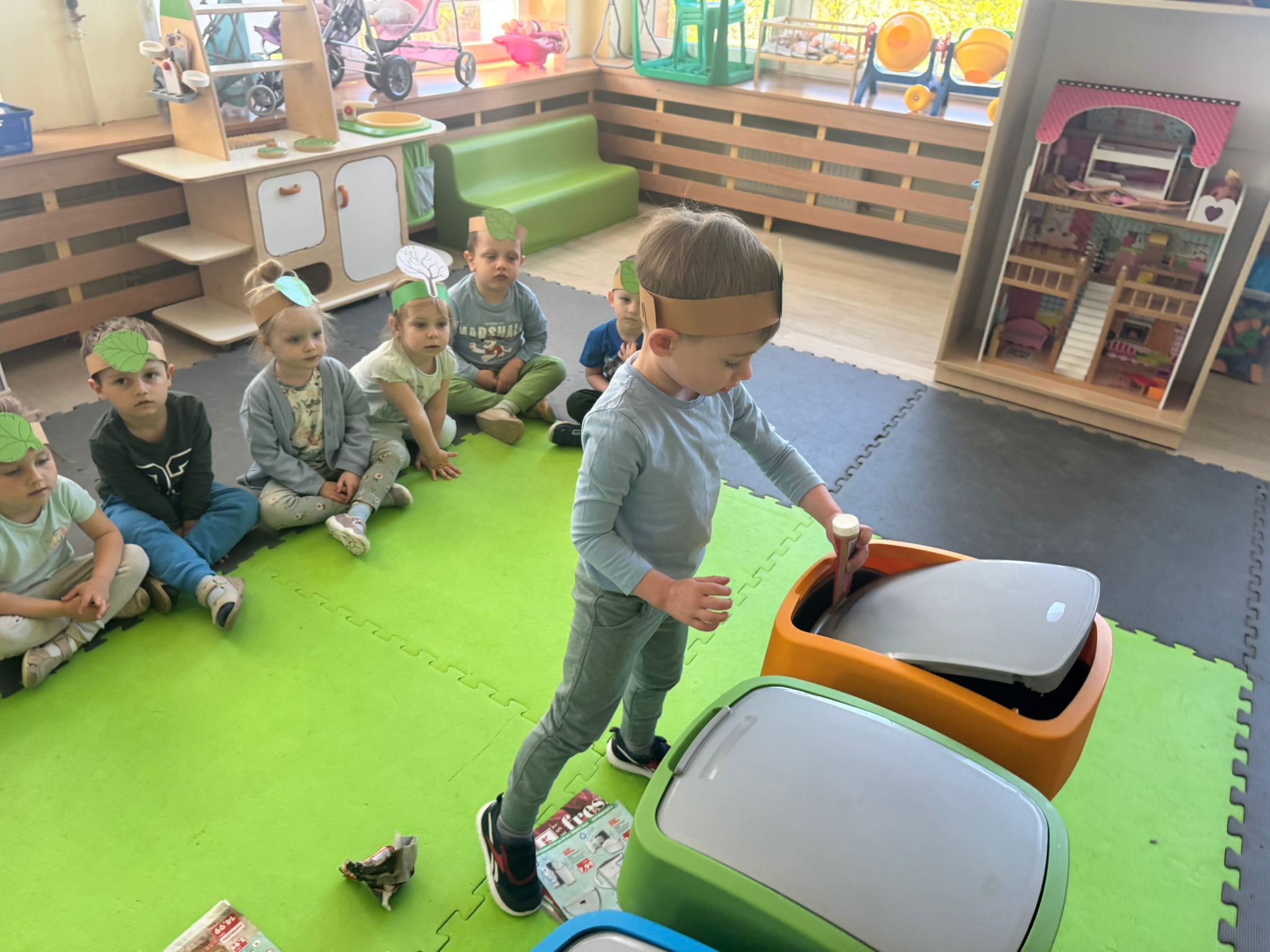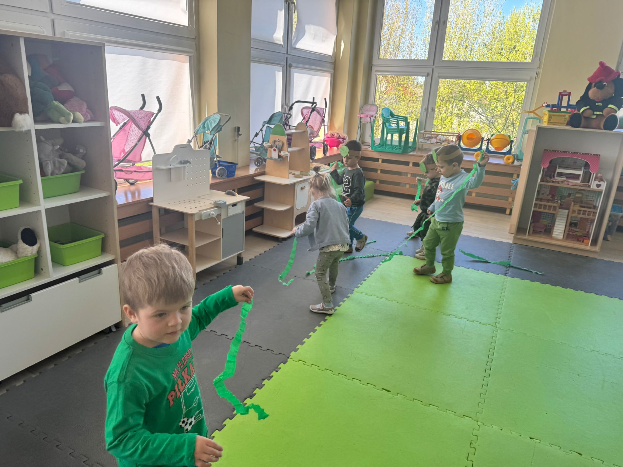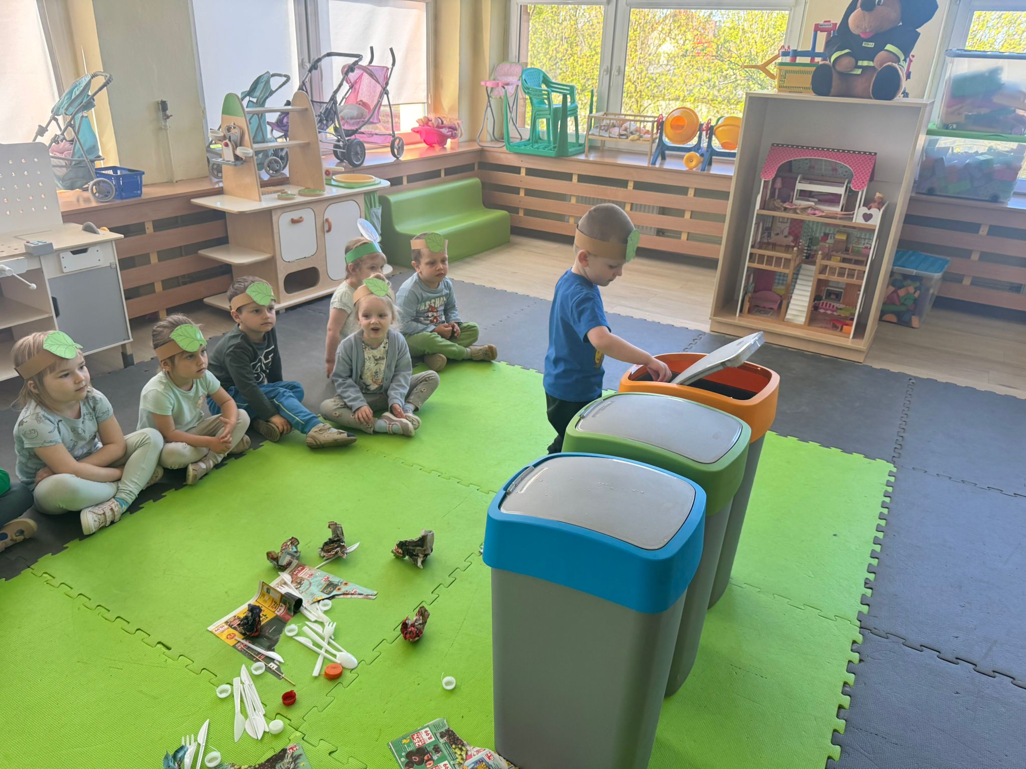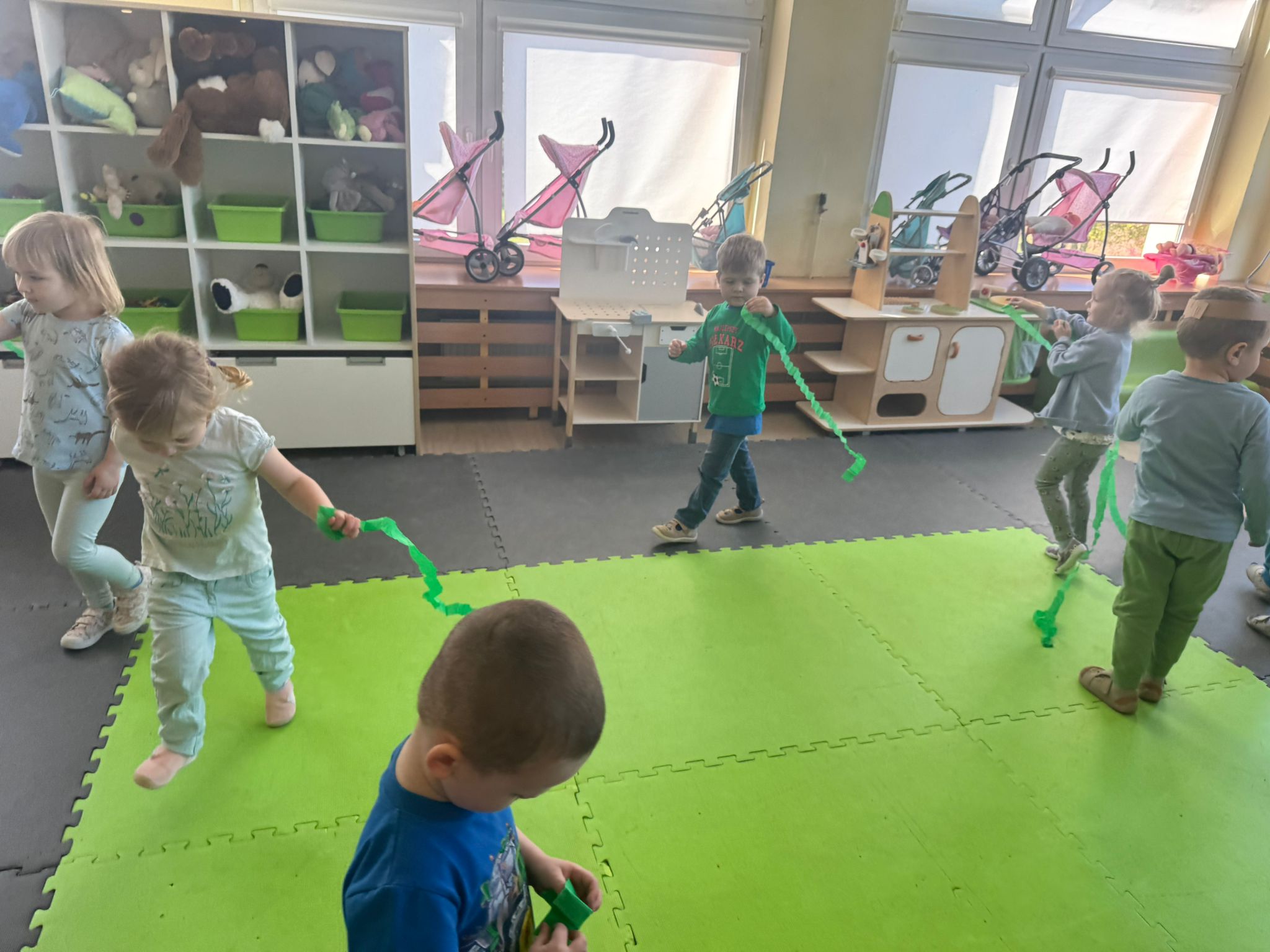 Maluszki świętowały Dzień Ziemi w radosnej i edukacyjnej atmosferze. Dzieci poznały podstawowe zasady dbania o naszą planetę oraz dowiedziały się, jak ważna jest ochrona środowiska. Uczyły się również segregować śmieci, rozpoznając odpowiednie kolory pojemników. Na zakończenie wspólnie zatańczyły „zielony taniec”, który był ich symboliczną obietnicą troski o przyrodę i dbania o Ziemię każdego dnia.