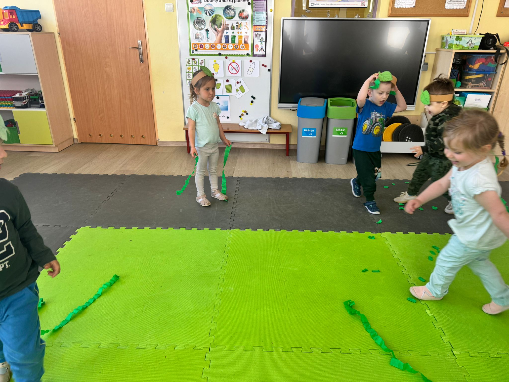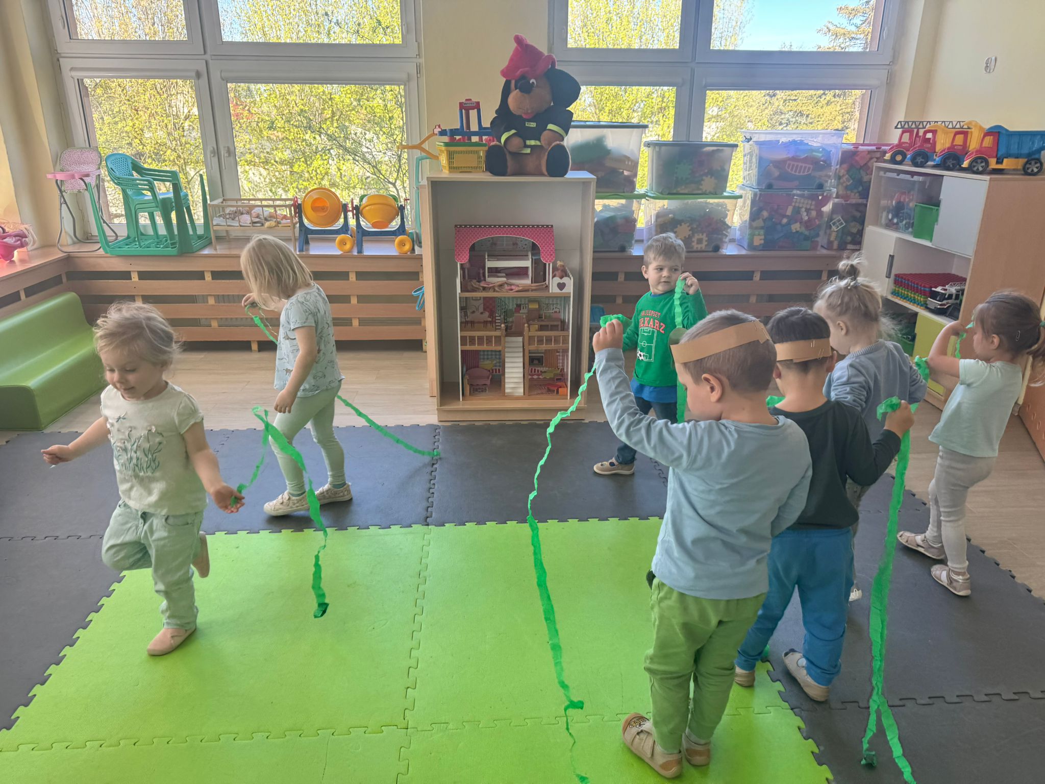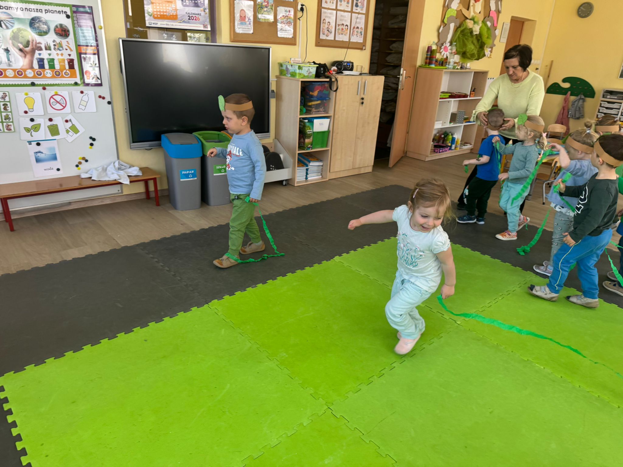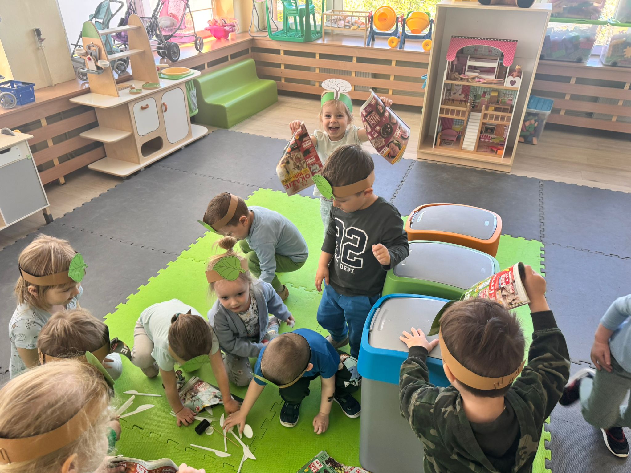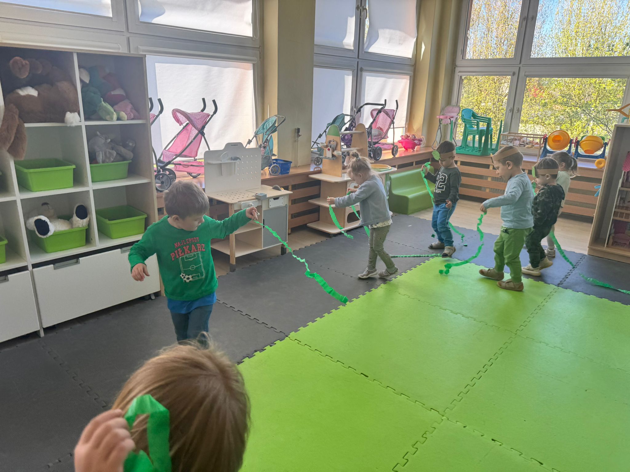 Maluszki świętowały Dzień Ziemi w radosnej i edukacyjnej atmosferze. Dzieci poznały podstawowe zasady dbania o naszą planetę oraz dowiedziały się, jak ważna jest ochrona środowiska. Uczyły się również segregować śmieci, rozpoznając odpowiednie kolory pojemników. Na zakończenie wspólnie zatańczyły „zielony taniec”, który był ich symboliczną obietnicą troski o przyrodę i dbania o Ziemię każdego dnia.