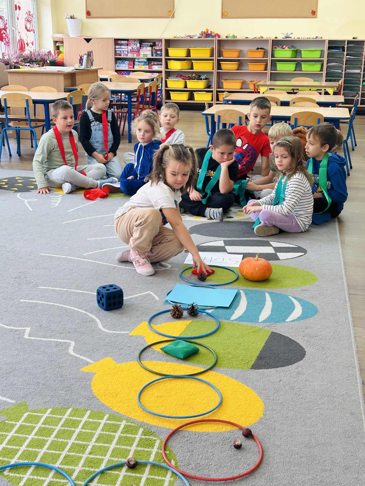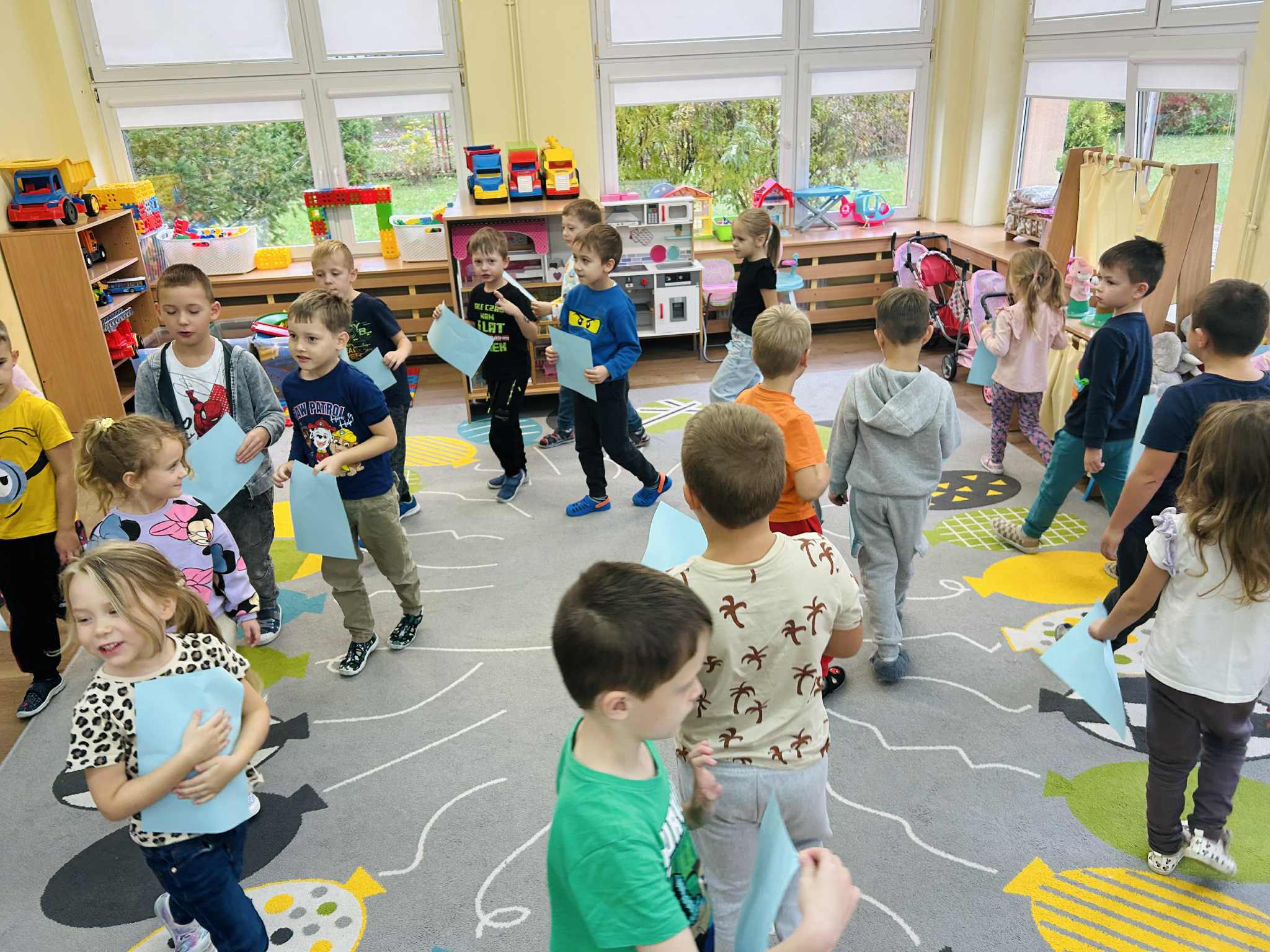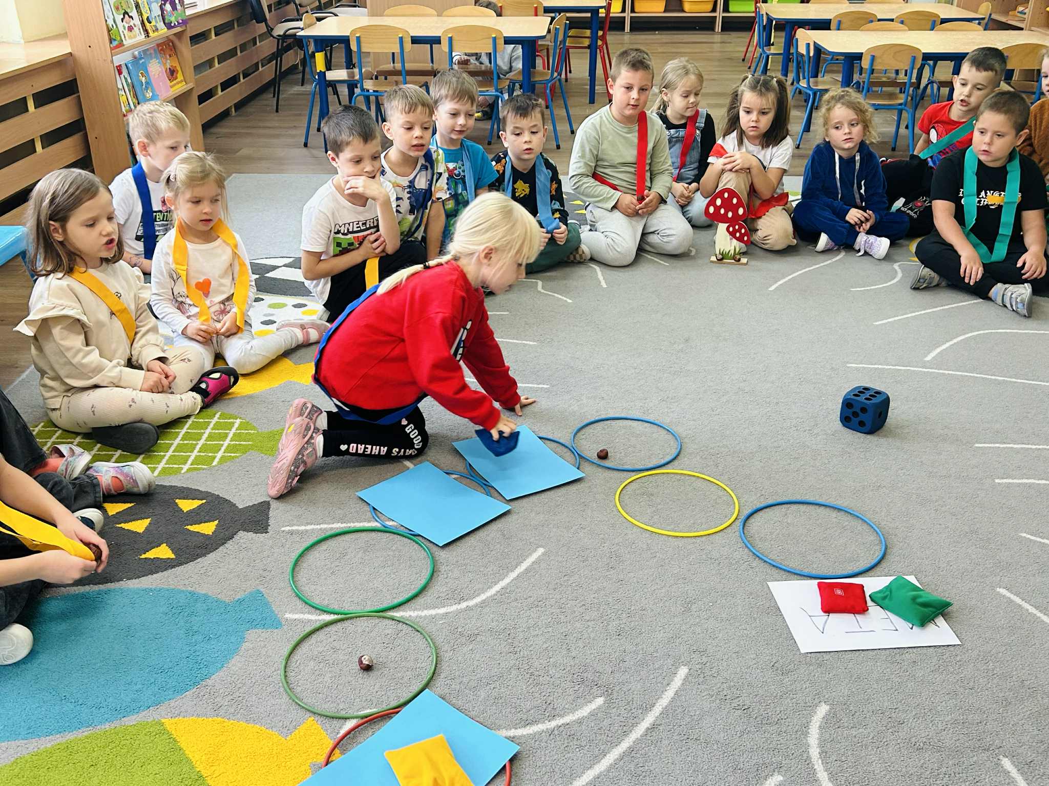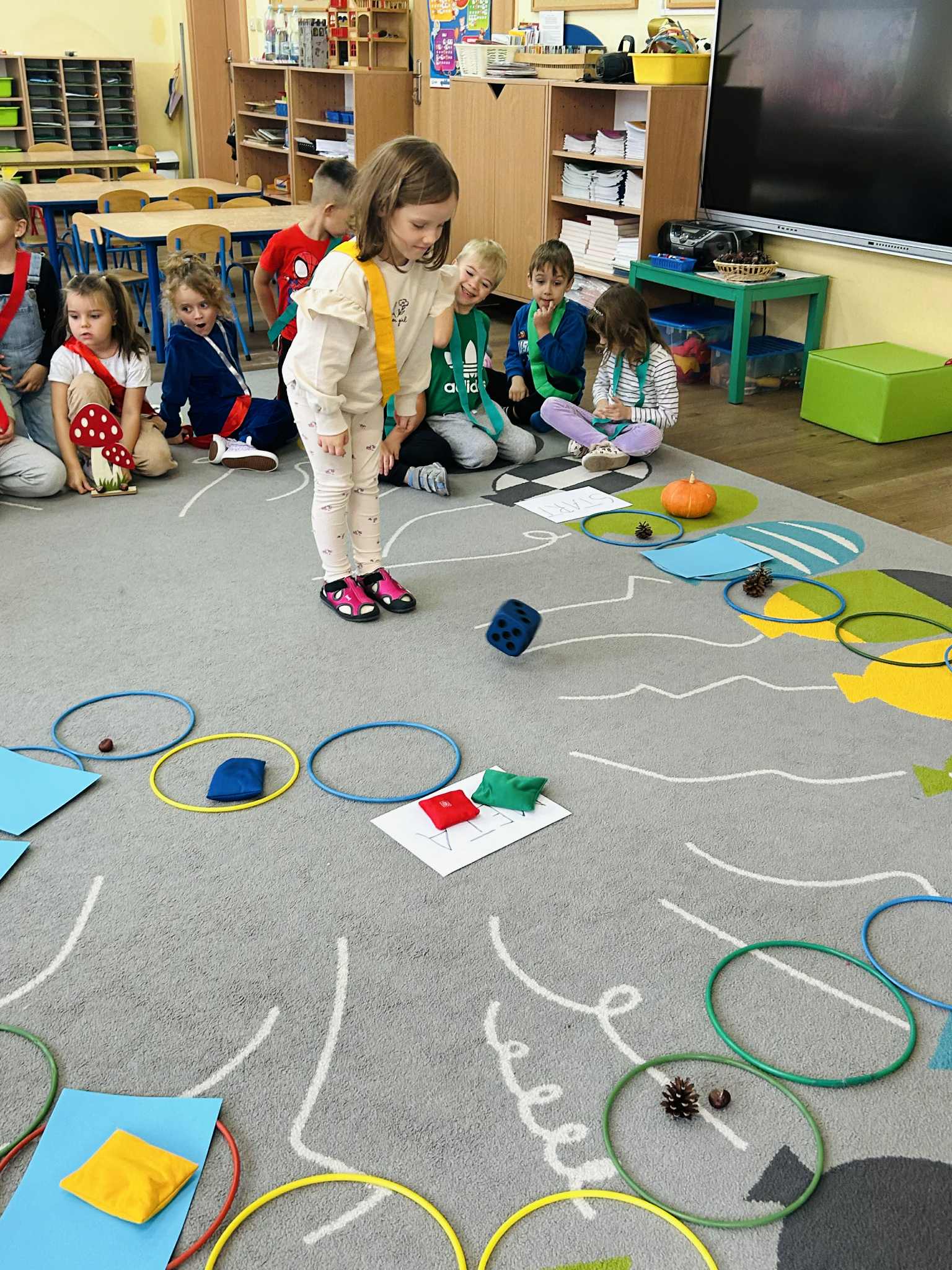 Podczas ostatnich zajęć dzieci wzięły udział w grze planszowej, w której – podzielone na drużyny – pokonywały kolejne pola, zbierając jesienne dary lub… wpadając w „kałużę” i czekając na swoją kolej. Nie zabrakło również zabaw ruchowych inspirowanych jesienną aurą – wiatrem, deszczem i tańczącymi liśćmi.