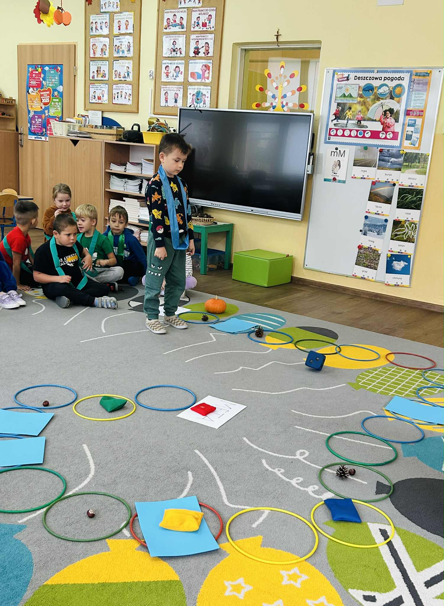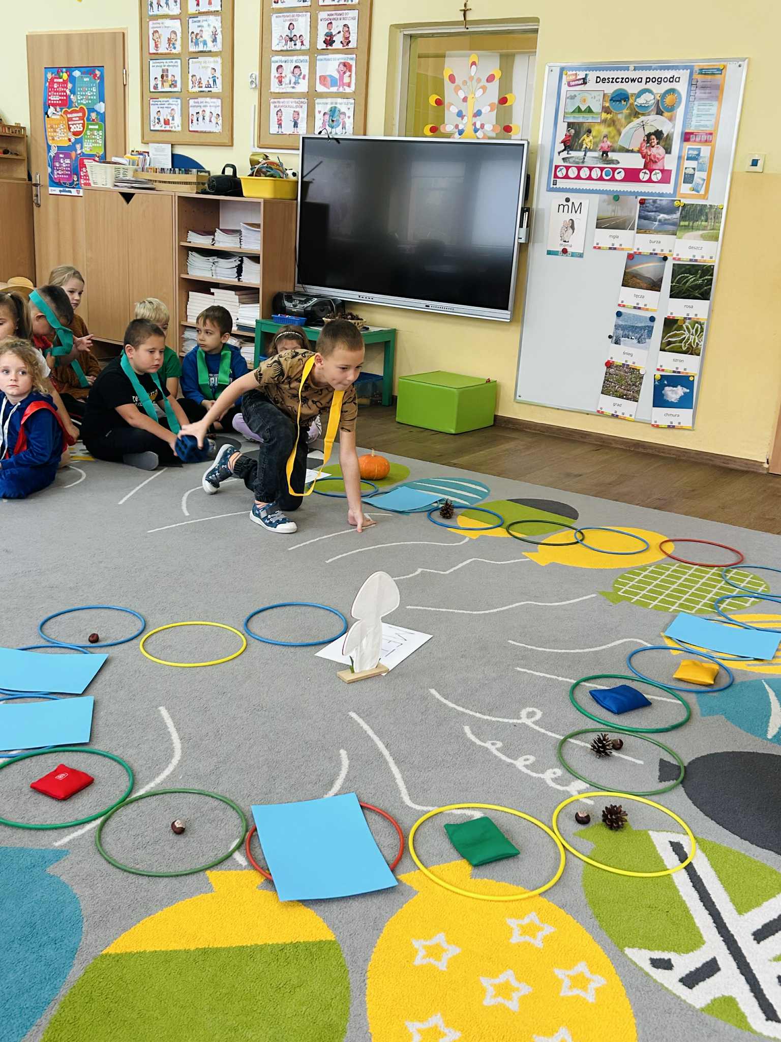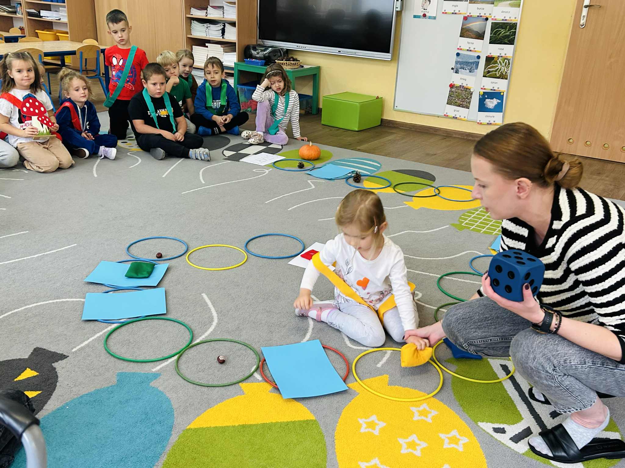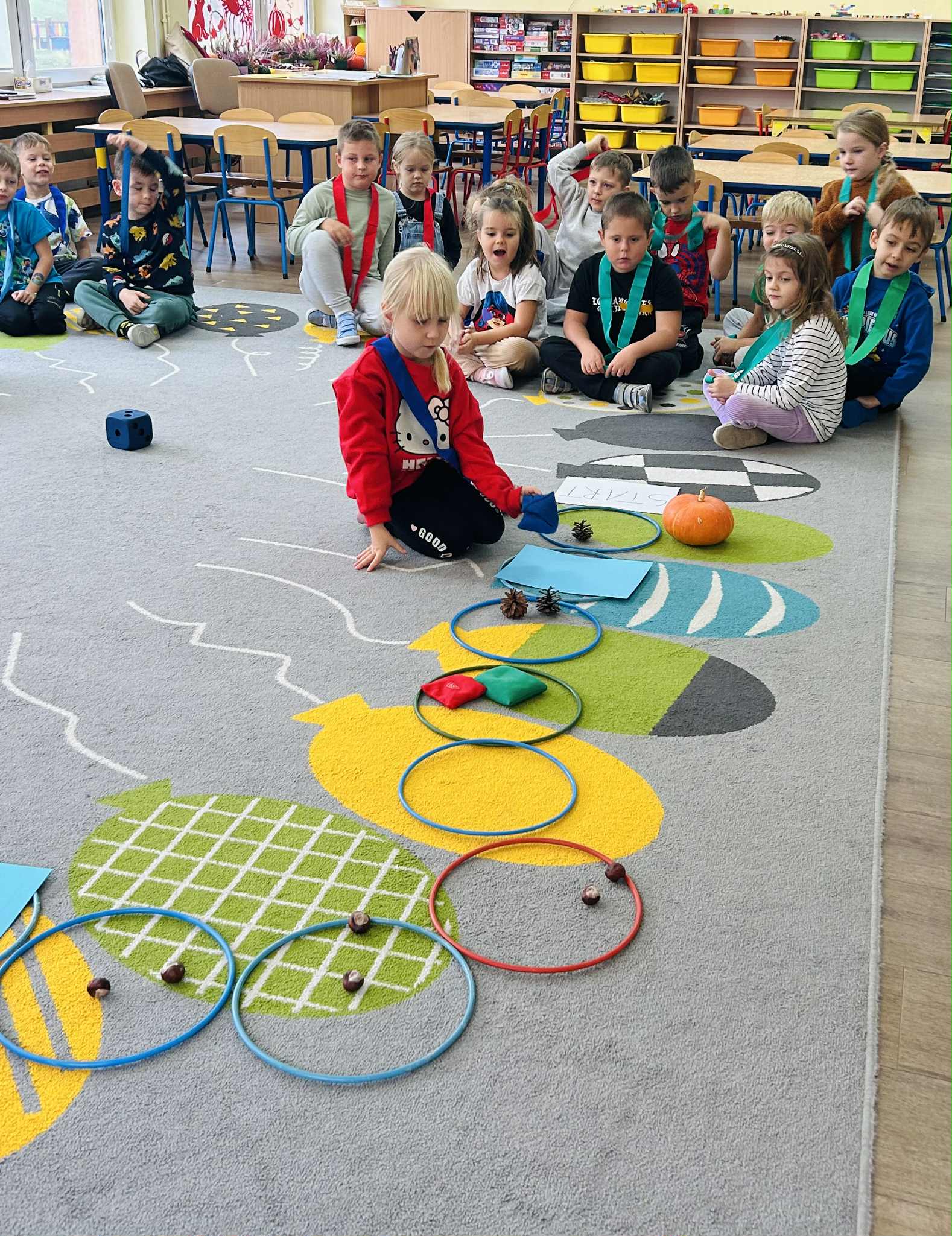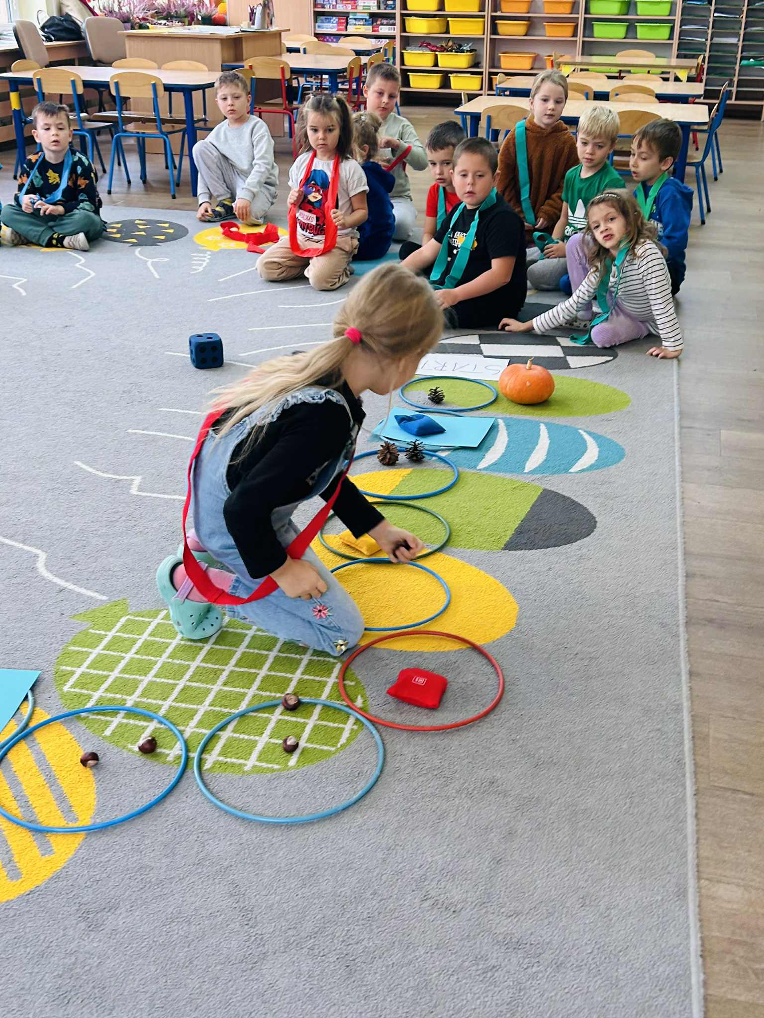 Podczas ostatnich zajęć dzieci wzięły udział w grze planszowej, w której – podzielone na drużyny – pokonywały kolejne pola, zbierając jesienne dary lub… wpadając w „kałużę” i czekając na swoją kolej. Nie zabrakło również zabaw ruchowych inspirowanych jesienną aurą – wiatrem, deszczem i tańczącymi liśćmi.