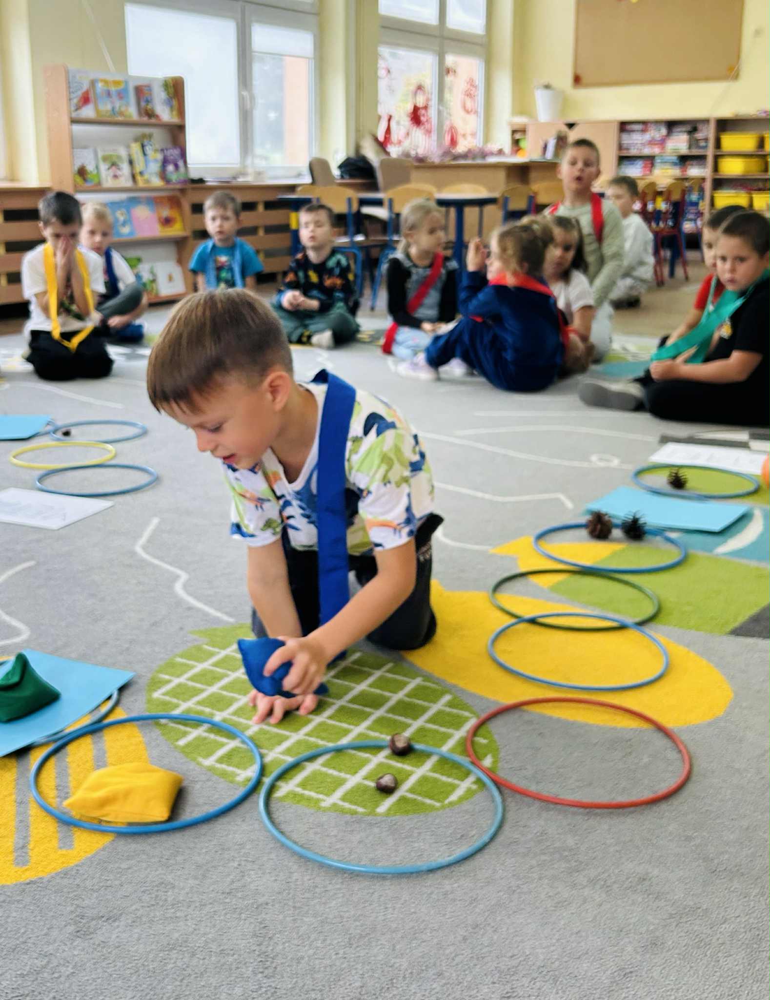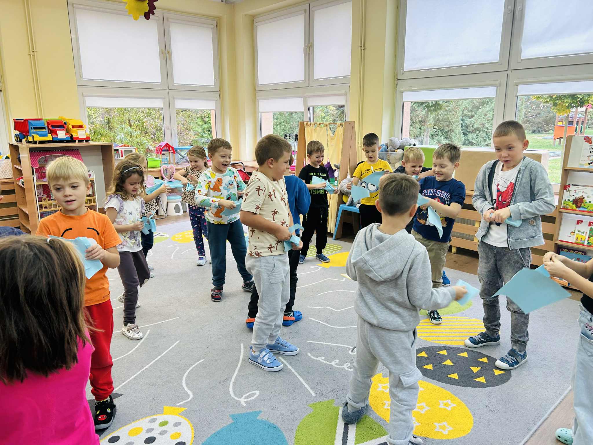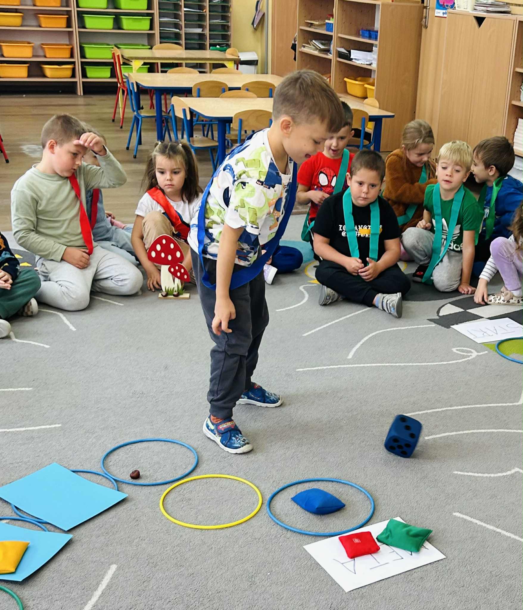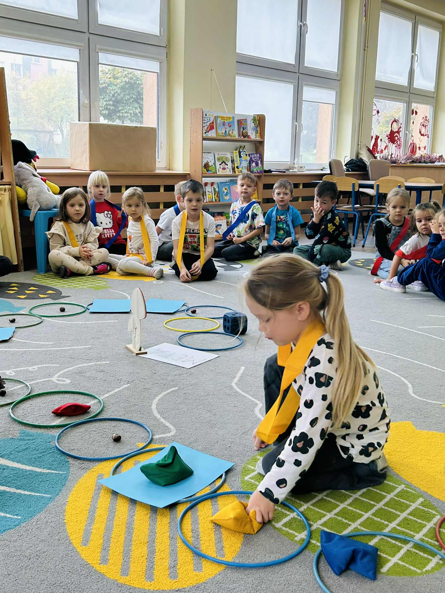 Podczas ostatnich zajęć dzieci wzięły udział w grze planszowej, w której – podzielone na drużyny – pokonywały kolejne pola, zbierając jesienne dary lub… wpadając w „kałużę” i czekając na swoją kolej. Nie zabrakło również zabaw ruchowych inspirowanych jesienną aurą – wiatrem, deszczem i tańczącymi liśćmi.