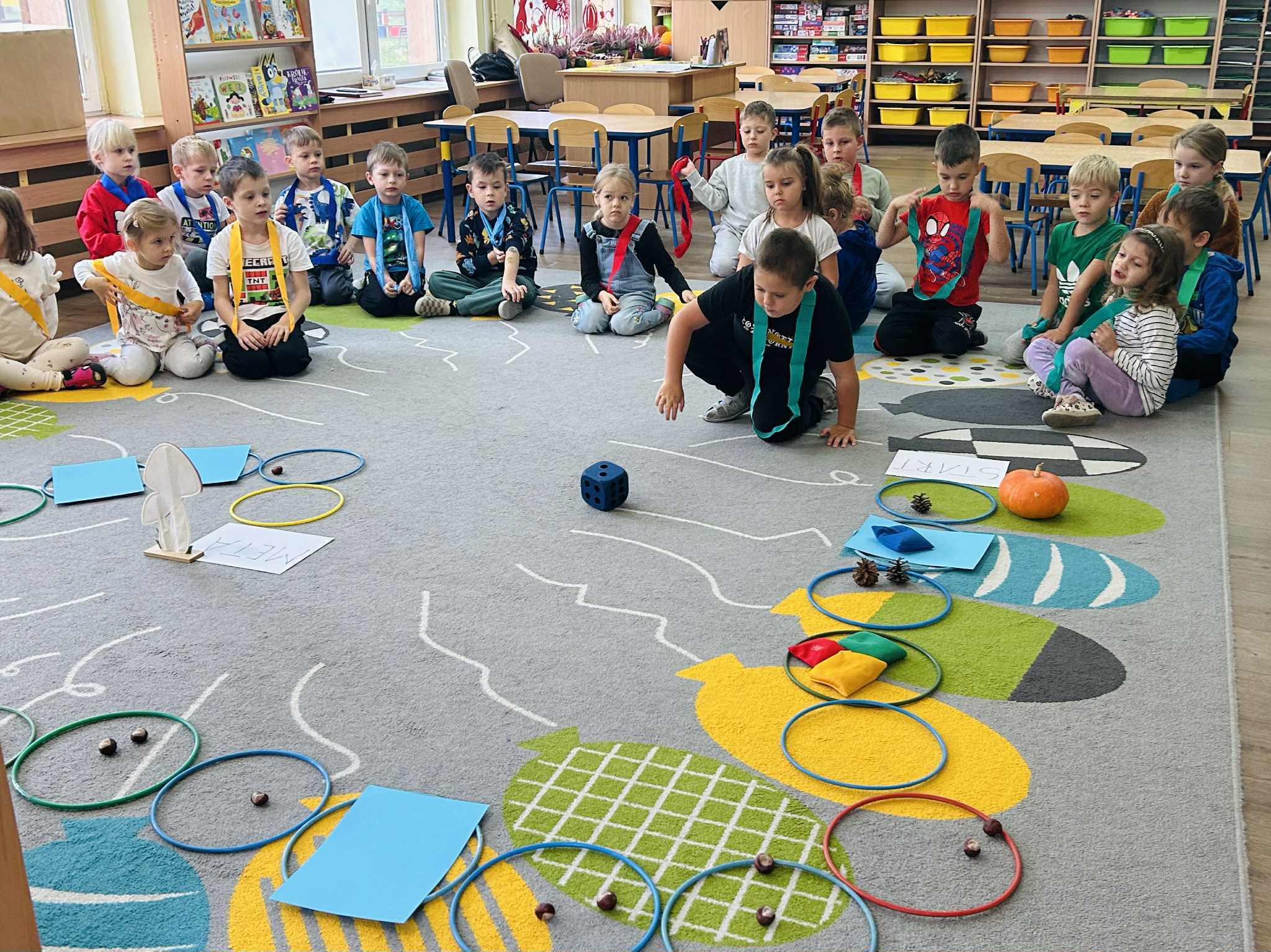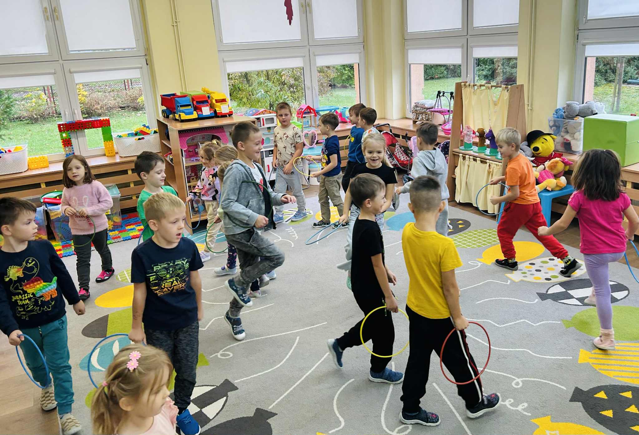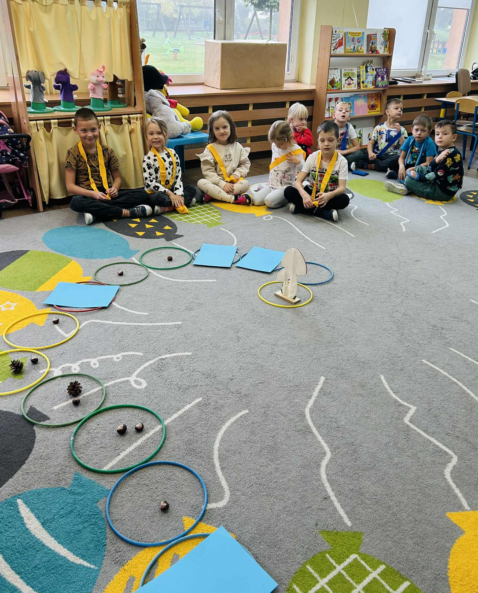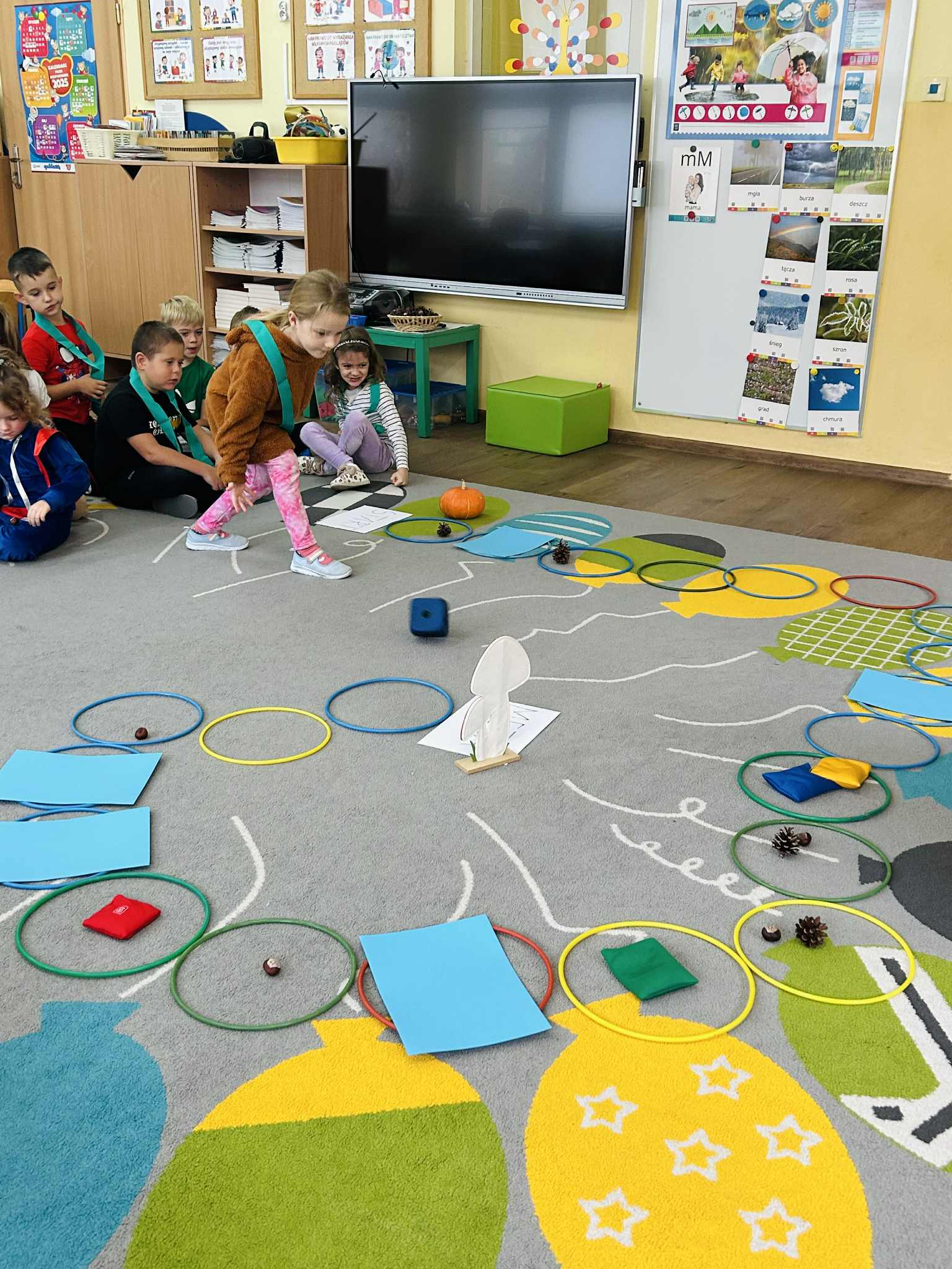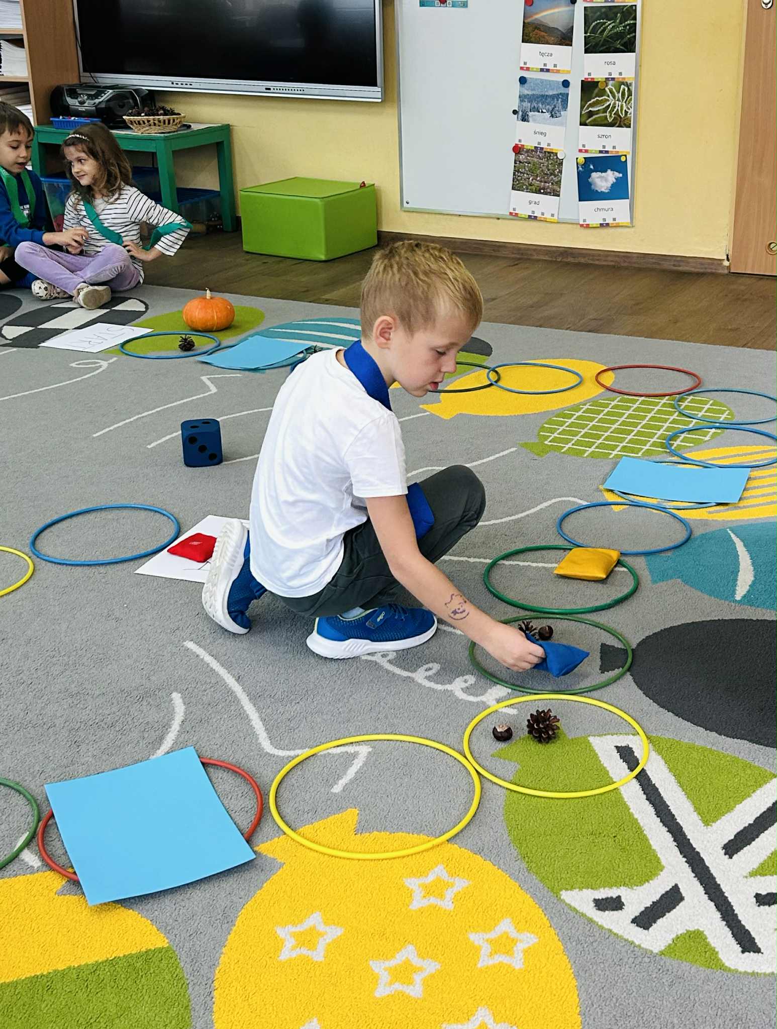 Podczas ostatnich zajęć dzieci wzięły udział w grze planszowej, w której – podzielone na drużyny – pokonywały kolejne pola, zbierając jesienne dary lub… wpadając w „kałużę” i czekając na swoją kolej. Nie zabrakło również zabaw ruchowych inspirowanych jesienną aurą – wiatrem, deszczem i tańczącymi liśćmi.