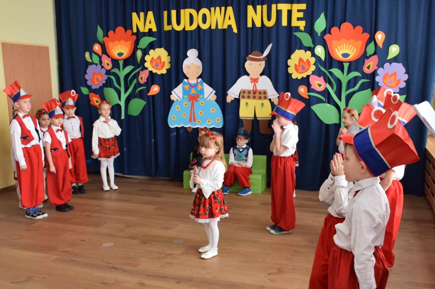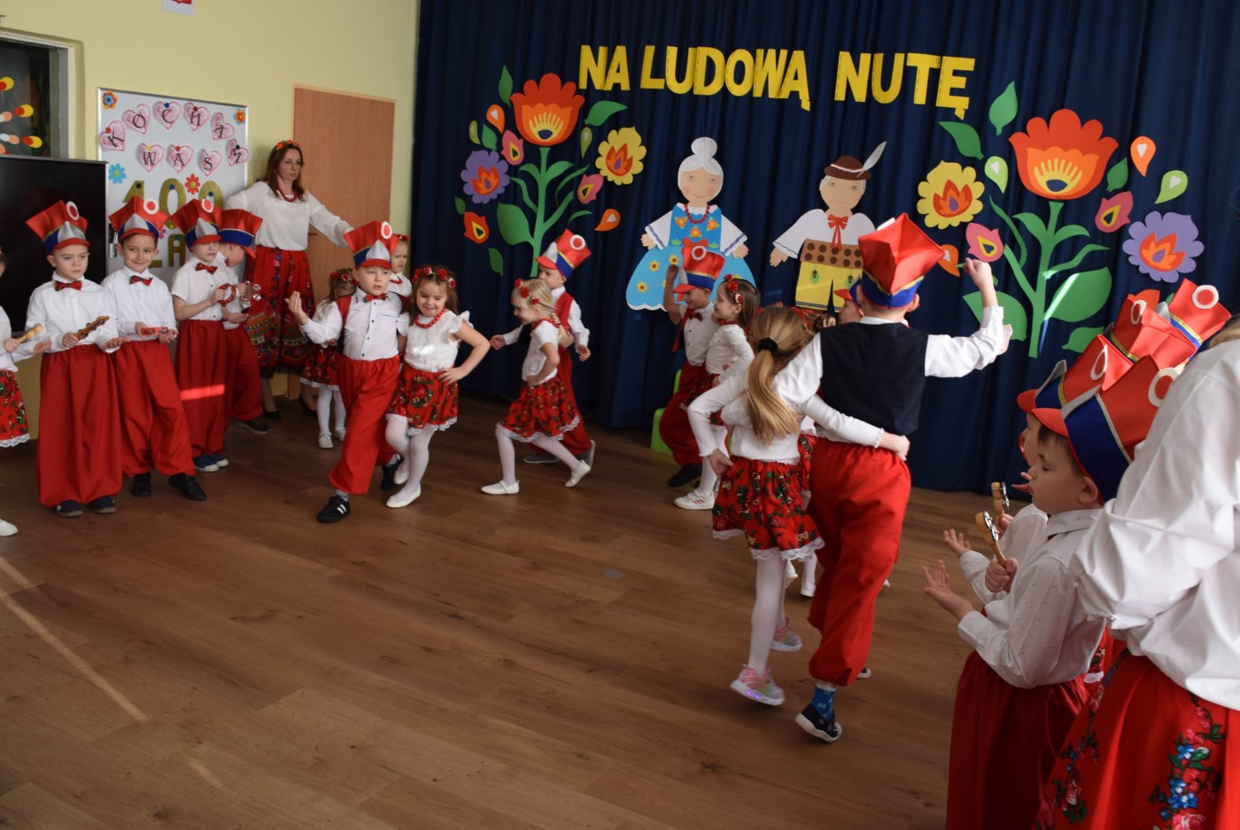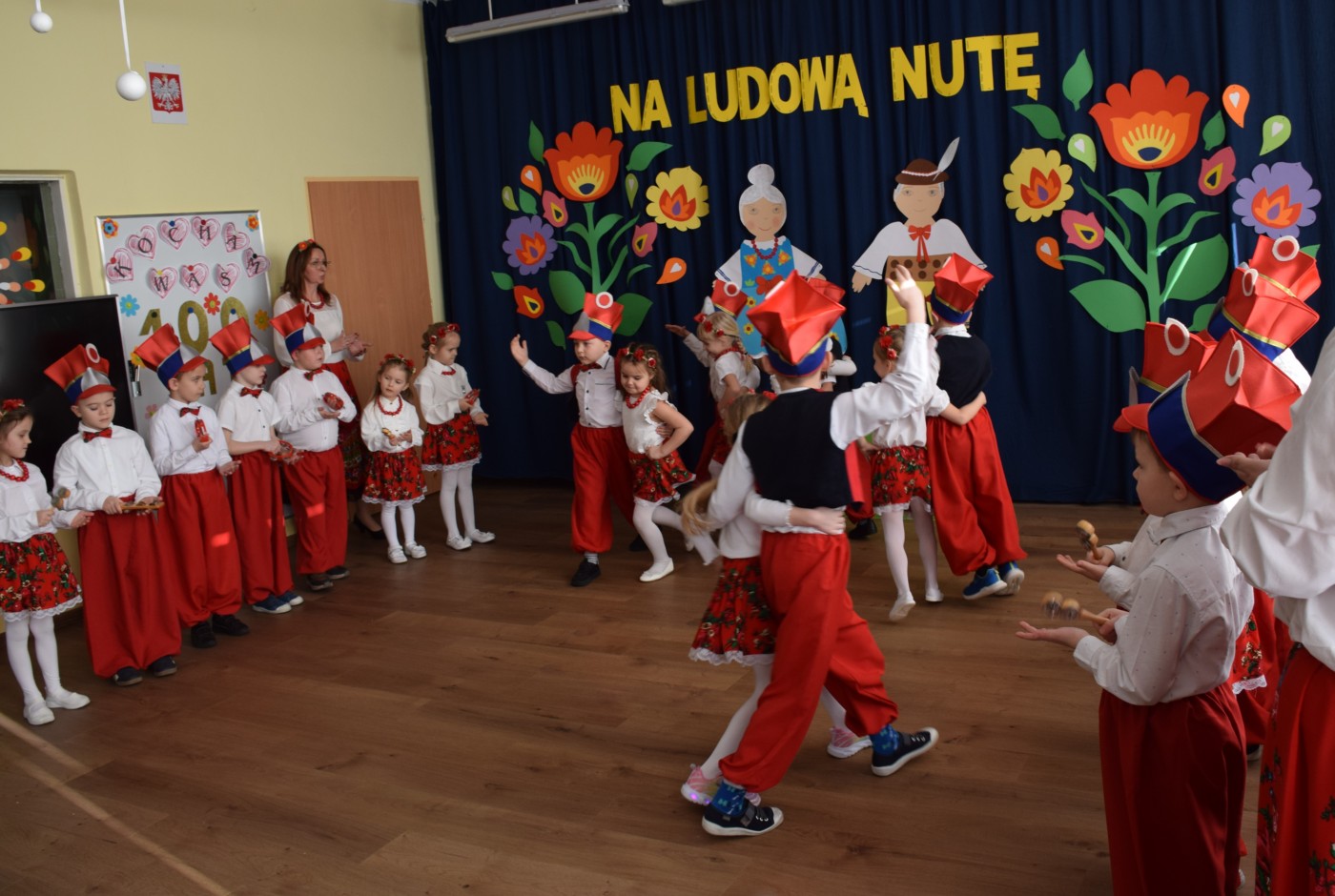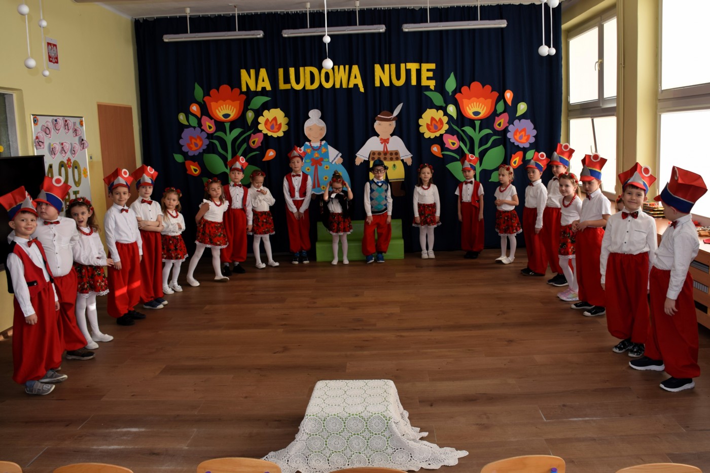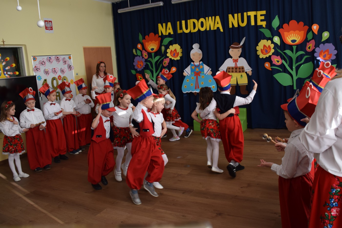 Przedszkolaki zaprezentowały piękny występ artystyczny w klimacie ludowym pt. „Na ludową nutę”. Pani Dyrektor, panie nauczycielki oraz dzieci wystąpiły w barwnych, tradycyjnych strojach – dziewczynki w białych bluzkach i kwiecistych spódnicach, chłopcy w białych koszulach, czerwonych spodniach i kamizelkach. Mali artyści recytowali wiersze, śpiewali piosenki, tańczyli tańce ludowe oraz grali na instrumentach, wzruszając i zachwycając zgromadzonych gości.