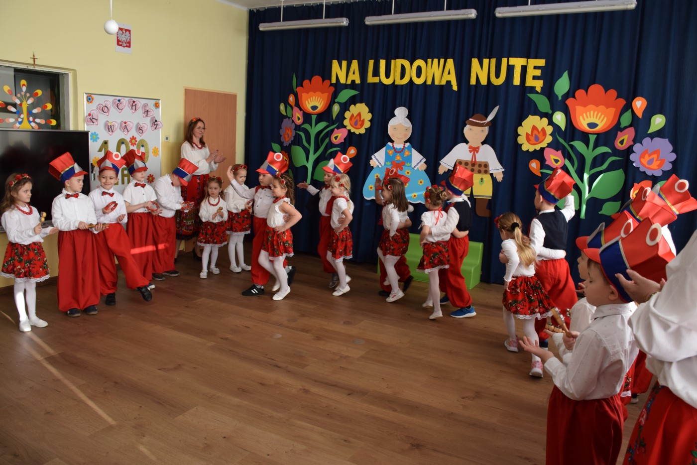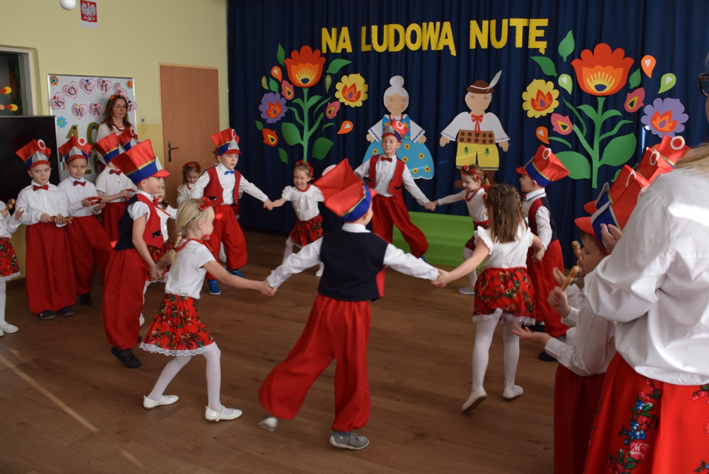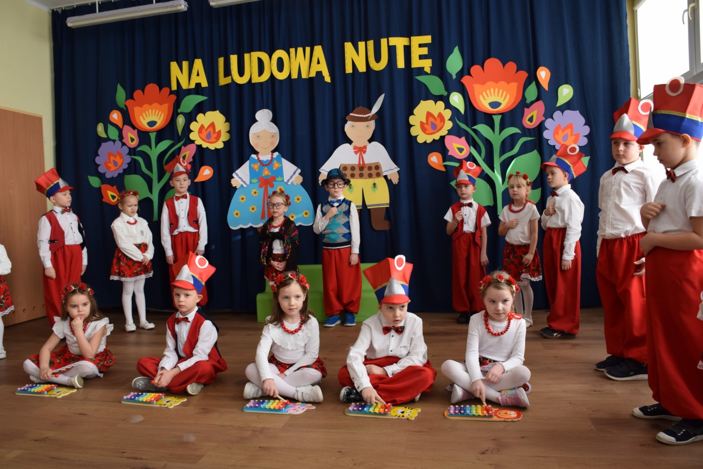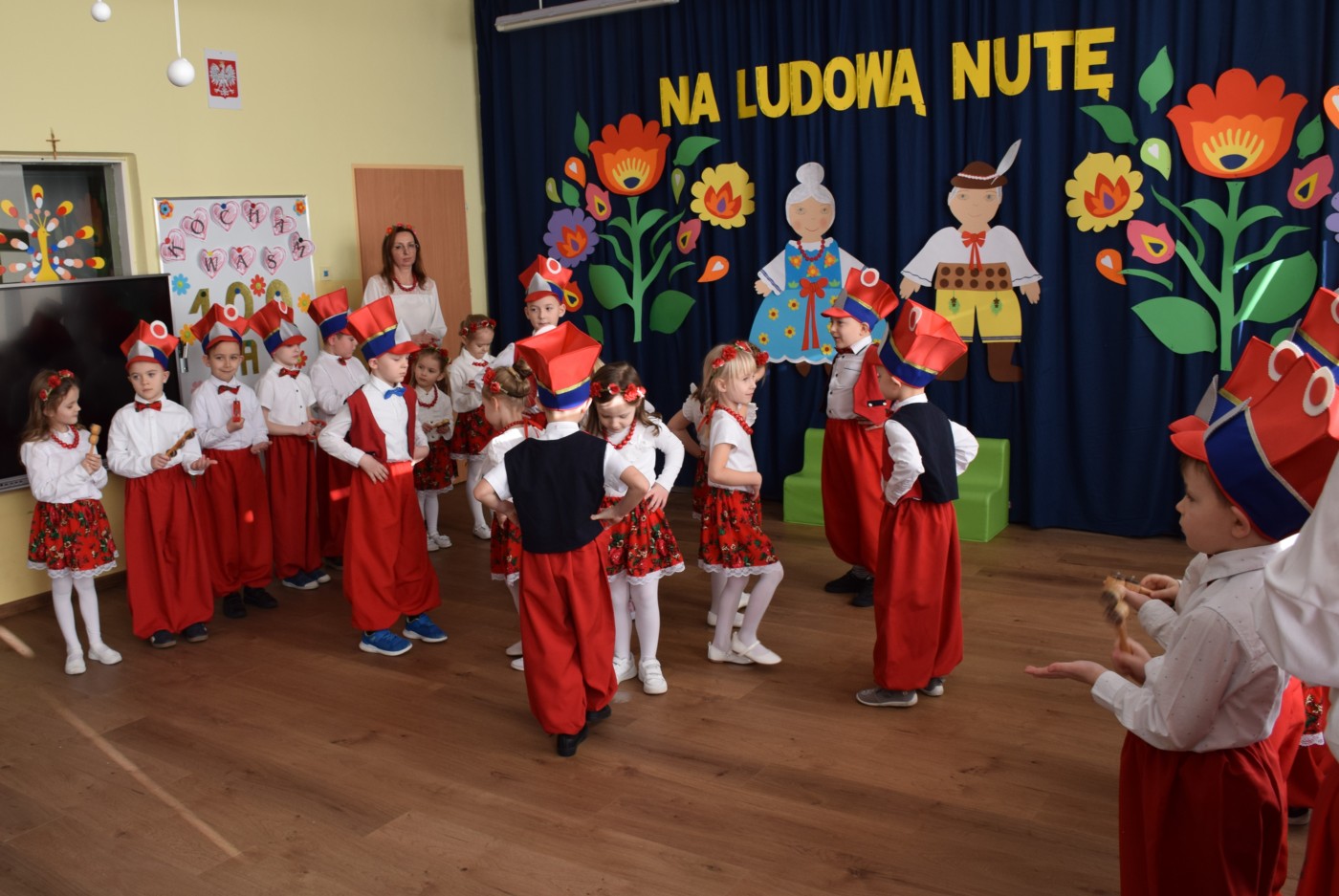 Przedszkolaki zaprezentowały piękny występ artystyczny w klimacie ludowym pt. „Na ludową nutę”. Pani Dyrektor, panie nauczycielki oraz dzieci wystąpiły w barwnych, tradycyjnych strojach – dziewczynki w białych bluzkach i kwiecistych spódnicach, chłopcy w białych koszulach, czerwonych spodniach i kamizelkach. Mali artyści recytowali wiersze, śpiewali piosenki, tańczyli tańce ludowe oraz grali na instrumentach, wzruszając i zachwycając zgromadzonych gości.