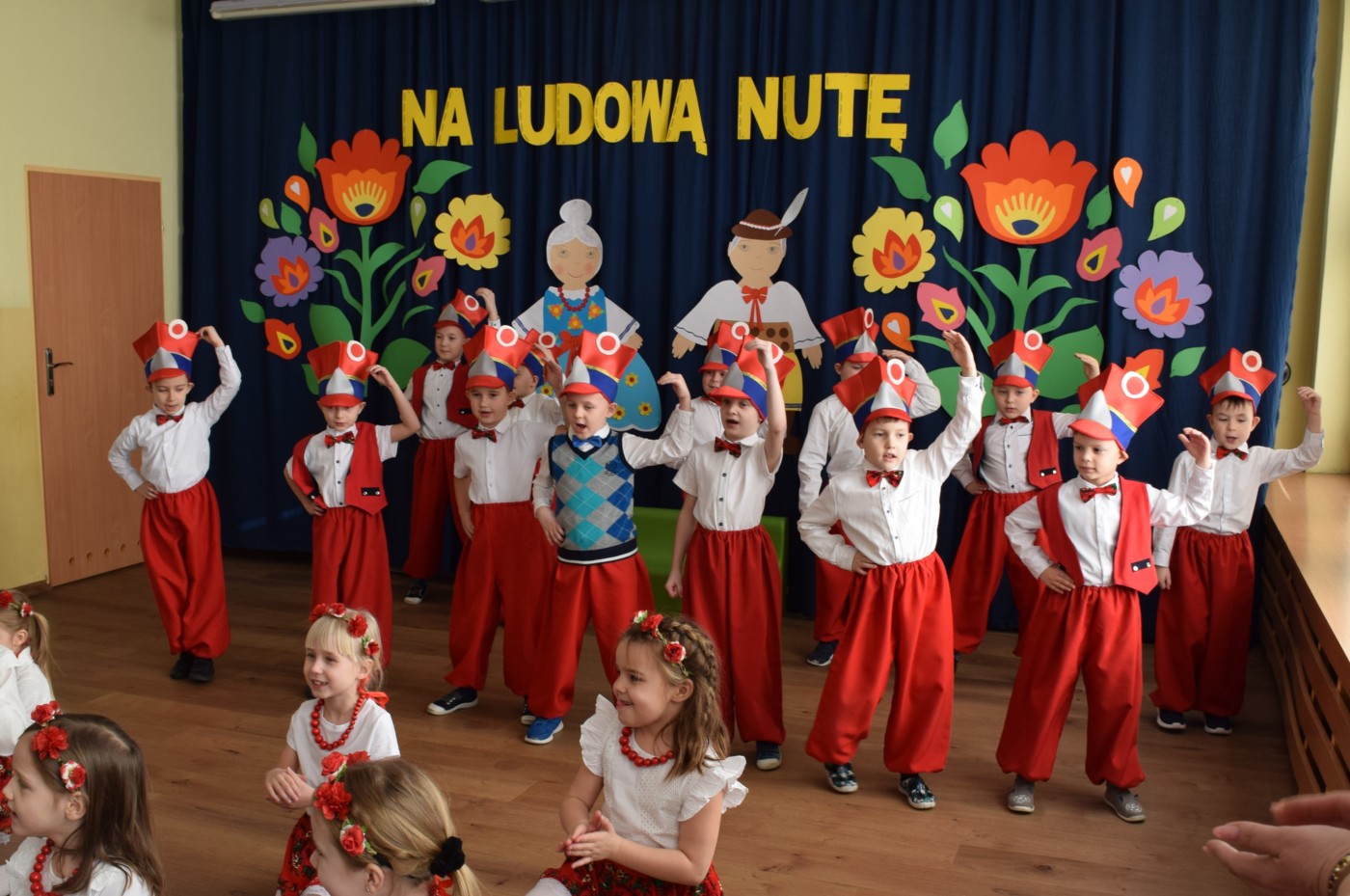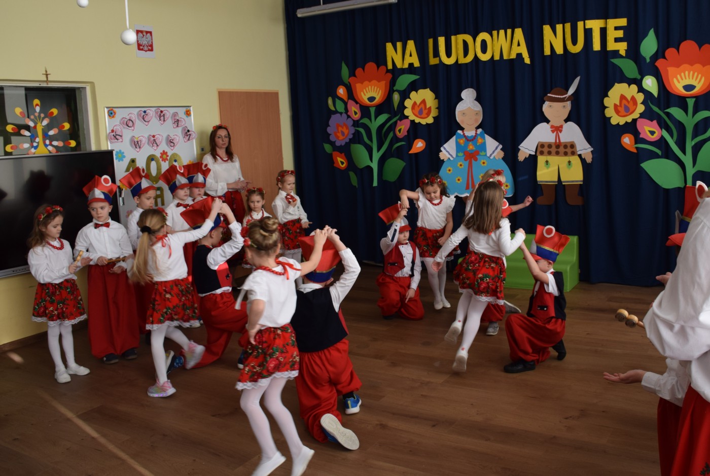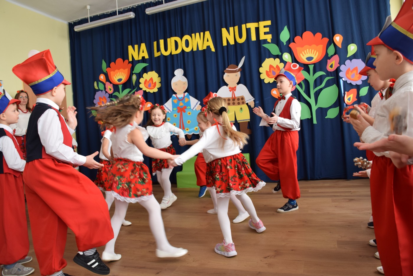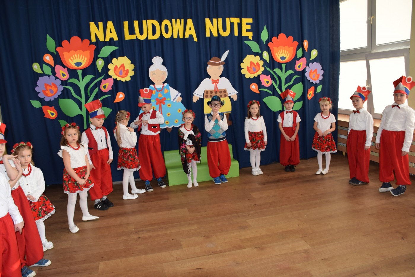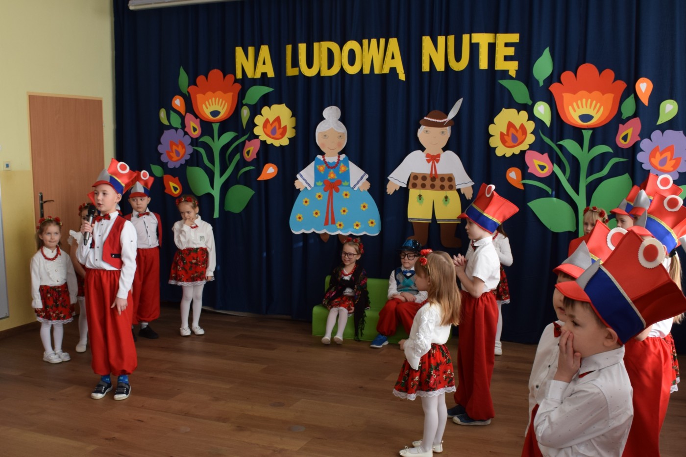 Przedszkolaki zaprezentowały piękny występ artystyczny w klimacie ludowym pt. „Na ludową nutę”. Pani Dyrektor, panie nauczycielki oraz dzieci wystąpiły w barwnych, tradycyjnych strojach – dziewczynki w białych bluzkach i kwiecistych spódnicach, chłopcy w białych koszulach, czerwonych spodniach i kamizelkach. Mali artyści recytowali wiersze, śpiewali piosenki, tańczyli tańce ludowe oraz grali na instrumentach, wzruszając i zachwycając zgromadzonych gości.