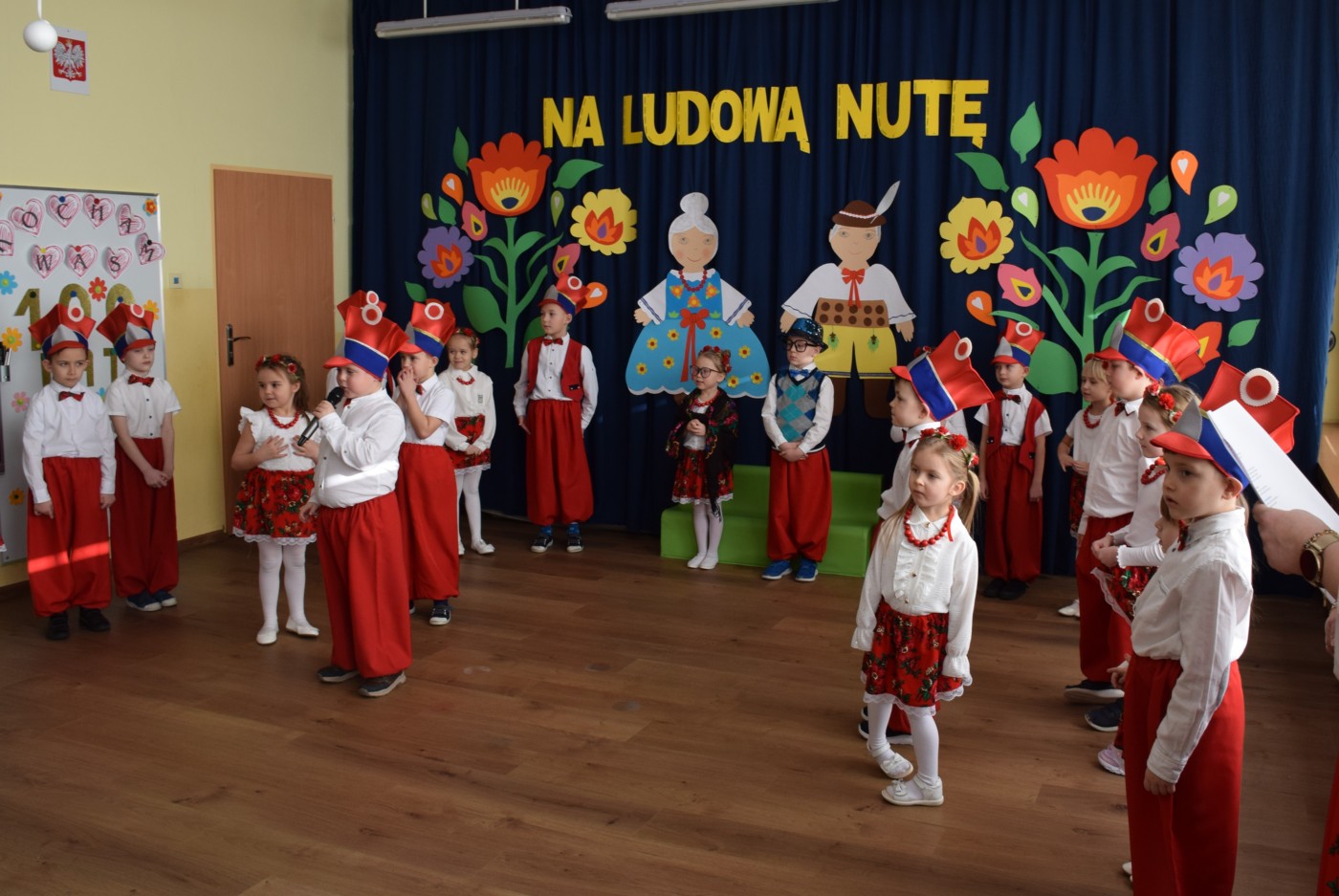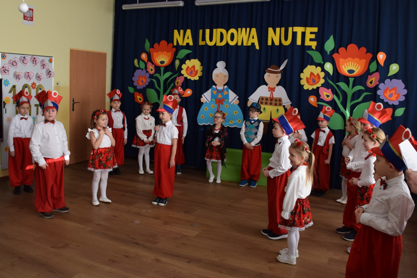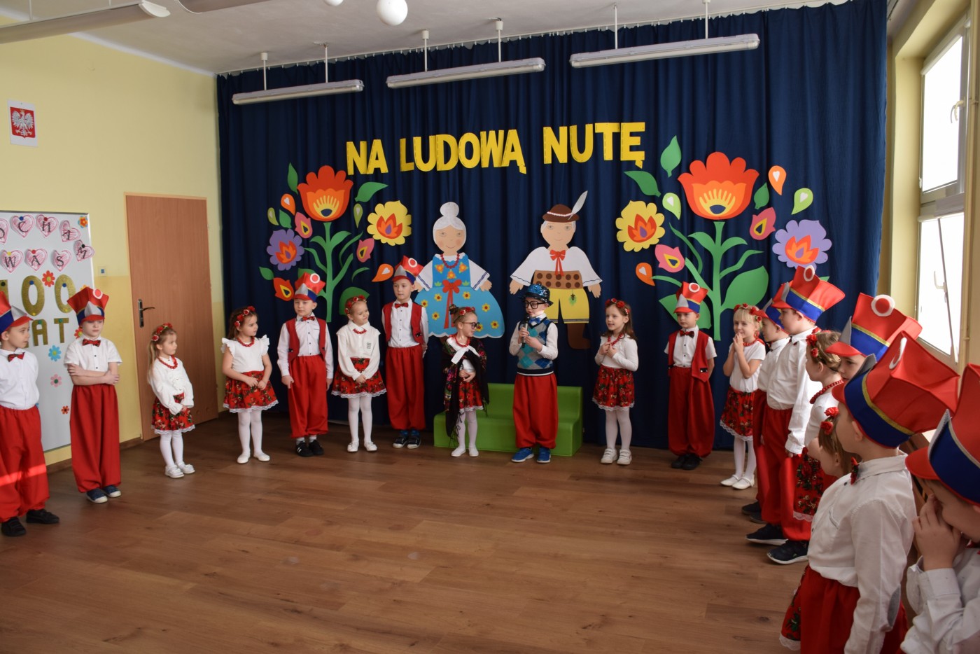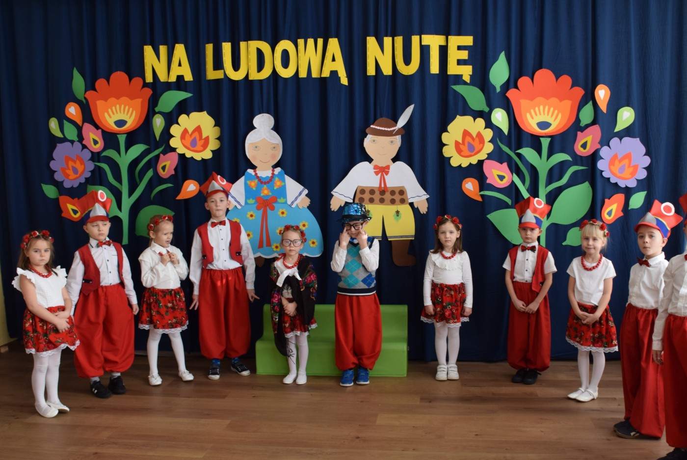 Przedszkolaki zaprezentowały piękny występ artystyczny w klimacie ludowym pt. „Na ludową nutę”. Pani Dyrektor, panie nauczycielki oraz dzieci wystąpiły w barwnych, tradycyjnych strojach – dziewczynki w białych bluzkach i kwiecistych spódnicach, chłopcy w białych koszulach, czerwonych spodniach i kamizelkach. Mali artyści recytowali wiersze, śpiewali piosenki, tańczyli tańce ludowe oraz grali na instrumentach, wzruszając i zachwycając zgromadzonych gości.