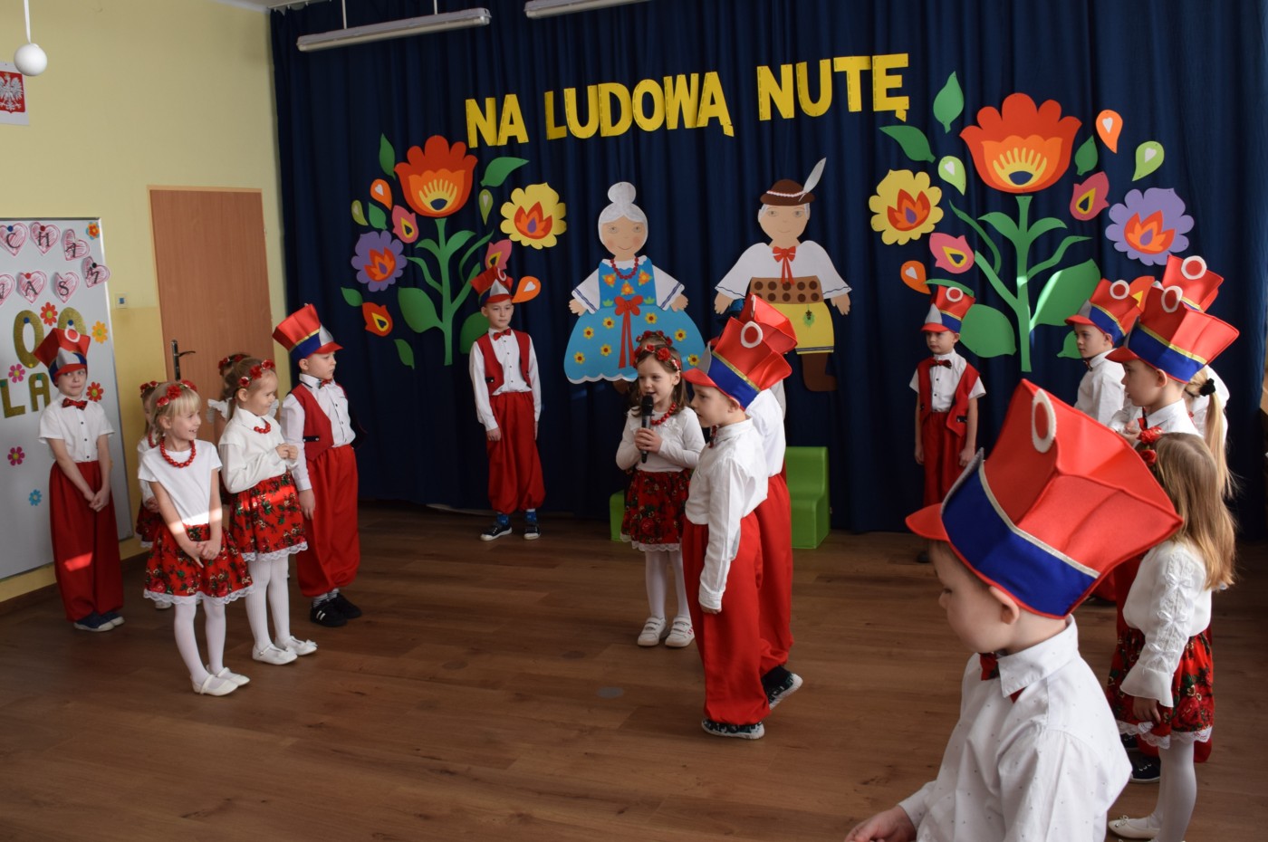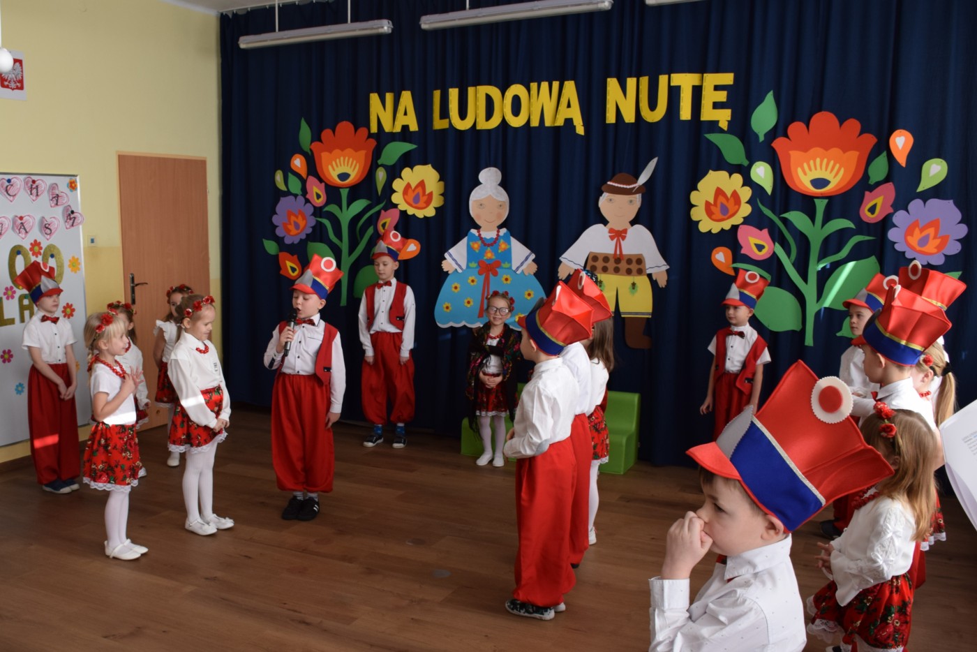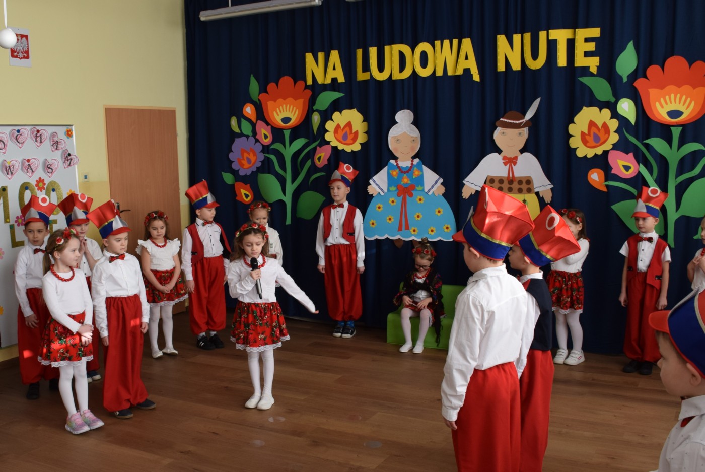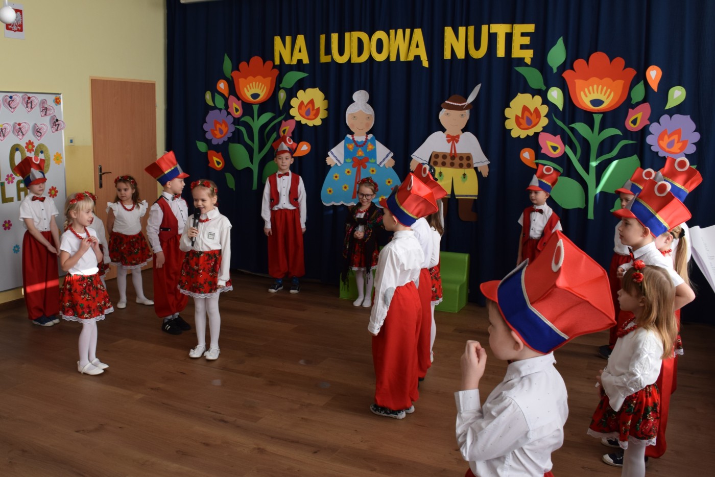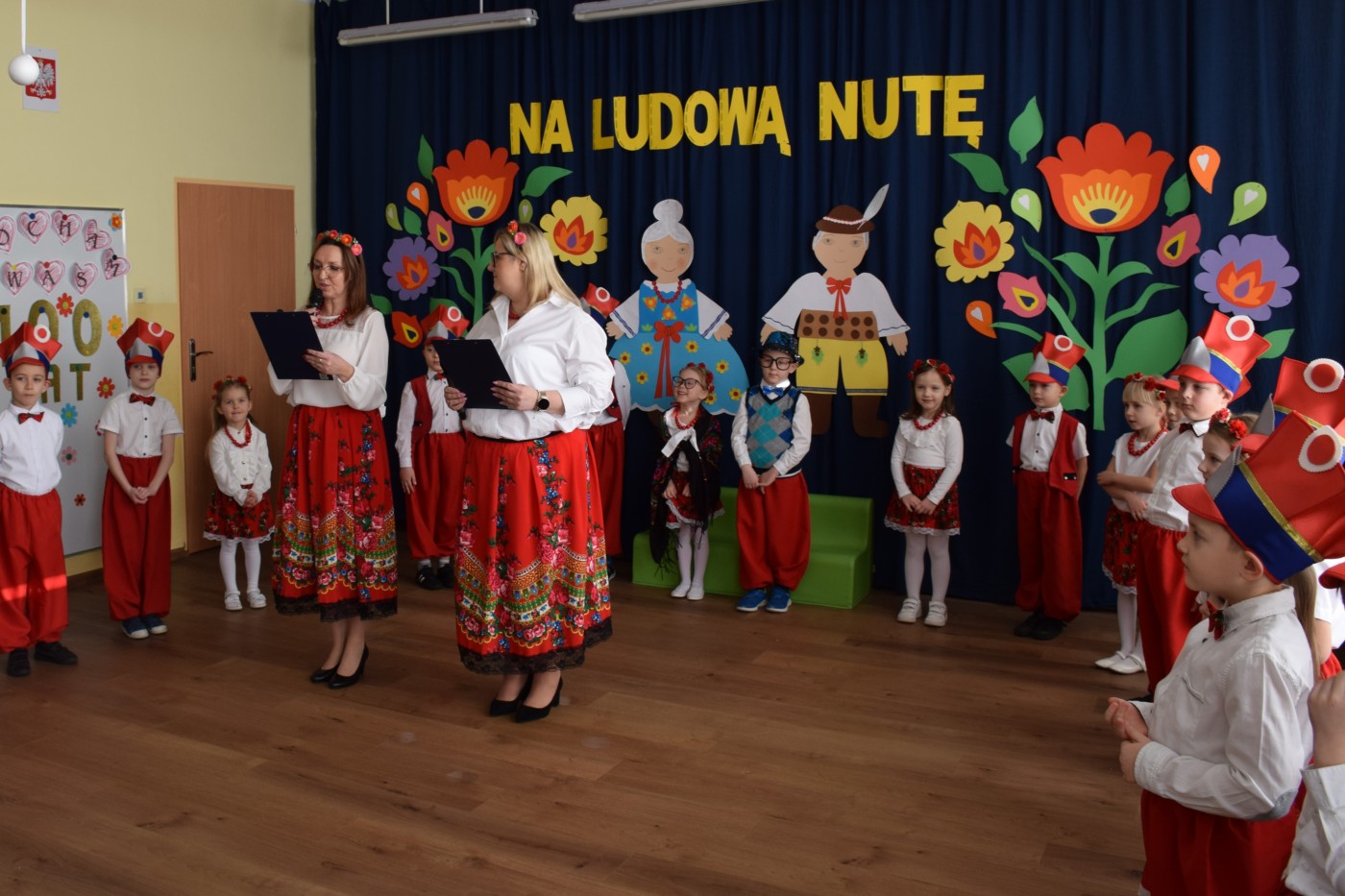 Przedszkolaki zaprezentowały piękny występ artystyczny w klimacie ludowym pt. „Na ludową nutę”. Pani Dyrektor, panie nauczycielki oraz dzieci wystąpiły w barwnych, tradycyjnych strojach – dziewczynki w białych bluzkach i kwiecistych spódnicach, chłopcy w białych koszulach, czerwonych spodniach i kamizelkach. Mali artyści recytowali wiersze, śpiewali piosenki, tańczyli tańce ludowe oraz grali na instrumentach, wzruszając i zachwycając zgromadzonych gości.