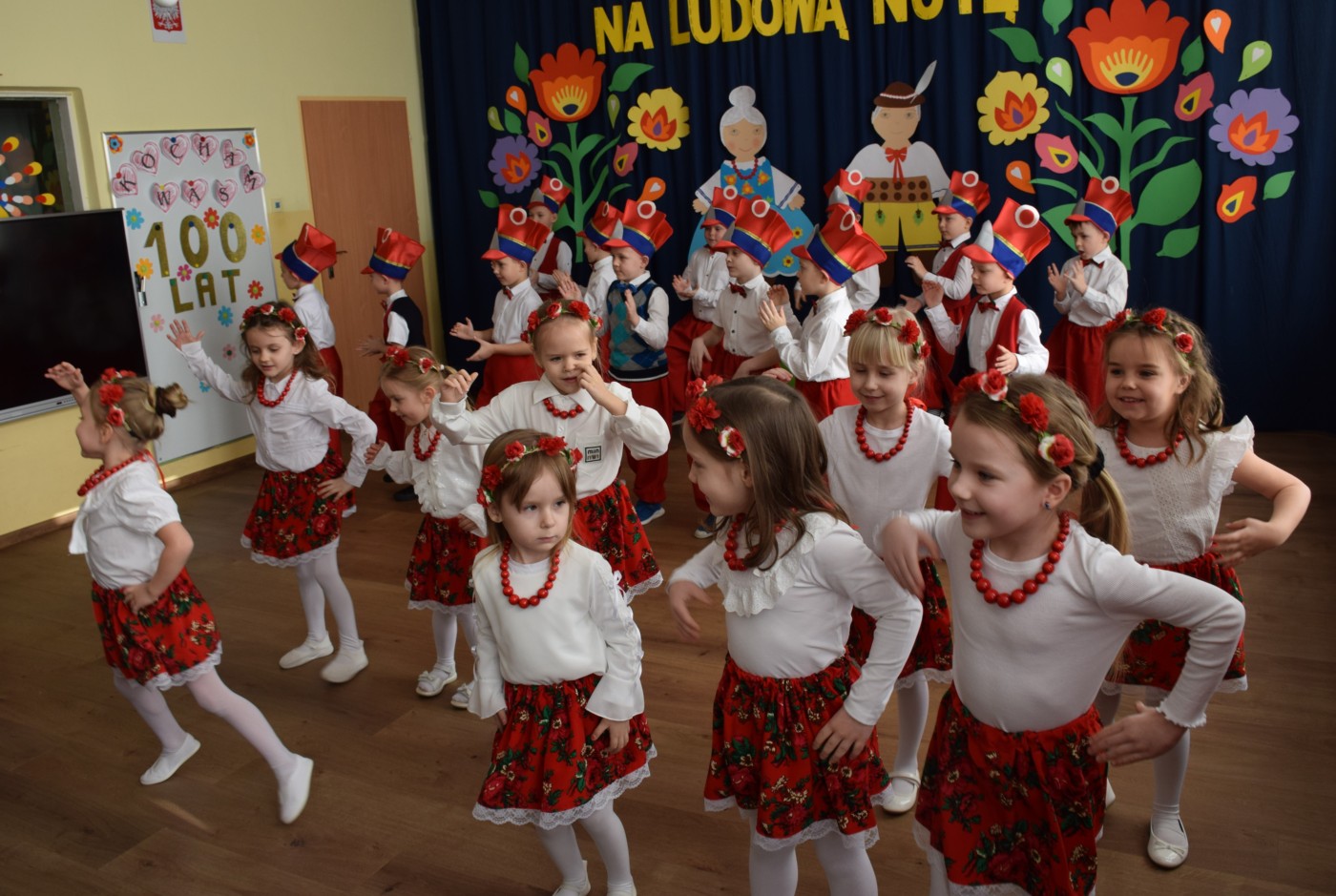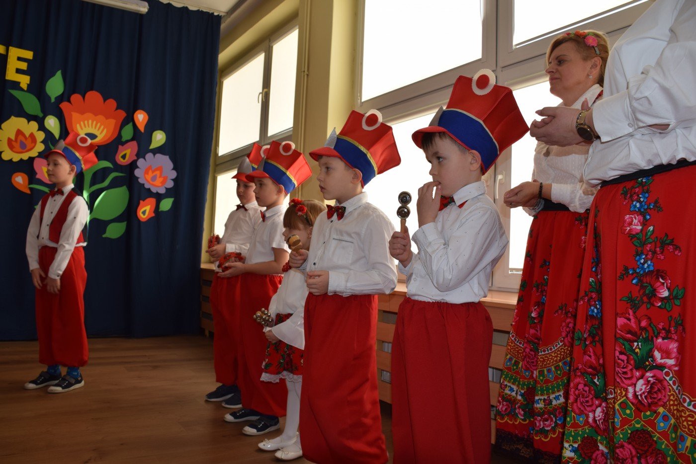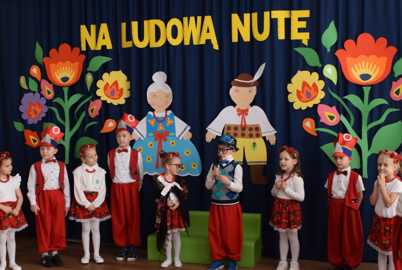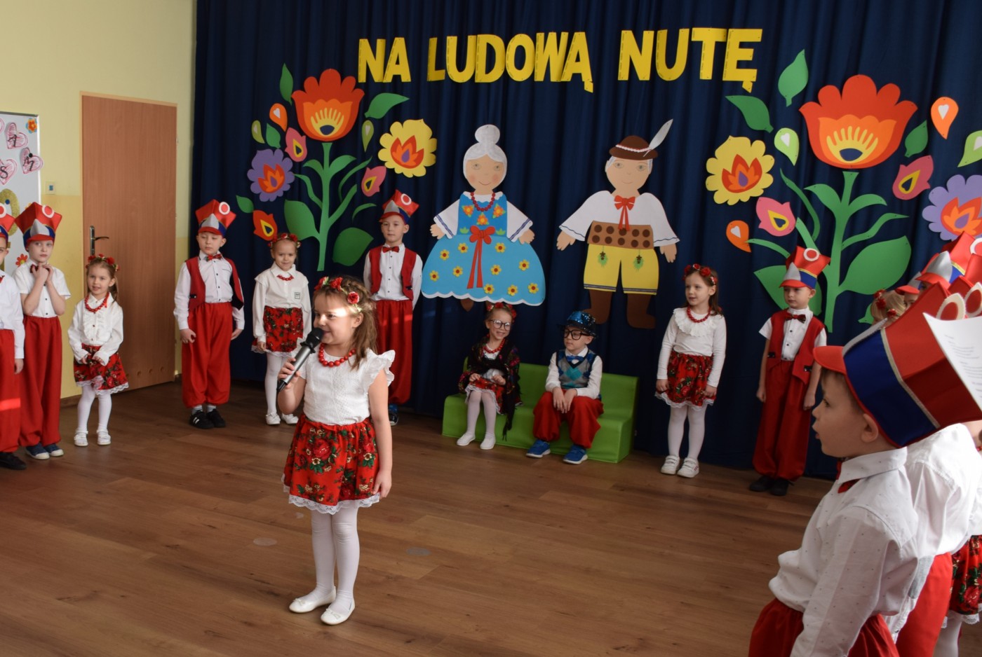 Przedszkolaki zaprezentowały piękny występ artystyczny w klimacie ludowym pt. „Na ludową nutę”. Pani Dyrektor, panie nauczycielki oraz dzieci wystąpiły w barwnych, tradycyjnych strojach – dziewczynki w białych bluzkach i kwiecistych spódnicach, chłopcy w białych koszulach, czerwonych spodniach i kamizelkach. Mali artyści recytowali wiersze, śpiewali piosenki, tańczyli tańce ludowe oraz grali na instrumentach, wzruszając i zachwycając zgromadzonych gości.