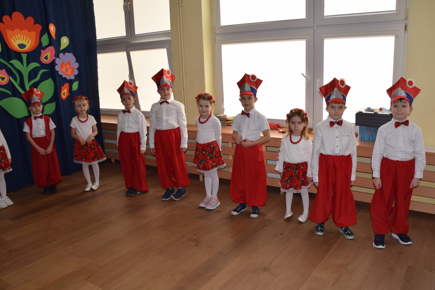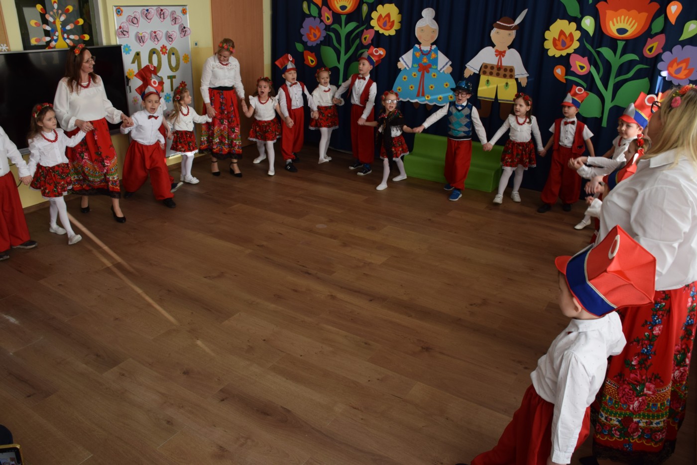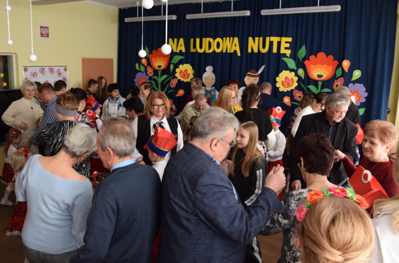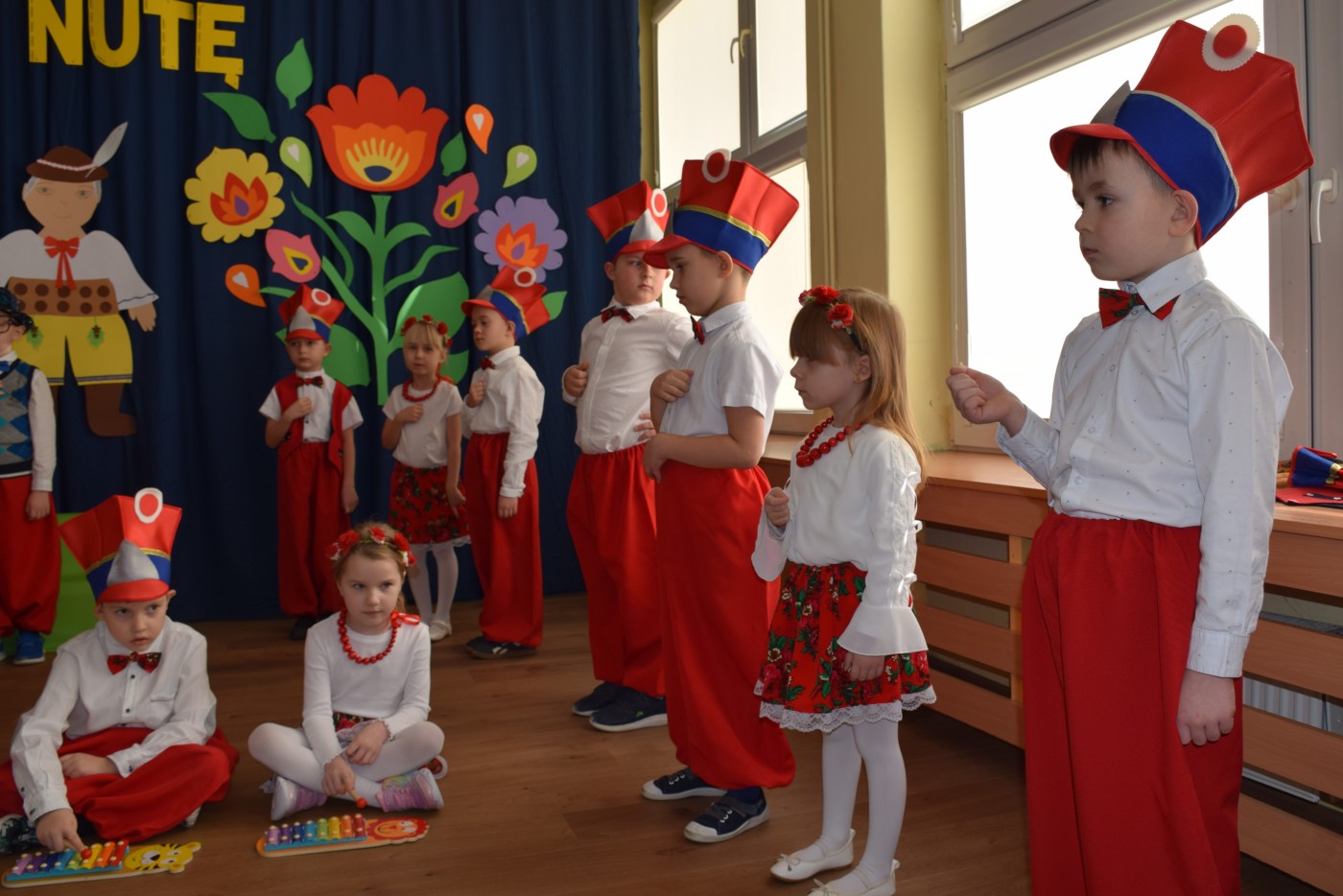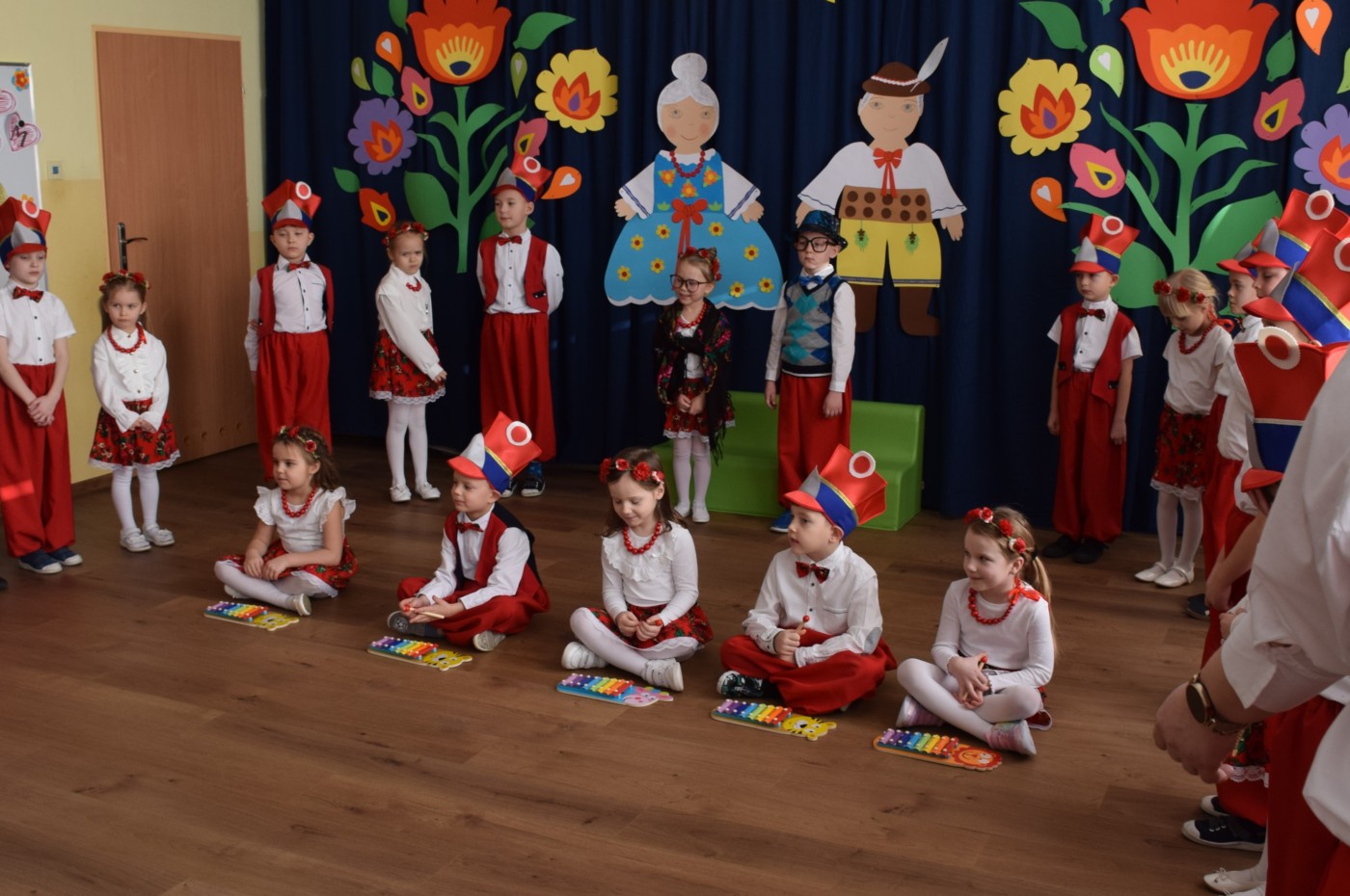 Przedszkolaki zaprezentowały piękny występ artystyczny w klimacie ludowym pt. „Na ludową nutę”. Pani Dyrektor, panie nauczycielki oraz dzieci wystąpiły w barwnych, tradycyjnych strojach – dziewczynki w białych bluzkach i kwiecistych spódnicach, chłopcy w białych koszulach, czerwonych spodniach i kamizelkach. Mali artyści recytowali wiersze, śpiewali piosenki, tańczyli tańce ludowe oraz grali na instrumentach, wzruszając i zachwycając zgromadzonych gości.