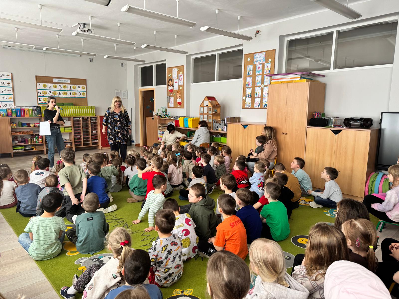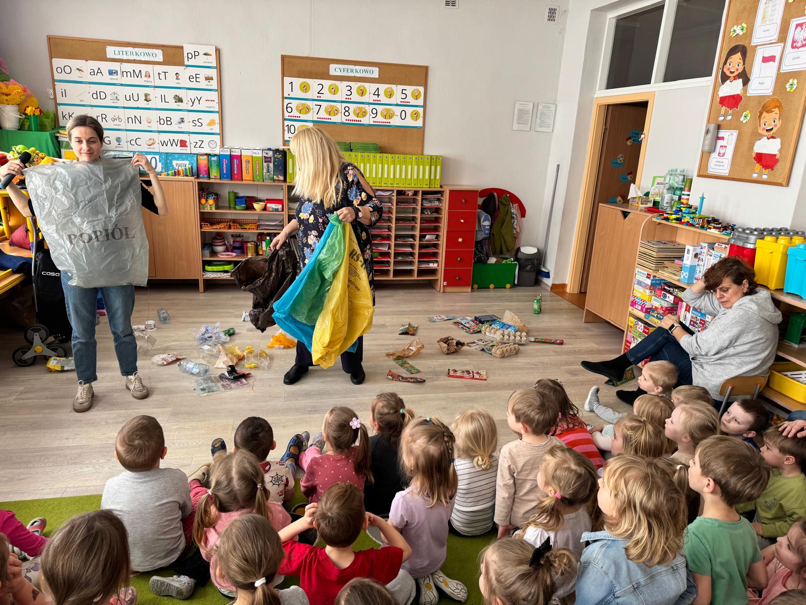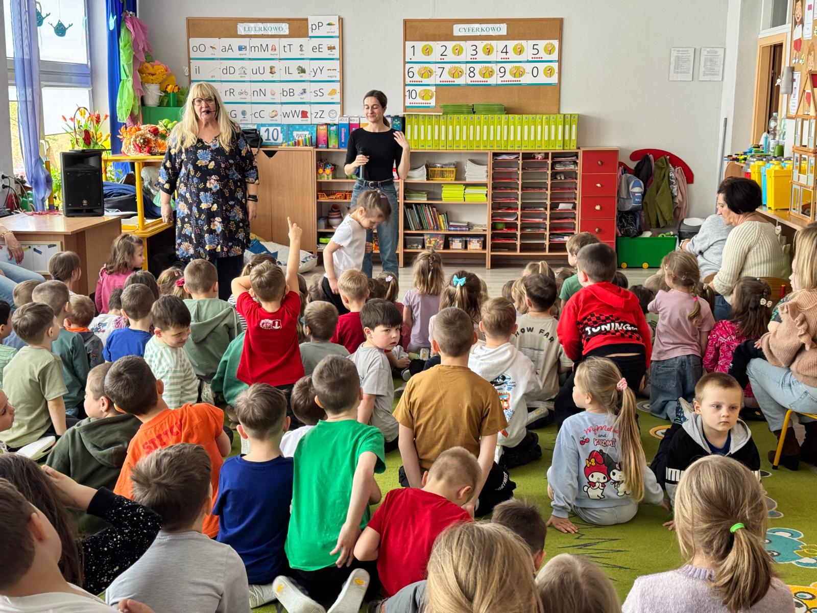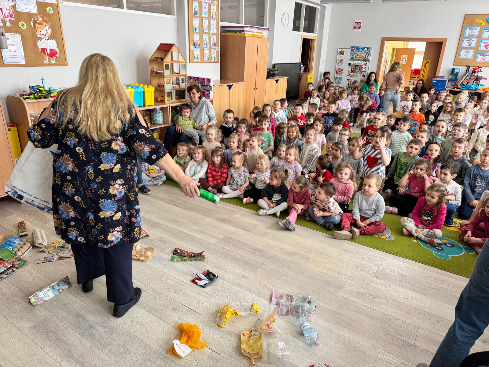 Podczas audycji muzycznej dzieci w ciekawy i angażujący sposób poznawały zasady zachowań ekologicznych. Poprzez piosenki i zabawy dowiedziały się, jak ważna jest segregacja śmieci oraz dbanie o środowisko na co dzień. Poruszono również temat zdrowego odżywiania i jego wpływu na nasze samopoczucie oraz planetę. W części praktycznej dzieci ustawiły się w „ekologiczne pociągi”, którymi wyruszyły na marsz dla Ziemi. Zajęcia dostarczyły wiele radości, a jednocześnie uwrażliwiły najmłodszych na potrzebę troski o środowisko naturalne.
