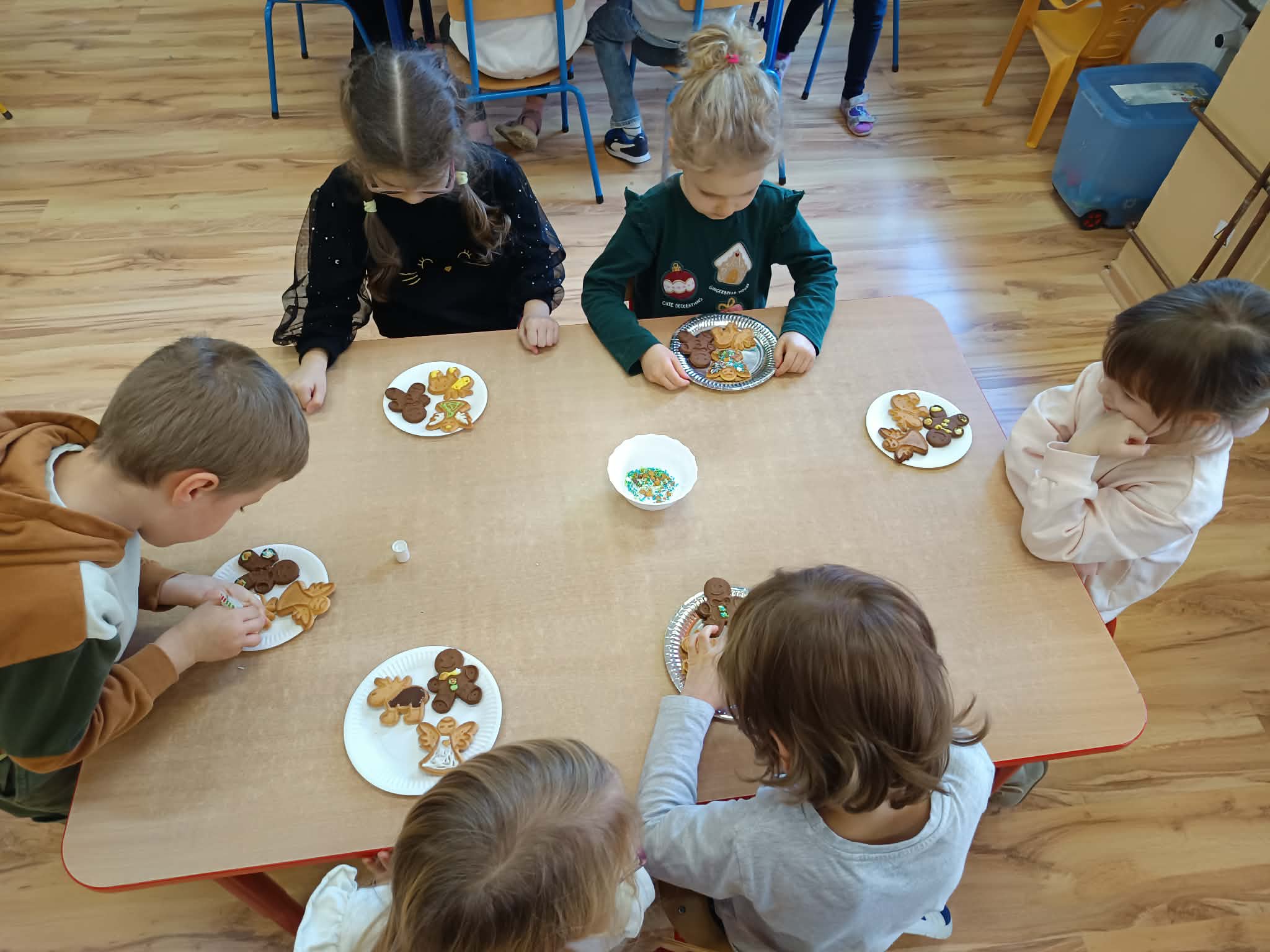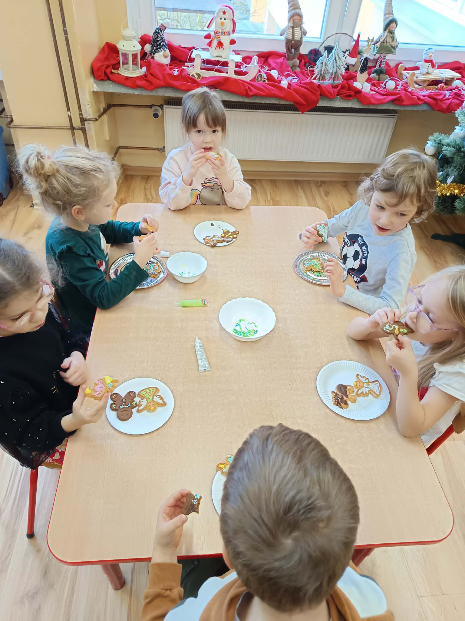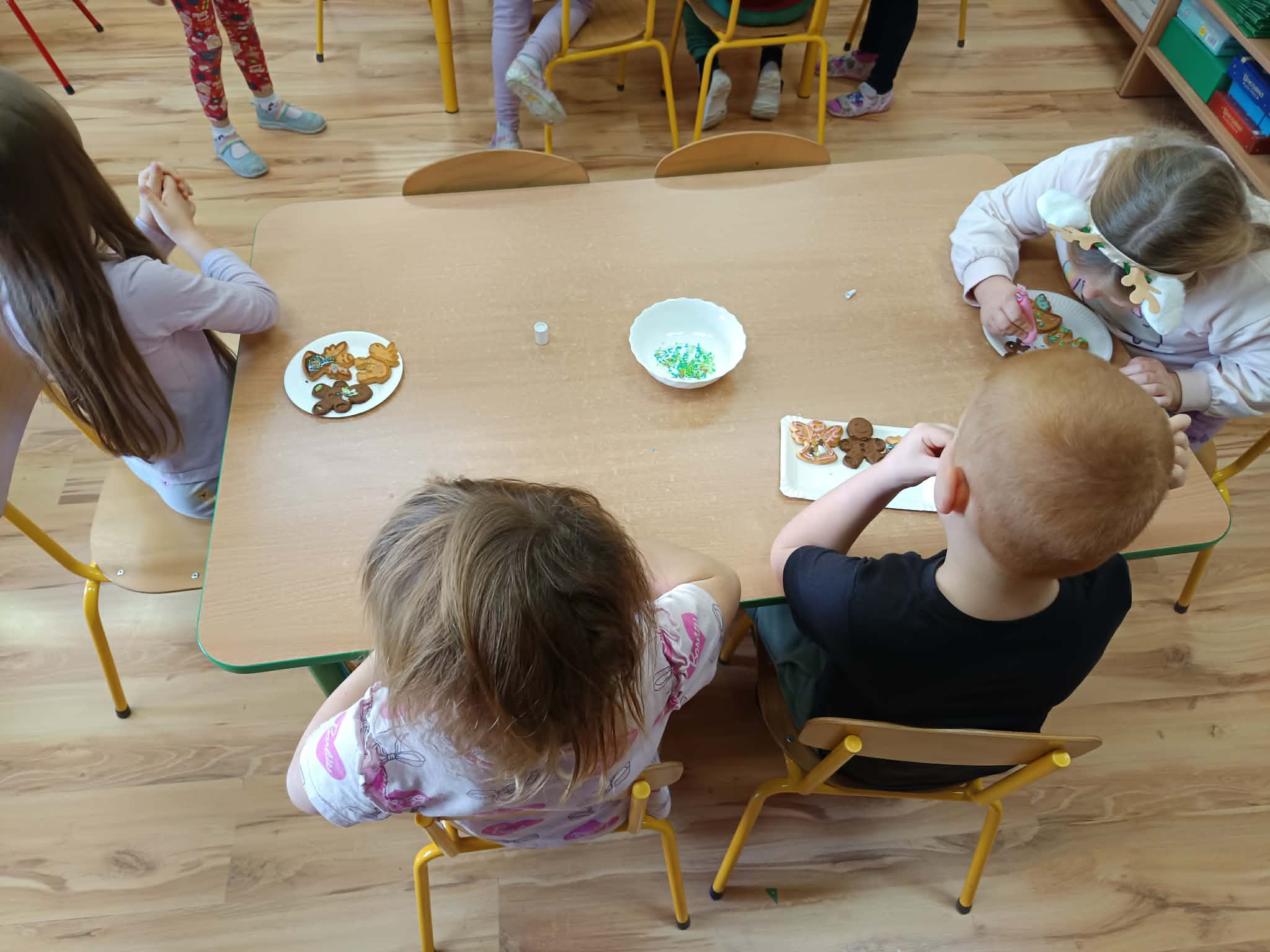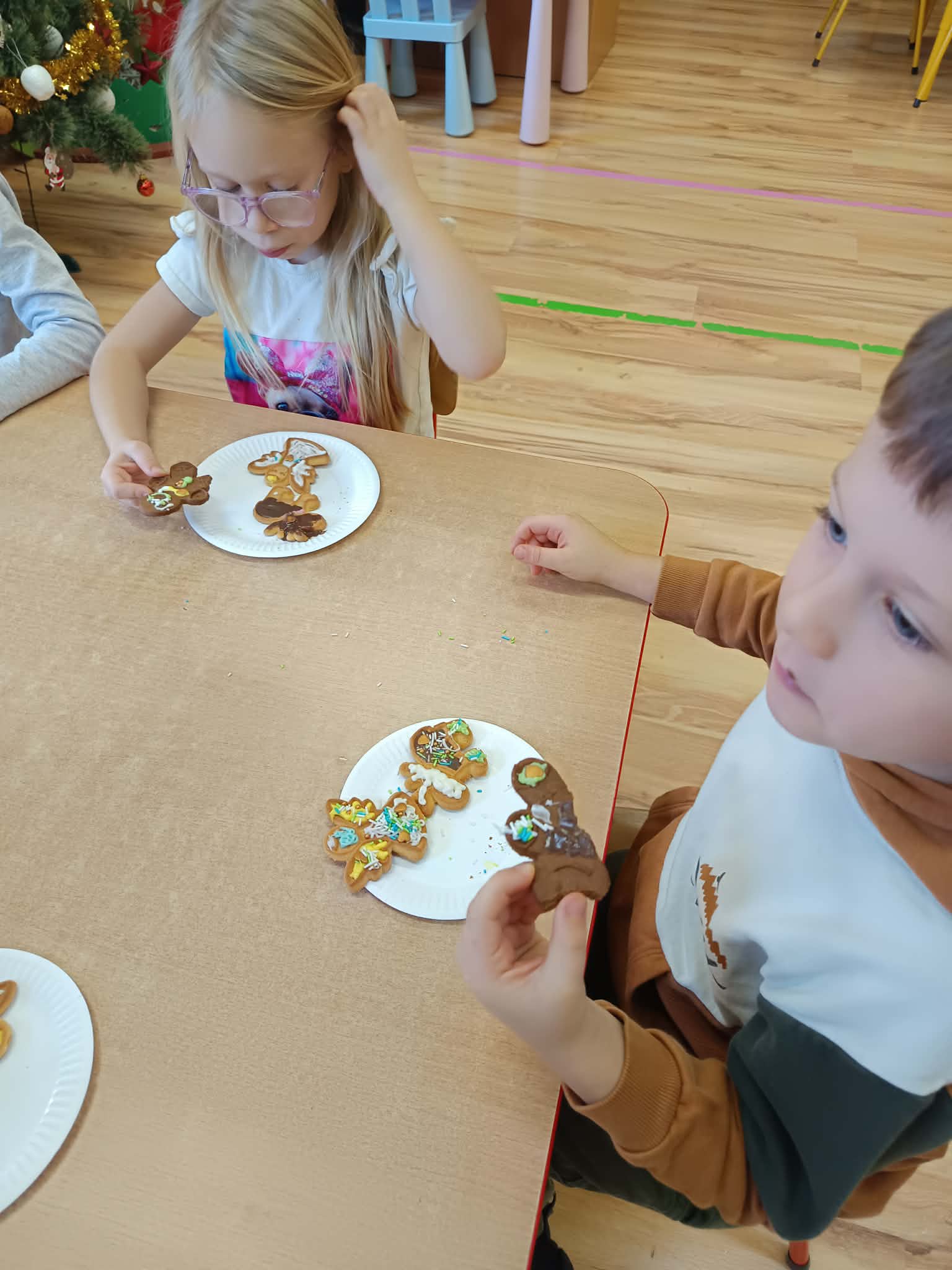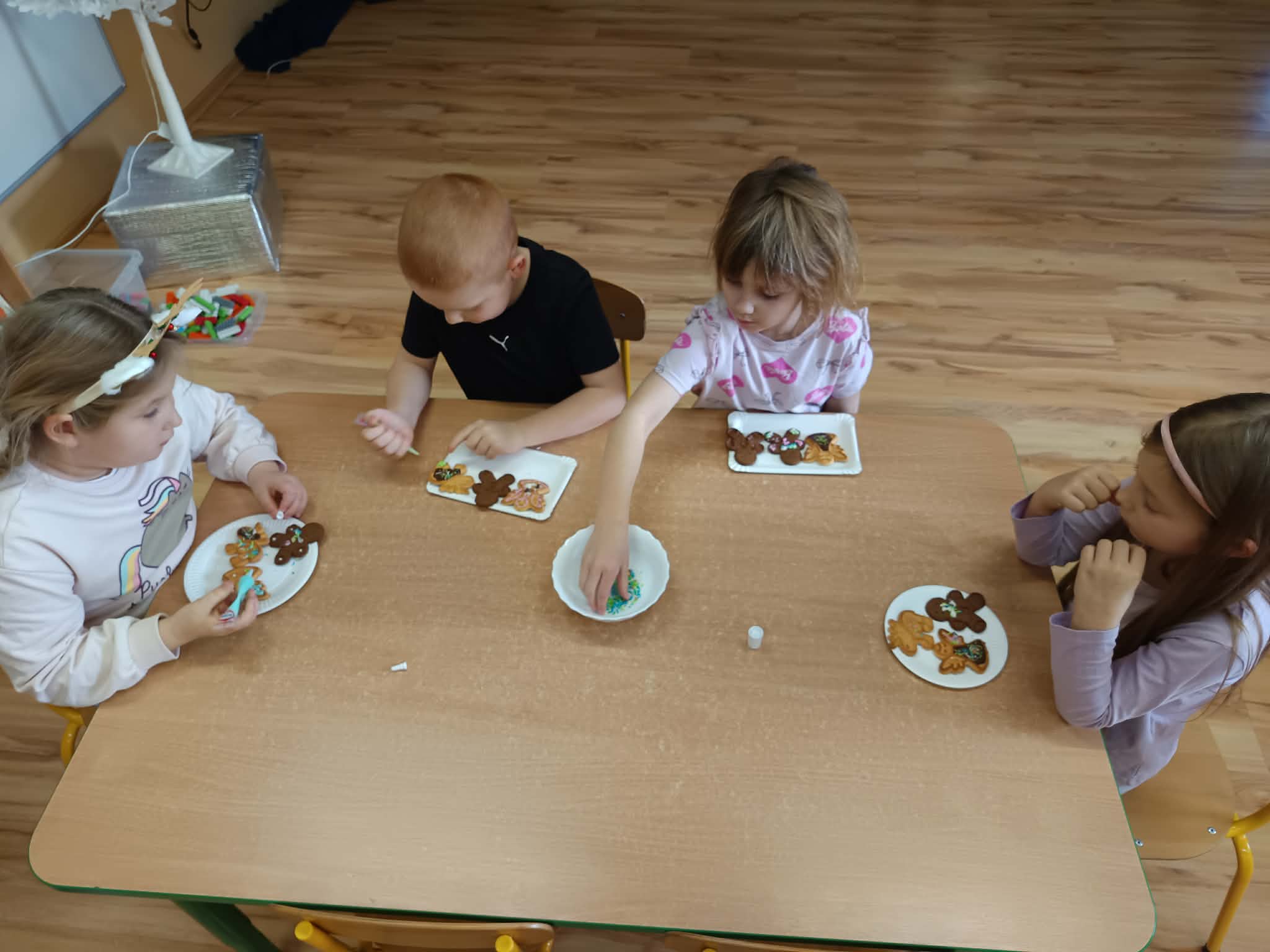 Ozdabianie ciastek to jedna z tradycji Świąt Bożego Narodzenia dlatego w naszym przedszkolu kultywujemy ją również. Dzieci otrzymały kilka upieczonych wcześniej pierniczków w różnych kształtach. Były to renifery, aniołki i ludziki. Dzieci miały możliwość ozdabiać pierniczki polewami, układać cukrowe ozdoby oraz kolorowe posypki. Przedszkolaki ozdabiały pierniki z dużą dokładnością. Te piękne pierniczki jednak długo nie leżały na talerzach, ponieważ w mgnieniu oka wylądowały w brzuchach naszych małych łakomczuchów.