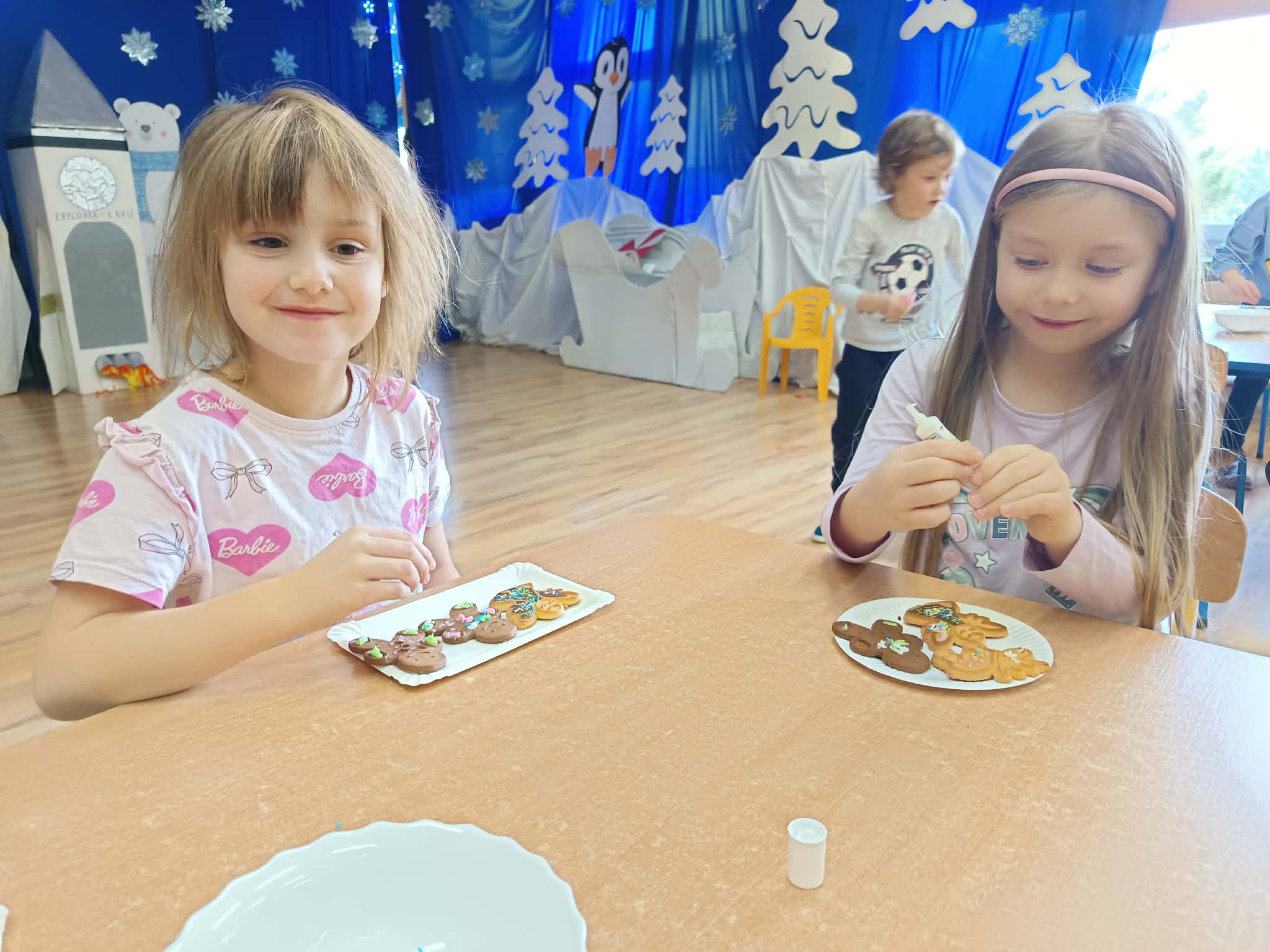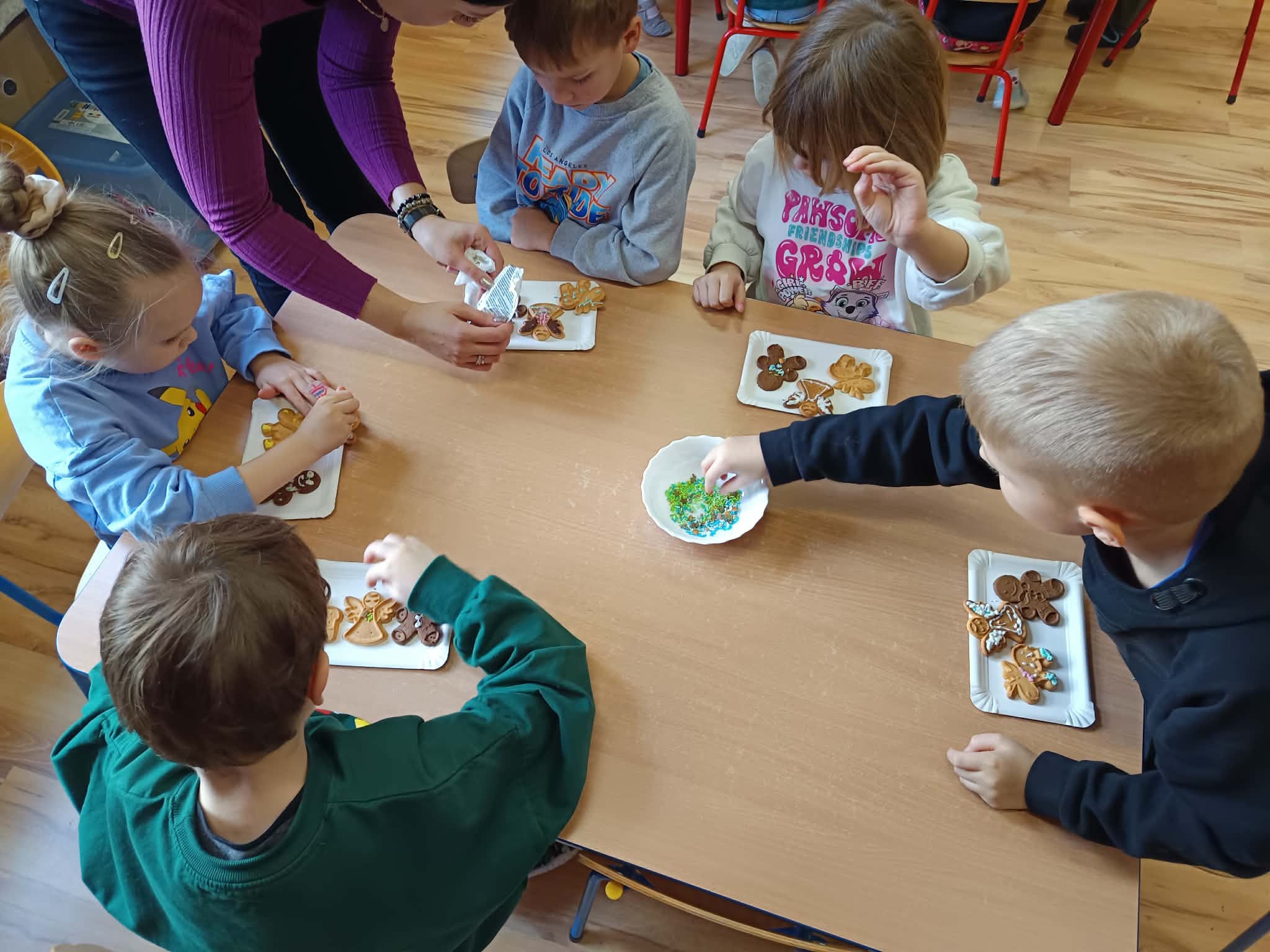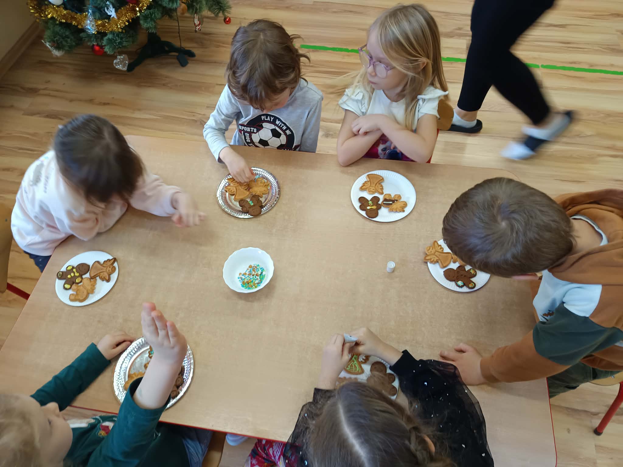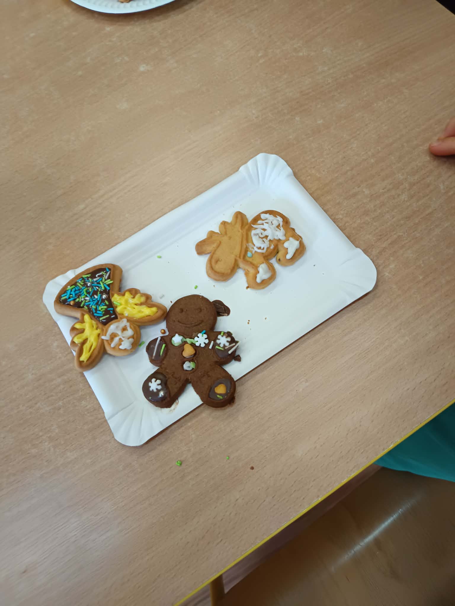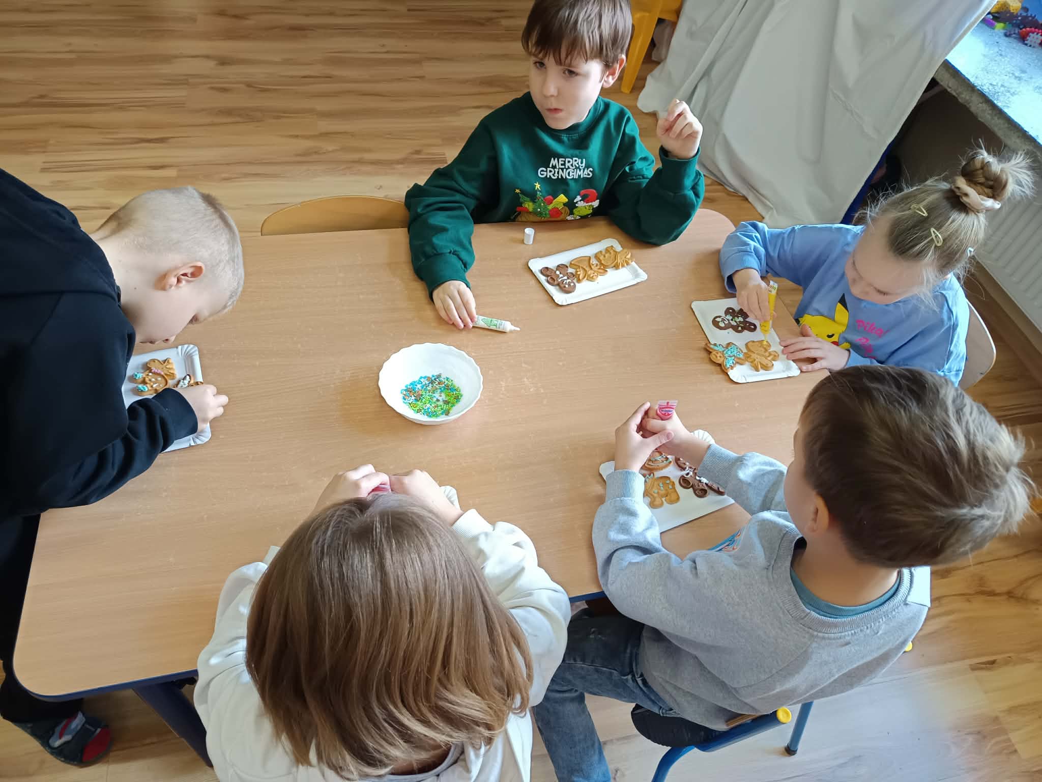 Ozdabianie ciastek to jedna z tradycji Świąt Bożego Narodzenia dlatego w naszym przedszkolu kultywujemy ją również. Dzieci otrzymały kilka upieczonych wcześniej pierniczków w różnych kształtach. Były to renifery, aniołki i ludziki. Dzieci miały możliwość ozdabiać pierniczki polewami, układać cukrowe ozdoby oraz kolorowe posypki. Przedszkolaki ozdabiały pierniki z dużą dokładnością. Te piękne pierniczki jednak długo nie leżały na talerzach, ponieważ w mgnieniu oka wylądowały w brzuchach naszych małych łakomczuchów.