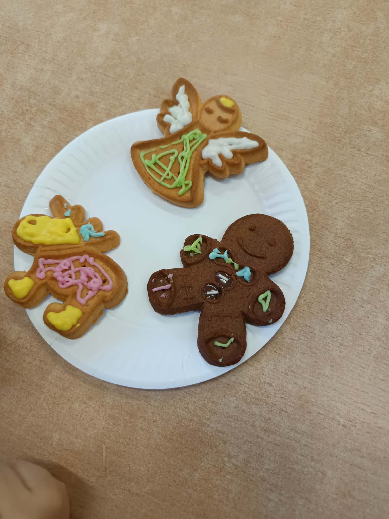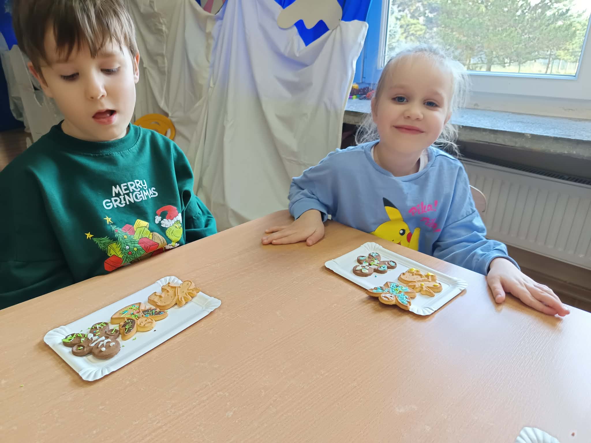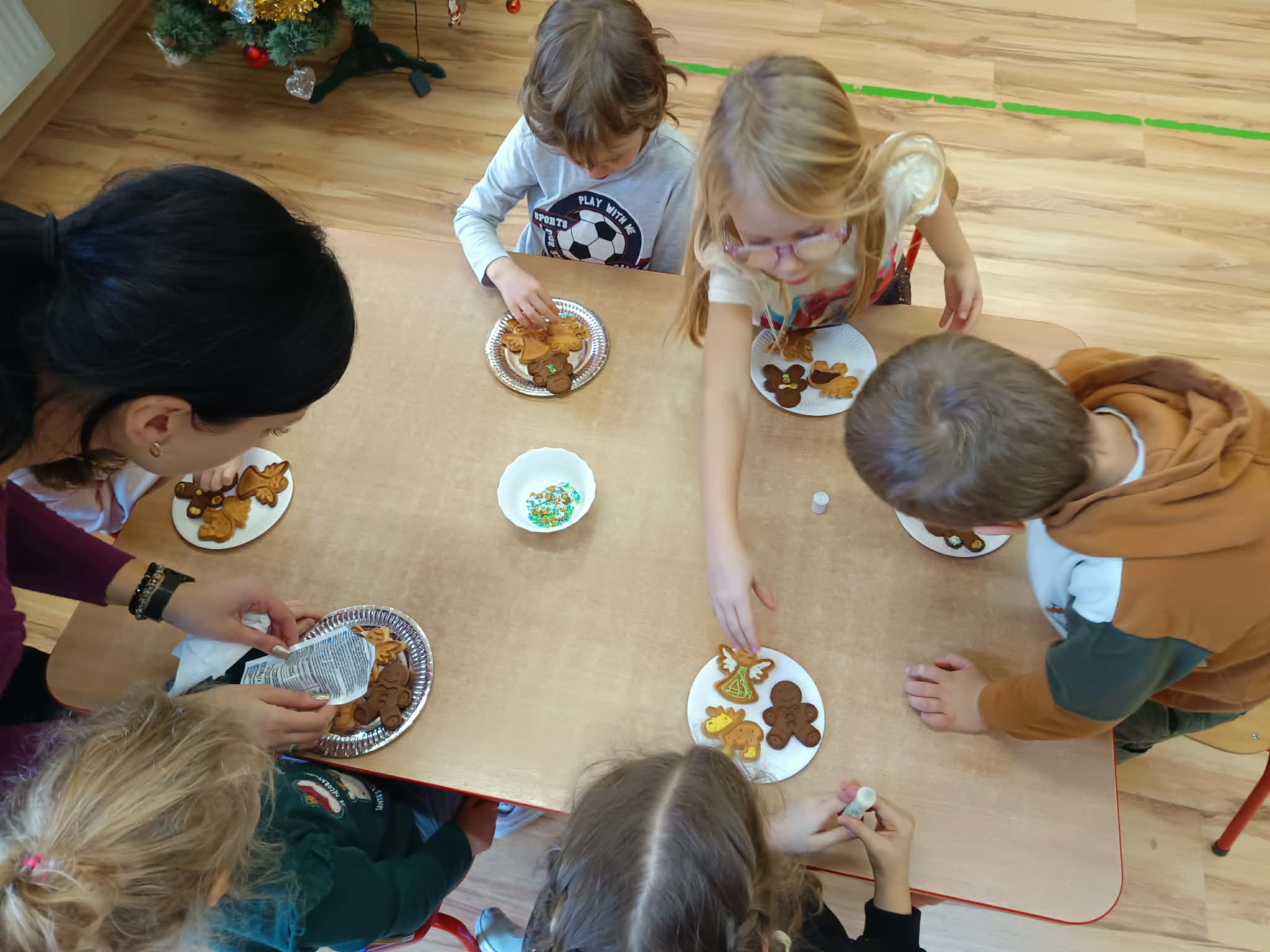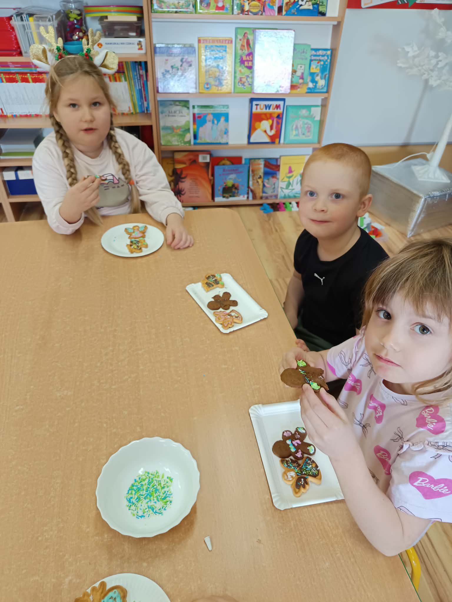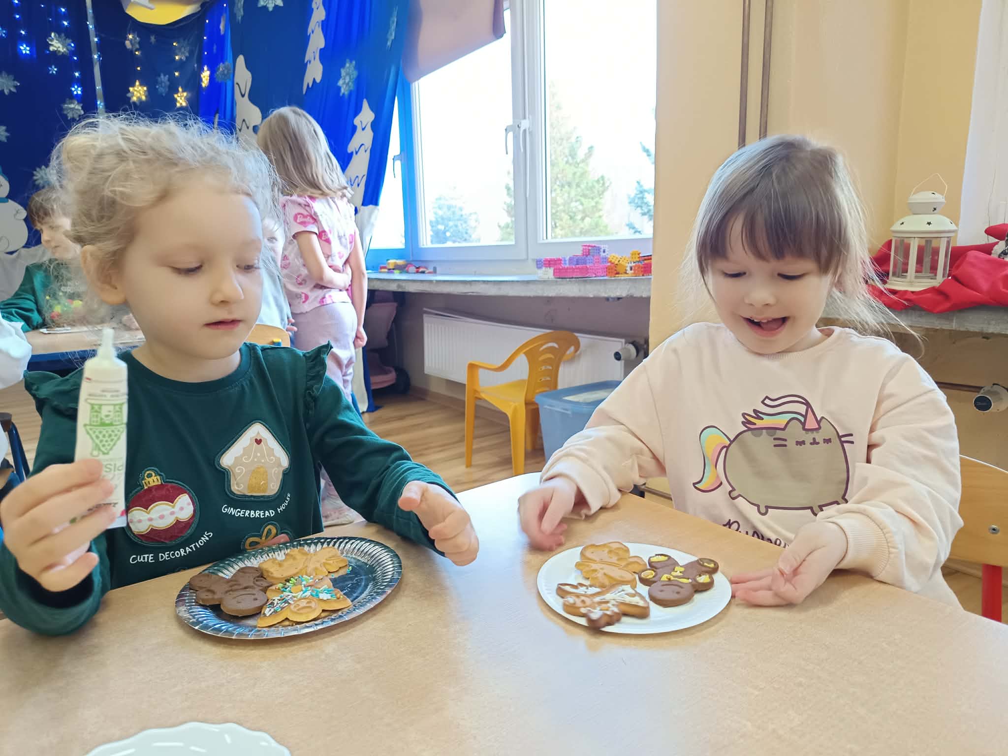Ozdabianie ciastek to jedna z tradycji Świąt Bożego Narodzenia dlatego w naszym przedszkolu kultywujemy ją również. Dzieci otrzymały kilka upieczonych wcześniej pierniczków w różnych kształtach. Były to renifery, aniołki i ludziki. Dzieci miały możliwość ozdabiać pierniczki polewami, układać cukrowe ozdoby oraz kolorowe posypki. Przedszkolaki ozdabiały pierniki z dużą dokładnością. Te piękne pierniczki jednak długo nie leżały na talerzach, ponieważ w mgnieniu oka wylądowały w brzuchach naszych małych łakomczuchów.