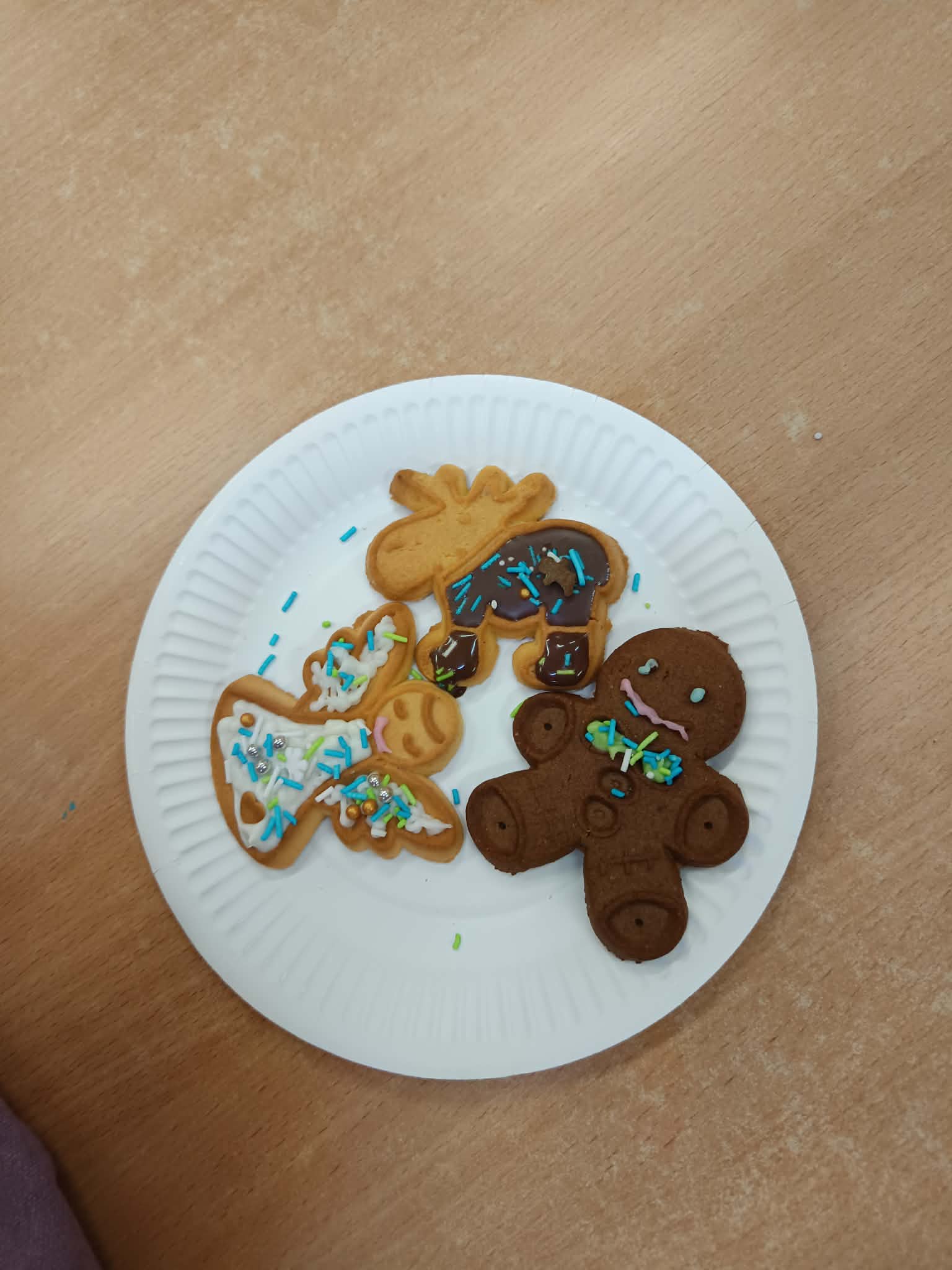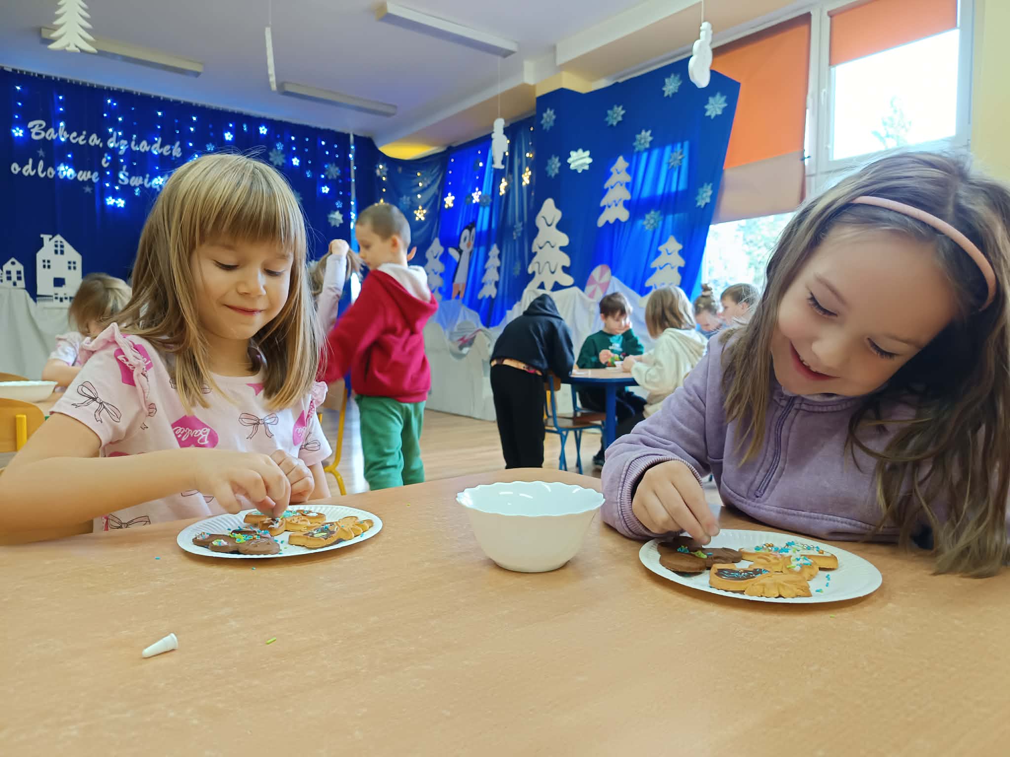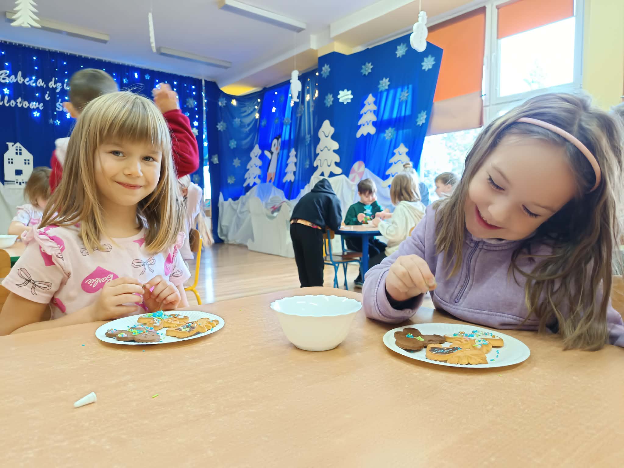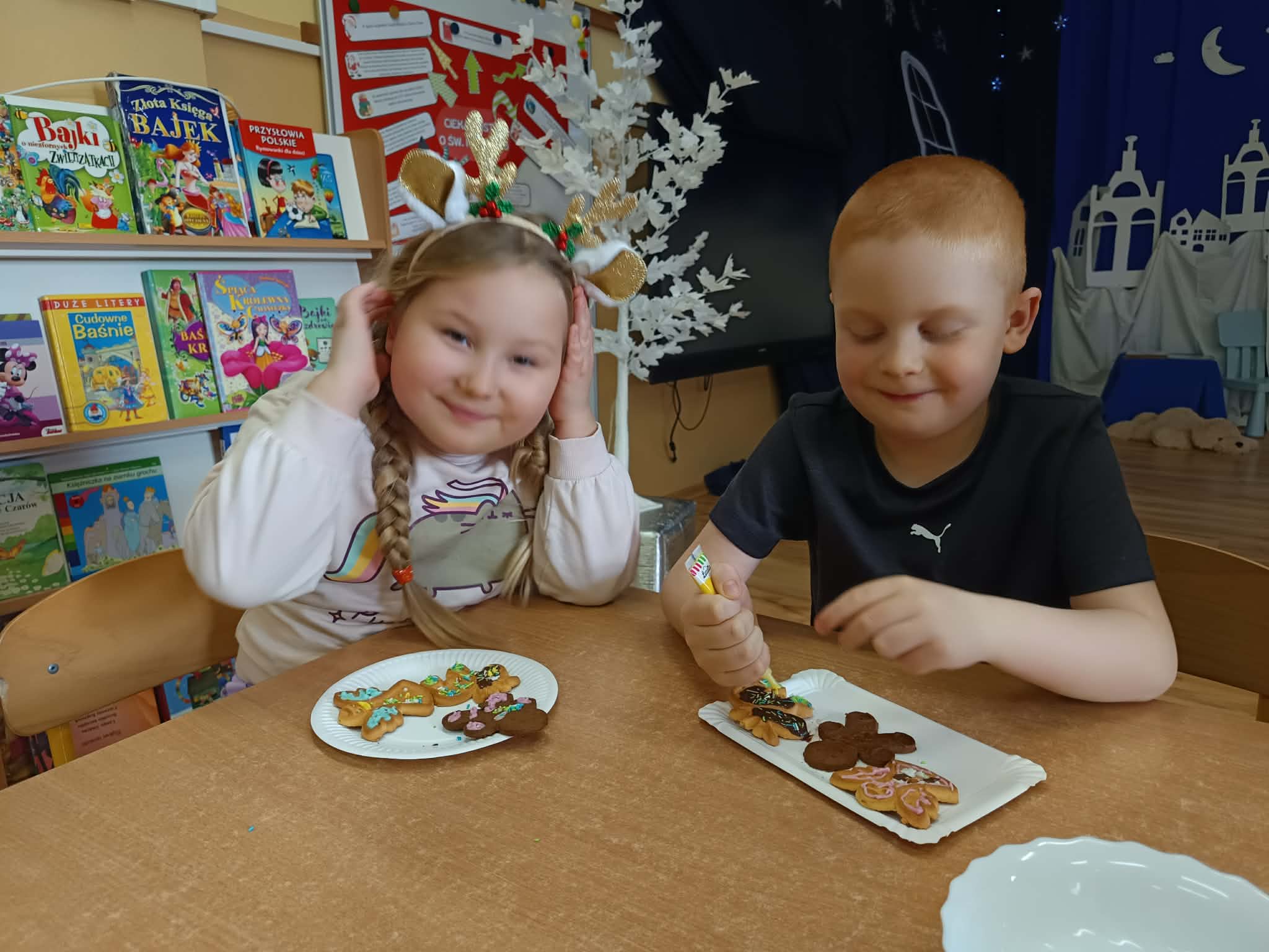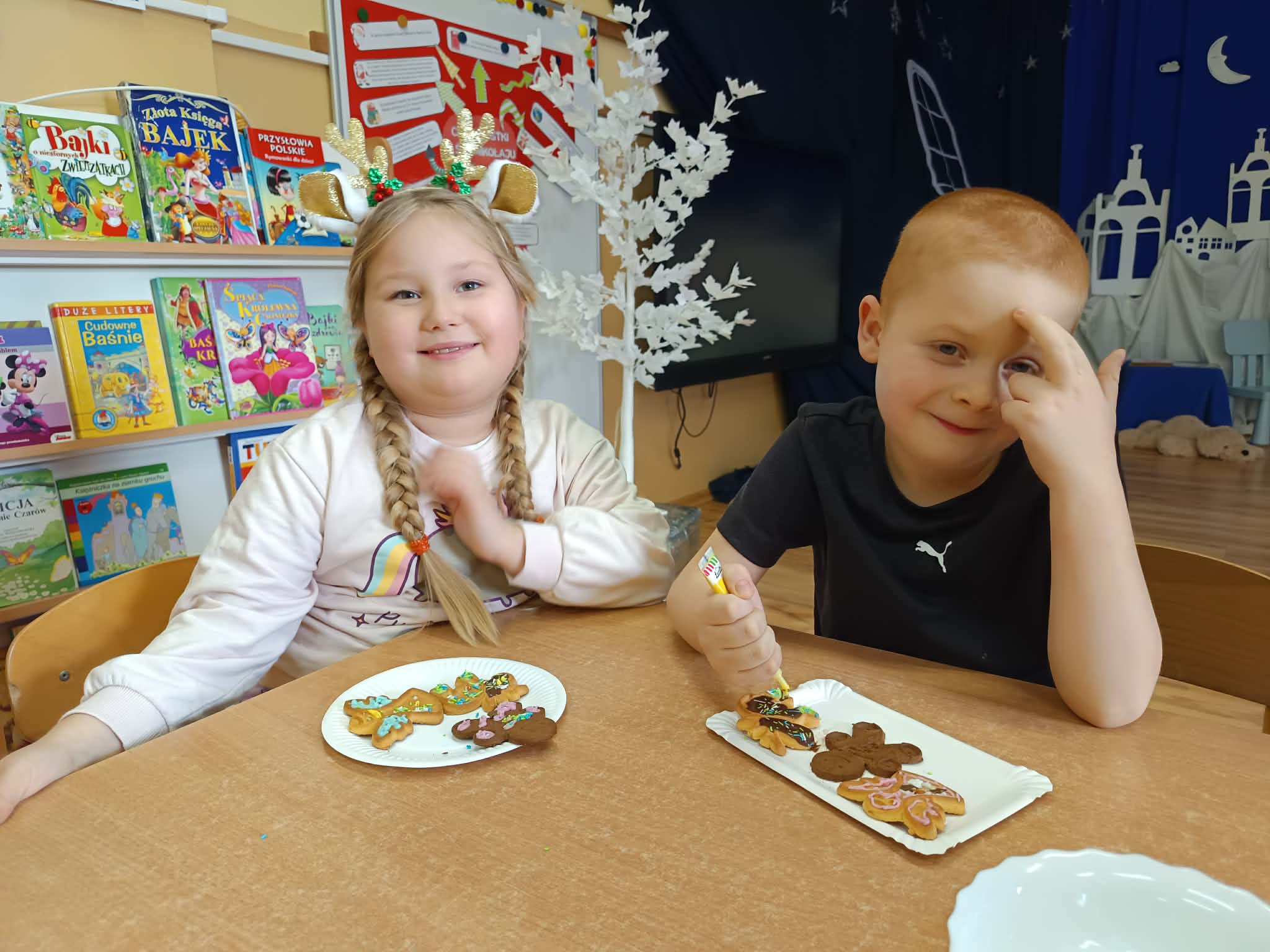 Ozdabianie ciastek to jedna z tradycji Świąt Bożego Narodzenia dlatego w naszym przedszkolu kultywujemy ją również. Dzieci otrzymały kilka upieczonych wcześniej pierniczków w różnych kształtach. Były to renifery, aniołki i ludziki. Dzieci miały możliwość ozdabiać pierniczki polewami, układać cukrowe ozdoby oraz kolorowe posypki. Przedszkolaki ozdabiały pierniki z dużą dokładnością. Te piękne pierniczki jednak długo nie leżały na talerzach, ponieważ w mgnieniu oka wylądowały w brzuchach naszych małych łakomczuchów.